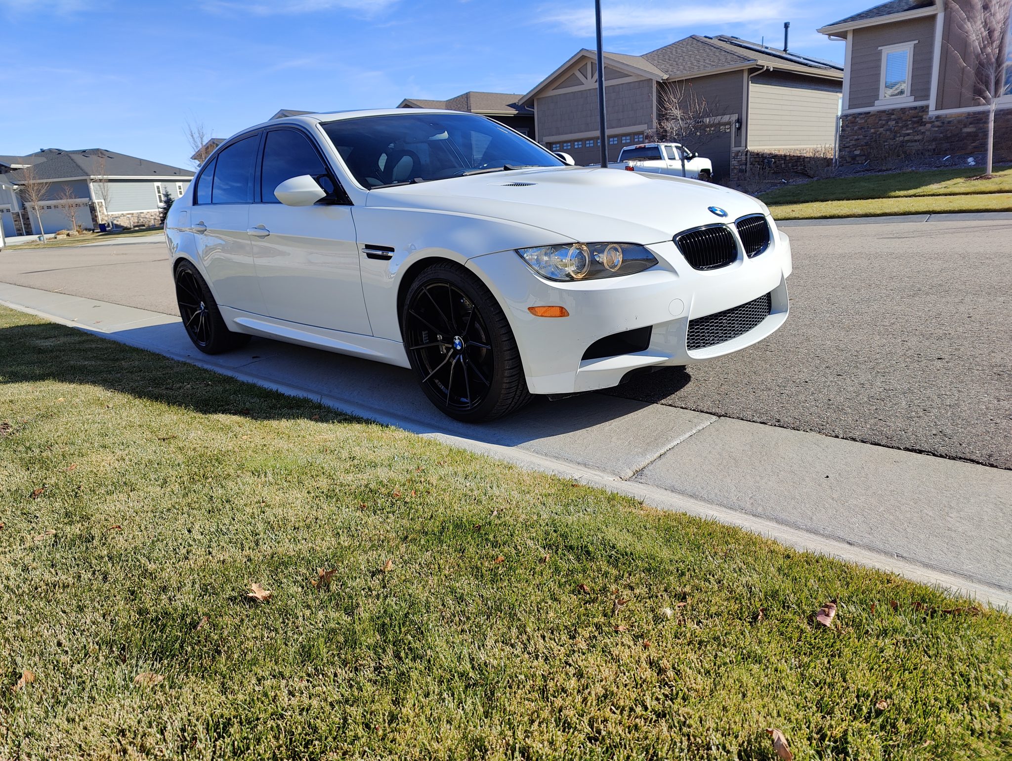 This 2008 BMW M3 sedan was registered in California and Florida before it was acquired by the current owner in 2015, and it has 82k miles. It is powered by a 4.0-liter V8 paired with a six-speed manual transmission and is finished in Alpine White III over Palladium Silver Novillo leather. The car has been modified with a carbon-fiber rear spoiler, black kidney grilles, tinted windows, 19″ Vertini wheels, and a flat-bottom steering wheel. The Premium and Technology packages were optioned, and other factory equipment includes a limited-slip differential, a sunroof, and iDrive with navigation. This E90 M3 is offered in Colorado by the seller on behalf of the current owner with manufacturer’s literature, service records, a spare set of wheels and tires, a car cover, a clean Carfax report, and a clean Florida title in the owner’s name. Finished in Alpine White III with Shadowline trim, the car has been modified with a carbon-fiber rear spoiler, black kidney grilles, and tinted windows. Other exterior details include a glass sunroof, adaptive xenon headlights, and rain-sensing wipers. The seller notes the hood and trunk lid struts have been replaced along with the windshield and rear window weatherstripping. Photos presented in the gallery show scuffs on the underside of the front valance, damaged paint on the front bumper cover, rock chips on the headlights, and a ding on the rear bumper cover. Aftermarket 19″ Vertini wheels are mounted with 255/35 front and 285/30 rear Michelin Pilot Sport A/S 3+ tires showing 2018 and 2019 date codes. Blemishes are visible on the front-right wheel. Dynamic Stability Control (DSC) was equipped as standard, and the Technology Package specified Electronic Damping Control (EDC) and M Drive. Braking is handled by four-wheel vented and cross-drilled discs measuring 14.2″ and 13.8″ front and rear, respectively. The power-adjustable front sport seats are upholstered in Palladium Silver Novillo leather, and Brushed Aluminum Shadow trim accents the dashboard and door panels. Amenities include iDrive with navigation, Comfort Access keyless entry, a CD stereo, a power rear sunshade, dual-zone automatic climate control, and cruise control. The Premium Packaged added power-folding side mirrors, a digital compass rearview mirror, and BMW Assist. The driver’s seat upholstery is worn and cracking. The replacement flat-bottom steering wheel features tri-color stitching and frames an M-branded tachometer, a 200-mph speedometer, a central information display, and gauges for oil temperature and fuel level. The digital odometer indicates 82k miles, approximately 31k of which were added under current ownership. The 4.0-liter S65 V8 features double-VANOS variable valve timing and was factory rated at 414 horsepower and 295 lb-ft of torque. The throttle actuators were replaced in 2017 according to the seller. Power is sent to the rear wheels through a six-speed manual transmission and a Variable M Differential Lock. A set of 19″ Style 220 wheels wrapped in Michelin tires are included in the sale along with a car cover, manufacturer’s literature, two keys, spare and removed parts, and service records. The Carfax report notes no accidents or other damage and lists history in California, Florida, and Colorado.