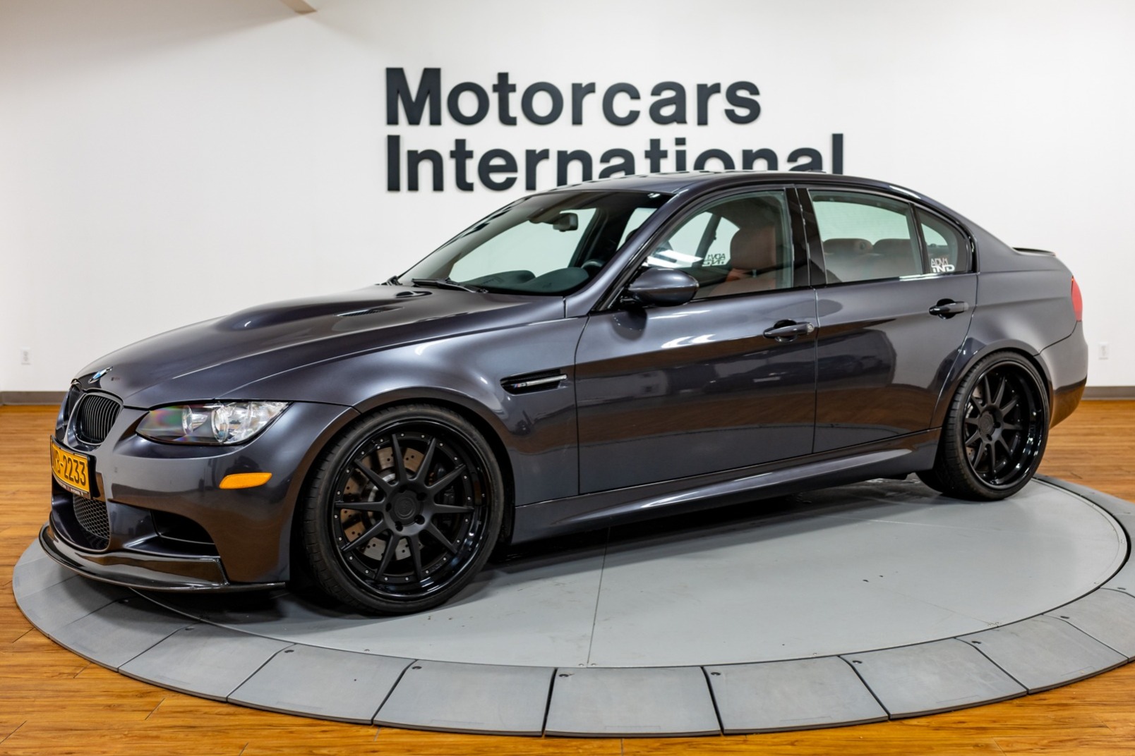 This 2008 BMW M3 sedan is powered by a 4.0-liter V8 paired with a six-speed manual transmission and is finished in Sparkling Graphite Metallic over Fox Red Novillo leather. Equipment includes 20″ ADV.1 wheels, a limited-slip differential, an aftermarket exhaust system, xenon headlights, sport seats, navigation, Comfort Access, dual-zone automatic climate control, cruise control, and a carbon-fiber splitter, spoiler, and diffuser. The car has been registered in California and Indiana, and it has 15k miles following its recent acquisition by the selling dealer. This E90 M3 is now offered by the selling dealer with the owner’s manual, a damage-free Carfax report, and a branded Indiana title. The car is finished in Sparkling Graphite Metallic (A22) and features Shadowline trim and adaptive xenon headlights as well as rain-sensing wipers, a glass sunroof, and quadruple exhaust outlets. A carbon-fiber front splitter, rear spoiler, and rear diffuser have been added along with rear bumper graphics. Black 20″ ADV.1 wheels are wrapped in Hankook Ventus V12 Evo tires. The car features Dynamic Stability Control (DSC), and the suspension has been modified for a lowered ride height. The sport seats are upholstered in Fox Red Novillo leather, and Carbon Structure Leather trim accents the dashboard, center console, and doors. Amenities include iDrive with navigation, Comfort Access keyless entry, a CD stereo, a power rear sunshade, dual-zone automatic climate control, and cruise control. The multi-function leather-wrapped steering wheel features tri-color stitching and frames an M-branded tachometer, a 200-mph speedometer, a central information display, and gauges for coolant temperature and fuel level. The digital odometer indicates 15k miles. The 4.0-liter S65 V8 features double-VANOS variable valve timing and was factory rated at 414 horsepower and 295 lb-ft of torque. An oil change was performed in March 2022. Power is sent to the rear wheels through a six-speed manual transmission and a Variable M Differential Lock. An aftermarket exhaust system has been installed. The Carfax report shows no accidents or damage and notes that the car was reacquired by the manufacturer in May 2009. Subsequent manufacturer buyback title brands are listed in California and Indiana. The current Indiana title lists “Manufacturer Buyback Disclosure on File” under the Brands section, and a redacted title photograph is shown in the gallery below.