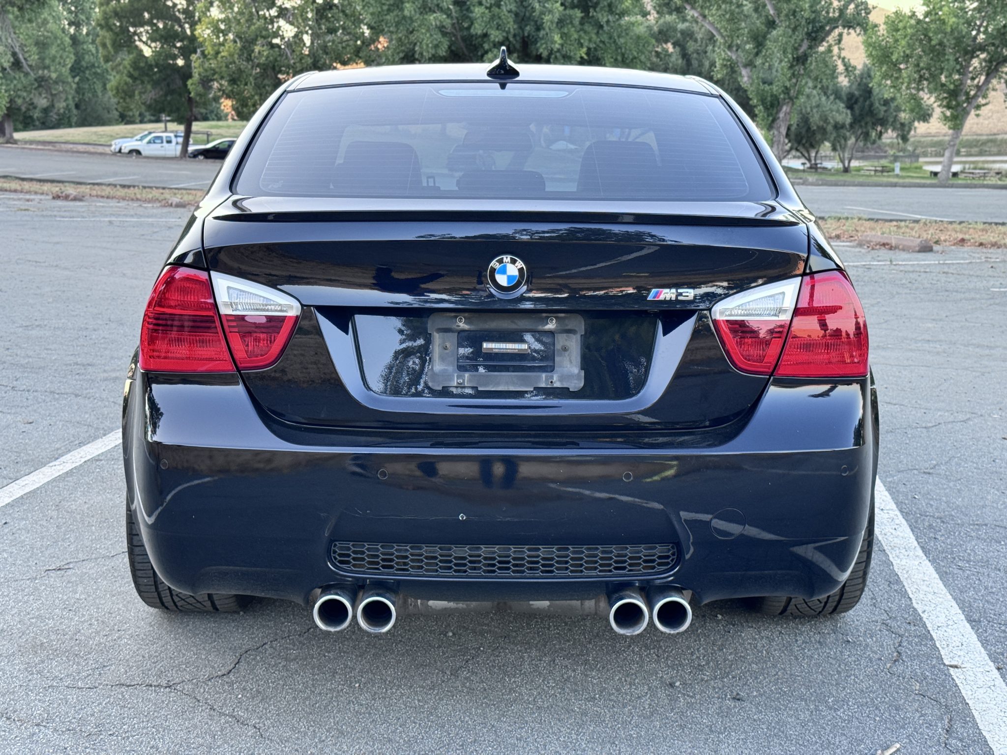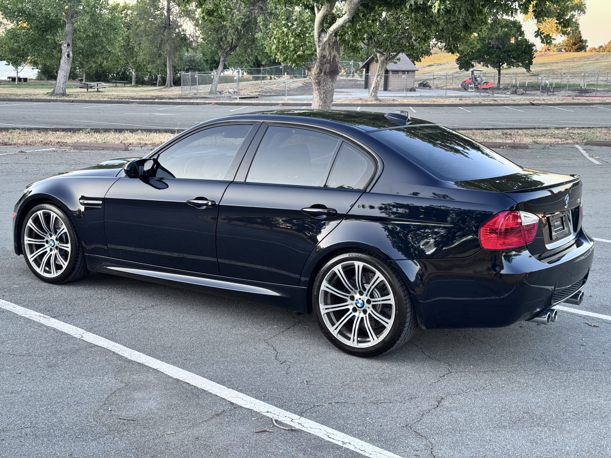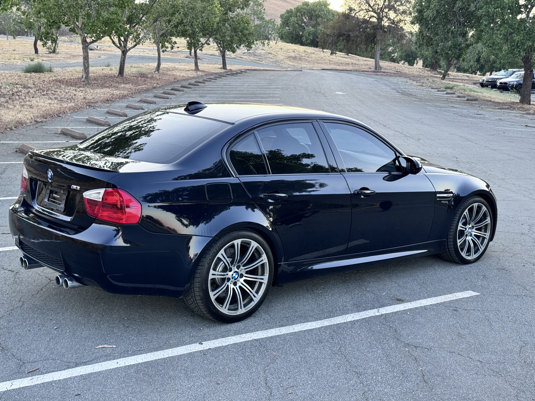 This 2008 BMW M3 sedan is powered by a 4.0-liter V8 paired with a six-speed manual transmission and is finished in Jerez Black Metallic over black Novillo leather upholstery. Equipment includes 19″ forged Style 220 wheels, a limited-slip differential, xenon headlights, heated front seats, navigation, dual-zone automatic climate control, and cruise control. It was acquired by the selling dealer in 2025, and work completed in preparation for the sale is said to have included replacing a throttle body actuator, ignition coils, and spark plugs. This E90 M3 has 78k miles and is offered in California by the selling dealer with a clean Carfax report and a clean Colorado title. The car is finished in Jerez Black Metallic (A73) and features Shadowline trim and adaptive xenon headlights as well as rain-sensing wipers, retractable headlight washers, a glass sunroof, a trunk lid spoiler, and quadruple exhaust outlets. Paint protection film has been applied to the front of the body, and there is a ding on the hood, scrapes ahead of the left front wheel, and paint chips on the forward-facing surfaces. Close-up photographs of the exterior finish and trim are shown in the gallery below. Forged 19″ Style 220 wheels are mounted with Continental ExtremeContact tires. The car features Electronic Damping Control (EDC), and braking is handled by four-wheel vented and cross-drilled discs measuring 14.2″ and 13.8″ front and rear, respectively. The front brake pads and rotors were reportedly replaced in May 2025. The heated power-adjustable front sport seats are upholstered in black Novillo leather, and Carbon Structure Leather trim accents the dashboard and doors. Amenities include iDrive with navigation, Comfort Access keyless entry, a CD stereo, dual-zone automatic climate control, and cruise control. The multifunction leather-wrapped steering wheel features tri-color stitching and frames an M-branded tachometer, a 200-mph speedometer, a central information display, and gauges for oil temperature and fuel level. The digital odometer indicates 78k miles. The 4.0-liter S65 V8 features double-VANOS variable valve timing and was factory rated at 414 horsepower and 295 lb-ft of torque. Work completed in 2025 is said to have included changing the oil and replacing a throttle body actuator, ignition coils, and spark plugs. Power is sent to the rear wheels through a six-speed manual transmission and a Variable M Differential Lock. The Carfax report is free of accidents or other reported damage.