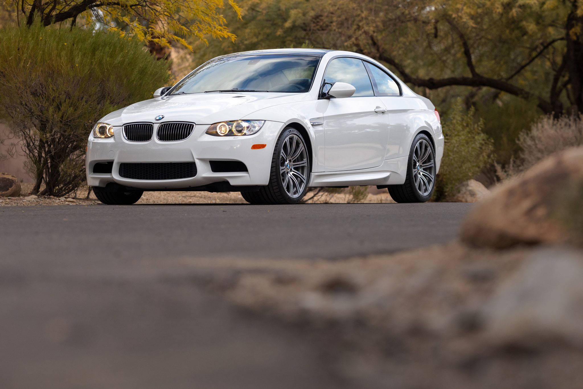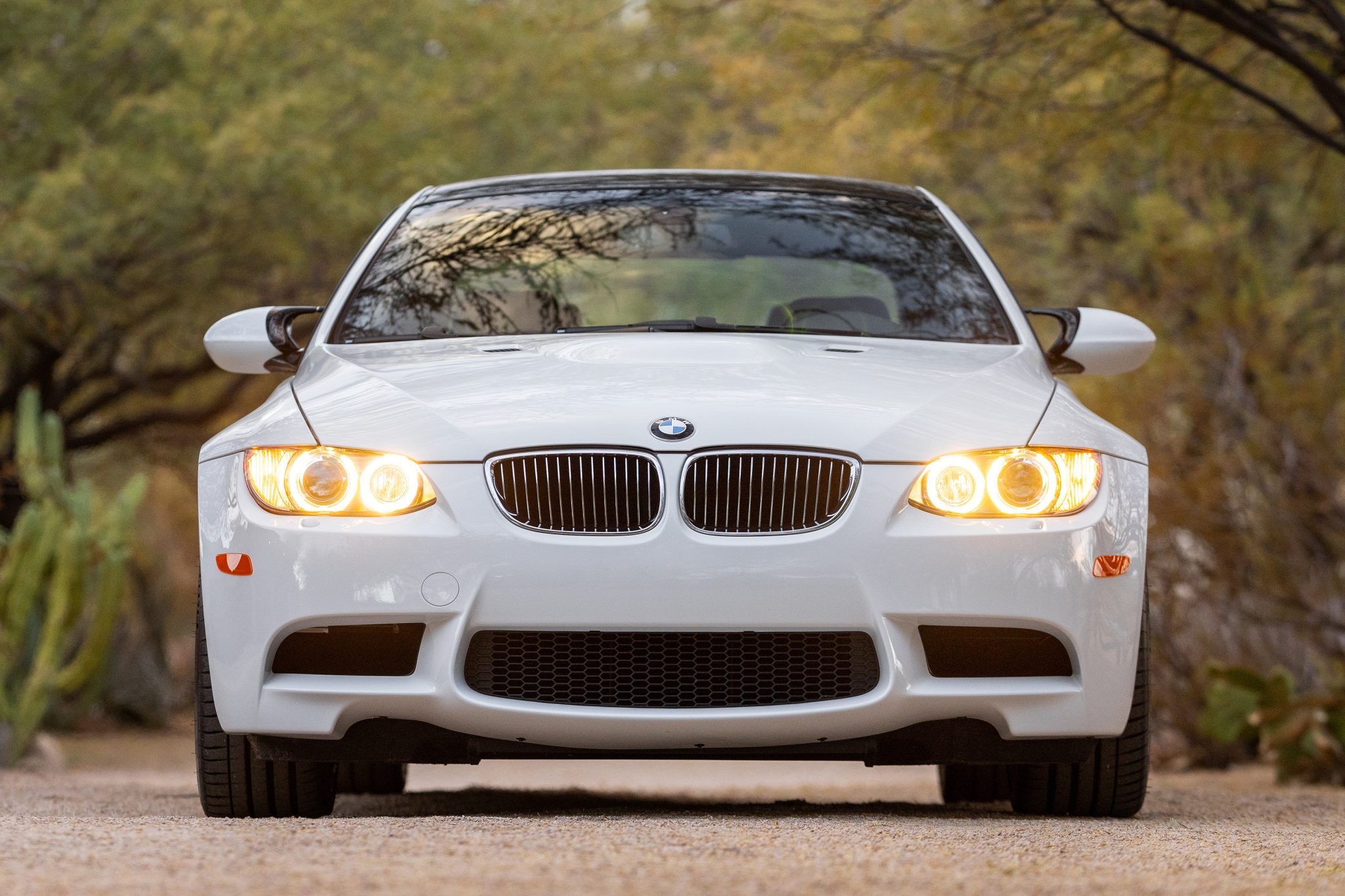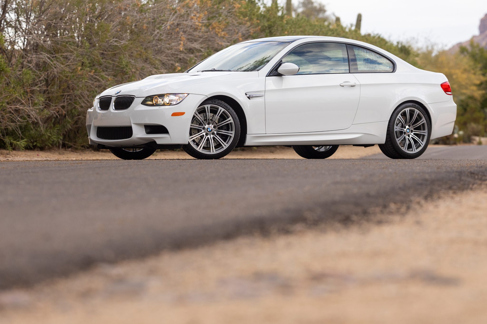 This 2008 BMW M3 coupe was first registered in Minnesota and was purchased by the current owner in 2010, who has since added approximately 7,500 of the 12k miles. The car is powered by a 4.0-liter V8 paired with a six-speed manual transmission and is finished in Alpine White over black Novillo leather upholstery. Equipment includes 19″ forged Style 220 wheels, a limited-slip differential, adaptive xenon headlights, a carbon-fiber roof panel, rear Park Distance Control, Comfort Access, heated power-adjustable front seats, a power rear sunshade, and iDrive with navigation. Work in preparation for the sale included replacing the tires and cabin air filters as well as completing fluid services. This E92 M3 is now offered on dealer consignment with manufacturer’s literature, recent service records, a car cover, spare floor mats, a clean Carfax report, and a clean Arizona title. The car is finished in Alpine White (300) and features Shadowline trim and adaptive xenon headlights as well as rain-sensing wipers, a carbon-fiber roof panel, a trunk lid spoiler, rear parking sensors, and quadruple exhaust outlets. Forged 19″ Style 220 wheels are mounted with Michelin Pilot Sport 4 S tires. The car features Dynamic Stability Control (DSC), and braking is handled by four-wheel vented and cross-drilled discs measuring 14.2″ and 13.8″ front and rear, respectively. The tires were replaced and a brake fluid flush was performed in preparation for the sale. The heated and power-adjustable front sport seats are upholstered in black Novillo leather, and Carbon Structure Leather trim accents the dashboard and doors. Amenities include driver-seat position memory, Comfort Access keyless entry, a CD stereo, iDrive with navigation, dual-zone automatic climate control, M3-embroidered floor mats, a power rear sunshade, and cruise control. The multi-function leather-wrapped steering wheel features tri-color stitching and frames an M-branded tachometer, a 200-mph speedometer, a central information display, and gauges for oil temperature and fuel level. The digital odometer indicates 12k miles, approximately 7,500 of which were added under current ownership. The 4.0-liter S65 V8 features double-VANOS variable valve timing and was factory rated at 414 horsepower and 295 lb-ft of torque. Power is sent to the rear wheels through a six-speed manual transmission and a Variable M Differential Lock. Maintenance completed in December 2024 included replacing the cabin air filters and servicing the engine, transmission, and differential fluids. The Carfax report is free of accidents or other reported damage. A duplicate Arizona title is currently in transit, the receipt for which is provided in the gallery.