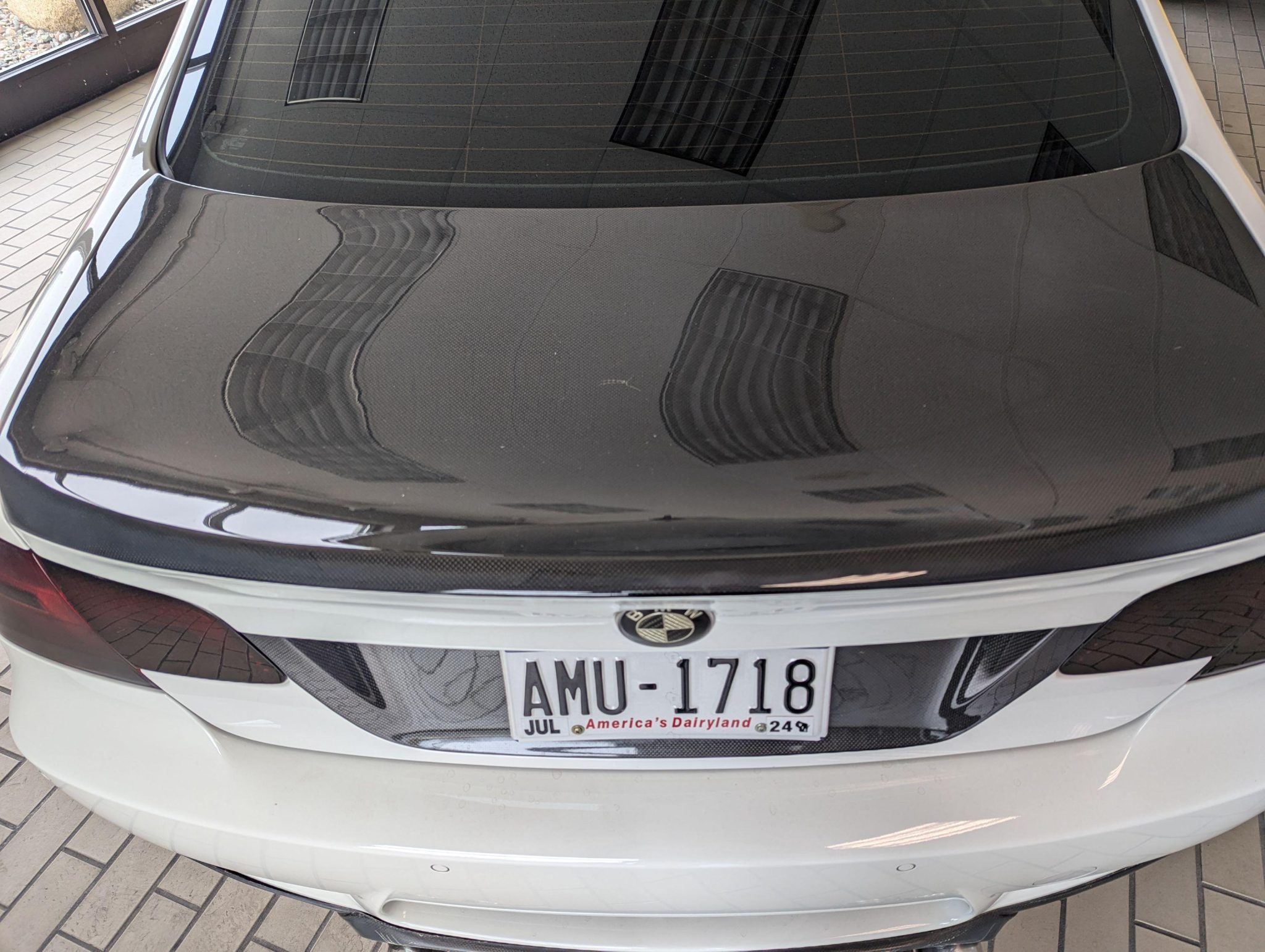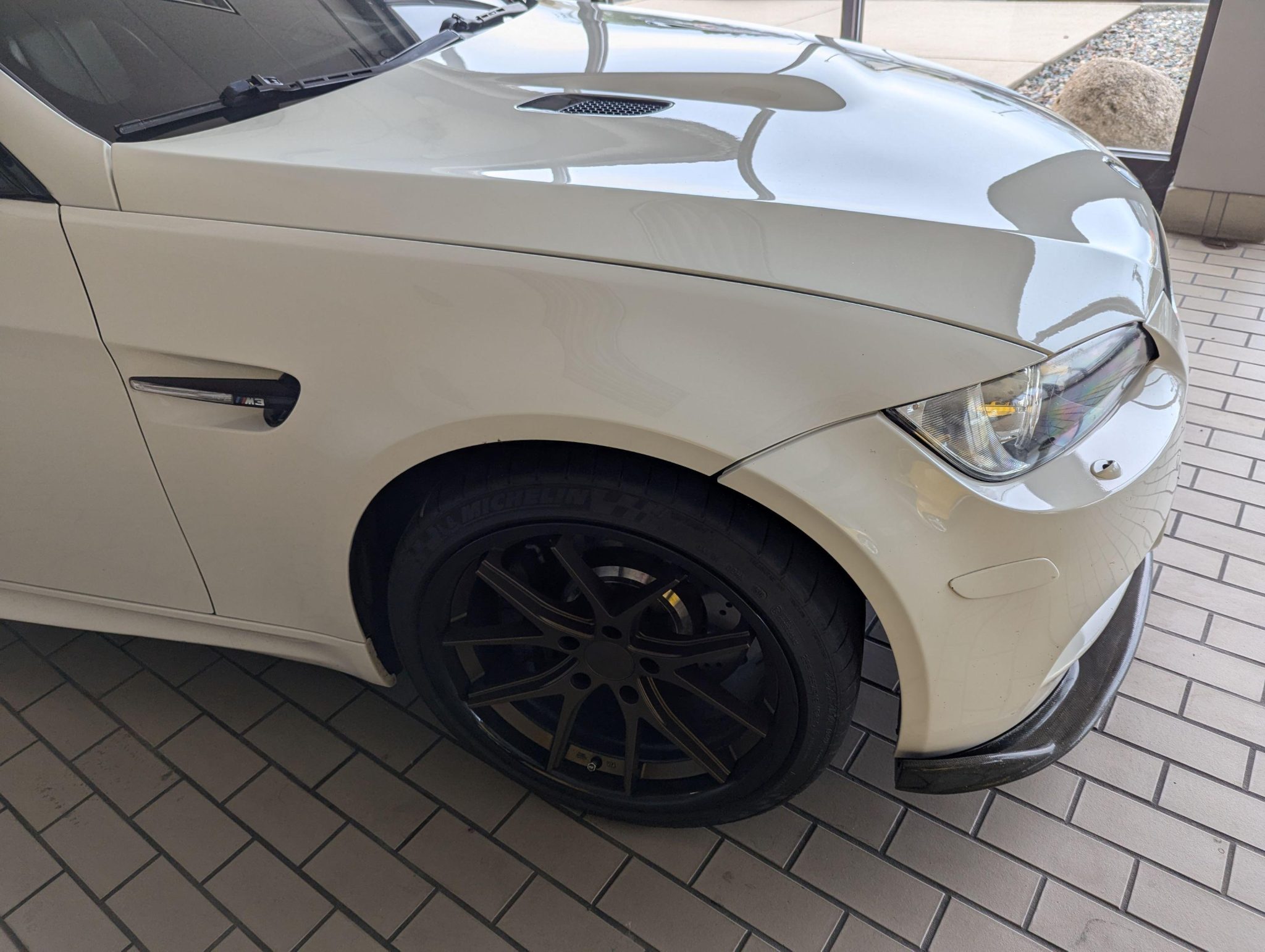 This 2008 BMW M3 coupe is powered by a replacement 4.0-liter V8 paired with a six-speed manual transmission and is finished in Alpine White III over Fox Red Novillo leather. It has been modified with an aftermarket exhaust system, 19″ Ferrada wheels, Turner Motorsport suspension components, and a carbon-fiber trunk lid and rear diffuser. Additional equipment includes the Cold Weather, Premium, and Technology packages as well as a limited-slip differential, xenon headlights, parking sensors, heated front seats, dual-zone automatic climate control, and navigation. The seller acquired the car in 2021 and has since added approximately 3k of the 90k miles indicated. This E92 M3 is now offered with a clean Carfax report and a clean Wisconsin title in the seller’s name. The car is finished in Alpine White III and has been fitted with a carbon-fiber front splitter, trunk lid, and rear diffuser. It features Shadowline trim and adaptive xenon headlights as well as rain-sensing wipers, a carbon-fiber roof panel, tinted windows, rear parking sensors, and quadruple exhaust outlets. The roof panel is said to have been refinished. Noted flaws include a crack in the trunk lid finish, wear on the rear diffuser, and chips on the splitter and front bumper cover. The 19″ Ferrada FR2 wheels were mounted under current ownership and wear mixed Michelin and Continental tires measuring 255/35 up front and 265/35 out back. The car has been modified with Bilstein front struts and Turner Motorsport front control arms and sway-bar links. Braking is handled by four-wheel vented and cross-drilled discs measuring 14.2″ and 13.8″ front and rear, respectively. The seller states the brake pads and rotors were replaced in April 2022. The heated power-adjustable front sport seats are upholstered in Fox Red Novillo leather, and Brushed Aluminum Shadow trim accents the dashboard and doors. Amenities include a CD stereo, a power rear sunshade, dual-zone automatic climate control, navigation, Comfort Access, and cruise control. The headliner is sagging, and wear is noted on the armrests and door handles. The multi-function leather-wrapped steering wheel is worn and frames an M-branded tachometer, a 200-mph speedometer, a central information display, and gauges for oil temperature and fuel level. The digital odometer indicates 90k miles, approximately 3k of which were added under current ownership. The 4.0-liter S65 V8 was reportedly replaced under previous ownership, and it features double-VANOS variable valve timing. The seller notes the pre-catalytic-converter oxygen sensors were replaced in April 2023. Power is sent to the rear wheels through a six-speed manual transmission and a Variable M Differential Lock. An aftermarket exhaust system has been installed, and the shifter shaft seal was replaced in April 2023 according to the seller. The Carfax report is free of accidents or other reported damage.