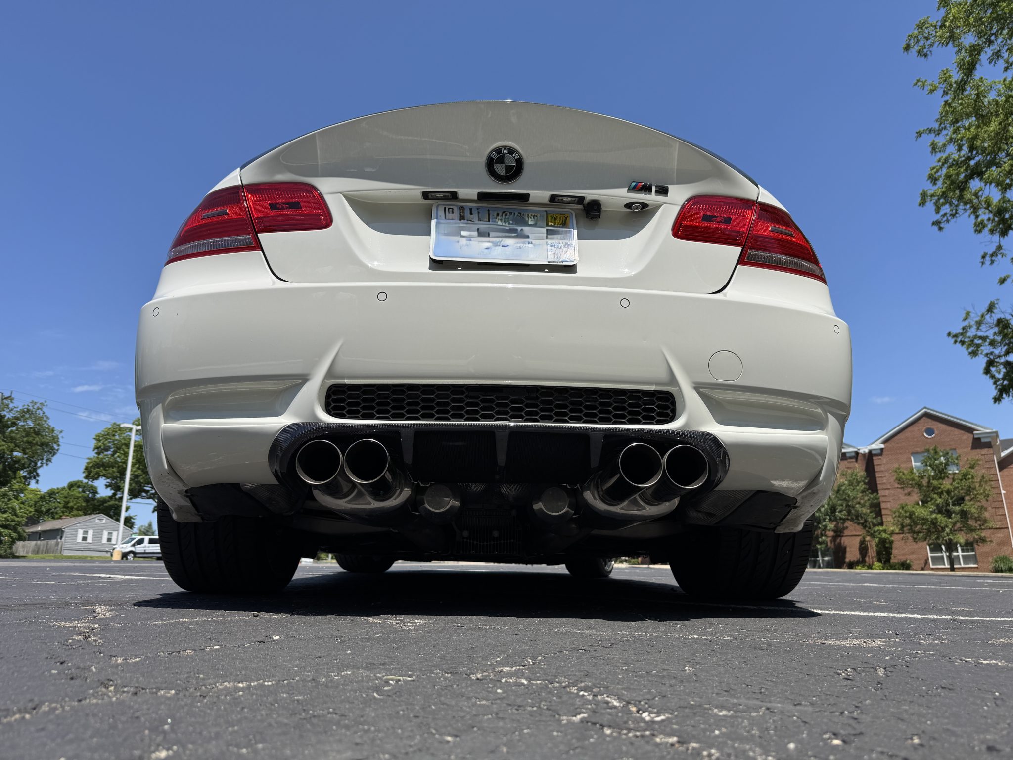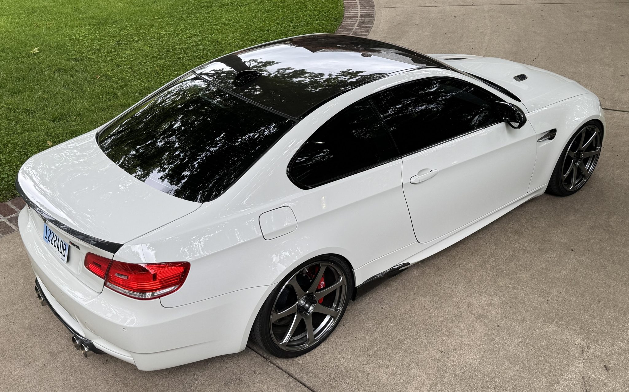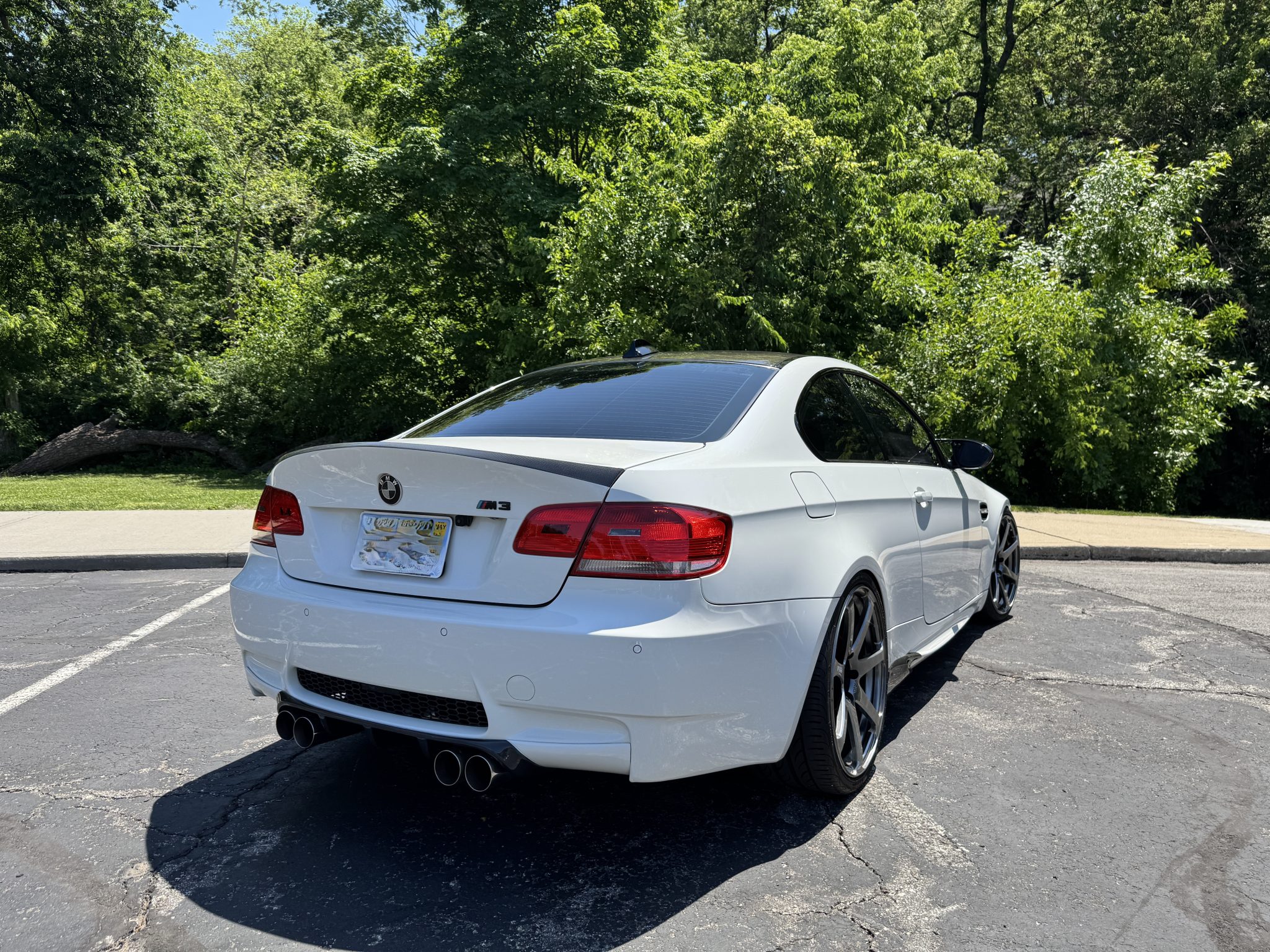 This 2008 BMW M3 coupe was purchased by the seller in 2013, who has since added approximately 16k of its 27k miles. It has been modified with forged 20″ Yokohama AVS Model F7 wheels, a Brembo brake kit, an M Performance V1 steering wheel, and an Active Autowerke short shifter, exhaust system, and pulley. Powered by a 4.0-liter V8 paired with a six-speed manual transmission, the car is finished in Alpine White over black Novillo leather upholstery. Equipment includes a limited-slip differential, xenon headlights, a carbon-fiber roof panel, parking sensors, heated front seats, navigation, dual-zone automatic climate control, and cruise control. This E92 M3 is offered with the manufacturer’s literature, a clean Carfax report, and a clean Kansas title in the seller’s name. The car is finished in Alpine White (300) and features a carbon-fiber roof, side mirror caps, rear diffuser, side skirt extensions, and trunk lid. Exterior details include Shadowline trim and adaptive xenon headlights as well as rain-sensing wipers, rear parking sensors, and quadruple exhaust outlets. There are blemishes on the carbon-fiber trim components, scuffs on the underside of the front lip, and a paint blemish on the driver’s door. Close-up photographs of the exterior finish and trim are shown in the gallery below. The forged 20″ Yokohama AVS Model F7 wheels are mounted with Pirelli tires. The car features Electronic Damping Control (EDC), and a Brembo brake kit has been installed. The heated power-adjustable front sport seats are upholstered in black Novillo leather, and carbon fiber trim accents the dashboard and doors. Amenities include iDrive with navigation, Comfort Access keyless entry, an AC Schnitzer brake handle, a K40 radar detector, a CD stereo, dual-zone automatic climate control, and cruise control. The M Performance V1 steering wheel is equipped with LED shift indicator lights, a g-force meter, a built-in lap timer, and readouts for coolant and oil temperatures. It frames an M-branded tachometer, a 200-mph speedometer, a central information display, and gauges for oil temperature and fuel level. The digital odometer indicates 27k miles, approximately 16k of which were added under current ownership. The 4.0-liter S65 V8 features double-VANOS variable valve timing and was factory rated at 414 horsepower and 295 lb-ft of torque. An aftermarket ECU tune and an Active Autowerke exhaust system and pulley are fitted. The battery was replaced in 2025. Power is sent to the rear wheels through a six-speed manual transmission and a Variable M Differential Lock. An Active Autowerke short shifter has been added. The Carfax report is free of accidents or other reported damage.
