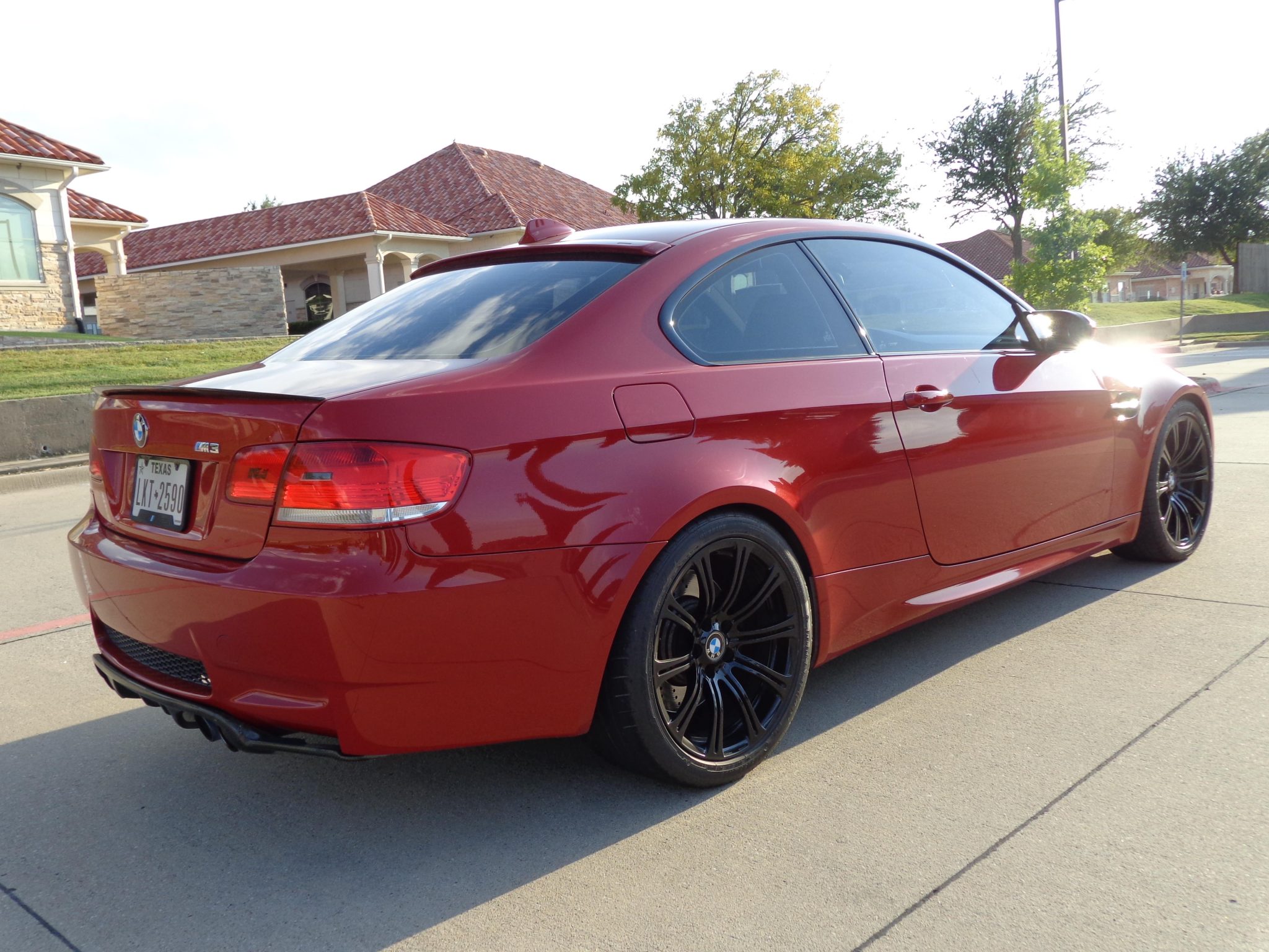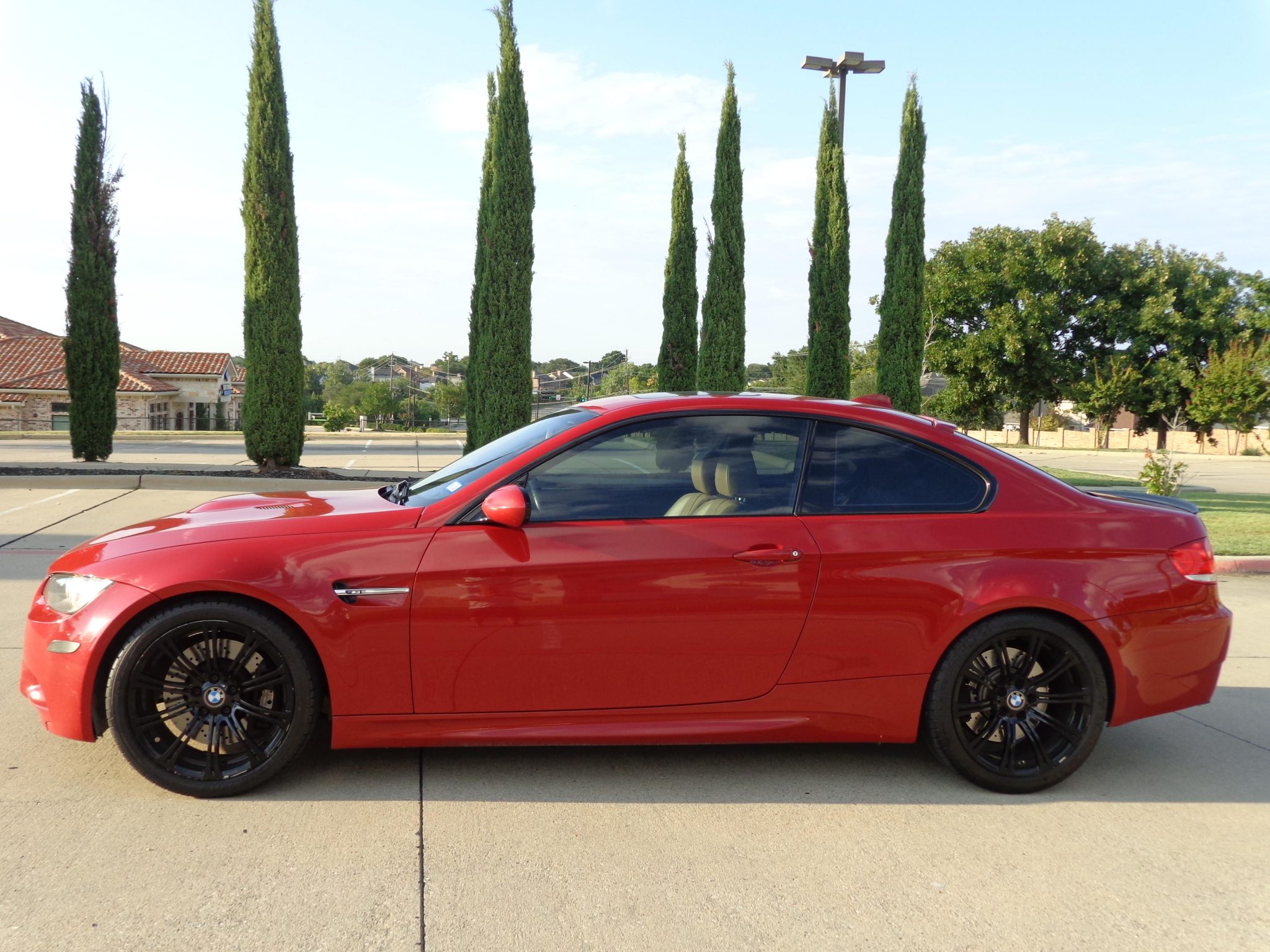 This 2008 BMW M3 coupe is powered by a 4.0-liter V8 paired with a six-speed manual transmission and is finished in Melbourne Red Metallic over Bamboo Beige Novillo leather. Equipment includes the Premium Package, 19″ forged Style 220 wheels, extended leather, premium sound, a limited-slip differential, xenon headlights, black kidney grilles, an aftermarket rear spoiler, an aftermarket exhaust system, navigation, dual-zone automatic climate control, and cruise control. The car has 127k miles following history in Louisiana and Texas, and it was purchased by the seller in 2024. This E92 M3 is now offered with the owner’s manual, service records, a clean Carfax report, and a clean Texas title in the seller’s name. The car is finished in Melbourne Red Metallic (A75) and features Shadowline trim and adaptive xenon headlights as well as rain-sensing wipers, power-folding side mirrors, a glass sunroof, black kidney grilles, aftermarket side marker lights, and quadruple exhaust outlets. The finish on the aftermarket rear spoiler is peeling. The forged 19″ Style 220 wheels are finished in black and are mounted with Dunlop and Michelin tires. The car features Electronic Damping Control (EDC). Braking is handled by four-wheel vented and cross-drilled discs measuring 14.2″ and 13.8″ front and rear, respectively. The right front wheel was repaired in preparation for the sale, and curb marks are visible on the wheels. The power-adjustable front sport seats are upholstered in Bamboo Beige Novillo leather, and Carbon Structure Leather trim accents the dashboard and doors. Amenities include iDrive with navigation, Comfort Access keyless entry, BMW Assist, a CD stereo, dual-zone automatic climate control, and cruise control. The sunroof cover was reupholstered in March 2024. The seller tells us that the seatbelt presenters do not consistently grab the seatbelts. The multifunction leather-wrapped steering wheel features tri-color stitching and frames an M-branded tachometer, a 200-mph speedometer, a central information display, and gauges for oil temperature and fuel level. The digital odometer indicates 127k miles, approximately 1k of which were added under current ownership. The 4.0-liter S65 V8 features double-VANOS variable valve timing and was factory rated at 414 horsepower and 295 lb-ft of torque. The engine rod bearings and carbon canister were replaced in 2021, the ignition coils were replaced in April 2022, the valve cover gaskets and spark plugs were replaced in 2024, and the battery was replaced in January 2025. Power is sent to the rear wheels through a six-speed manual transmission and a Variable M Differential Lock. An aftermarket exhaust system is installed. The Carfax report is free of accidents or other reported damage.