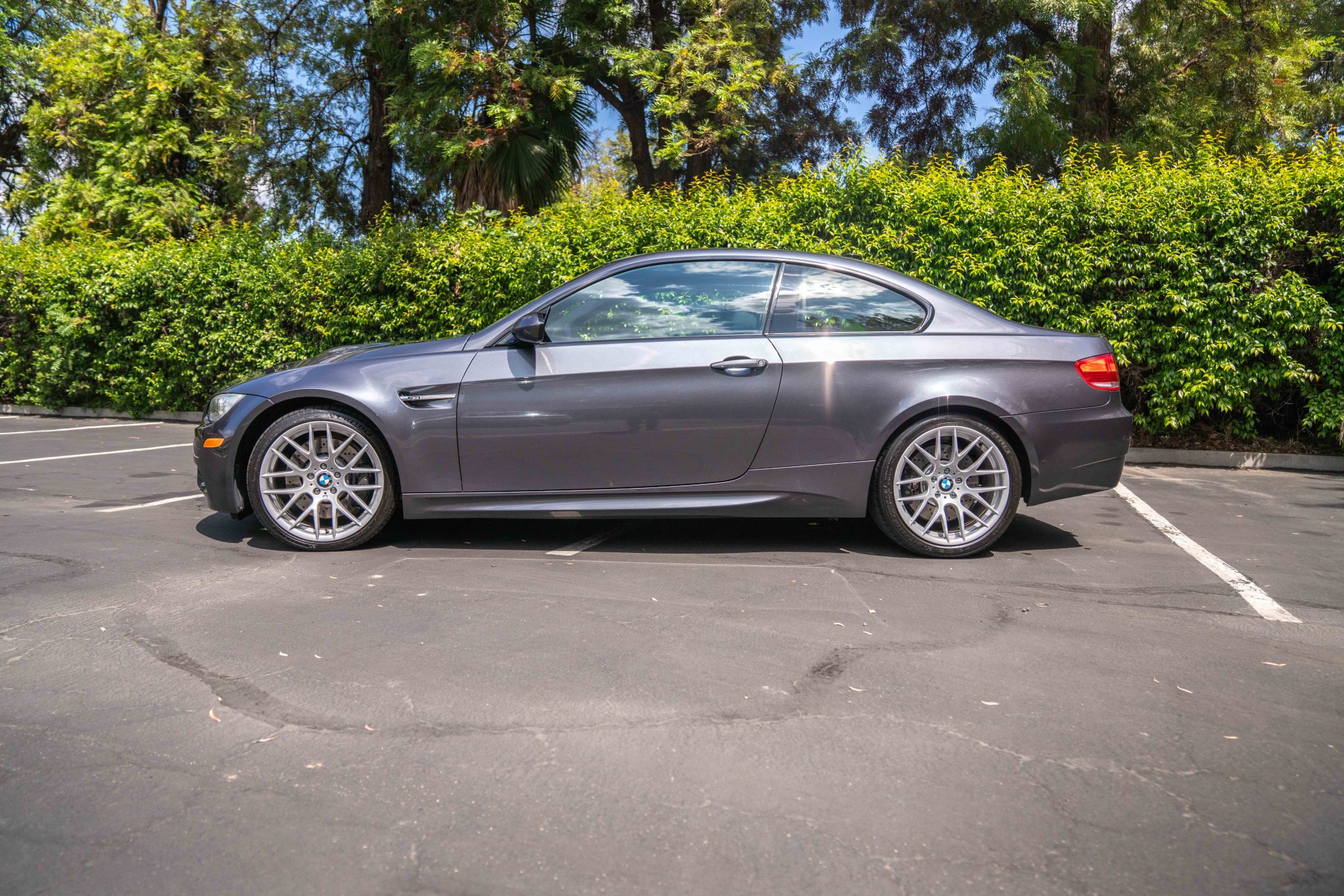 This 2008 BMW M3 coupe has remained registered in Massachusetts since new and has 73k miles. Powered by a 4.0-liter V8 paired with a six-speed manual transmission, the car is finished in Sparkling Graphite Metallic over black Novillo leather upholstery. Equipment includes 19″ Style 359 wheels, a limited-slip differential, xenon headlights, a carbon-fiber roof panel, heated front seats, dual-zone automatic climate control, Apple CarPlay integration, and cruise control. Acquired by the selling dealer in 2024, this E92 M3 is offered with a CarFax report and a clean Massachusetts title. The car is finished in Sparkling Graphite Metallic (A22) and features Shadowline trim and adaptive xenon headlights as well as rain-sensing wipers, a carbon-fiber roof panel, a trunk lid spoiler, and quadruple exhaust outlets. Paint chips are noted, and a July 2020 entry on the Carfax report lists “minor damage” to the front of the car. The Carfax report is free of accidents or other reported damage. The 19″ Style 359 wheels are mounted with Michelin Pilot Sport tires. The car features Dynamic Stability Control (DSC). Braking is handled by four-wheel vented and cross-drilled discs measuring 14.2″ and 13.8″ front and rear, respectively. The heated power-adjustable front sport seats are upholstered in black Novillo leather, and Anthracite Sycamore Wood trim accents the dashboard and doors. Amenities include a CD stereo, Apple CarPlay integration, dual-zone automatic climate control, and cruise control. The multifunction leather-wrapped steering wheel features tri-color stitching and frames an M-branded tachometer, a 200-mph speedometer, a central information display, and gauges for oil temperature and fuel level. The digital odometer indicates 73k miles, approximately 600 of which were added by the selling dealer. The 4.0-liter S65 V8 features double-VANOS variable valve timing and was factory rated at 414 horsepower and 295 lb-ft of torque. Power is sent to the rear wheels through a six-speed manual transmission and a Variable M Differential Lock. The Carfax report lists the aforementioned July 2020 damage. The car has not passed a California emissions test.