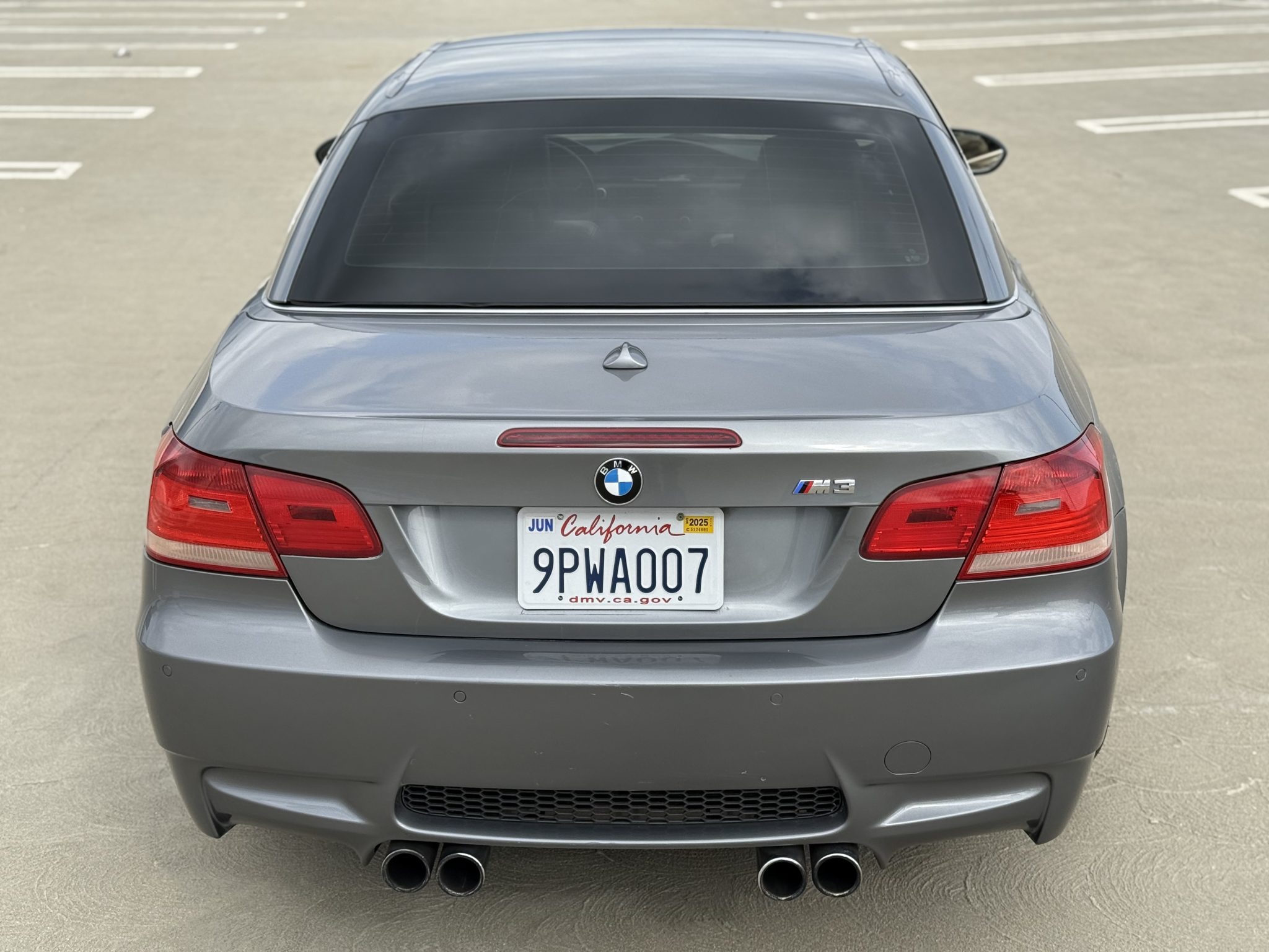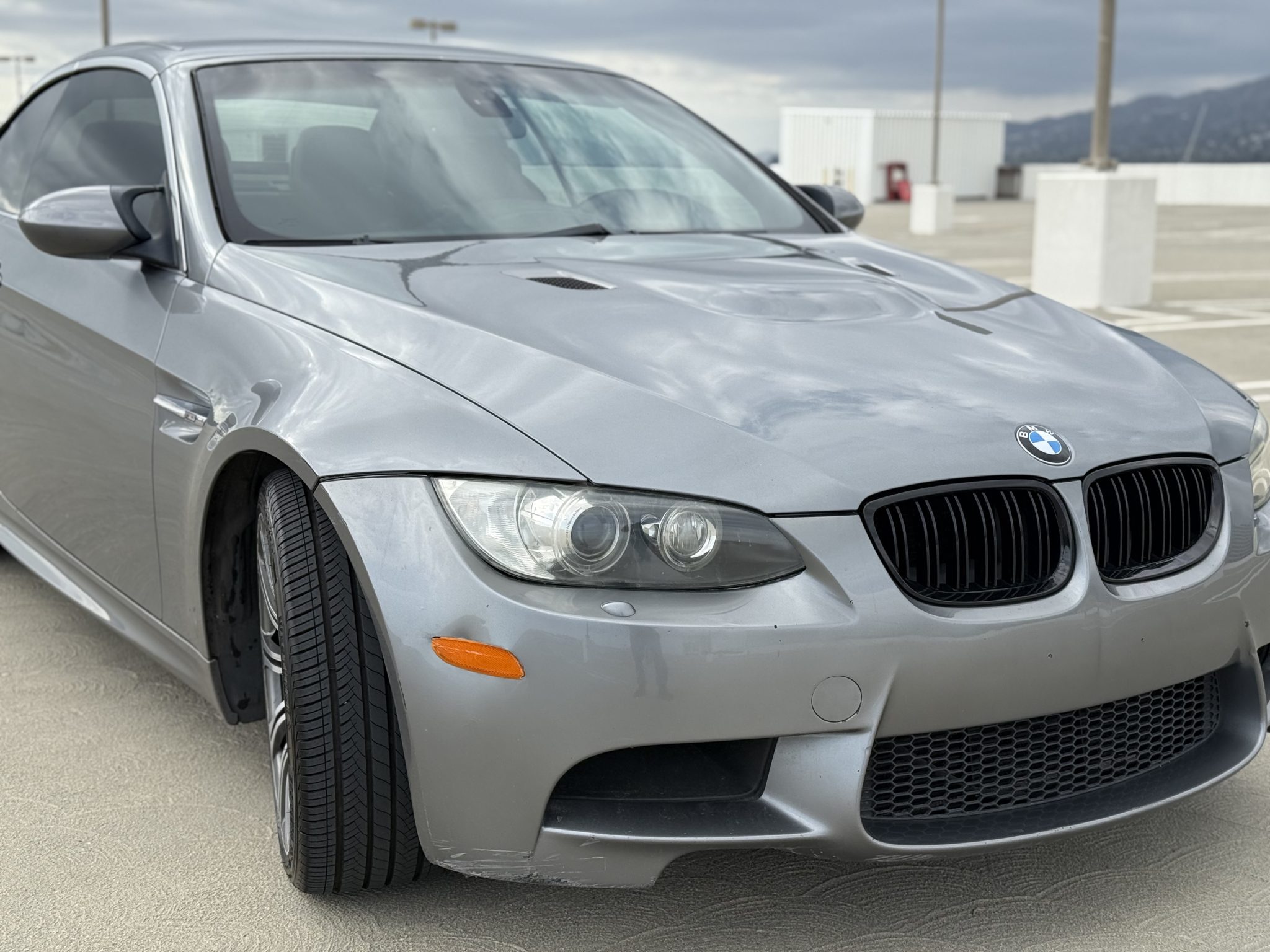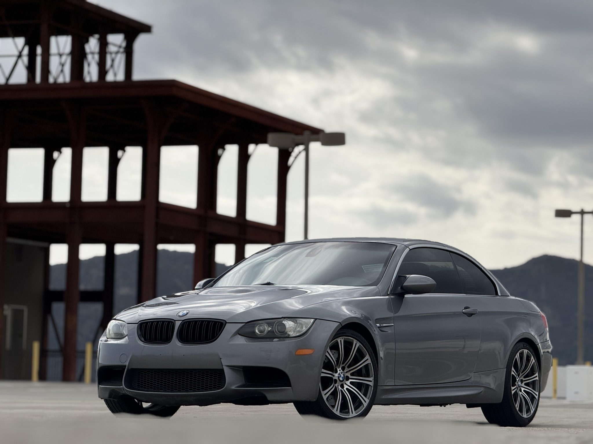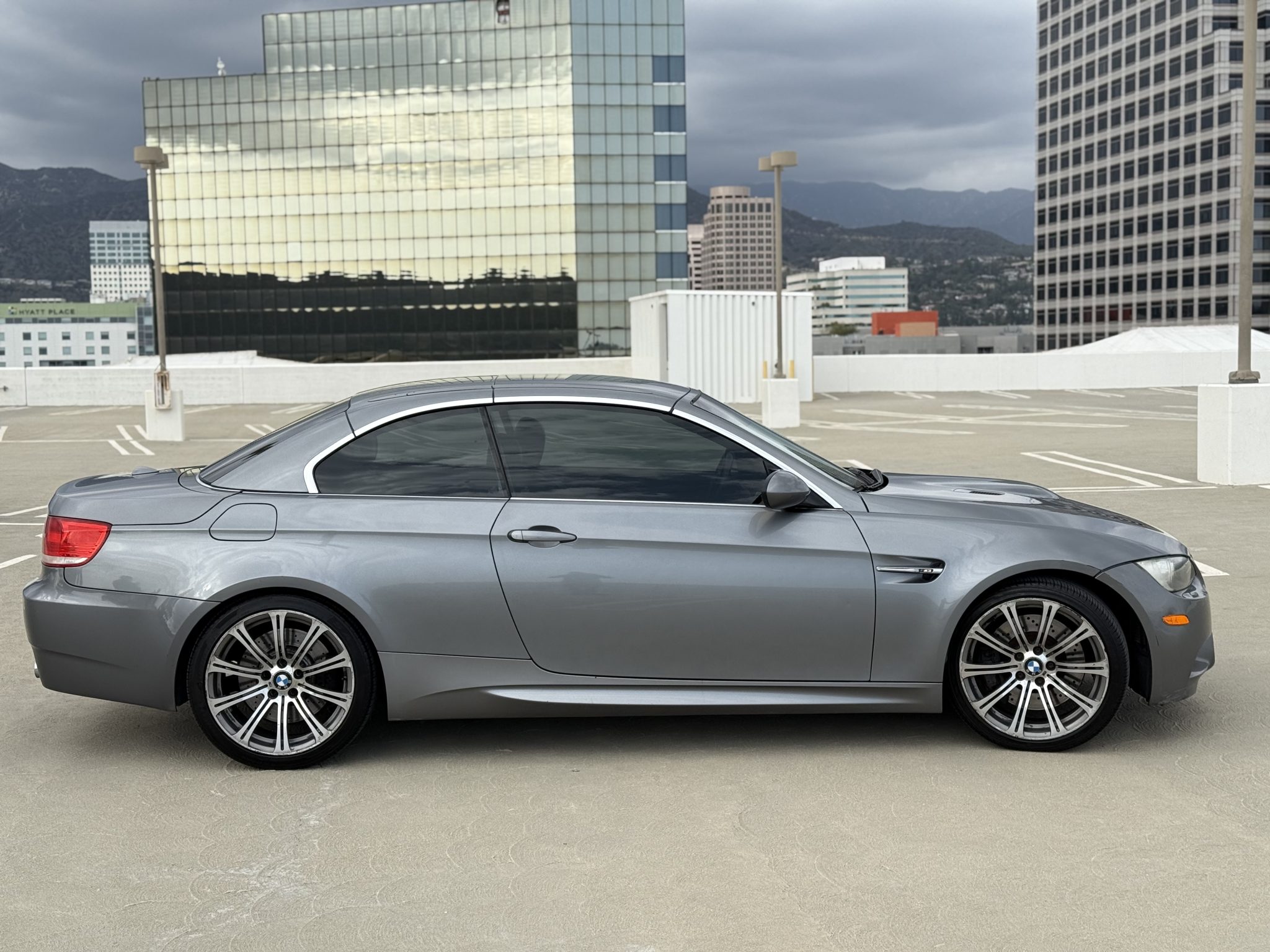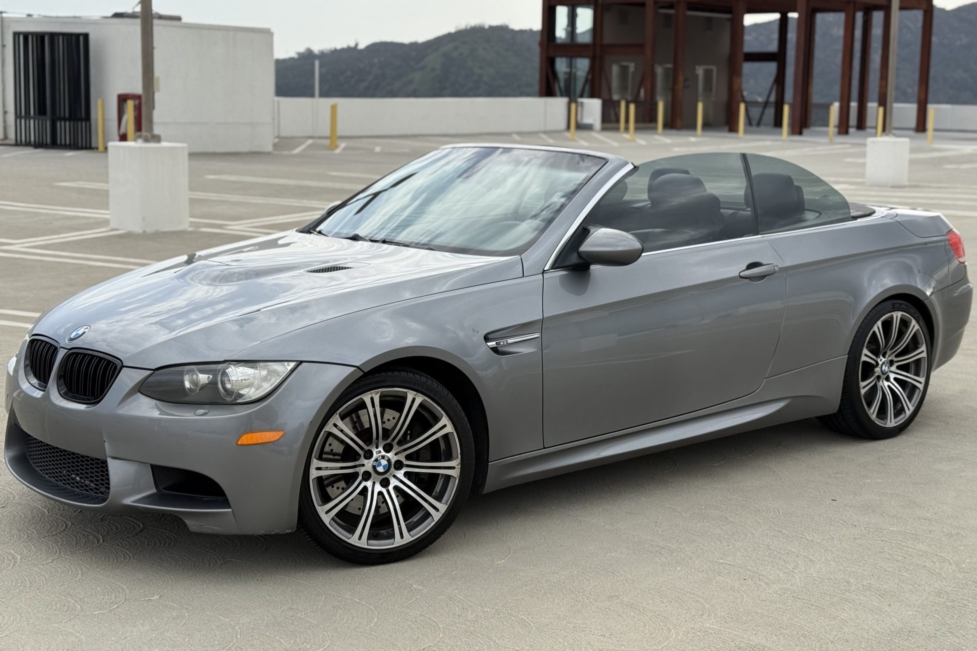 This 2008 BMW M3 convertible has spent a total of 15 years registered in California, and it is powered by a 4.0-liter V8 paired with a six-speed manual transmission. The car is finished in Space Gray Metallic over Black Novillo leather, and equipment includes a limited-slip differential, 19″ forged Style 220 wheels, adaptive xenon headlights, a retractable hardtop, rear parking sensors, heated front seats, dual-zone automatic climate control, and Comfort Access. Purchased by the seller in May 2023, this E93 M3 has 131k miles and is now offered with a clean Carfax report and a clean California title in the seller’s name. The car is finished in Space Gray Metallic (A52) and features a retractable hardtop and adaptive xenon headlights as well as rain-sensing wipers, headlight washers, rear parking sensors, and quadruple exhaust outlets. Scratches are present on the front bumper cover. Forged 19″ Style 220 wheels show imperfections and are mounted with Westlake tires that were installed under current ownership. The car features Dynamic Stability Control (DSC). Braking is handled by four-wheel vented and cross-drilled discs measuring 14.2″ and 13.8″ front and rear, respectively. The heated power-adjustable front sport seats are upholstered in Black Novillo leather, while wood trim accents the dashboard and door panels. Amenities include Comfort Access, driver-seat position memory settings, navigation, a CD stereo, dual-zone automatic climate control, and cruise control. The leather-wrapped steering wheel features tri-color stitching and frames an M-branded tachometer, a 200-mph speedometer, a central information display, and gauges for oil temperature and fuel level. The digital odometer indicates 131k miles, approximately 4k of which were added under current ownership. The 4.0-liter S65 V8 features double-VANOS variable valve timing and was factory rated at 414 horsepower and 295 lb-ft of torque. Power is sent to the rear wheels through a six-speed manual transmission and a Variable M Differential Lock. The Carfax report shows no accidents or other damage.