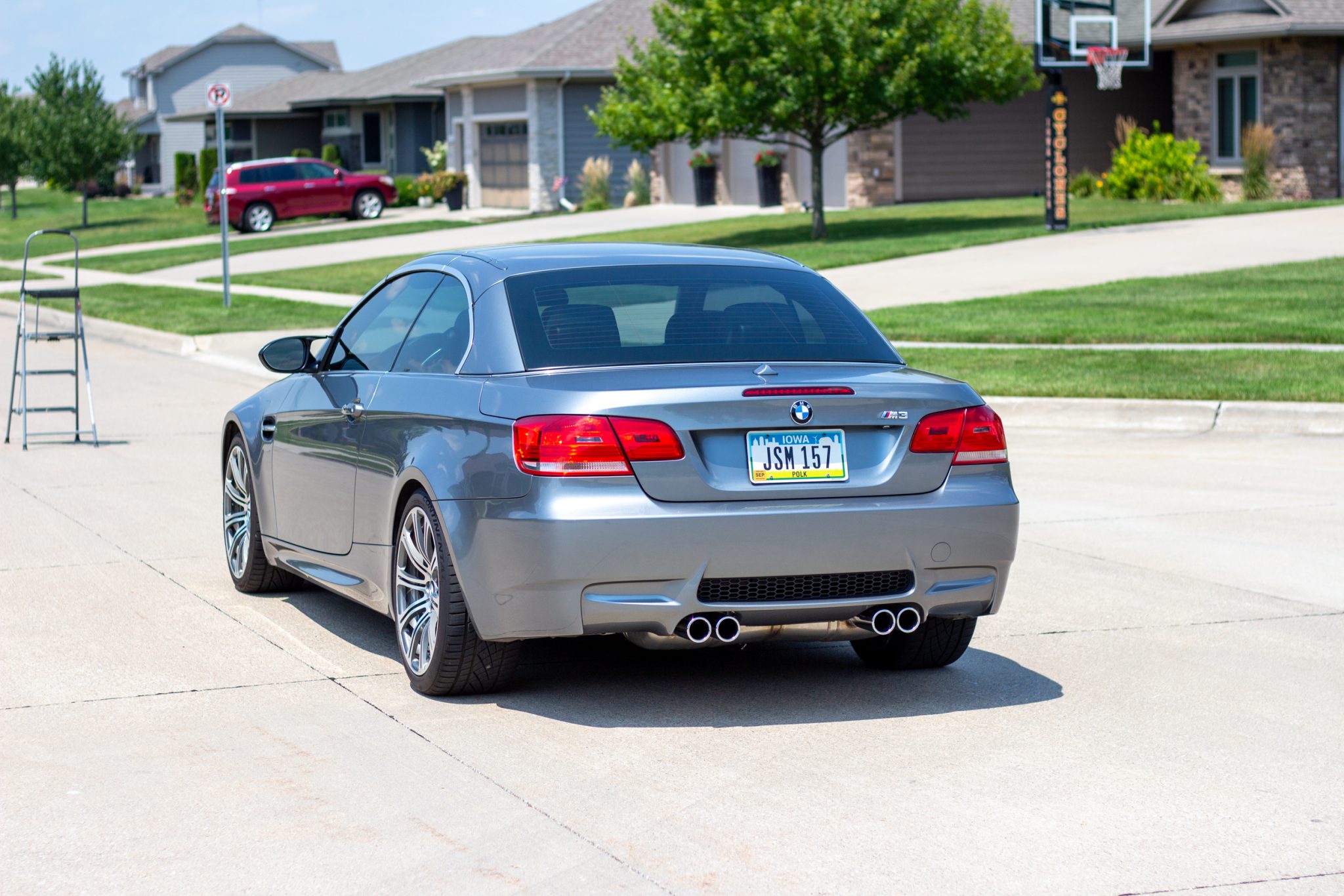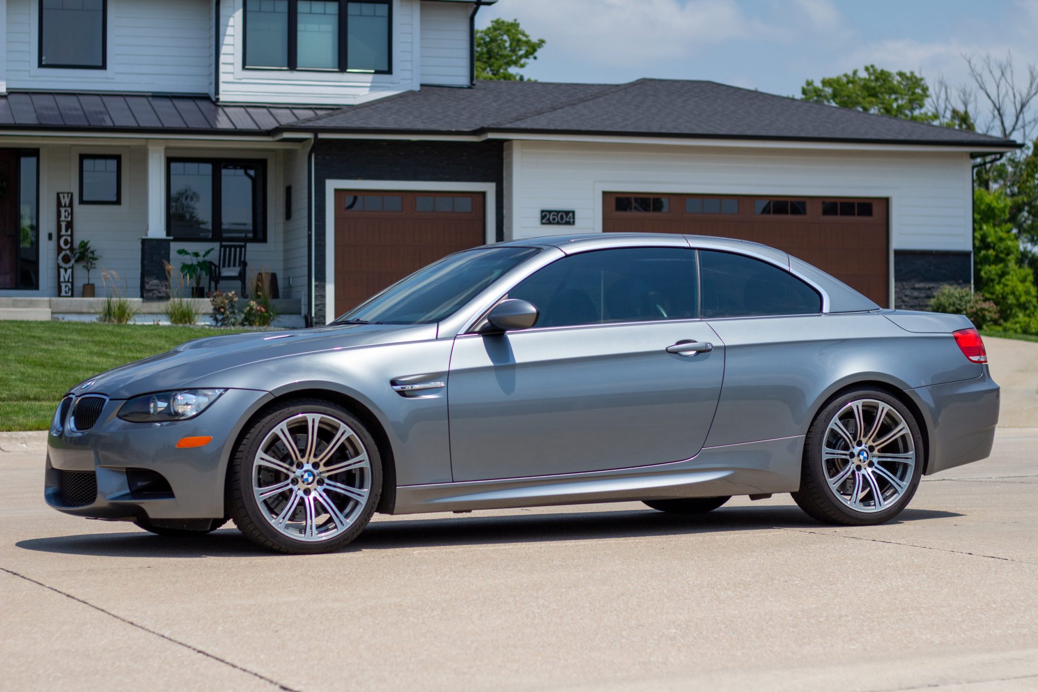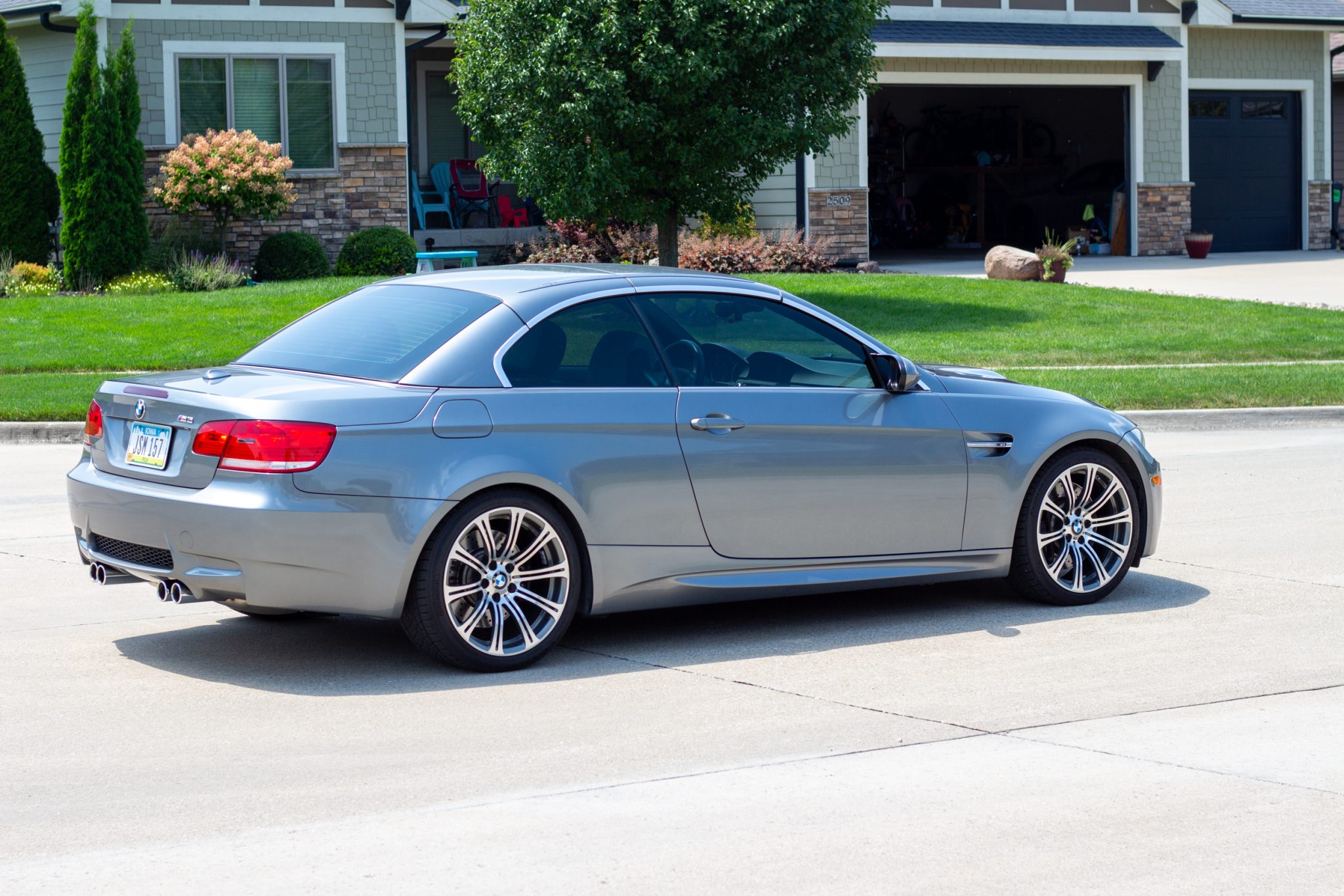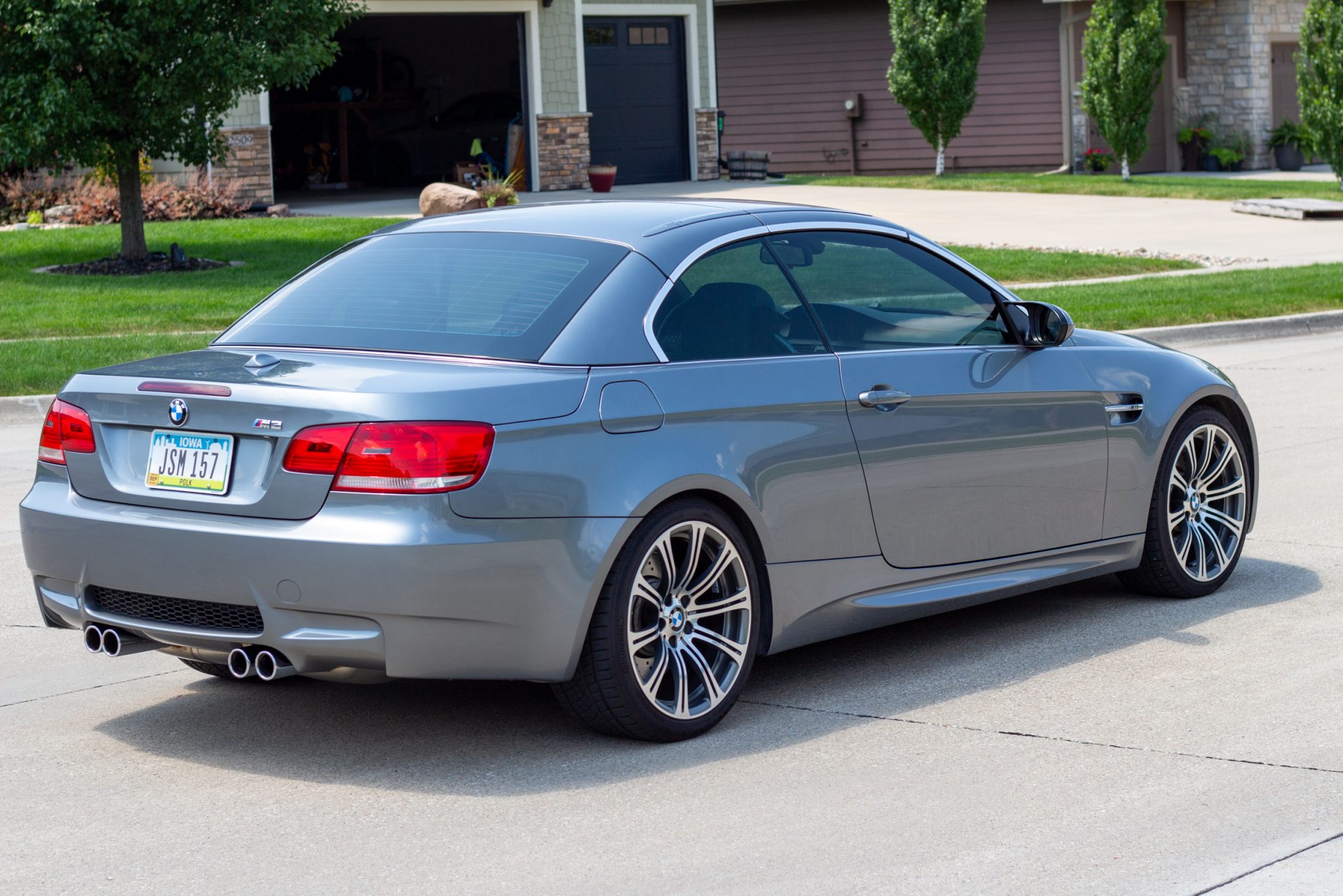This 2008 BMW M3 convertible is powered by a 4.0-liter V8 paired with a six-speed manual transmission and is finished in Space Grey Metallic over Palladium Silver Novillo leather. Indicating 53k miles, the car is equipped with an aftermarket air intake, 19″ forged Style 220 wheels, a limited-slip differential, xenon headlights, a retractable hardtop, heated front seats, navigation, dual-zone automatic climate control, and cruise control. It was purchased by the seller in 2020, and subsequent work has included replacing the rod bearings, valve cover gaskets, throttle control actuators, spark plugs, motor mounts, transmission mounts, fuel injectors, thermostat, and tires. This E93 M3 is offered with spare parts, service records, a clean Carfax report, and a clean Iowa title in the seller’s name. The car is finished in Space Grey Metallic and features a retractable hardtop and adaptive xenon headlights as well as rain-sensing wipers, and quadruple exhaust outlets. Paint correction was performed under prior ownership, and there are paint chips on the front bumper cover and side skirts and pitting on the windshield. Close-up photographs of the exterior finish and trim are shown in the gallery below. Forged 19″ Style 220 wheels are fitted with Continental tires that were mounted in September 2022. The car features Dynamic Stability Control (DSC). Braking is handled by four-wheel vented and cross-drilled discs measuring 14.2″ and 13.8″ front and rear, respectively. The brake fluid was changed in 2023. The heated power-adjustable front sport seats are upholstered in Palladium Silver Novillo leather, and Carbon Structure Leather trim accents the dashboard and doors. Amenities include iDrive with navigation, Comfort Access keyless entry, a CD stereo, dual-zone automatic climate control, and cruise control. The seller notes areas of wear on the driver’s inner door handle and seat bolster. The multi-function leather-wrapped steering wheel features tri-color stitching and frames an M-branded tachometer, a 200-mph speedometer, a central information display, and gauges for oil temperature and fuel level. The digital odometer indicates 53k miles, approximately 11k of which were added under current ownership. The 4.0-liter S65 V8 features double-VANOS variable valve timing and was factory rated at 414 horsepower and 295 lb-ft of torque. An Eventuri carbon-fiber air intake has been added. The rod bearings, throttle control actuators, spark plugs, and motor mounts were replaced in April 2021, and work performed since has included replacing the fuel injectors, fuel pressure sensor, thermostat, and coolant temperature sensor. An oil change was performed in May 2024. The removed air intake is included in the sale. Power is sent to the rear wheels through a six-speed manual transmission and a Variable M Differential Lock. The differential fluid was changed in 2021, and the transmission mounts were replaced in 2023. The Carfax report is free of accidents or other reported damage.