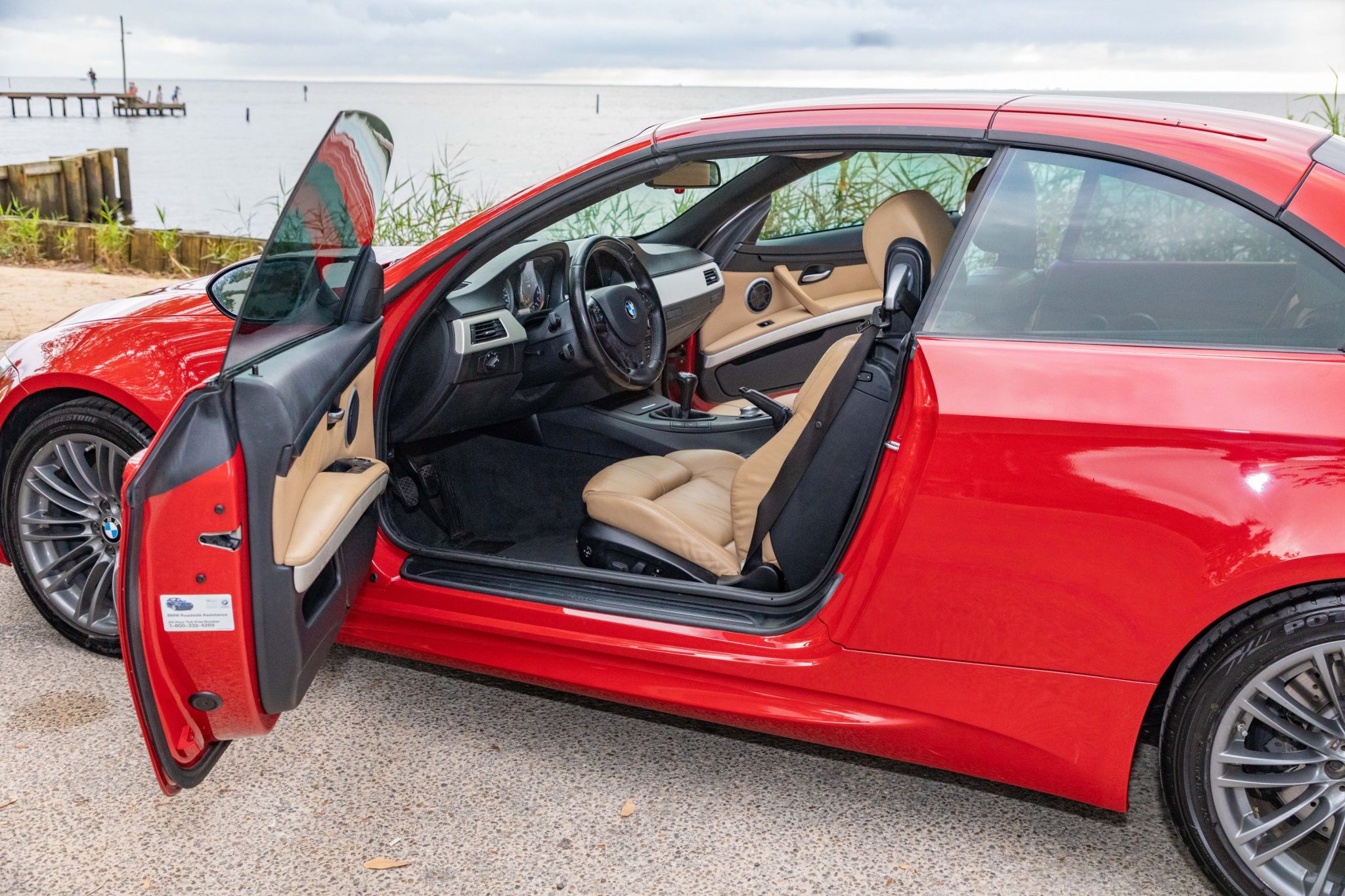 This 2008 BMW M3 convertible is finished in Melbourne Red Metallic over beige leather and is powered by a 4.0-liter V8 paired with a six-speed manual transmission. Equipment includes heated and power-adjustable front seats, iDrive with navigation, adaptive xenon headlights, automatic climate control, rain-sensing windshield wipers, and Electronic Damper Control. The car spent time in North Carolina and Kentucky prior its acquisition in 2014 by the seller, who has since added 60k of the 99k miles it now has. Recent service included a brake fluid flush and an oil change, and the clutch components were replaced in 2019. This E93 M3 convertible is now offered with service records, Blackstone Laboratories oil analysis reports, a clean Carfax report, and a clean Alabama title in the seller’s name. The exterior is finished in Melbourne Red Metallic (A75) with a retractable hardtop. Additional features include adaptive xenon headlights and rain-sensing wipers, and a ceramic coating was applied in preparation for the sale. The seller reports that the top sticks on the left side when being raised, and notes that the clearcoat is lifting near the headlights as well as the presence of rock chips on the hood and front bumper. The rear bumper cover was repainted following a driveway incident, though the accompanying Carfax report shows no accidents or other damage. Factory 18” double-spoke wheels wear Bridgestone Potenza S0-4 tires measuring 245/40 in the front and 265/40 at the rear. The E9x-series M3 utilizes cross-drilled and ventilated disc brakes all around, and service during current ownership included a brake fluid flush and replacement of the brake rotors, pads, and sensors. The car is also equipped with Electronic Damper Control (EDC). The interior features Bamboo Beige Novillo leather (NCH3) on the seating surfaces and door panels, as well as a contrasting black dashboard accented by aluminum trim. Amenities include heated and power-adjustable front seats, dual-zone automatic climate control, iDrive with navigation, and a CD stereo. A leather-wrapped M Sport steering wheel frames a 200-mph speedometer and 9k-rpm tachometer. The digital odometer shows just under 99k miles, approximately 60k of which were added during current ownership. Peeling of the steering wheel and door pull trim is visible. The 4.0-liter S65 V8 produced 414 horsepower at 8,300 rpm and 295 lb-ft of torque at 3,900 rpm and is paired with a six-speed manual gearbox. The seller reports that the clutch, pressure plate, and flywheel were replaced in 2019, the engine and transmission mounts were replaced in 2017, and the left and right-side throttle actuators were replaced in 2014 and 2017, respectively. An oil change was performed in April 2020, and Blackstone Laboratories oil analysis reports are provided in the gallery below. The lower engine splash shield was removed by the seller due to damage, and the mounting cables are included. Additional underside photos can be viewed in the gallery. The May 2020 Carfax report lists no accidents or other damage and shows registration history in North Carolina, Kentucky, and Alabama. A cold-start video is provided below.