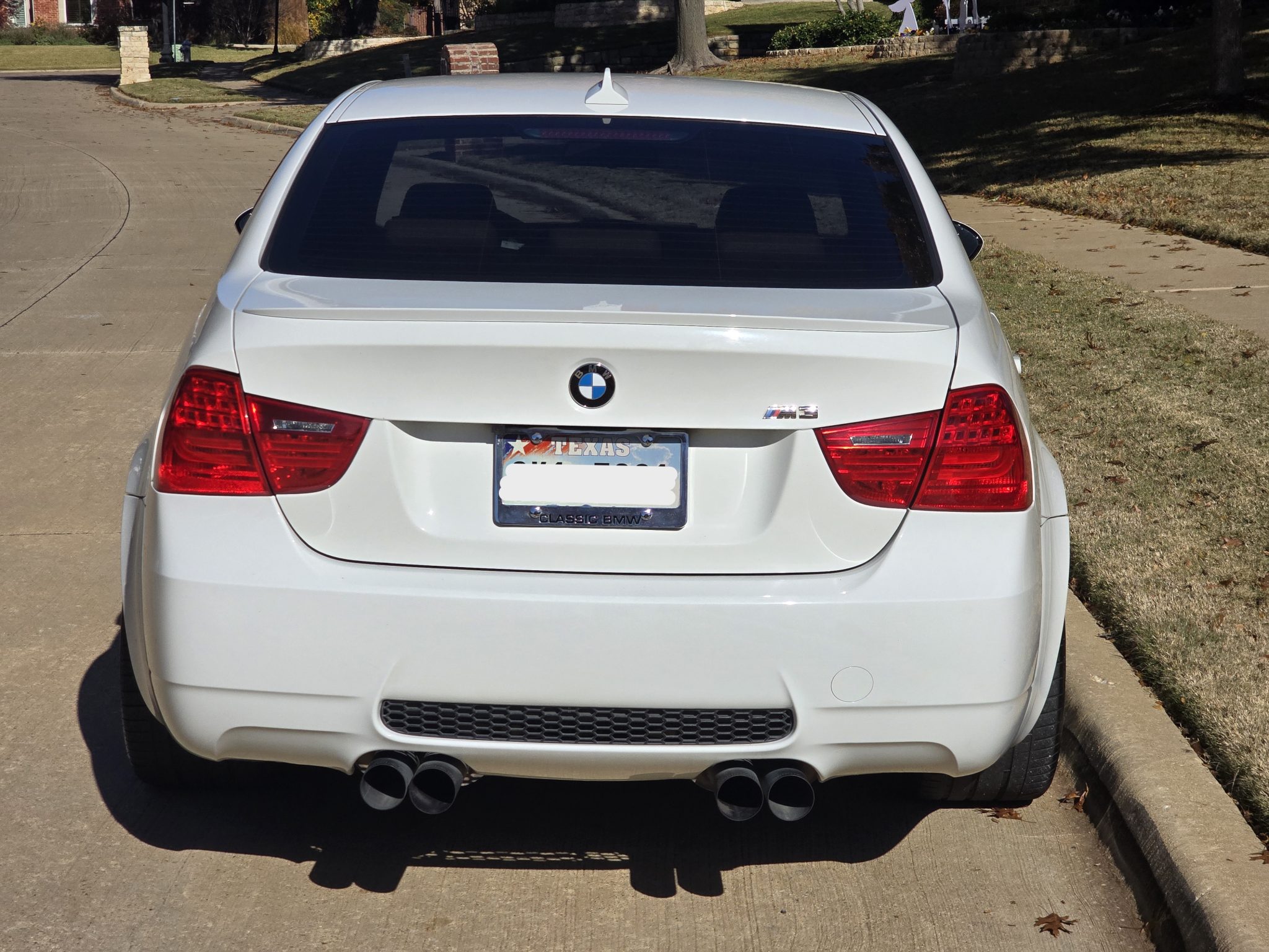 This 2009 BMW M3 sedan was purchased by the seller in January 2010, and it has 96k miles. The car is powered by a 4.0-liter V8 paired with a seven-speed dual-clutch transmission and has been modified with a Dinan engine tune and exhaust system. It is finished in Alpine White over Bamboo Beige Novillo leather. Features include 19″ forged Style 220 wheels, adaptive suspension, a limited-slip differential, xenon headlights, heated front power-adjustable front seats, navigation, an aftermarket sound system, front-view and rear-view cameras, dual-zone automatic climate control, Comfort Access keyless entry, and cruise control. This E90 M3 is now offered with the owner’s manual, service records, and a clean Texas title in the seller’s name. The car is finished in Alpine White (300) and features Shadowline trim and adaptive xenon headlights as well as rain-sensing wipers, “Angel Eye” LED daytime running lights, front-view and rear-view cameras, power-folding side mirrors, a trunk lid spoiler, and quadruple exhaust outlets. The Carfax report notes damage in an October 2013 entry, and the rear bumper cover was replaced as a result, per the seller. Paintless dent removal was performed in February 2023. There are paint chips on the front fenders. Forged 19″ Style 220 wheels are mounted with Vredestein Ultrac Vorti tires. The car is equipped with an adaptive suspension, and braking is handled by four-wheel vented and cross-drilled discs measuring 14.2″ and 13.8″ front and rear, respectively. A brake fluid flush was performed in February 2023. The front-right tire has been plugged, and there are scratches on the right rear wheel. The heated power-adjustable front sport seats are upholstered in Bamboo Beige Novillo leather, and Walnut Wood trim accents the dashboard and doors. Amenities include iDrive with navigation, Comfort Access keyless entry, a CD stereo, dual-zone automatic climate control, and cruise control. The sound system has been modified with a JL Audio amplifier, a JBL digital sound processor, Rainbow speakers, and Kicker subwoofers. A hardwired laser deflector has been fitted. There are scratches on the right side of the dashboard, and the rubber trim on the driver’s door is in need of replacement. The leather-wrapped steering wheel shows signs of wear and features paddle shifters and tri-color stitching. Instrumentation includes an M-branded tachometer, a 200-mph speedometer, a central information display, and gauges for oil temperature and fuel level. The digital odometer indicates 96k miles, approximately 86k of which were added under current ownership. The 4.0-liter S65 V8 features double-VANOS variable valve timing and has been modified with a Dinan stage 1 engine tune and exhaust system. Power is sent to the rear wheels through a seven-speed M-DCT dual-clutch transmission and a Variable M Differential Lock. The engine and transmission wiring harnesses were replaced along with the mechatronic seals in December 2020, the windshield washer pump and AC compressor were replaced in April 2021, and the flywheel, upper timing cover gaskets, valve cover gaskets, rear crankshaft seal, and spark plug tubes were replaced in February 2023. The Carfax report shows the aforementioned damage and at least one open manufacturer safety recall.