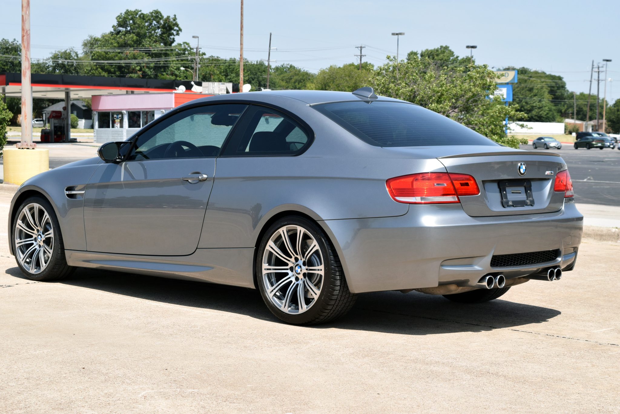 This 2009 BMW M3 coupe has remained registered in Texas through the selling dealer’s acquisition from the original owner in 2023 and now has 62k miles. It is powered by a 4.0-liter V8 paired with a seven-speed dual-clutch transmission and is finished in Space Gray Metallic over black Novillo leather upholstery. Equipment includes the Premium and Technology packages as well as 19″ forged Style 220 wheels, a limited-slip differential, adaptive xenon headlights, a rear spoiler, a sunroof, power-adjustable front seats, iDrive with navigation, dual-zone automatic climate control, and cruise control. This E92 M3 is now offered by the selling dealer with the owner’s manual, two keys, a clean Carfax report, and a clean Texas title. The car is finished in Space Gray Metallic and features Shadowline trim and adaptive xenon headlights as well as rain-sensing wipers, a glass sunroof, a trunk lid spoiler, window tint, and quadruple exhaust outlets. Paint protection film has reportedly been applied to the front end. Forged 19″ Style 220 wheels are mounted with Michelin tires measuring 245/35 up front and 265/35 at the rear. The car features Dynamic Stability Control (DSC), and braking is handled by four-wheel vented and cross-drilled discs measuring 14.2″ and 13.8″ front and rear, respectively. The power-adjustable front sport seats are upholstered in black Novillo leather, and Carbon Structure Leather trim accents the dashboard and doors. M3-branded floor mats line the footwells, and additional appointments include driver-seat position memory settings, a CD stereo, dual-zone automatic climate control, iDrive with navigation, and cruise control. A replacement cabin air filter was installed in April 2022. The multi-function leather-wrapped steering wheel features paddle shifters in addition to tri-color stitching and frames an M-branded tachometer, a 200-mph speedometer, a central information display, and gauges for oil temperature and fuel level. The digital odometer indicates 62k miles. The 4.0-liter S65 V8 features double-VANOS variable valve timing and was factory rated at 414 horsepower and 295 lb-ft of torque. The air filter and spark plugs were replaced in April 2022, and an oil change was performed in preparation for the sale. Power is sent to the rear wheels through a seven-speed M-DCT dual-clutch transmission and a Variable M Differential Lock. The transmission was serviced in April 2022. Additional photos of the underside are presented in the gallery below. The Carfax report shows no accidents or other damage and lists history in Texas through the most recent entry in December 2022.