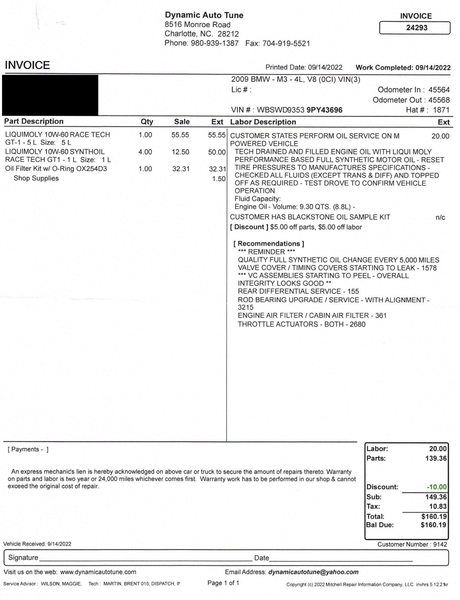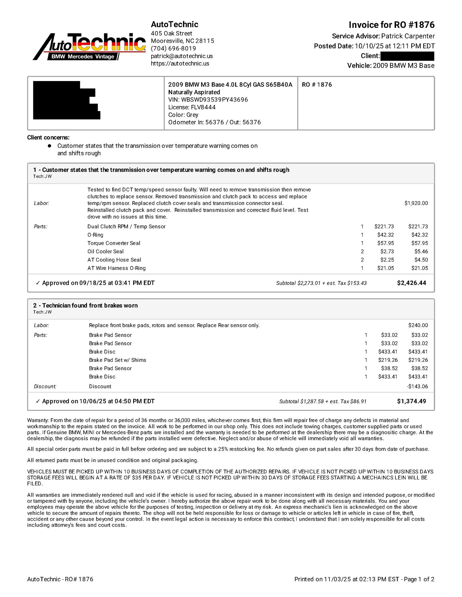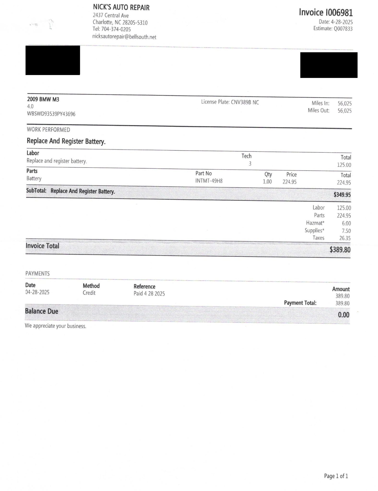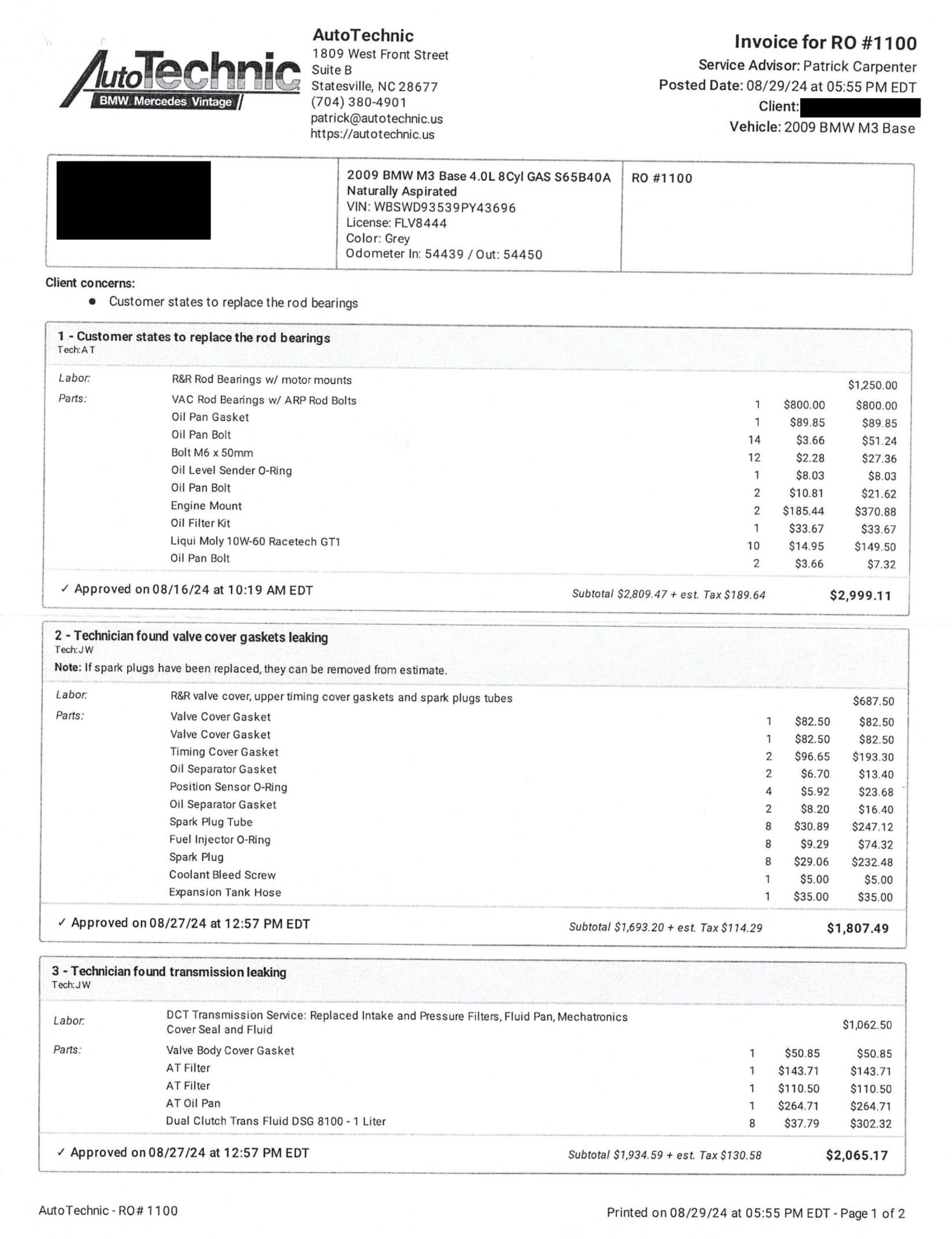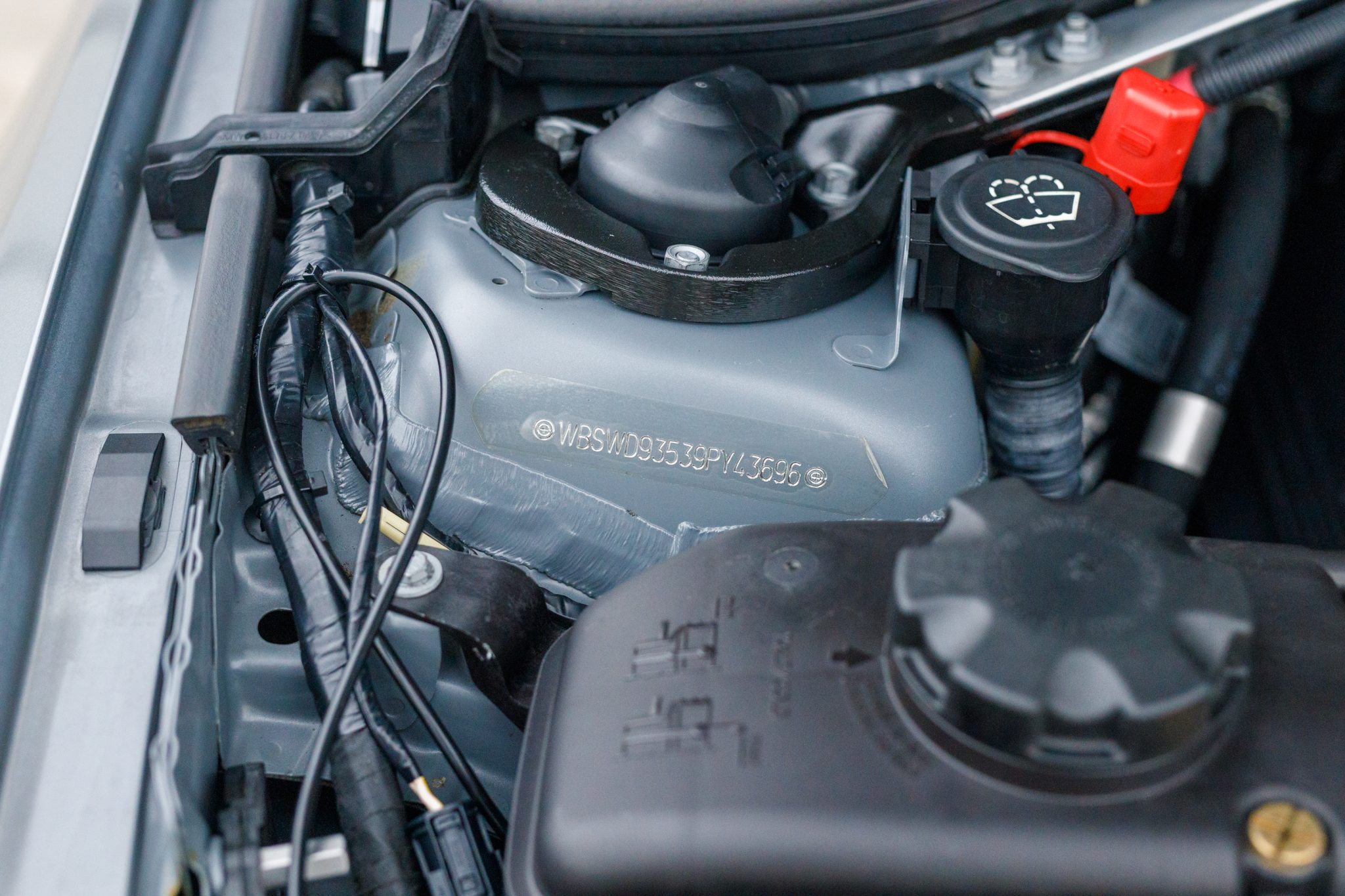 This 2009 BMW M3 coupe was first registered in North Carolina and has remained in the state following the current owner’s acquisition in 2020. Work since then involved installing ARP connecting rod bolts and Bilstein B6 shock absorbers in addition to servicing the transmission and replacing the rod bearings, throttle valve actuators, oil pan gasket, thermostat, DMTL pump, upper timing chain gaskets, valve cover gaskets, spark plugs, and various brake components. Finished in Space Gray Metallic over Black Novillo leather, the car is powered by a 4.0-liter V8 linked with a seven-speed dual-clutch transmission and a limited-slip differential. Further equipment includes 19″ forged Style 220 wheels, a sunroof, xenon headlights, heated front seats, and iDrive with navigation. This E92 M3 has 57k miles and is now offered on dealer consignment with manufacturer’s literature, partial service records, a clean Carfax report, and a clean North Carolina title. The car is finished in Space Gray Metallic (A52) and features Shadowline trim and adaptive xenon headlights as well as rain-sensing wipers, a glass sunroof, a trunk lid spoiler, and quadruple exhaust outlets. The front bumper cover reflectors have been removed and replaced with body-color caps. Forged 19″ Style 220 wheels are wrapped in 245/35 front and 265/35 rear Michelin Pilot Sport A/S 3 tires showing a mixture of 2018 and 2019 date codes. The car features Electronic Damping Control (EDC), and Bilstein B6 Performance shocks were fitted in 2023. Braking is handled by four-wheel vented and cross-drilled discs measuring 14.2″ and 13.8″ front and rear, respectively. The front brake pads, rotors, and sensors were replaced in preparation for the sale, at which time the rear brake pad wear sensor was also changed. The heated power-adjustable front sport seats are upholstered in Black Novillo leather, and Carbon Structure Leather trim accents the dashboard and doors. Amenities include Comfort Access keyless entry, a CD stereo, dual-zone automatic climate control, cruise control, and iDrive with navigation. The right door lock actuator was replaced in May 2025, and wear is noted on the left door panel. The multifunction leather-wrapped steering wheel features paddle shifters along with tri-color stitching and frames an M-branded tachometer, a 200-mph speedometer, a central information display, and gauges for oil temperature and fuel level. The digital odometer indicates 57k miles, approximately 27k of which have been added under current ownership. The 4.0-liter S65 V8 features double-VANOS variable valve timing and was factory rated at 414 horsepower and 295 lb-ft of torque. Service since 2020 involved installing ARP connecting rod bolts and replacing the rod bearings, both throttle valve actuators, oil pan gasket, battery, thermostat, oil level sensor O-ring, oil separator gasket, DMTL pump, valve cover gaskets, upper timing chain gaskets, spark plug tubes, spark plugs, and expansion tank hose. The seller notes there is an oil leak from one of the valve covers. Power is sent to the rear wheels through a seven-speed M-DCT dual-clutch transmission and a Variable M Differential Lock. Service since August 2024 involved changing the transmission fluid and replacing the Mechatronics cover seal, filter, valve body gasket, dual-clutch temperature sensor, wiring harness O-ring, and torque convertor, cooling hose, and oil cooler seals. Manufacturer’s literature, partial service records, and the removed factory front reflectors will be included in the sale. The Carfax report is free of accidents or other reported damage.