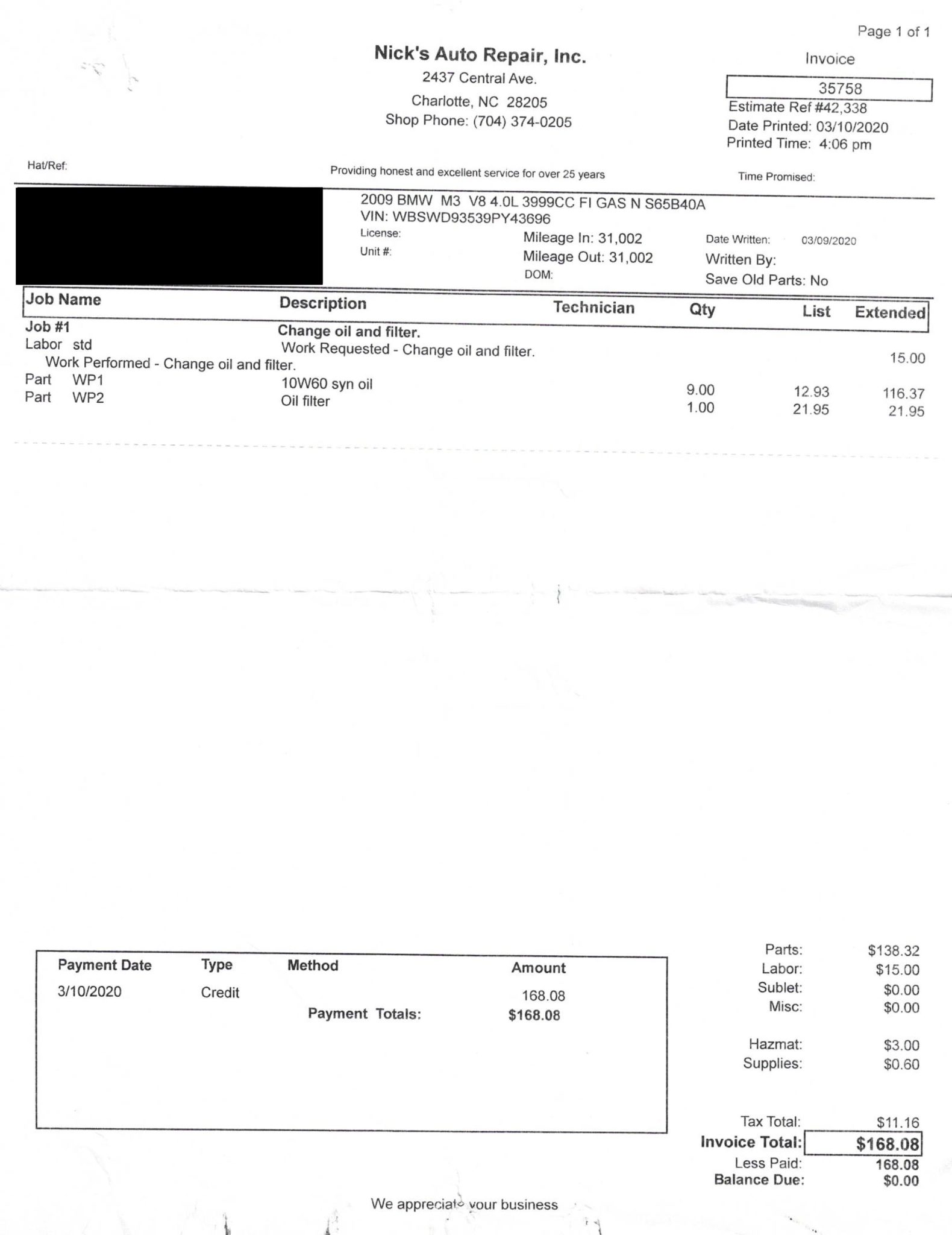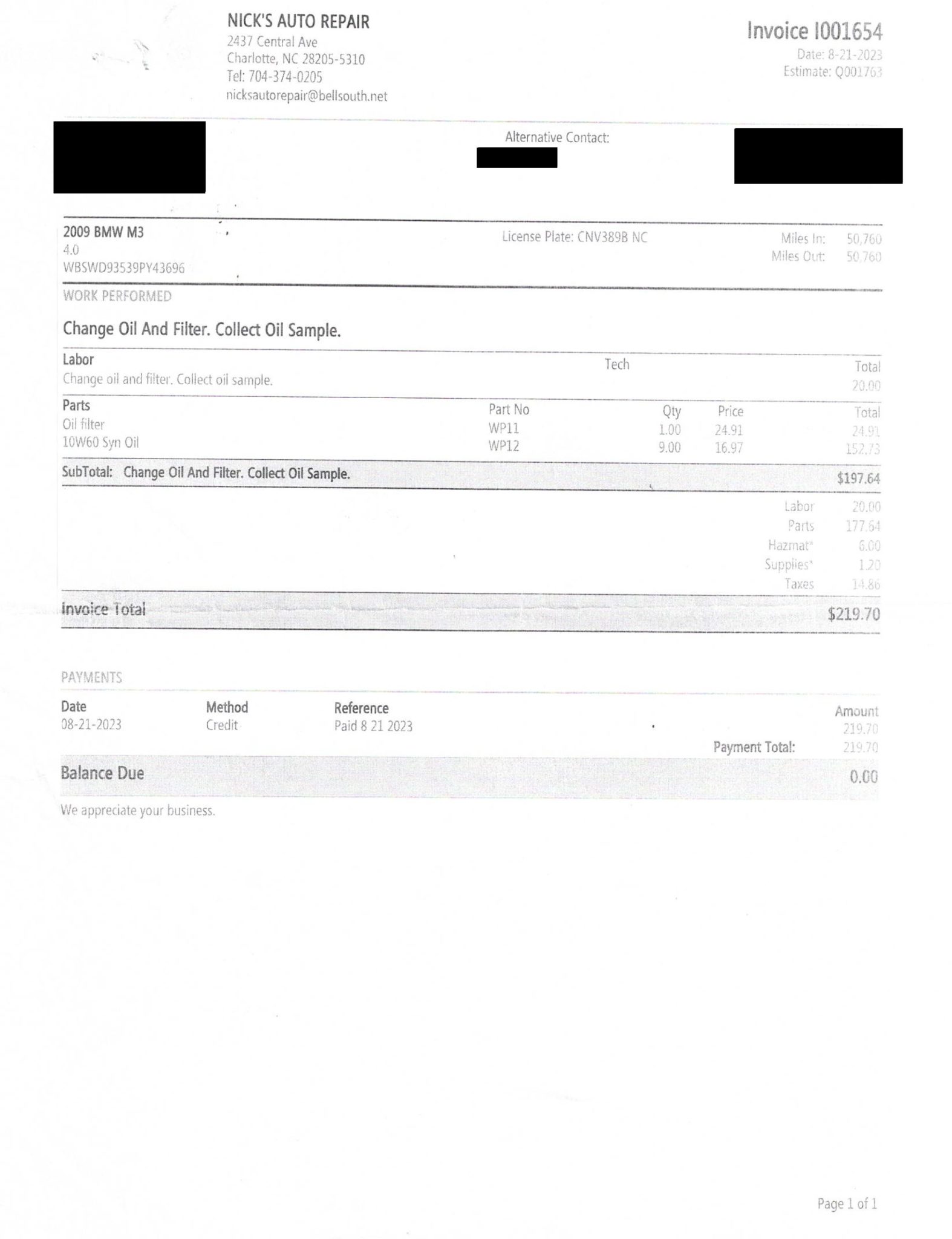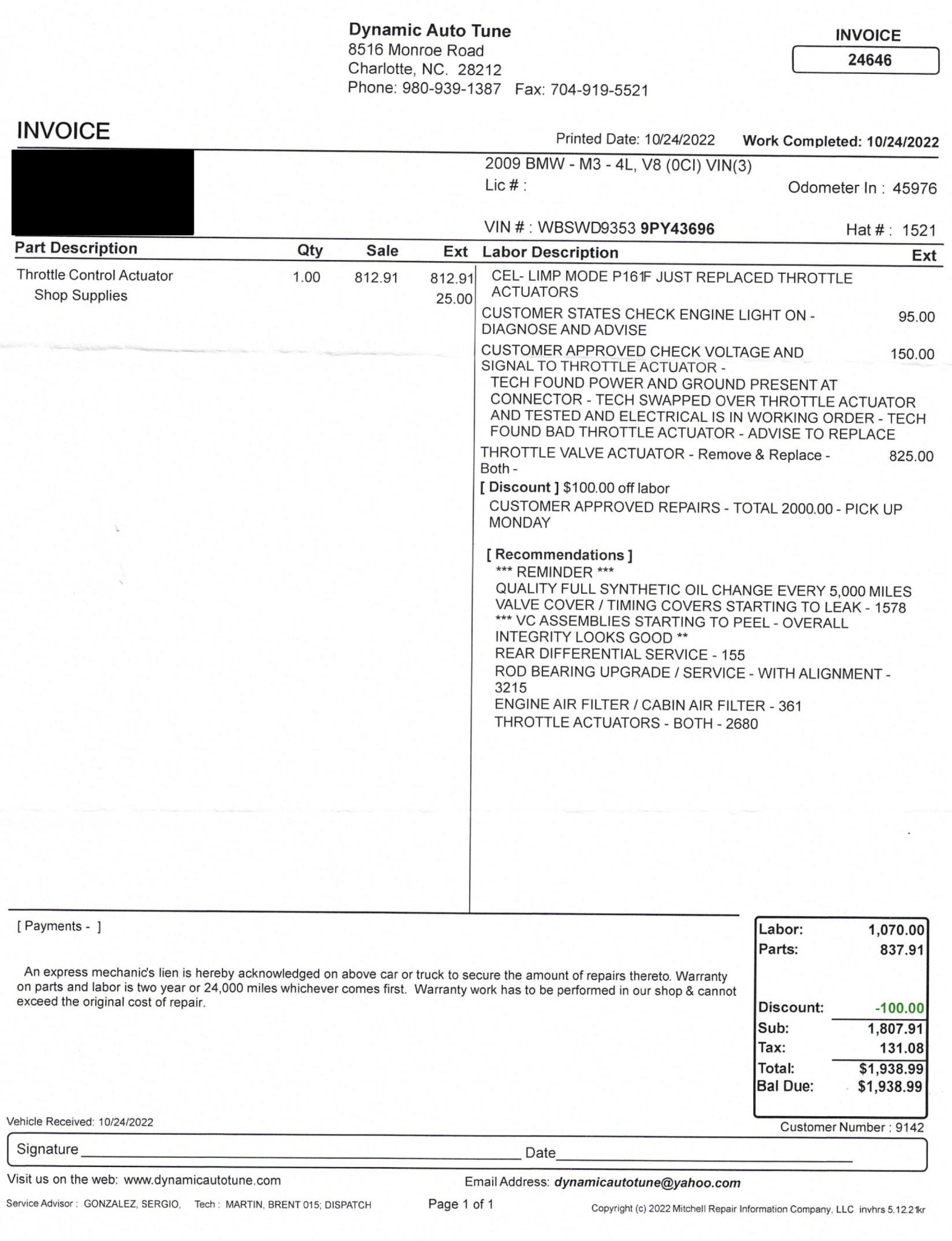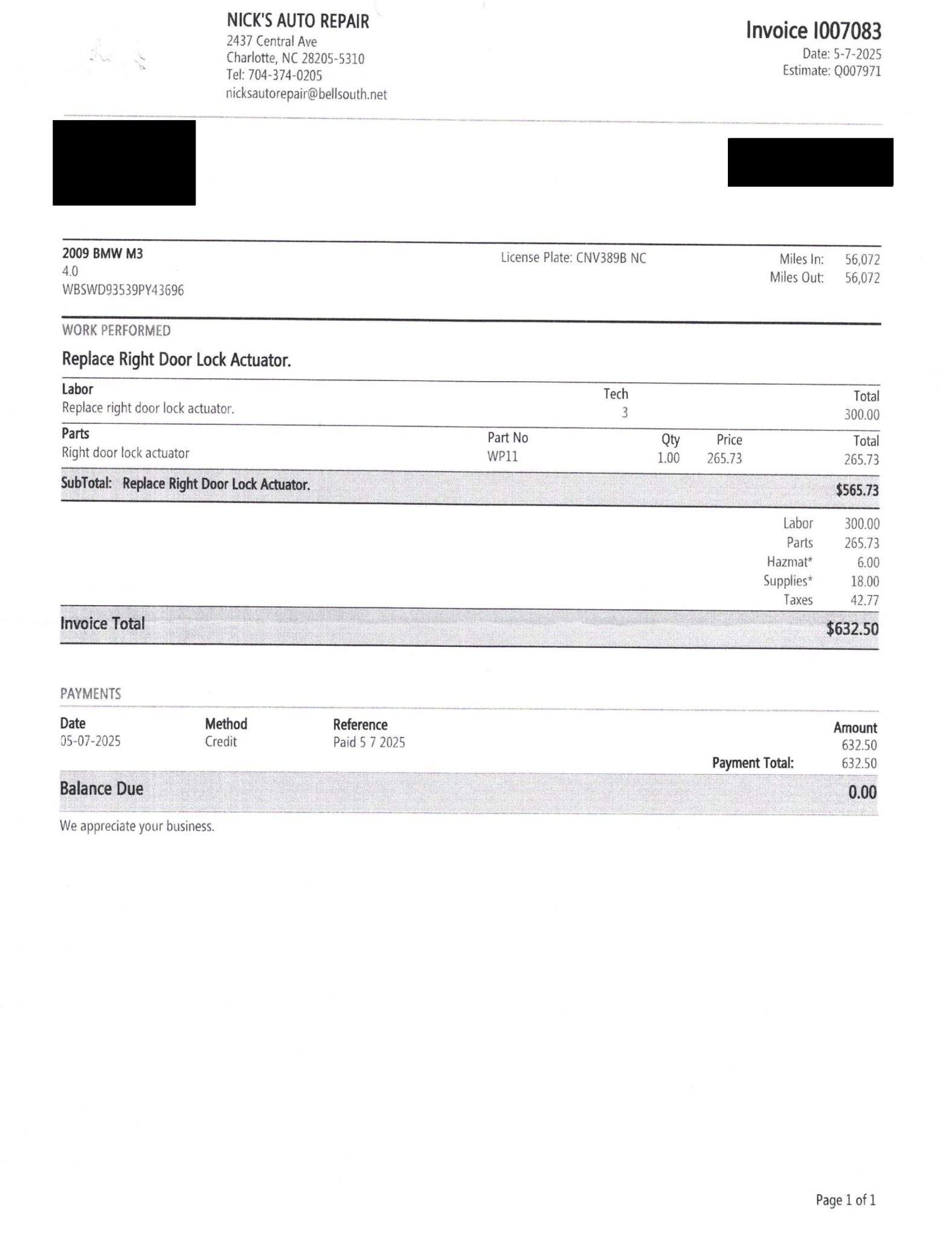 This 2009 BMW M3 coupe was first registered in North Carolina and has remained in the state following the current owner’s acquisition in 2020. Work since then involved installing ARP connecting rod bolts and Bilstein B6 shock absorbers in addition to servicing the transmission and replacing the rod bearings, throttle valve actuators, oil pan gasket, thermostat, DMTL pump, upper timing chain gaskets, valve cover gaskets, spark plugs, and various brake components. Finished in Space Gray Metallic over Black Novillo leather, the car is powered by a 4.0-liter V8 linked with a seven-speed dual-clutch transmission and a limited-slip differential. Further equipment includes 19″ forged Style 220 wheels, a sunroof, xenon headlights, heated front seats, and iDrive with navigation. This E92 M3 has 57k miles and is now offered on dealer consignment with manufacturer’s literature, partial service records, a clean Carfax report, and a clean North Carolina title. The car is finished in Space Gray Metallic (A52) and features Shadowline trim and adaptive xenon headlights as well as rain-sensing wipers, a glass sunroof, a trunk lid spoiler, and quadruple exhaust outlets. The front bumper cover reflectors have been removed and replaced with body-color caps. Forged 19″ Style 220 wheels are wrapped in 245/35 front and 265/35 rear Michelin Pilot Sport A/S 3 tires showing a mixture of 2018 and 2019 date codes. The car features Electronic Damping Control (EDC), and Bilstein B6 Performance shocks were fitted in 2023. Braking is handled by four-wheel vented and cross-drilled discs measuring 14.2″ and 13.8″ front and rear, respectively. The front brake pads, rotors, and sensors were replaced in preparation for the sale, at which time the rear brake pad wear sensor was also changed. The heated power-adjustable front sport seats are upholstered in Black Novillo leather, and Carbon Structure Leather trim accents the dashboard and doors. Amenities include Comfort Access keyless entry, a CD stereo, dual-zone automatic climate control, cruise control, and iDrive with navigation. The right door lock actuator was replaced in May 2025, and wear is noted on the left door panel. The multifunction leather-wrapped steering wheel features paddle shifters along with tri-color stitching and frames an M-branded tachometer, a 200-mph speedometer, a central information display, and gauges for oil temperature and fuel level. The digital odometer indicates 57k miles, approximately 27k of which have been added under current ownership. The 4.0-liter S65 V8 features double-VANOS variable valve timing and was factory rated at 414 horsepower and 295 lb-ft of torque. Service since 2020 involved installing ARP connecting rod bolts and replacing the rod bearings, both throttle valve actuators, oil pan gasket, battery, thermostat, oil level sensor O-ring, oil separator gasket, DMTL pump, valve cover gaskets, upper timing chain gaskets, spark plug tubes, spark plugs, and expansion tank hose. The seller notes there is an oil leak from one of the valve covers. Power is sent to the rear wheels through a seven-speed M-DCT dual-clutch transmission and a Variable M Differential Lock. Service since August 2024 involved changing the transmission fluid and replacing the Mechatronics cover seal, filter, valve body gasket, dual-clutch temperature sensor, wiring harness O-ring, and torque convertor, cooling hose, and oil cooler seals. Manufacturer’s literature, partial service records, and the removed factory front reflectors will be included in the sale. The Carfax report is free of accidents or other reported damage.