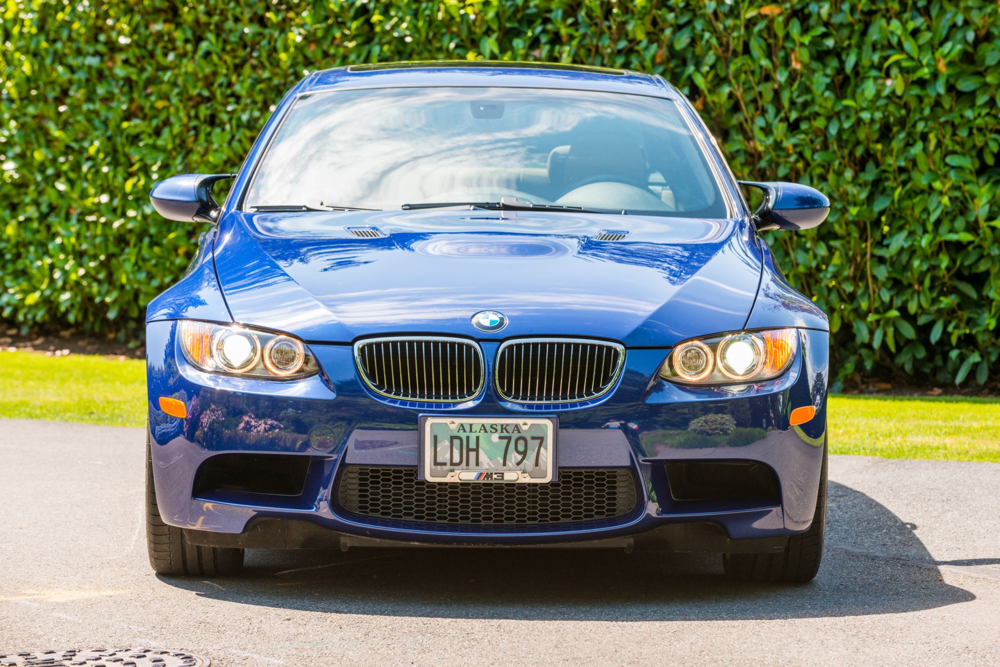 This 2009 BMW M3 coupe is finished in Interlagos Blue Metallic over Bamboo Beige Novillo leather and is powered by a 4.0-liter S65 V8 paired with a six-speed manual transmission. The selling dealer purchased the car on BaT in August 2020, and they have since added approximately 800 of the 18k indicated miles. Equipment includes the Premium and Technology packages as well as an Akrapovič exhaust system, 19″ Style 359 wheels, a limited-slip differential, Electronic Damping Control, adaptive xenon headlights, and iDrive with navigation. This E92 M3 is now offered in California by the selling dealer with a clean Carfax report and a clean Alaska title. The car is finished in Interlagos Blue Metallic with Shadowline trim and features adaptive xenon headlights, rain-sensing wipers, a glass sunroof, a trunk lid spoiler, and quadruple exhaust outlets. The rear bumper cover was repainted under previous ownership, and paint correction has been performed since the previous auction. The 19″ Style 359 wheels are mounted with Michelin Pilot Super Sport tires. The car features M Drive, Electronic Damping Control (EDC), and Dynamic Stability Control (DSC). Braking is handled by four-wheel vented and cross-drilled discs measuring 14.2″ and 13.8″ front and rear, respectively. The heated power-adjustable front sport seats are upholstered in Bamboo Beige Novillo leather, and Anthracite Sycamore Wood trim accents the dashboard and doors. Amenities include a CD stereo, dual-zone automatic climate control, Comfort Access keyless entry, cruise control, and iDrive with navigation. The multi-function leather-wrapped steering wheel features tri-color stitching and frames an M-branded tachometer, a 200-mph speedometer, a central information display, and gauges for oil temperature and fuel level. The digital odometer indicates under 18k miles, approximately 800 of which were added under current ownership. The 4.0-liter S65 V8 revs to over 8,000 rpm and features double-VANOS variable valve timing and was factory rated at 414 horsepower and 295 lb-ft of torque. Power is sent to the rear wheels through a six-speed manual transmission and a Variable M Differential Lock. An Akrapovič exhaust system is installed, and work under current ownership has reportedly included replacing the thermostat and battery. The Carfax report is free of accidents or other reported damage and lists history in Washington State, Alaska, and California.