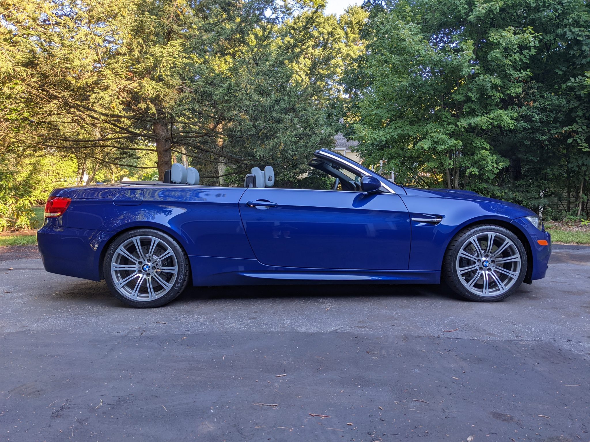 This 2009 BMW M3 convertible has 10k miles and is powered by a 4.0-liter V8 paired with a seven-speed dual-clutch transmission. Finished in Interlagos Blue Metallic over Palladium Silver Novillo leather upholstery, the car is equipped with the Cold Weather and Technology packages in addition to 19″ forged Style 220 wheels, a limited-slip differential, adaptive xenon headlights, a retractable hardtop, rear parking sensors, heated power-adjustable front seats, navigation, dual-zone automatic climate control, and cruise control. The car was purchased new by the seller’s spouse in 2010 and was acquired by the seller in 2017. This E93 M3 is now offered with factory literature, two keys, service records, a clean Carfax report, and a clean Massachusetts title in the seller’s name. The car is finished in Interlagos Blue Metallic and features a retractable hardtop and adaptive xenon headlights as well as rain-sensing wipers, rear parking sensors, and quadruple exhaust outlets. Paint protection film has reportedly been applied to the exterior. A paint imperfection is noted on hood and chips are visible on the front bumper cover, the underside of which is scraped. Forged 19″ Style 220 wheels are mounted with Michelin Pilot Super Sport tires showing 2021 and 2022 date codes and measuring 245/35 up front and 265/35 at the rear. The car features Dynamic Stability Control (DSC), and braking is handled by four-wheel vented and cross-drilled discs measuring 14.2″ and 13.8″ front and rear, respectively. The heated power-adjustable front sport seats are upholstered in Palladium Silver Novillo leather, while Brushed Aluminum Shadow trim accents the dashboard and doors. Rubberized floor mats line the footwells, and amenities include iDrive infotainment, navigation, Comfort Access keyless entry, a CD stereo, dual-zone automatic climate control, driver-seat position memory settings, and cruise control. Spare floor mats are included in the sale, and scratches are visible on the left door panel trim. A multifunction leather-wrapped steering wheel features paddle shifters and tri-color stitching and frames an M-branded tachometer, a 200-mph speedometer, a central information display, and gauges for oil temperature and fuel level. The digital odometer indicates just under 10k miles, approximately 2k of which were added under current ownership. The 4.0-liter S65 V8 features double-VANOS variable valve timing and was factory rated at 414 horsepower and 295 lb-ft of torque. Power is sent to the rear wheels through a seven-speed M-DCT dual-clutch transmission and a Variable M Differential Lock. Additional photos of the underside are presented in the gallery below. The Carfax report shows no accidents or other damage and lists history in Massachusetts.