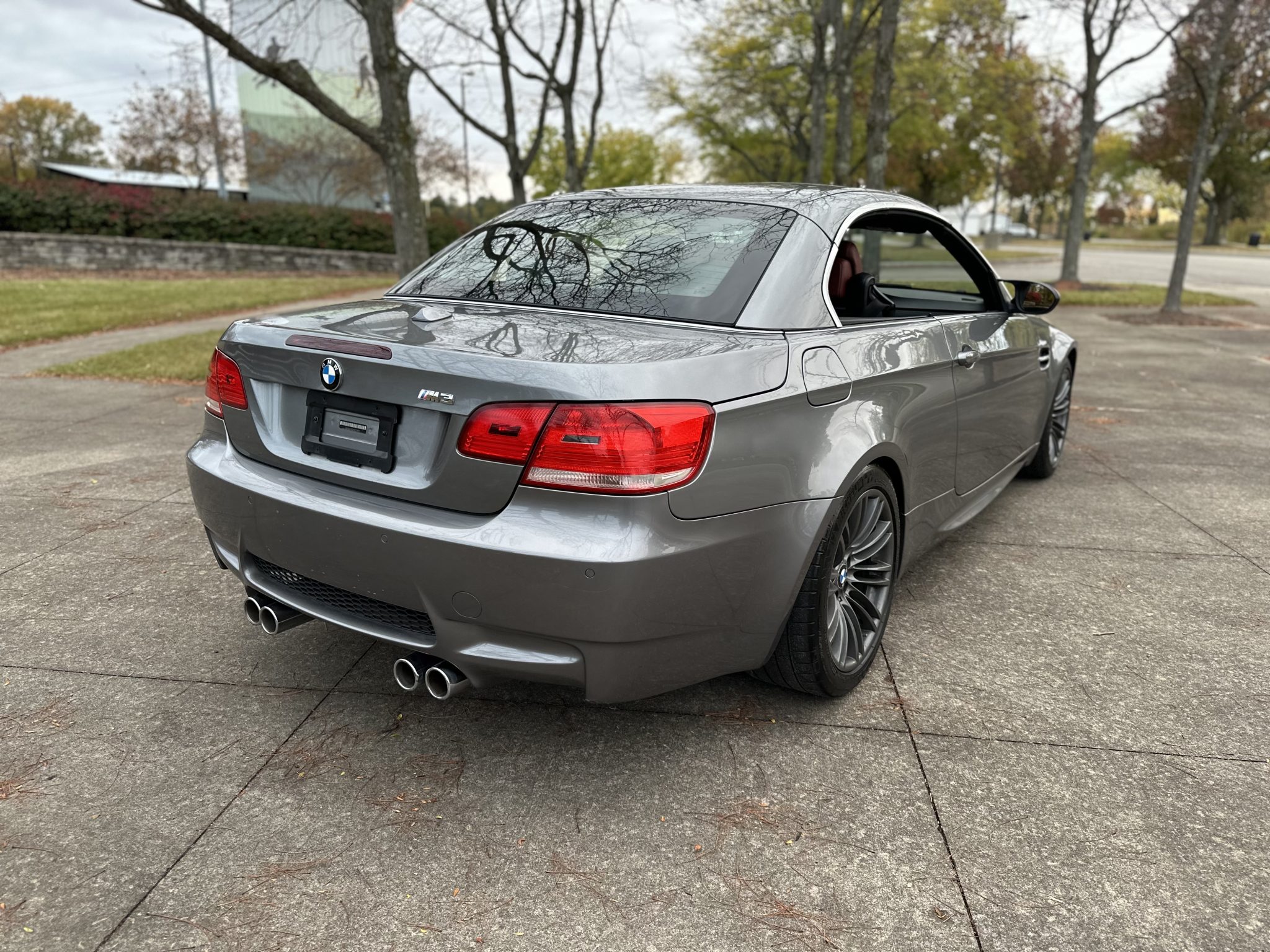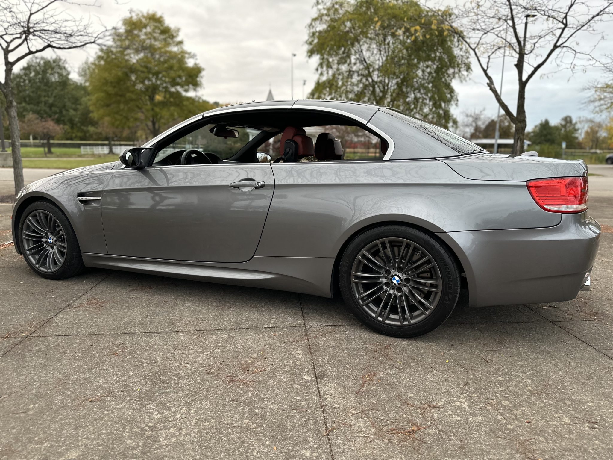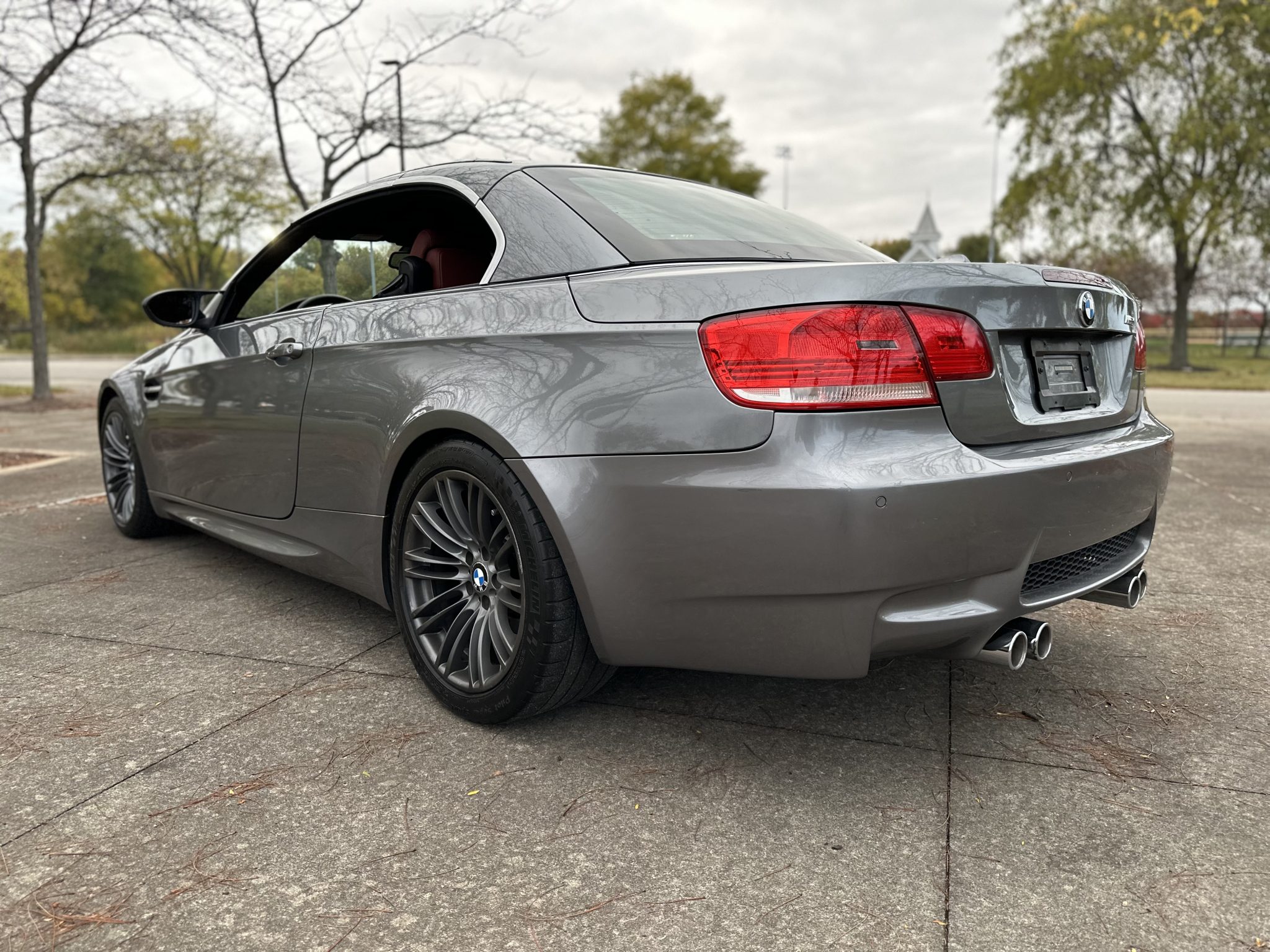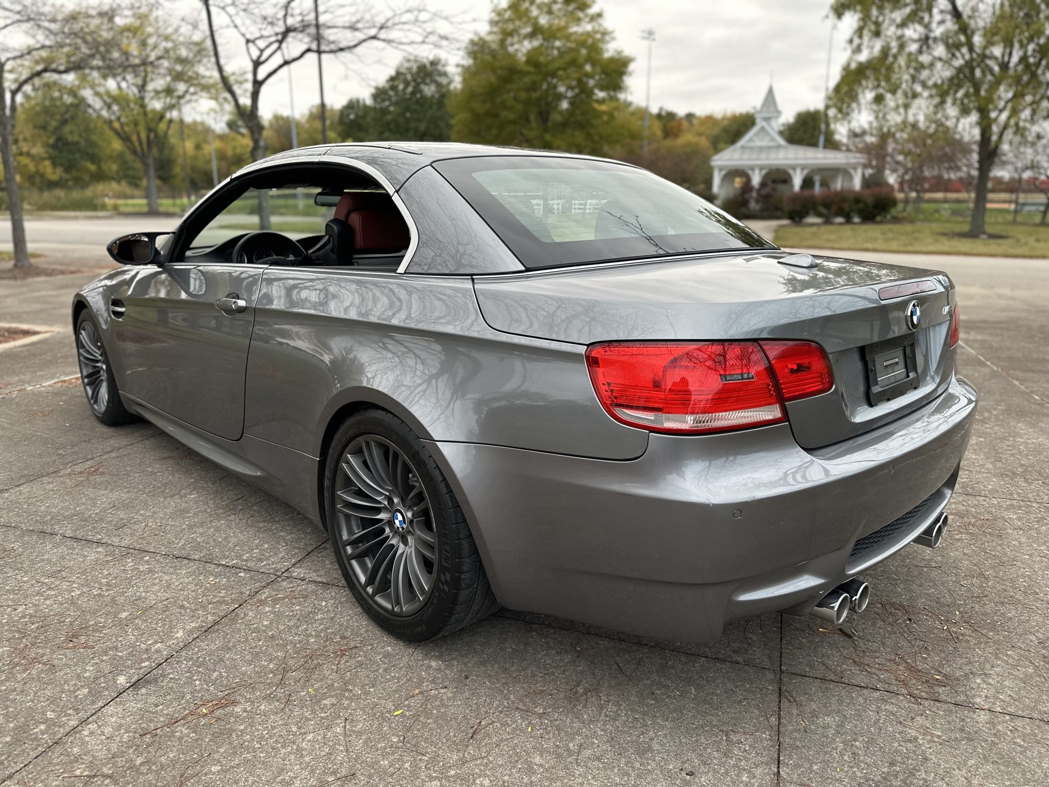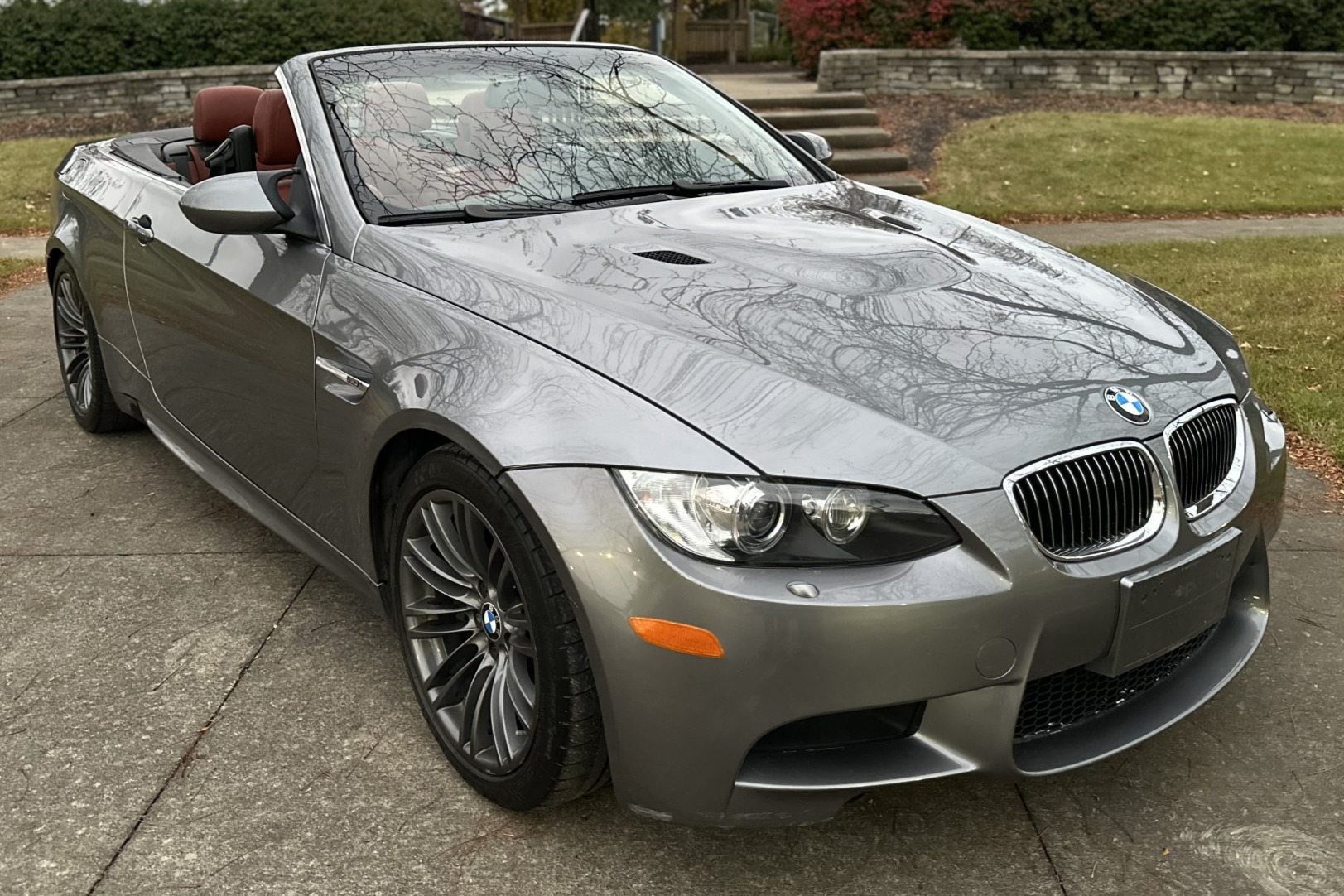 This 2009 BMW M3 convertible is powered by a 4.0-liter V8 paired with a seven-speed dual-clutch transmission and is finished in Space Gray Metallic over Fox Red Novillo leather upholstery. Equipment includes the Premium, Technology, and Cold Weather packages as well as 18″ Style 219 wheels, a limited-slip differential, adaptive xenon headlights, a retractable hardtop, rear parking sensors, heated power-adjustable front seats, iDrive with navigation, dual-zone automatic climate control, driver-seat position memory settings, and cruise control. The selling dealer acquired the car in 2023 and has since added approximately 100 of the 90k miles. This E93 M3 is now offered in Ohio at no reserve with a Carfax report and a clean District of Columbia title. The car is finished in Space Gray Metallic and features a retractable hardtop and adaptive xenon headlights with washers as well as rain-sensing wipers, rear parking sensors, bright trim, and quadruple exhaust outlets. Damage to the front and left-front portions of the body is listed in a June 2014 entry of the Carfax report. Paint chips are visible on the hood and bumper covers, and damage to the lower-right section of the front bumper cover is shown up close in the gallery below. The 18″ Style 219 wheels are mounted with staggered-width Michelin Pilot Super Sport tire. The car features Dynamic Stability Control (DSC), and braking is handled by four-wheel vented and cross-drilled discs measuring 14.2″ and 13.8″ front and rear, respectively. Curb damage is present on the wheels. The heated power-adjustable front sport seats are upholstered in Fox Red Novillo leather, and Carbon Structure Leather trim accents the dashboard and doors. Amenities include a CD stereo, iDrive with navigation, carpeted floor mats, dual-zone automatic climate control, driver-seat position memory settings, and cruise control. Blemishes are visible on the left door panel. The multi-function leather-wrapped steering wheel features paddle shifters along with tri-color stitching and frames an M-branded tachometer, a 200-mph speedometer, a central information display, and gauges for oil temperature and fuel level. The digital odometer indicates just under 90k miles, approximately 100 of which were added under current ownership. The 4.0-liter S65 V8 features double-VANOS variable valve timing and was factory rated at 414 horsepower and 295 lb-ft of torque. An oil change was performed in preparation for the sale. Power is sent to the rear wheels through a seven-speed M-DCT dual-clutch transmission and a Variable M Differential Lock. Additional photos of the underside are presented in the gallery. The Carfax report shows the aforementioned June 2014 damage and lists history in Virginia, California, Washington D.C., and Maryland.