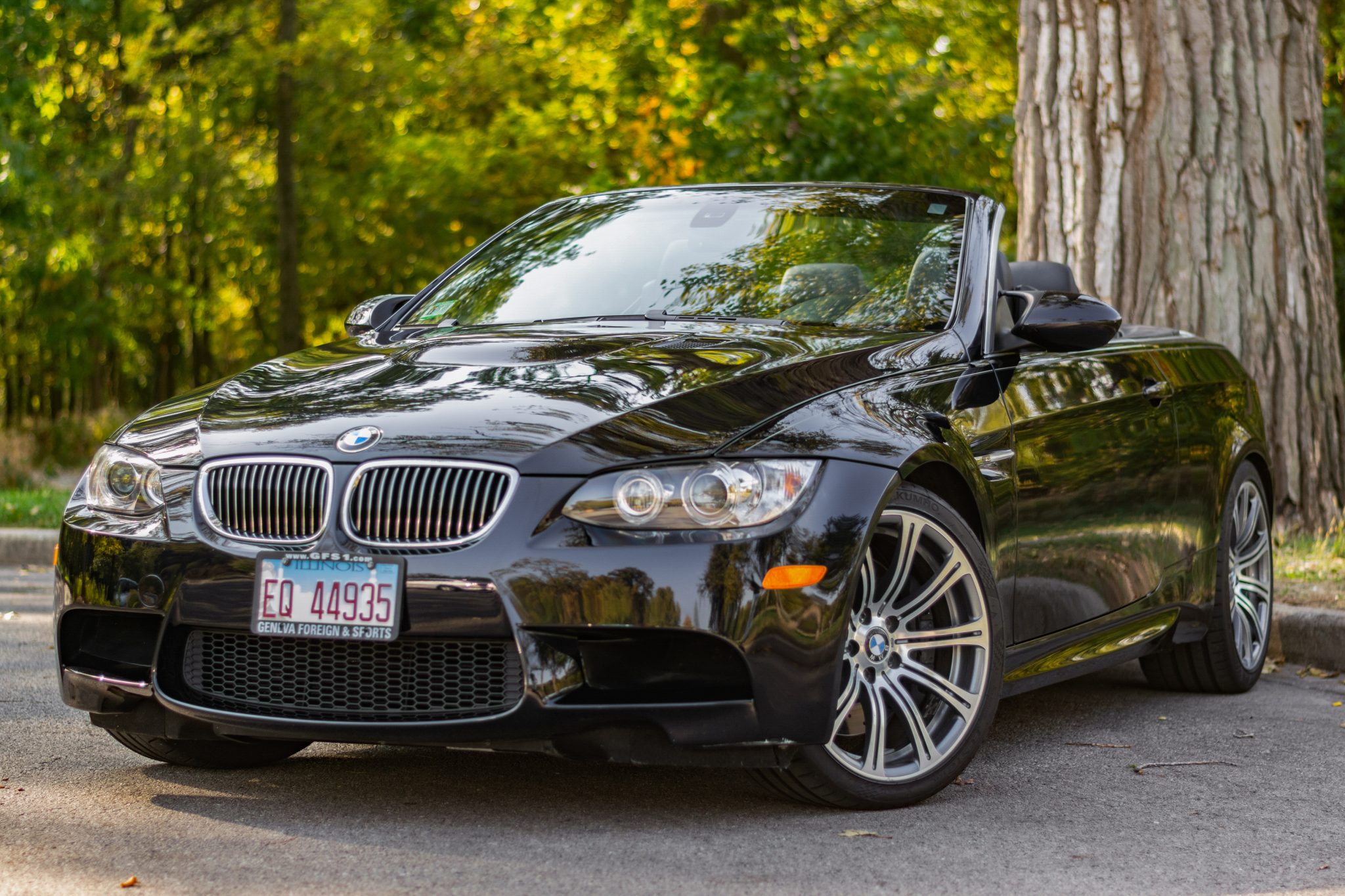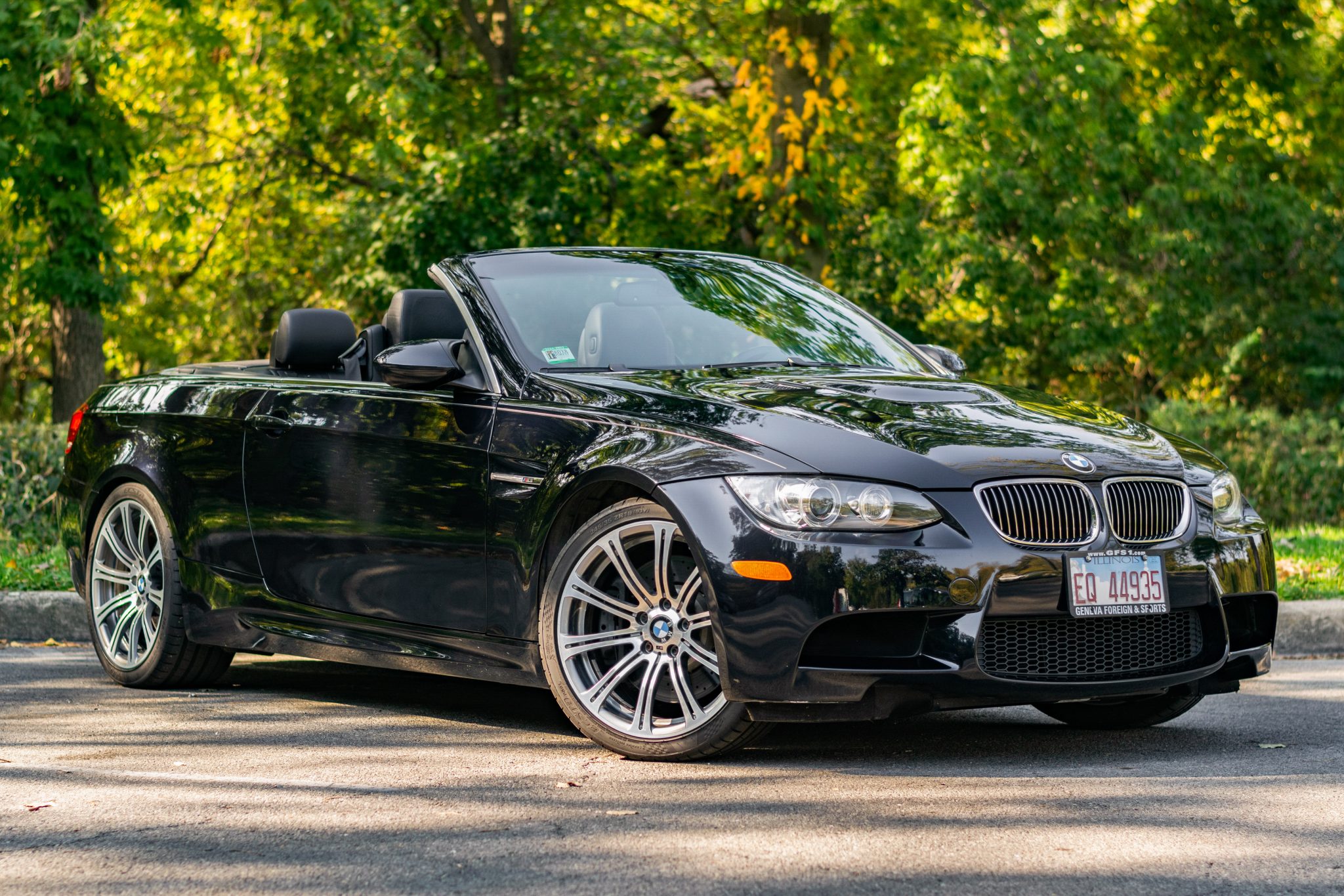This 2009 BMW M3 convertible remained under the care of its first owner for seven years and during that time 35k of the 40k miles indicated were added. The car is powered by a 4.0-liter V8 paired with a six-speed manual transmission and is finished in Jerez Black Metallic over black Novillo leather. Equipment includes 19″ forged Style 220 wheels, a limited-slip differential, xenon headlights, a retractable hardtop, power-adjustable front seats, a BMW Professional CD stereo, dual-zone automatic climate control, and cruise control. This E93 M3 was purchased in April 2024 by the seller from the second owner, and it is now offered with service invoices, and a clean Illinois title. The car is finished in Jerez Black Metallic (A73) and features a retractable hardtop and adaptive xenon headlights as well as rain-sensing wipers, and quadruple exhaust outlets. A grille cover was replaced in July 2024. The Carfax report lists accident damage in a November 2014 entry, and it notes damage in a September 2017 entry. Forged 19″ Style 220 wheels are mounted with Kumho Ecsta PS91 tires. The car features Dynamic Stability Control (DSC). Braking is handled by four-wheel vented and cross-drilled discs measuring 14.2″ and 13.8″ front and rear, respectively. The brake fluid was flushed in April 2024, and the front-right speed sensor was replaced in July 2024. The power-adjustable front sport seats are upholstered in black Novillo leather, and Carbon Structure Leather trim accents the dashboard and doors. Amenities include driver-seat position memory, a BMW Professional CD stereo, dual-zone automatic climate control, and cruise control. A note in the July 2024 service invoice states that the airbag light illuminates intermittently. The multi-function leather-wrapped steering wheel features tri-color stitching and frames an M-branded tachometer, a 200-mph speedometer, a central information display, and gauges for oil temperature and fuel level. The digital odometer indicates 40k miles, approximately 2k of which were added under current ownership. The 4.0-liter S65 V8 features double-VANOS variable valve timing and was factory rated at 414 horsepower and 295 lb-ft of torque. Power is sent to the rear wheels through a six-speed manual transmission and a Variable M Differential Lock. The thermostat, windshield washer pump, and the engine oil were replaced in April 2024. The April 2024 service invoice notes that the valve cover gaskets and the rear differential pinion are seeping. The Carfax report shows the aforementioned accidents and lists at least one open recall.