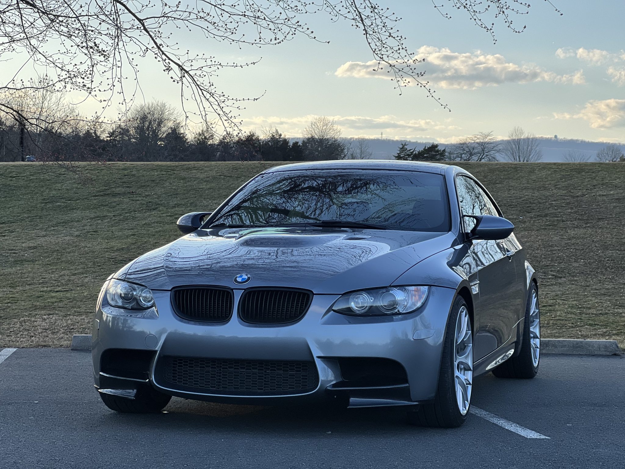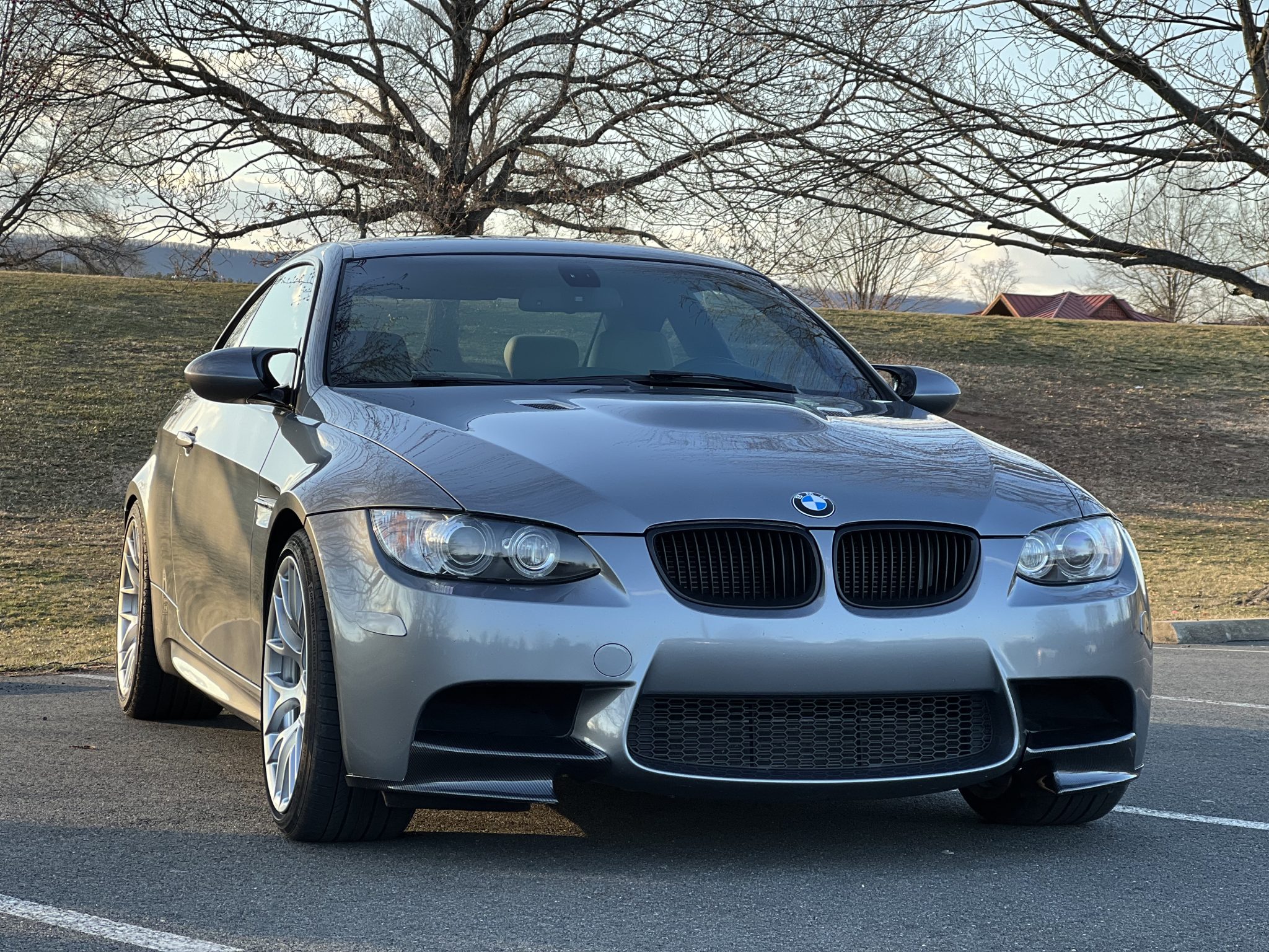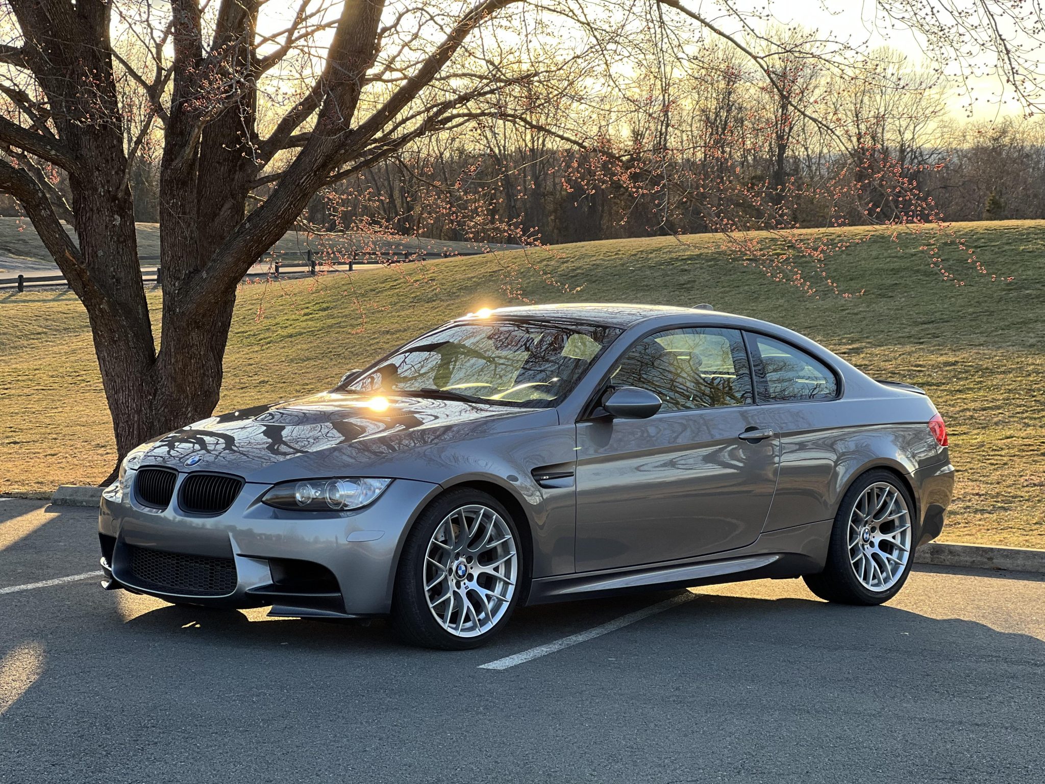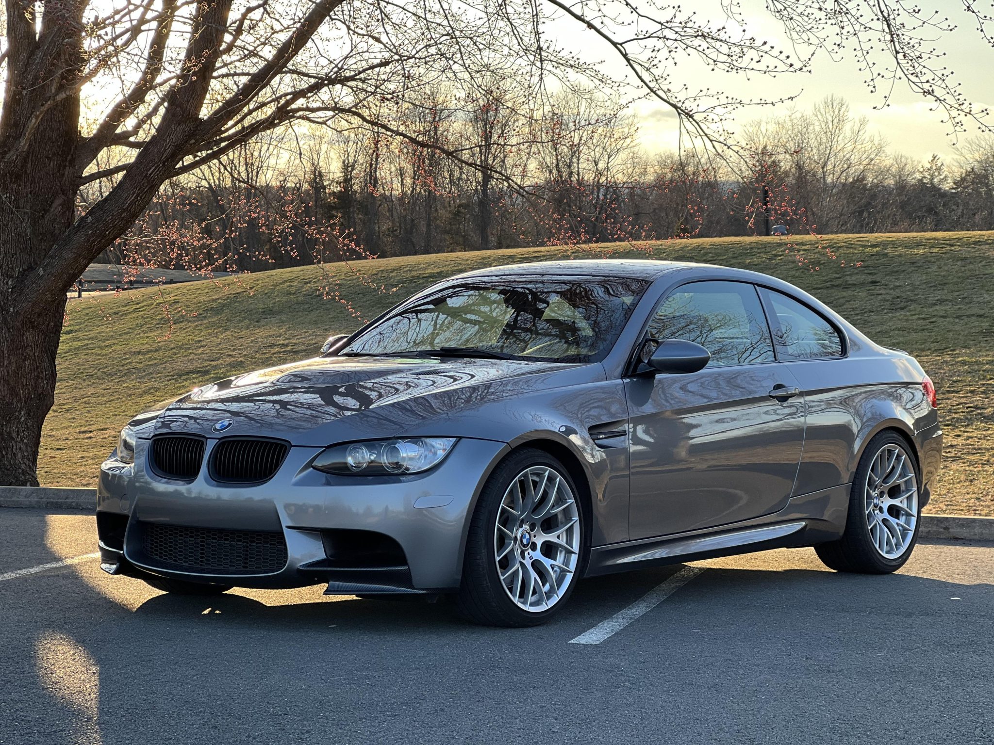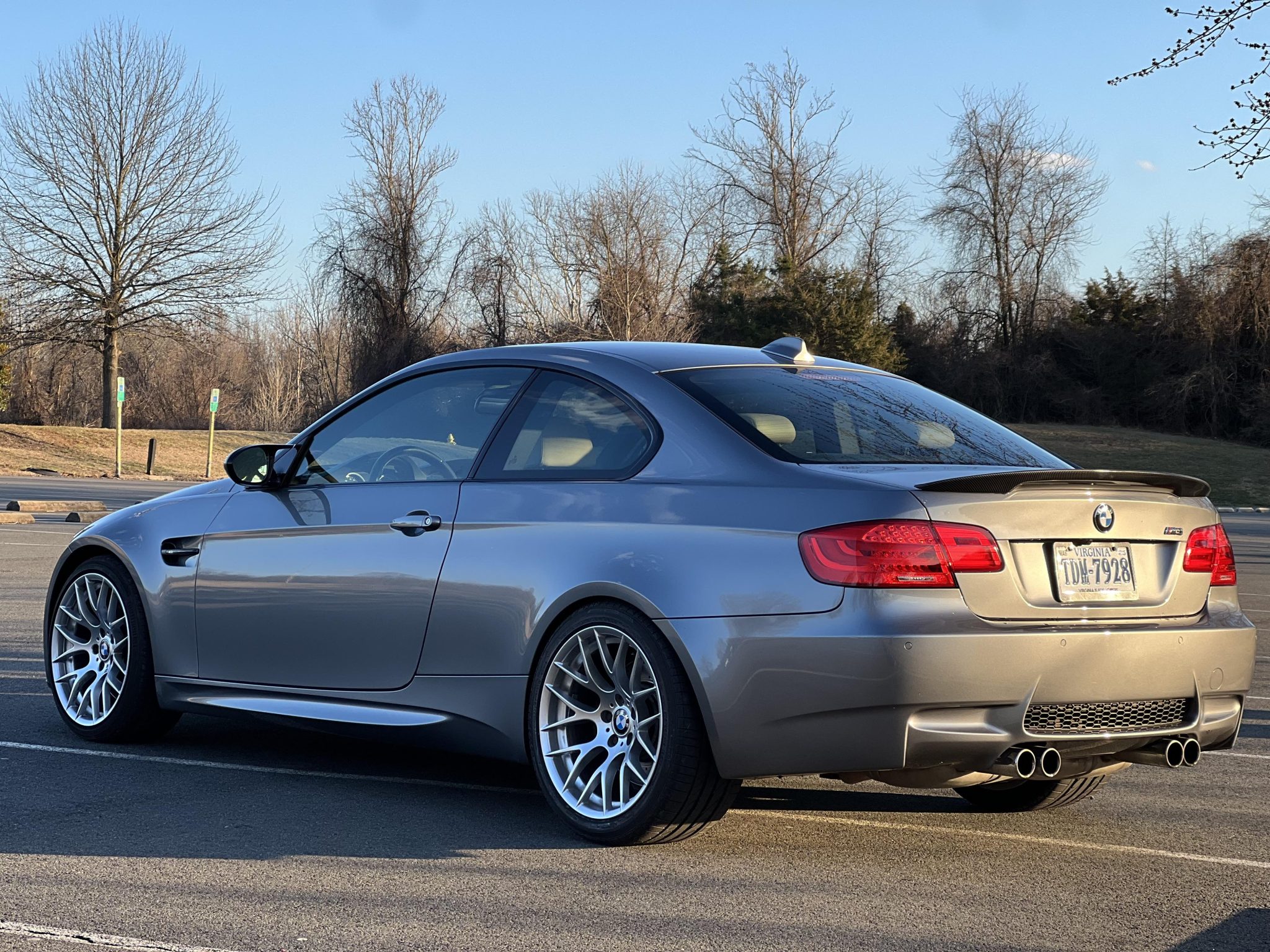 This 2011 BMW M3 coupe has 77k miles and is powered by a 4.0-liter V8 paired with a seven-speed dual-clutch transmission, and it is finished in Space Gray Metallic over Bamboo Beige Novillo leather. Equipment includes the Competition, Premium, Convenience, and Technology packages as well as a carbon-fiber driveshaft, a limited-slip differential, carbon-fiber front and rear spoilers, Apple CarPlay, and iDrive with navigation. The connecting rod bearings were replaced in April 2023, and the valve cover and timing cover gaskets were replaced in May 2023. This E92 M3 was purchased by the seller in February 2025, and it is now offered with the owner’s manual, service records, a clean Carfax report, and a clean Virginia title in the seller’s name. The car is finished in Space Gray Metallic (A52) and features Shadowline trim and carbon-fiber front and rear spoilers. Additional exterior details include adaptive xenon headlights, rain-sensing wipers, a glass sunroof, a trunk lid spoiler, rear Park Distance Control, and quadruple exhaust outlets. The 19″ Style 359 wheels are mounted with Bridgestone Potenza and Continental ContiSportContact tires. The car features Electronic Damping Control (EDC). Braking is handled by four-wheel vented and cross-drilled discs measuring 14.2″ and 13.8″ front and rear, respectively. The brake fluid, rear brake pads, and power steering fluid were replaced in February 2025. Bamboo Beige Novillo leather covers the power-adjustable front sport seats, and Brushed Aluminum Shadow trim accents the dashboard and doors. Amenities include Comfort Access keyless entry, a CD stereo, dual-zone automatic climate control, cruise control, iDrive with navigation, and Apple CarPlay. The multi-function leather-wrapped steering wheel features aftermarket paddle shifters, and frames an M-branded tachometer, a 200-mph speedometer, a central information display, and gauges for oil temperature and fuel level. The digital odometer indicates 77k miles. The 4.0-liter S65 V8 features double-VANOS variable valve timing and was factory-rated at 414 horsepower and 295 lb-ft of torque. The connecting rod bearings and oil pan gasket were replaced in April 2023, the valve cover and timing cover gaskets were replaced in May 2023, and an oil change was performed in February 2025. Power is sent to the rear wheels through a seven-speed M-DCT dual-clutch transmission and a Variable M Differential Lock. A carbon-fiber driveshaft has been installed. The differential fluid was flushed in April 2023, and the differential seal was replaced in May 2023. The Carfax report is free of accidents or other damage.