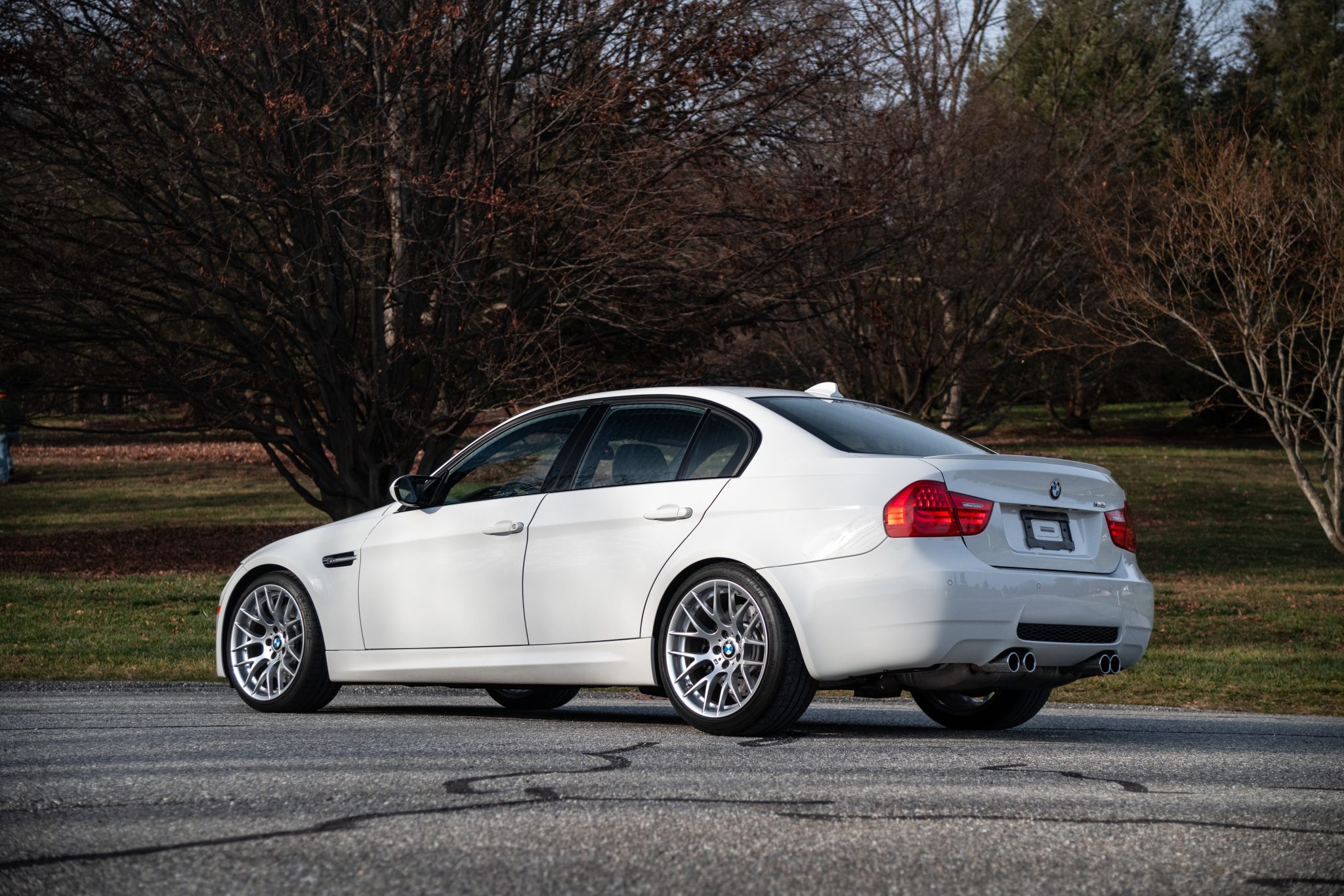 This 2011 BMW M3 sedan has just under 7k miles and was optioned from the factory with the Competition, Premium, and Technology packages. It is powered by a 4.0-liter V8 paired with a seven-speed dual-clutch transmission and is finished in Alpine White III over black Novillo leather upholstery. The car has 19″ Style 359 wheels, a limited-slip differential, adaptive xenon headlights, rear parking sensors, heated power-adjustable front seats, iDrive with navigation, dual-zone automatic climate control, a sunroof, and cruise control. The current owner acquired the car in 2022, and work in November 2023 consisted of servicing the transmission in addition to changing the oil and replacing the differential fluid. This E90 M3 is now offered by the seller on behalf of the owner with partial service records, a clean Carfax report, and a clean Pennsylvania title in the current owner’s name. The car is finished in Alpine White III and has Shadowline trim and adaptive xenon headlights as well as rain-sensing wipers, a trunk lid spoiler, rear parking sensors, a sunroof, and quadruple exhaust outlets. Paint meter readings are provided in the gallery. The 19″ Style 359 wheels are mounted with 245/35 front and 265/35 rear Michelin Pilot Sport tires showing 2010 date codes. Competition Package equipment includes a lowered ride height compared to the standard M3 as well as retuned Electronic Damping Control (EDC) and Dynamic Stability Control (DSC). Braking is handled by four-wheel vented and cross-drilled discs measuring 14.2″ and 13.8″ front and rear, respectively. The heated power-adjustable front sport seats are upholstered in black Novillo leather, and Carbon Structure Leather trim accents the dashboard and doors. Rubberized floor mats line the footwells, and additional appointments include iDrive with navigation, Comfort Access keyless entry, a CD stereo, dual-zone automatic climate control, and cruise control. The multi-function leather-wrapped steering wheel features paddle shifters along with tri-color stitching and frames an M-branded tachometer, a 200-mph speedometer, a central information display, and gauges for oil temperature and fuel level. The digital odometer indicates just under 7k miles, approximately 700 of which were added under current ownership. The 4.0-liter S65 V8 features double-VANOS variable valve timing and was factory rated at 414 horsepower and 295 lb-ft of torque. An oil change was performed in November 2023. Power is sent to the rear wheels through a seven-speed M-DCT dual-clutch transmission and a Variable M Differential Lock. The differential fluid was replaced in November 2023, at which time the transmission filter, fluid, and oil pan were also replaced. Additional photos of the underside are presented in the gallery. The Carfax report shows no accidents or other damage and lists history in Florida, Georgia, Tennessee, and Pennsylvania.