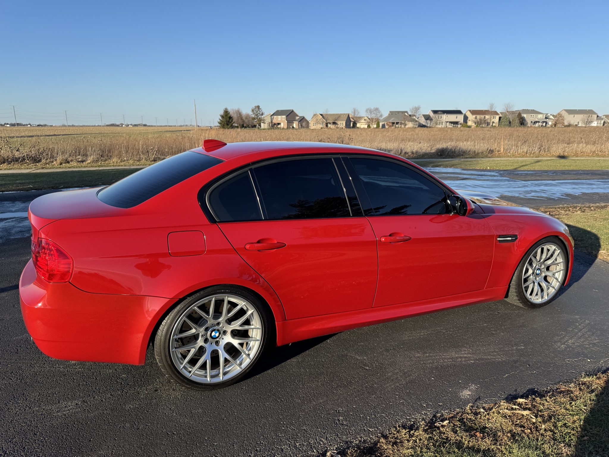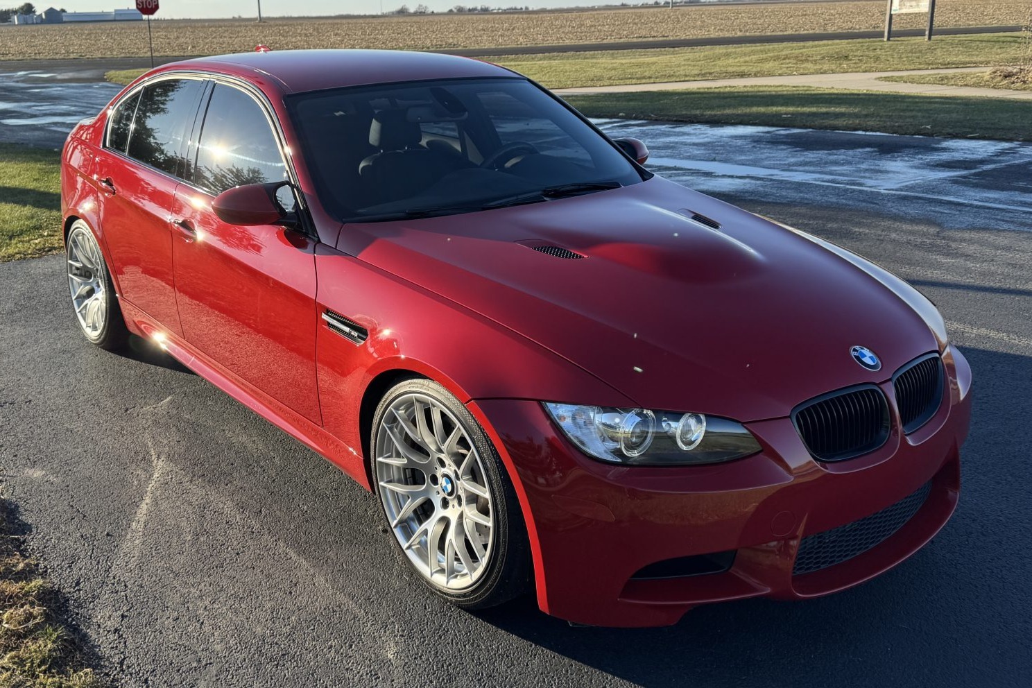 This 2011 BMW M3 sedan was initially delivered to Irvine BMW of Irvine, California, and was optioned with the Competition, Convenience, and Premium 2 packages. Indicating 25k miles, the car is powered by a 4.0-liter V8 paired with a seven-speed dual-clutch transmission and is finished in Melbourne Red Metallic over Fox Red and Black Novillo leather upholstery. Equipment includes 19″ Style 359 wheels, H&R lowering springs, a limited-slip differential, xenon headlights, rear Park Distance Control, navigation, dual-zone automatic climate control, and cruise control. Purchased by the current owner in 2017, this E90 M3 is offered by the seller on behalf of the current owner with a window sticker, manufacturer’s literature, service records, spare parts, and a clean Illinois title in the owner’s name. The car is finished in Melbourne Red Metallic (A75) and features Shadowline trim and adaptive xenon headlights as well as rain-sensing wipers, power-folding side mirrors, a trunk lid spoiler, rear Park Distance Control, and quadruple exhaust outlets. A carbon-fiber decklid spoiler will accompany the sale, and there are scrapes on the underside of the front bumper cover. Close-up photographs of the exterior finish and trim are shown in the gallery below. Silver 19″ Style 359 wheels are mounted with Continental ContiSportContact 3 tires that have 2010 date codes. Competition Package equipment includes a lowered ride height compared to the standard M3 as well as retuned Electronic Damping Control (EDC) and Dynamic Stability Control (DSC). H&R lowering springs are fitted, and braking is handled by four-wheel vented and cross-drilled discs measuring 14.2″ and 13.8″ front and rear, respectively. The brake fluid was changed in 2024, and the removed factory springs will accompany the sale. The power-adjustable front sport seats and fold-down rear seats are upholstered in Fox Red and Black Novillo leather, and Carbon Structure Leather trim accents the dashboard and doors. Amenities include iDrive with navigation, Comfort Access keyless entry, BMW Assist, a CD stereo, dual-zone automatic climate control, and cruise control. Creasing on the driver’s seat and a faded air vent dial are noted by the seller. The multi-function leather-wrapped steering wheel features paddle shifters along with tri-color stitching and frames an M-branded tachometer, a 200-mph speedometer, a central information display, and gauges for oil temperature and fuel level. The digital odometer indicates 25k miles, approximately 2,500 of which were added under current ownership. The 4.0-liter S65 V8 features double-VANOS variable valve timing and was factory-rated at 414 horsepower and 295 lb-ft of torque. The oil was changed and an evaporation line was replaced in 2024. Power is sent to the rear wheels through a seven-speed M-DCT dual-clutch transmission and a Variable M Differential Lock. The seller notes wear on the lift points and corrosion on the exhaust. The window sticker lists initial delivery to Irvine BMW of Irvine, California, as well as factory colors, options, and a total price of $72,100. The Carfax report is free of accidents or other reported damage. The Illinois title is listed as a “corrected title.”