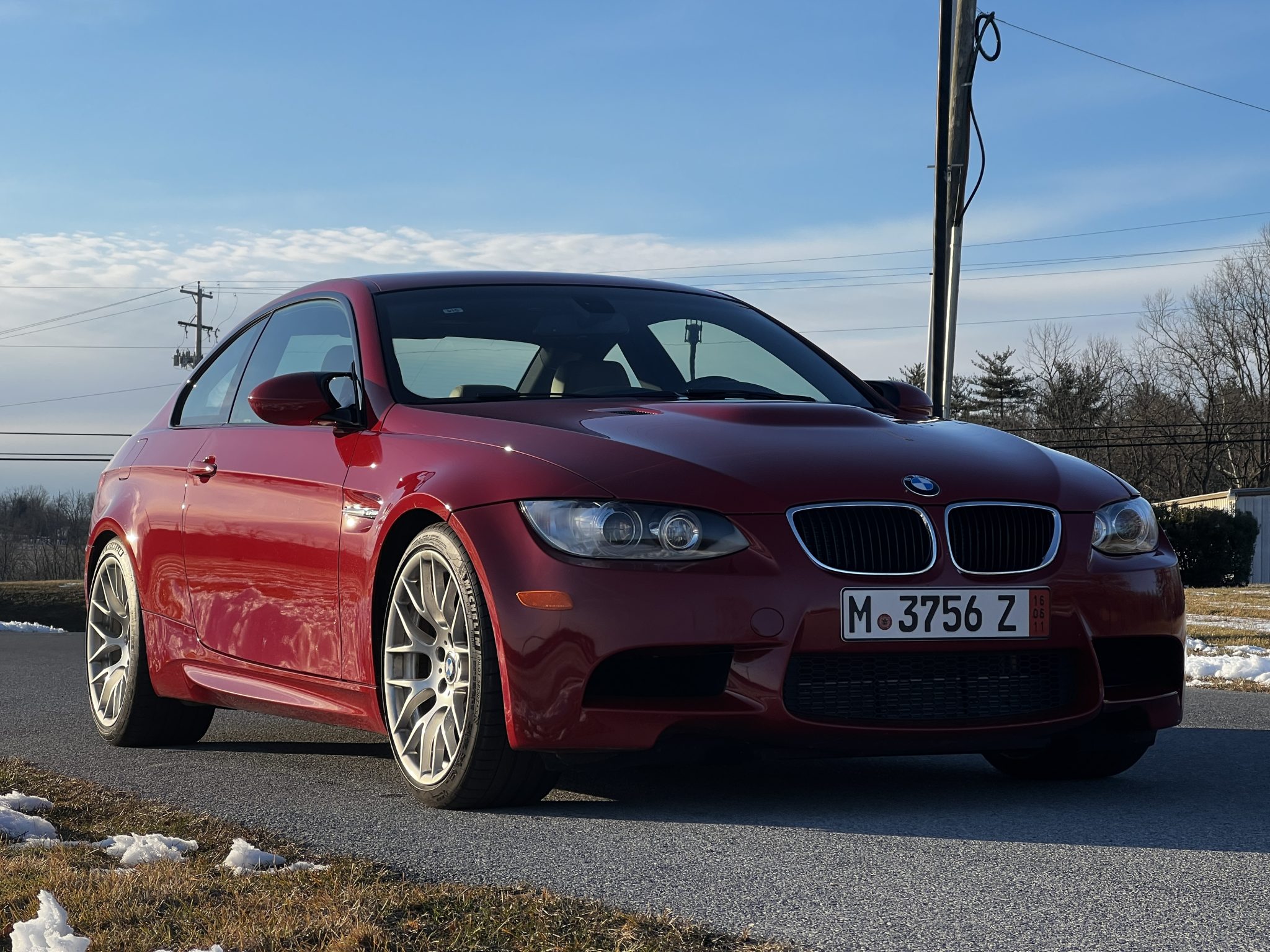 This 2011 BMW M3 coupe remained with its original owner in New Mexico until 2023, and it now has 30k miles. The car is finished in Melbourne Red Metallic over Bamboo Beige Novillo leather and is powered by a 4.0-liter V8 paired with a six-speed manual transmission. Equipment includes the Competition, Convenience, and Premium 2 packages as well as 19″ Style 359 wheels, a limited-slip differential, xenon headlights, rear Park Distance Control, dual-zone automatic climate control, and heated power-adjustable front sport seats. Recently purchased by the selling dealer, this E92 M3 is now offered in Pennsylvania with a window sticker, the owner’s manual, service records, a clean Carfax report, and a clean New Mexico title. The car is finished in Melbourne Red Metallic and features Shadowline trim and adaptive xenon headlights as well as rain-sensing wipers, rear Park Distance Control, a sunroof, a trunk lid spoiler, and quadruple exhaust outlets. The 19″ Style 359 wheels are mounted with Michelin tires. Competition Package equipment includes a lowered ride height compared to the standard M3 as well as retuned Electronic Damping Control (EDC) and Dynamic Stability Control (DSC). Braking is handled by four-wheel vented and cross-drilled discs measuring 14.2″ and 13.8″ front and rear, respectively. The heated power-adjustable front sport seats are upholstered in Bamboo Beige Novillo leather, and Anthracite Sycamore Wood trim accents the dashboard and doors. Amenities include a CD stereo, Comfort Access, dual-zone automatic climate control, cruise control, and iDrive with navigation. The left airbag was replaced in 2017 and the blower motor wiring was repaired in 2019. The multi-function leather-wrapped steering wheel features tri-color stitching and frames an M-branded tachometer, a 200-mph speedometer, a central information display, and gauges for oil temperature and fuel level. The digital odometer indicates 30k miles. The 4.0-liter S65 V8 features double-VANOS variable valve timing and revs to 8,400 rpm. It was factory rated at 414 horsepower and 295 lb-ft of torque. Power is sent to the rear wheels through a six-speed manual transmission and a Variable M Differential Lock. The window sticker notes initial delivery to Sandia BMW in Albuquerque, New Mexico, and lists factory equipment, colors, options, and a total suggested retail price of $65,950. Manufacturer’s literature and service records are also included in the sale. The Carfax report shows no accidents or other damage and lists history with one previous owner in New Mexico.