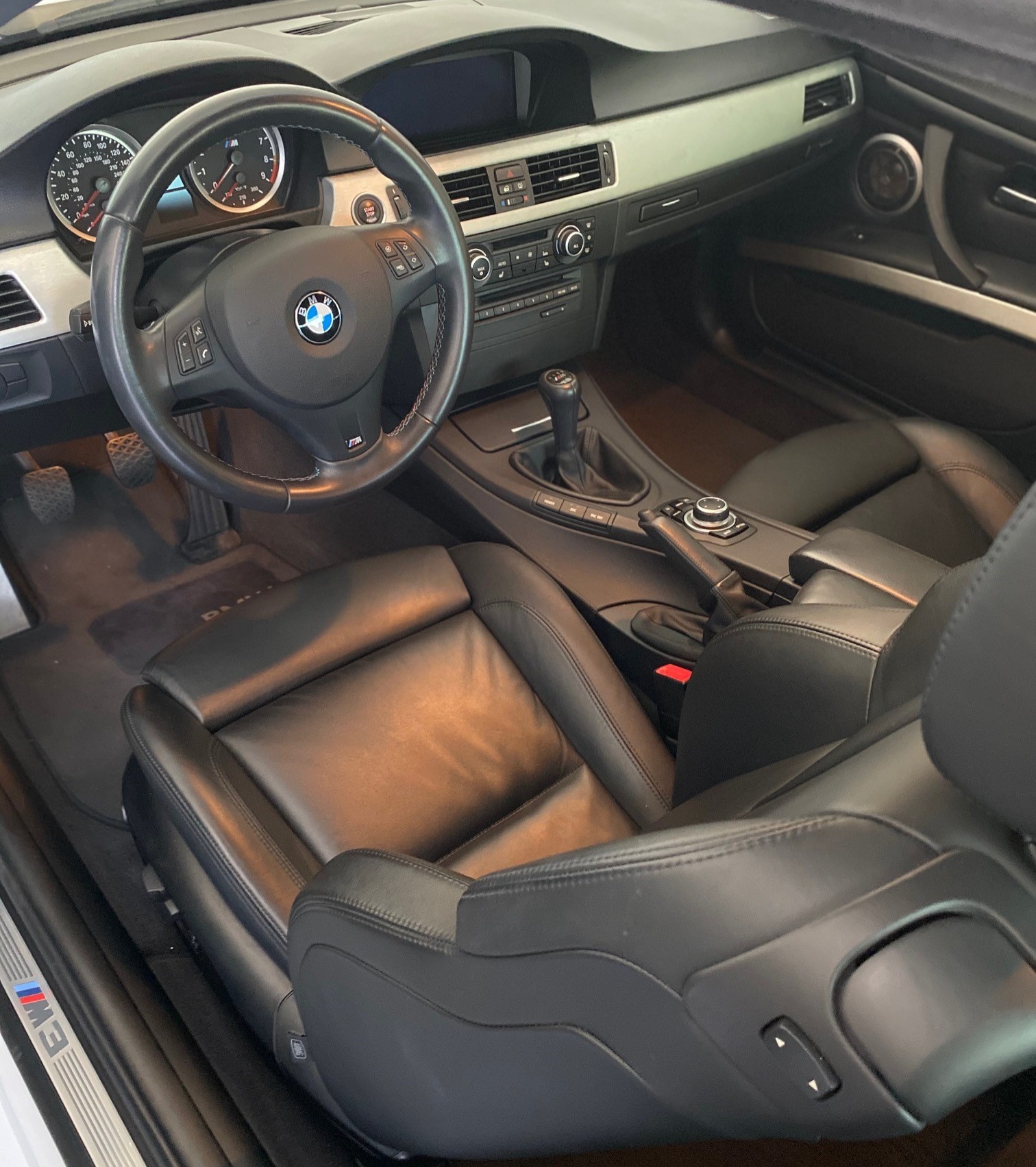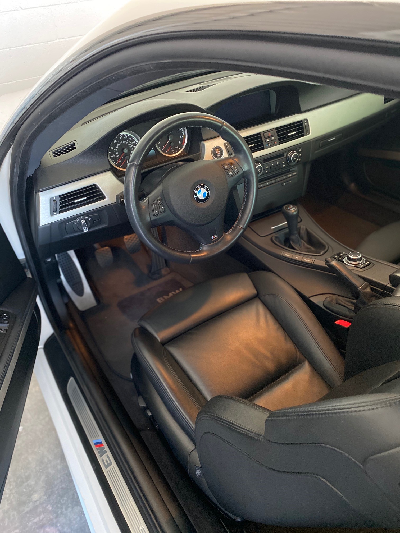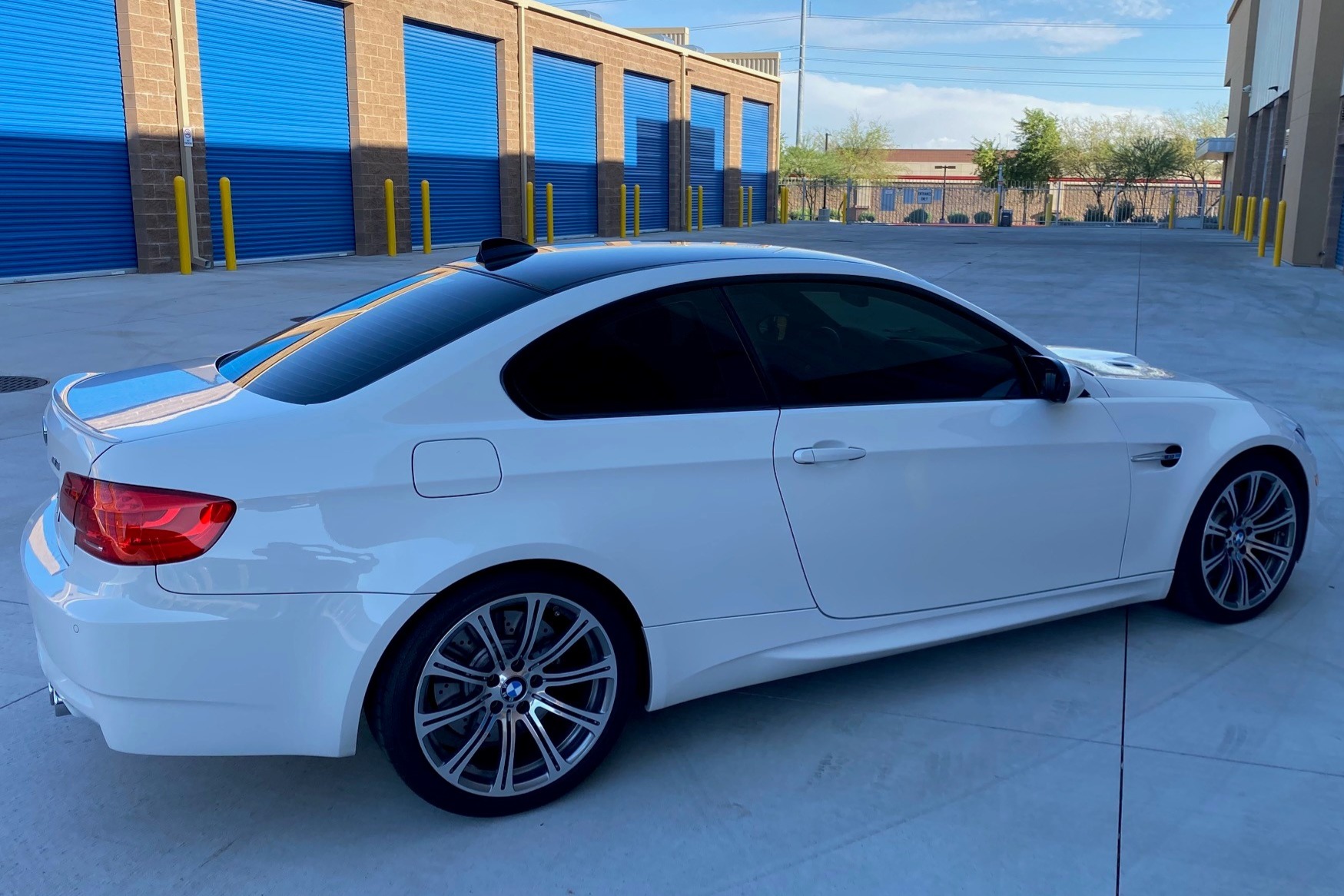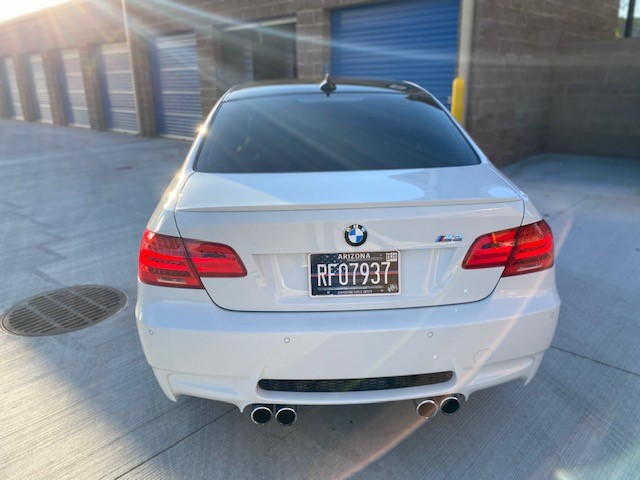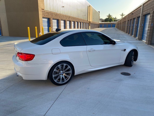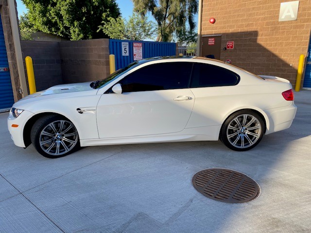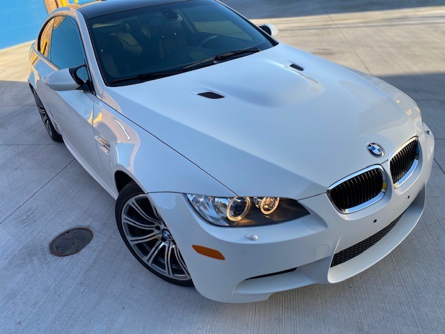 This 2011 BMW M3 coupe is finished in Alpine White over black extended Novillo leather, and it is powered by a 4.0-liter S65 V8 paired with a six-speed manual transmission and a limited-slip rear differential. Equipment includes 19” Style 220 wheels, adaptive xenon headlights, Park Distance Control, heated front seats, navigation, and Comfort Access. The car was first registered in New Jersey and was acquired six years ago by the seller, who added over 6k of the 16k miles it now has. Service in May 2020 included a brake fluid flush and replacement of the battery and cabin air filter. This E92 M3 is now offered with service records, factory literature, a BMW-branded sun shade, a clean Carfax report, and a clean Arizona title in the seller’s name. The car is finished in Alpine White III (300) with high-gloss Shadowline window trim. Equipment includes adaptive xenon headlights, Park Distance Control, tinted windows, and a carbon-fiber roof panel. The provided Carfax report shows no history of accidents or other damage. Factory 19” Style 220 wheels are mounted with Continental ContiSportContact tires measuring 245/35 up front and 265/35 out back. Cross-drilled and vented disc brakes are equipped all around, and the brake fluid was flushed in May 2020. The interior features black Novillo leather covering the seating surfaces and door panels, as well as Brushed Aluminum Shadow trim accenting the dashboard and doors. Amenities include heated and power-adjustable front seats, iDrive with navigation, cruise control, Comfort Access, and dual-zone climate control. The seller notes M3-logo puddle lights were added to the doors. Instrumentation includes a 200-mph speedometer and a 9k-rpm tachometer, along with gauges for oil temperature and fuel level. The digital odometer shows 16k miles, approximately 6,500 of which were added by the seller over the past six years. The 4.0-liter S65 V8 was rated at 414 horsepower and 295 lb-ft of torque when new, which is sent to rear wheels through a six-speed manual gearbox and a Variable M Differential lock. A May 2020 service by BMW North Scottsdale, Arizona included replacement of the battery and the cabin air filter. The June 2020 Carfax report lists no accidents and shows registration history in New Jersey, Florida, and Arizona through its most recent entry in March 2019.