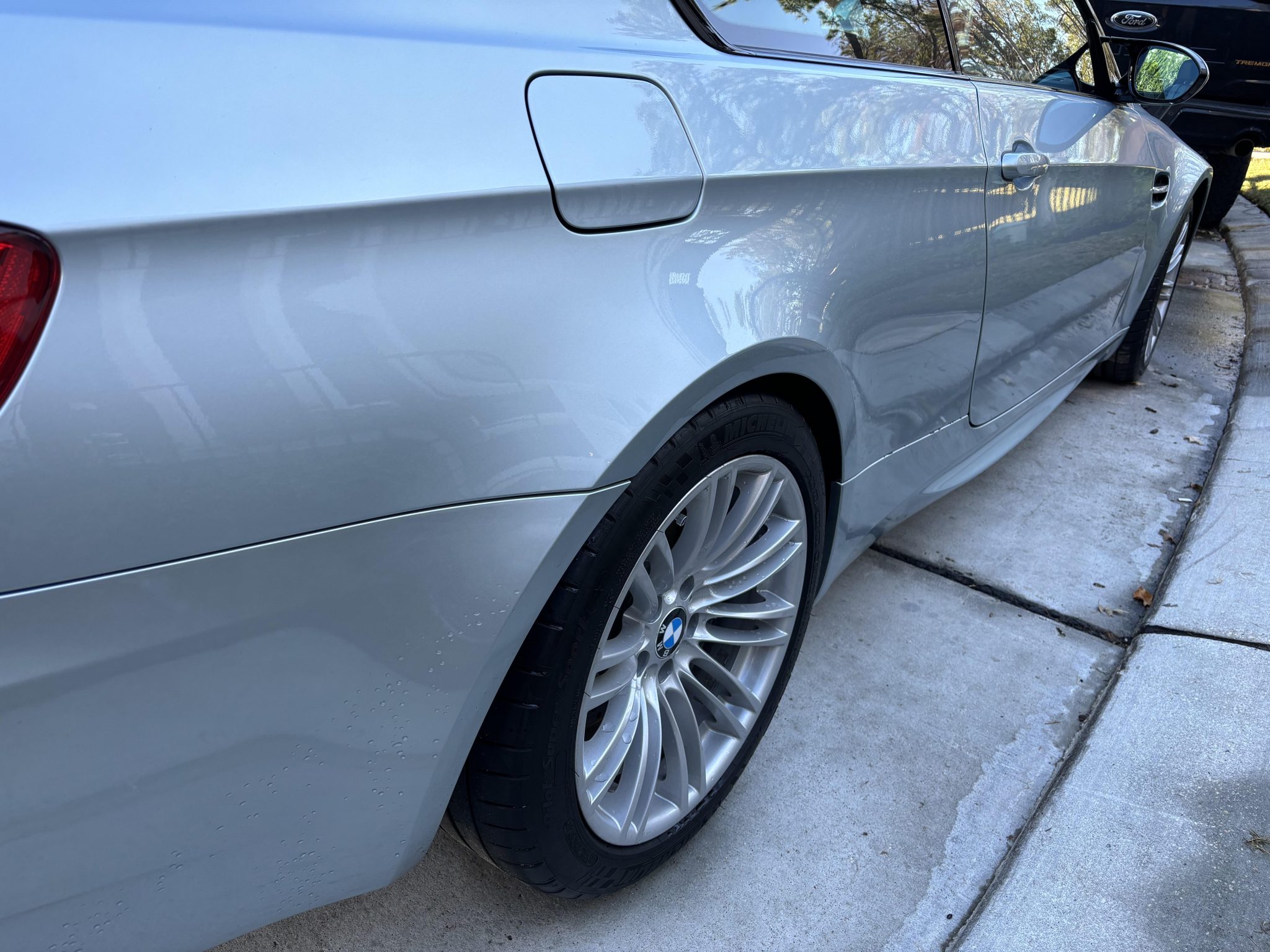 This 2011 BMW M3 coupe spent time in North Carolina, Maryland, and Florida before the seller’s 2023 purchase, and it now has 33k miles. The car is finished in Silverstone II Metallic over black Novillo leather and is powered by a 4.0-liter S65 V8 paired with a six-speed manual transmission. Equipment includes the Technology Package, 18″ Style 219 wheels, a limited-slip differential, xenon headlights, a sunroof, heated front sport seats, Electronic Damping Control, and iDrive with navigation. This E92 M3 is now offered with partial service records, a clean Carfax report, and a clean Texas title in the seller’s name. The car is finished in Silverstone II Metallic and features Shadowline trim and adaptive xenon headlights as well as rain-sensing wipers, a glass sunroof, a trunk lid spoiler, and quadruple exhaust outlets. The seller notes stone chips on the nose and scratches on the underside of the front bumper cover. Silver-finished 18″ Style 219 wheels have curb marks and are mounted with 245/40 front and 265/40 rear Michelin Pilot Super Sport tires that have date codes from 2023 and 2018, respectively. The Technology Package specified Electronic Damping Control and M Drive. The car also features Dynamic Stability Control (DSC) and four-wheel vented and cross-drilled disc brakes measuring 14.2″ and 13.8″ front and rear, respectively. A brake fluid flush was performed in May 2023. The heated power-adjustable front sport seats are upholstered in black Novillo leather, and Carbon Structure Leather trim accents the dashboard and doors. Amenities include iDrive with navigation as well as Comfort Access keyless entry, a CD stereo, dual-zone automatic climate control, and cruise control. The left door panel has worn and peeling trim and the start/stop button surround has peeling finish. The multi-function leather-wrapped steering wheel features tri-color stitching and frames an M-branded tachometer, a 200-mph speedometer, a central information display, and gauges for oil temperature and fuel level. The digital odometer indicates 33k miles, approximately 1k of which were added under current ownership. The 4.0-liter S65 V8 features double-VANOS variable valve timing and was factory rated at 414 horsepower and 295 lb-ft of torque. The battery was replaced in May 2023. Power is sent to the rear wheels through a six-speed manual transmission and a Variable M Differential Lock. The differential fluid was changed in May 2023. The Carfax report is free of accidents or other reported damage.