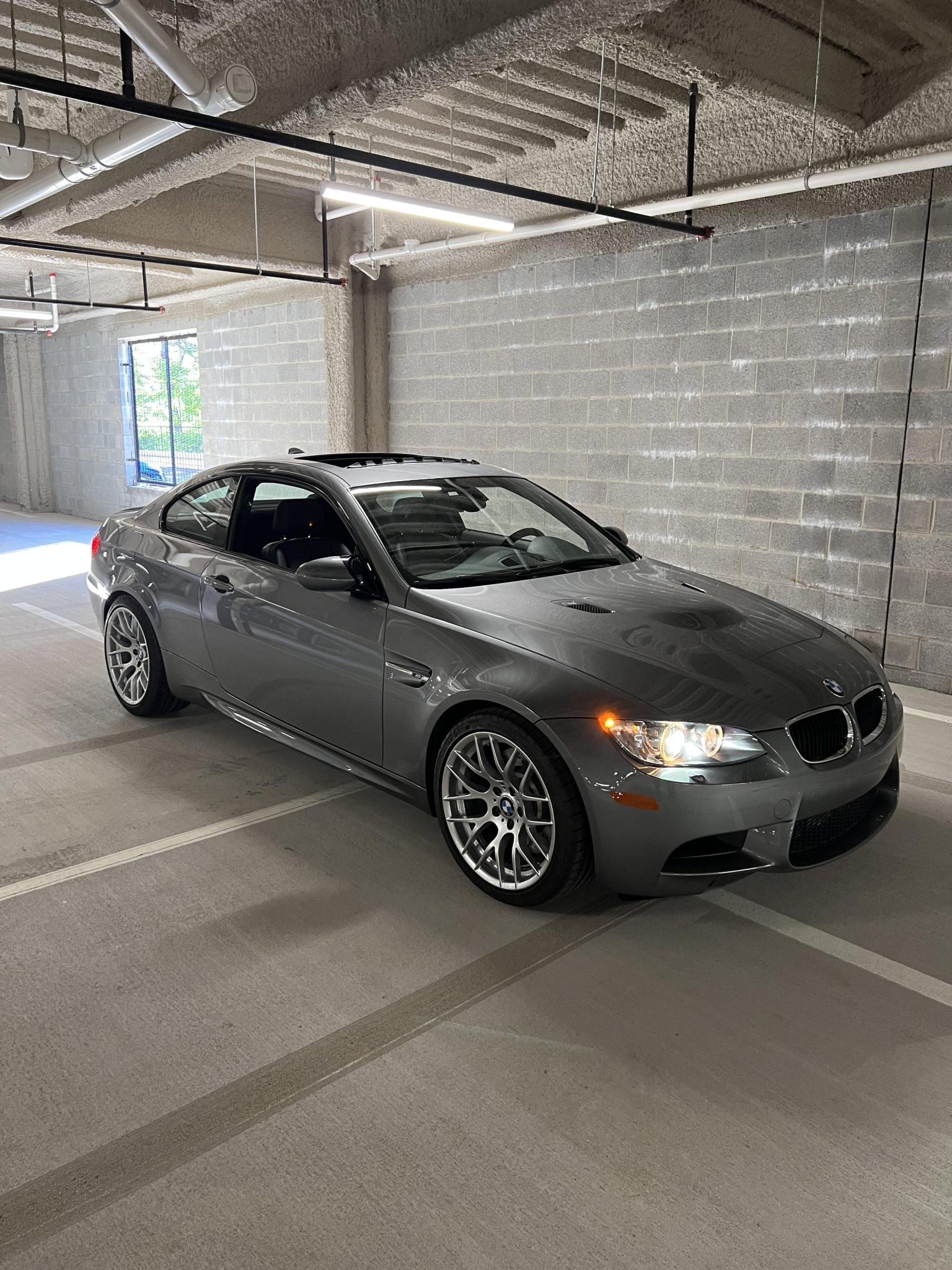 This 2011 BMW M3 coupe has 2,300 miles following registration on the East Coast since new, and it is powered by a 4.0-liter V8 paired with a seven-speed dual-clutch transmission. Finished in Space Grey Metallic over black Novillo leather, it is equipped with the Cold Weather and Premium packages as well as iDrive with navigation, a sunroof, 19″ Style 359 wheels, an M Performance steering wheel, a limited-slip differential, adaptive xenon headlights, rear parking sensors, heated front sport seats, and dual-zone automatic climate control. Purchased by the seller in August 2023, this E92 M3 is now offered with the removed factory wheels, a clean Carfax report, and a clean Pennsylvania title in the seller’s name. The car is finished in Space Grey Metallic and features Shadowline trim and adaptive xenon headlights as well as rain-sensing wipers, a glass sunroof, a trunk lid spoiler, rear parking sensors, and quadruple exhaust outlets. The 19″ Style 359 wheels are mounted with 15mm spacers as well as Michelin Pilot Super Sport tires measuring 255/35 up front and 275/35 out back. The car features Dynamic Stability Control (DSC). Braking is handled by four-wheel vented and cross-drilled discs measuring 14.2″ and 13.8″ front and rear, respectively. The removed factory set of 19″ Style 220 wheels with tires is included in the sale. The heated power-adjustable front sport seats are upholstered in black Novillo leather, and Anthracite Sycamore Wood trim accents the dashboard and doors. Amenities include Comfort Access keyless entry, a CD stereo, dual-zone automatic climate control, cruise control, and iDrive with navigation. The flat-bottom microsuede-wrapped M Performance steering wheel features paddle shifters along with a blue centering stripe and frames an M-branded tachometer, a 200-mph speedometer, a central information display, and gauges for oil temperature and fuel level. The digital odometer indicates 2,300 miles, fewer than 10 of which were added under current ownership. The 4.0-liter S65 V8 features double-VANOS variable valve timing and was factory rated at 414 horsepower and 295 lb-ft of torque. Power is sent to the rear wheels through a seven-speed M-DCT dual-clutch transmission and a Variable M Differential Lock. The removed factory set of 19″ Style 220 wheels with tires, as well as manufacturer’s literature and a set of BMW floor mats are included in the sale. The Carfax report is free of accidents or other reported damage.