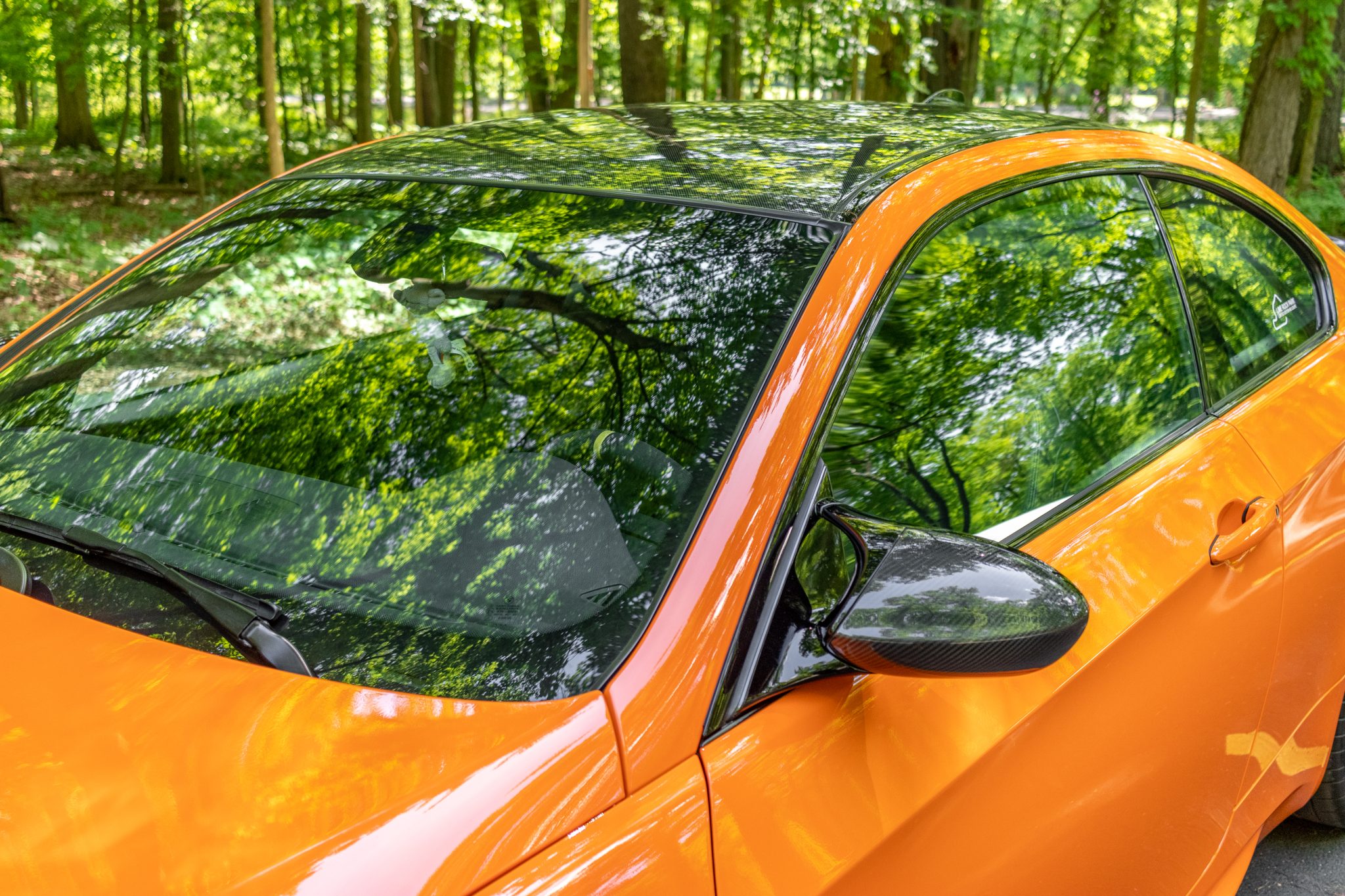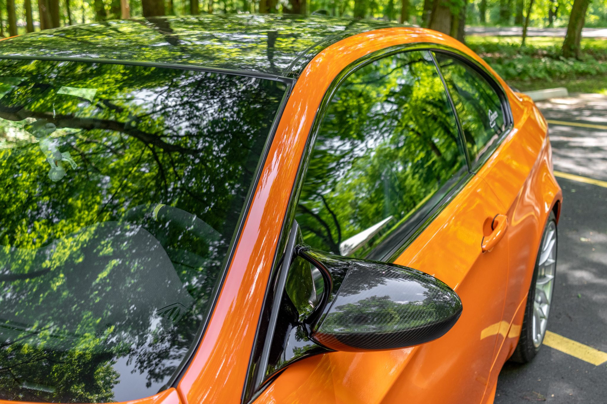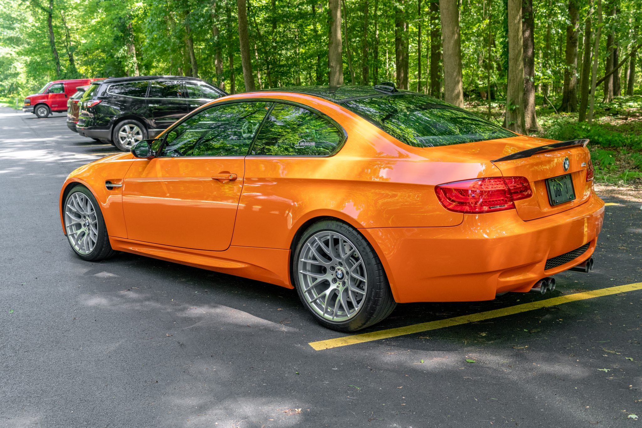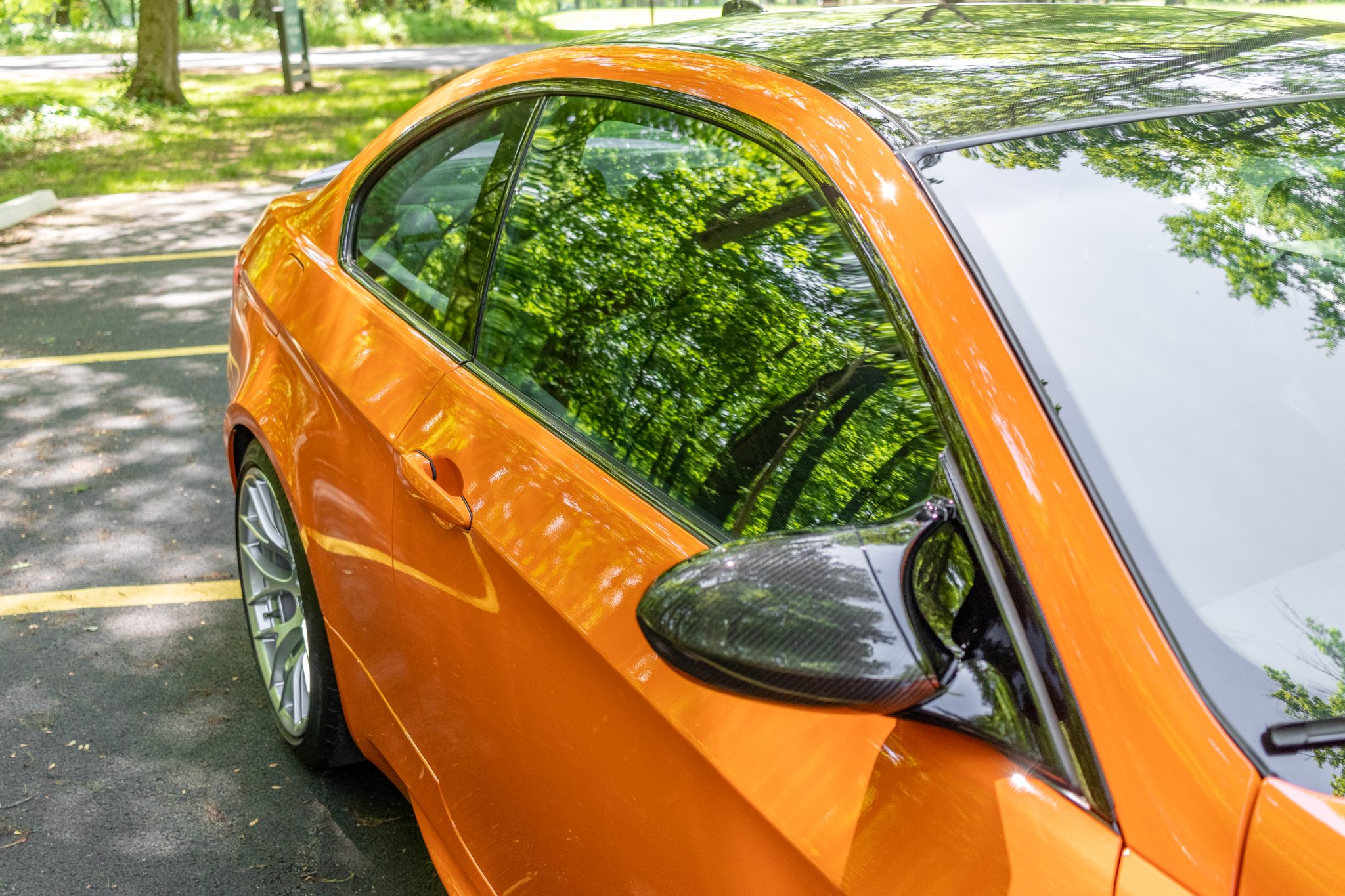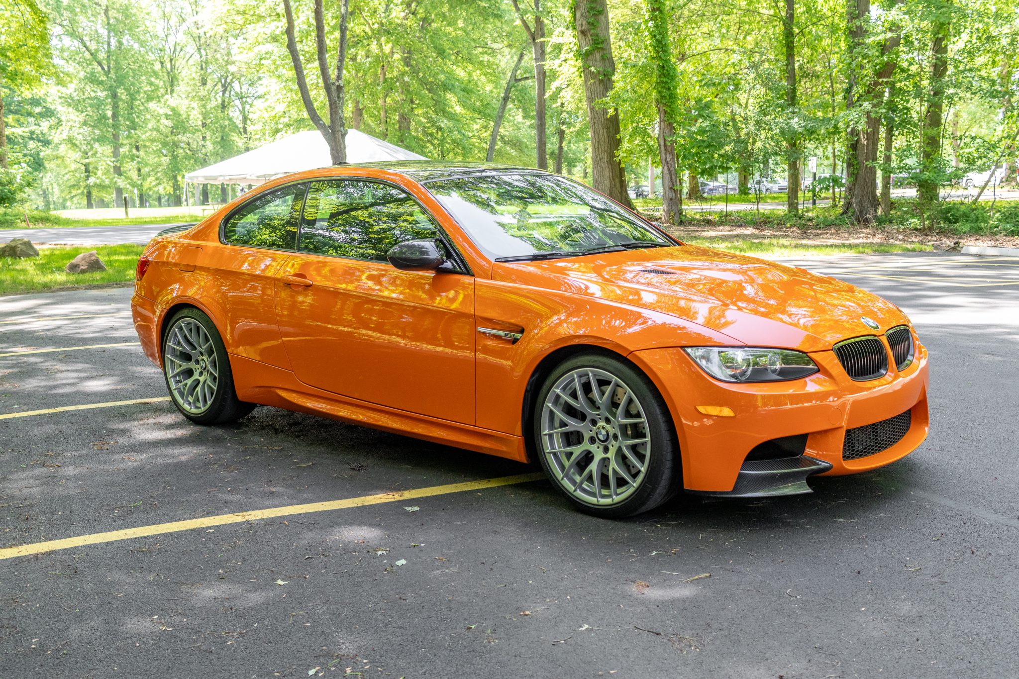 This 2012 BMW M3 was ordered with the Competition Package and was sold new at Dave Walter BMW in Akron, Ohio, and it spent time registered in the state before it was offered on BaT in August 2022. Now indicating 27k miles, the car is finished in Fire Orange over black leather and cloth. Power is provided by a 4.0-liter V8 paired with a seven-speed dual-clutch transmission, and equipment includes a limited-slip differential, an M Performance exhaust system, carbon-fiber exterior trim, adaptive xenon headlights, 19″ Style 359 wheels, manually adjustable front sport seats, and a CD stereo. Recently acquired by the selling dealer, this E92 M3 is offered at no reserve with a clean Carfax report and a clean New Jersey title. The car is finished in Fire Orange with Shadowline trim and carbon-fiber components including the roof panel, rear spoiler, front splitters, and mirror caps. The exterior also features adaptive xenon headlights, rain-sensing wipers, black-finished kidney grilles, and quadruple exhaust outlets. Close-up photos of the paint, lenses, and trim can be viewed in the gallery below. Style 359 19″ wheels are mounted with a mixed set of Michelin tires measuring 245/35 up front and 265/35 out back. The Competition Package specified a lowered ride height compared to the standard M3 as well as retuned Electronic Damping Control (EDC) and Dynamic Stability Control (DSC). Braking is handled by four-wheel vented and cross-drilled discs measuring 14.2″ and 13.8″ front and rear, respectively. The manually adjustable sport seats are upholstered in black leather with cloth inserts, and Carbon Structure Leather trim accents the dashboard and doors. The car was ordered without iDrive, and appointments include dual-zone automatic climate control, cruise control, and a CD stereo. The Carfax report notes that the driver-side airbag assembly was replaced in July 2021. The microsuede-wrapped steering wheel features paddle shifters and a yellow centering stripe, and it fronts a 200-mph speedometer, an M-branded tachometer, a central information display, and gauges for oil temperature and fuel level. The digital odometer indicates 27k miles. The 4.0-liter S65 V8 features double-VANOS variable valve timing and was factory rated at 414 horsepower and 295 lb-ft of torque. The battery was replaced in June 2023, while an oil change was carried out in October 2024. Power is sent to the rear wheels through a seven-speed M-DCT dual-clutch transmission and a Variable M Differential Lock. The car is equipped with an M Performance exhaust system. The Carfax report shows no accidents or other damage and lists history in Ohio and New Jersey.