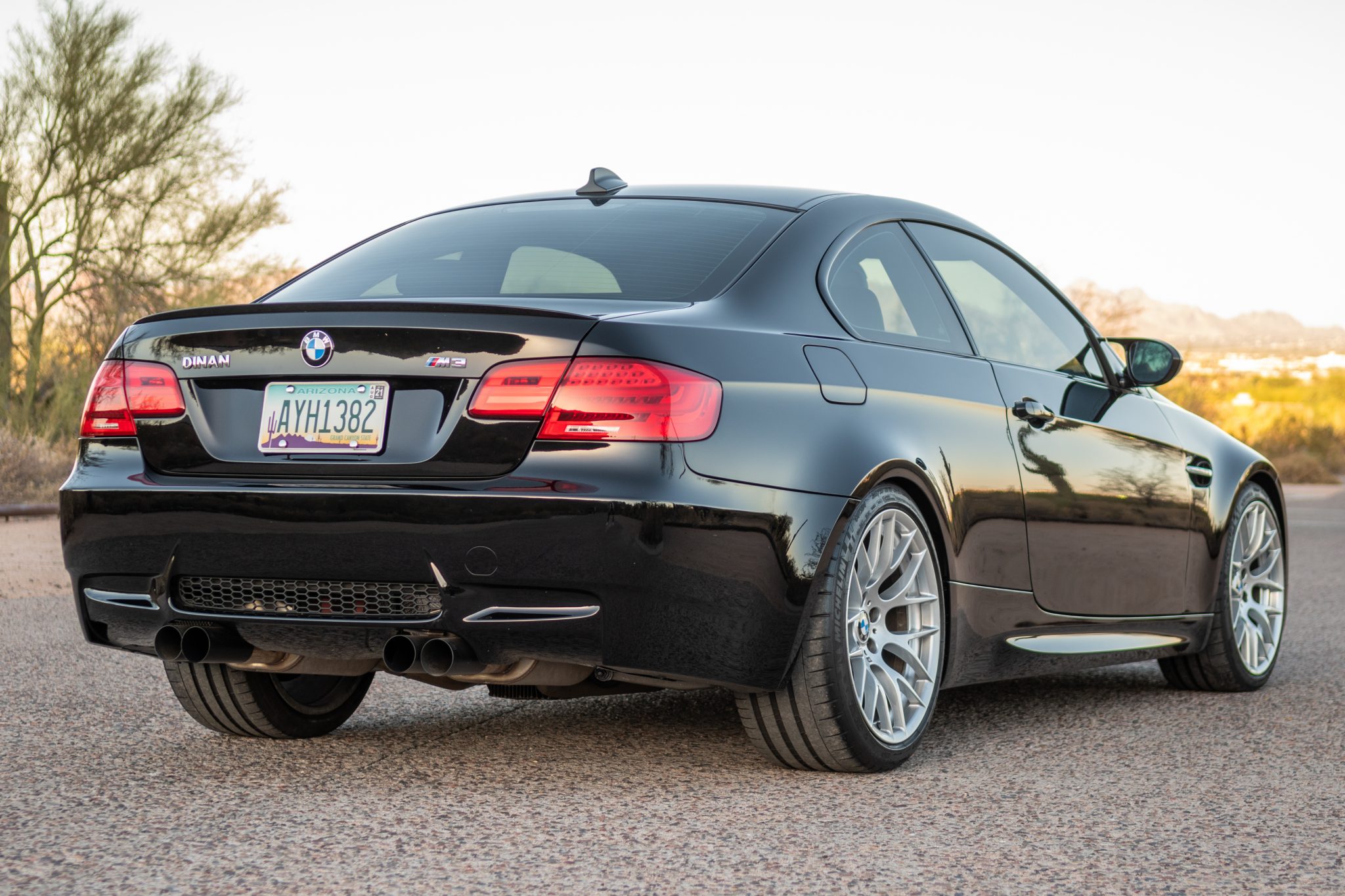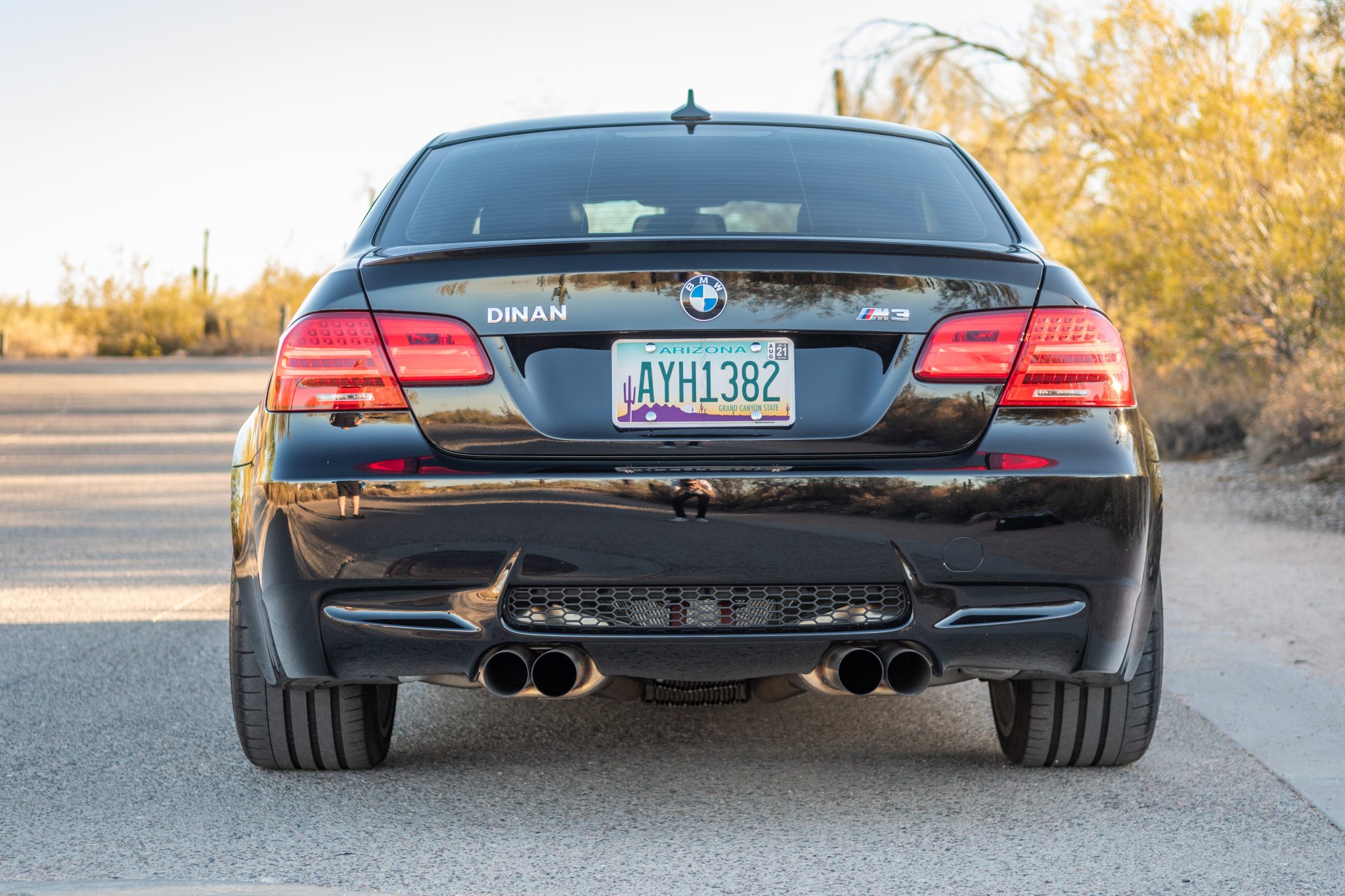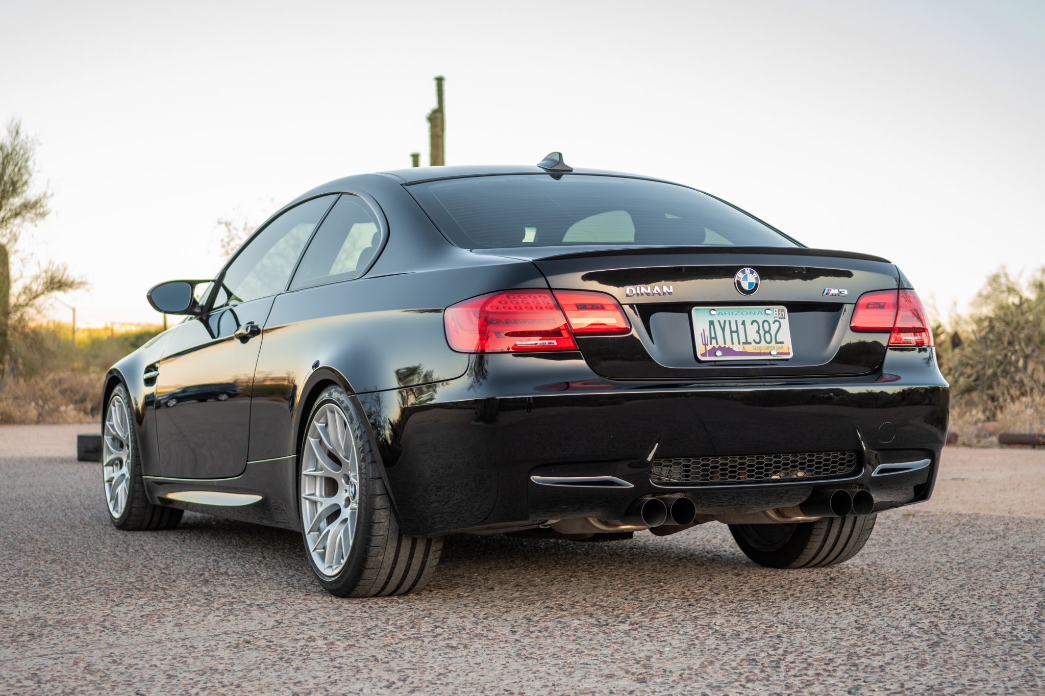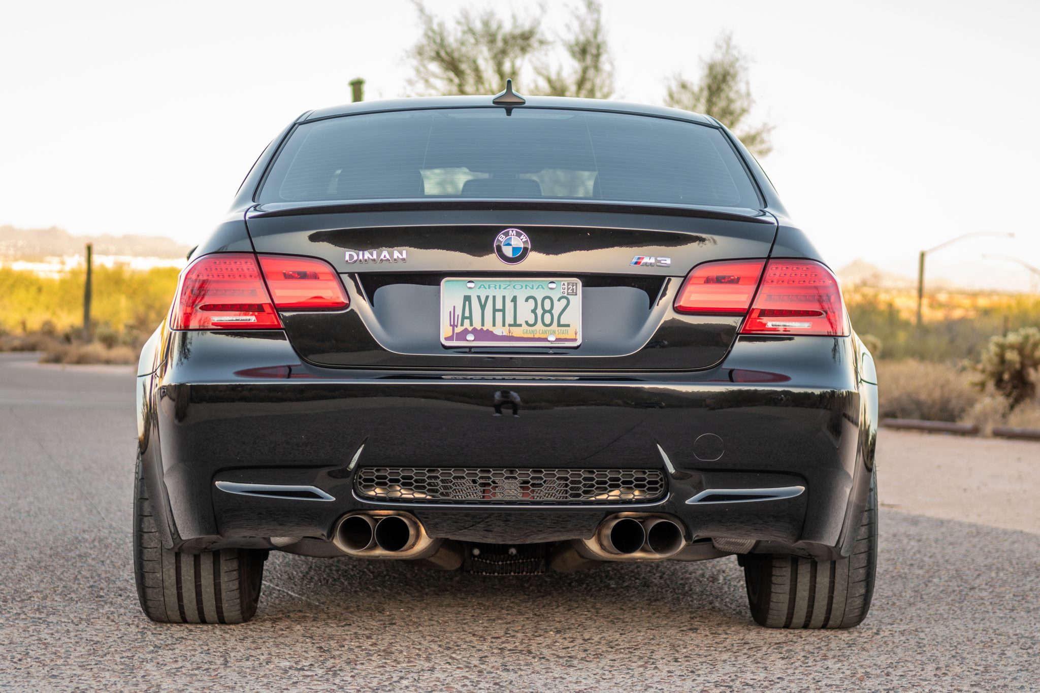 This 2012 BMW M3 coupe was purchased new by the seller from BMW North Scottsdale of Phoenix, Arizona, and is powered by a 4.0-liter S65 V8 backed by a six-speed manual transmission. The car is finished in black over black leather and has been fitted with the Dinan S2 package, which consists of a Dinan ECU tune, intake system, exhaust, limited-slip differential, and suspension components. Additional equipment includes the factory Competition Package, dynamic damper control, adaptive xenon headlights, carbon leather trim, and BMW Hi-Fi Professional audio system. This E92 M3 has 11k miles and is offered with service records, manufacturer’s literature, a window sticker, a clean Carfax report, and a clean Arizona title in the seller’s name. The car is finished in Jet Black (668) and features a carbon-fiber roof panel, Shadowline trim, front and rear spoilers, quad exhaust tips, and xenon adaptive headlights. Dinan trunk badging requires owners to accrue a minimum of 10 points, and this M3 has earned a total of 21 points based on the installed modifications. The finish and trim are pictured up close in the gallery below. Staggered-width 19″ Style 359 wheels are mounted with 245/35 front and 265/35 rear Michelin Pilot Super Sport tires. The Competition Package includes a reprogrammed Dynamic Damping Control unit and a lowered ride height. Modifications include adjustable sway bars, strut tower braces, and Dinan springs which lower the ride height and additional 12mm. The cabin features Black Novillo leather upholstery with a matching dashboard, door panels, and carpeting. Amenities include Dinan pedal covers, carbon-look leather trim, an anthracite headliner, rain sensing wipers, M-Drive, and a BMW Hi-Fi Professional audio system with a CD player and USB media adapter. The leather-wrapped steering wheel features tri-color stitching and frames a 200-mph speedometer, a tachometer with a variable redline, and gauges for fuel level and oil temperature. Approximately 11k miles are shown on the digital odometer. The 4.0-liter S65 V8 features double-VANOS variable valve timing and was modified in February 2014 with the Dinan S2 package, which includes high-flow throttle bodies, a cold-air intake system, and an under-drive pulley kit. The engine management has been modified to increase the rev limit to 8700rpm and remove the top speed limiter. Power is sent to the rear wheels via a six-speed manual transmission and a Dinan 4.10:1 limited-slip differential. A Dinan Performance exhaust system accompanies the S2 package. Factory literature is housed in a black leather-bound portfolio. The window sticker, service records, two keys, and removed factory parts are also included in the sale. The Carfax report lists no accidents or other damage and shows registration history in Arizona.