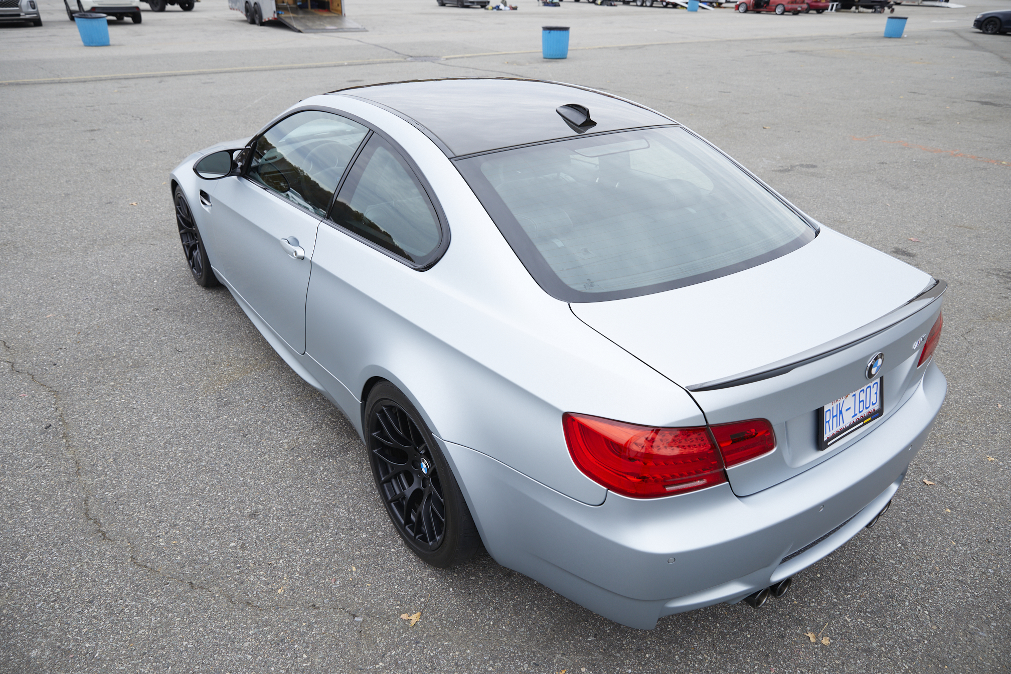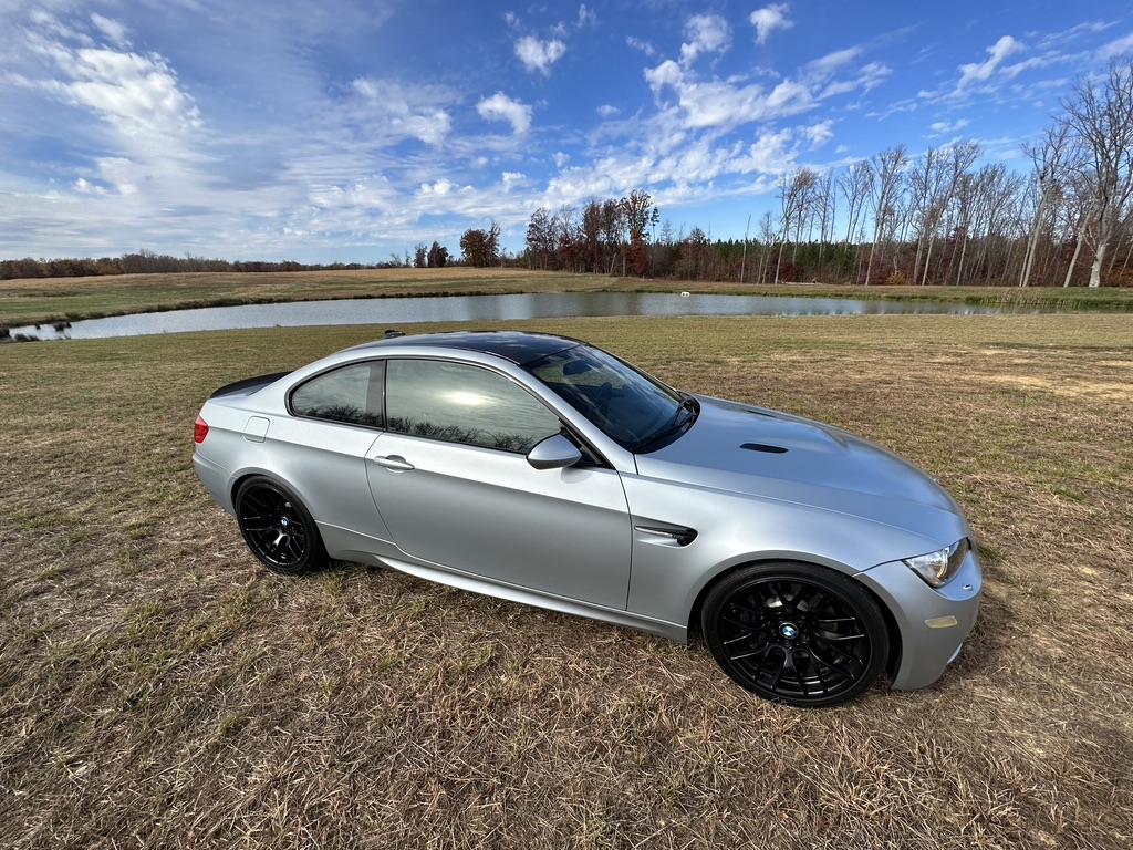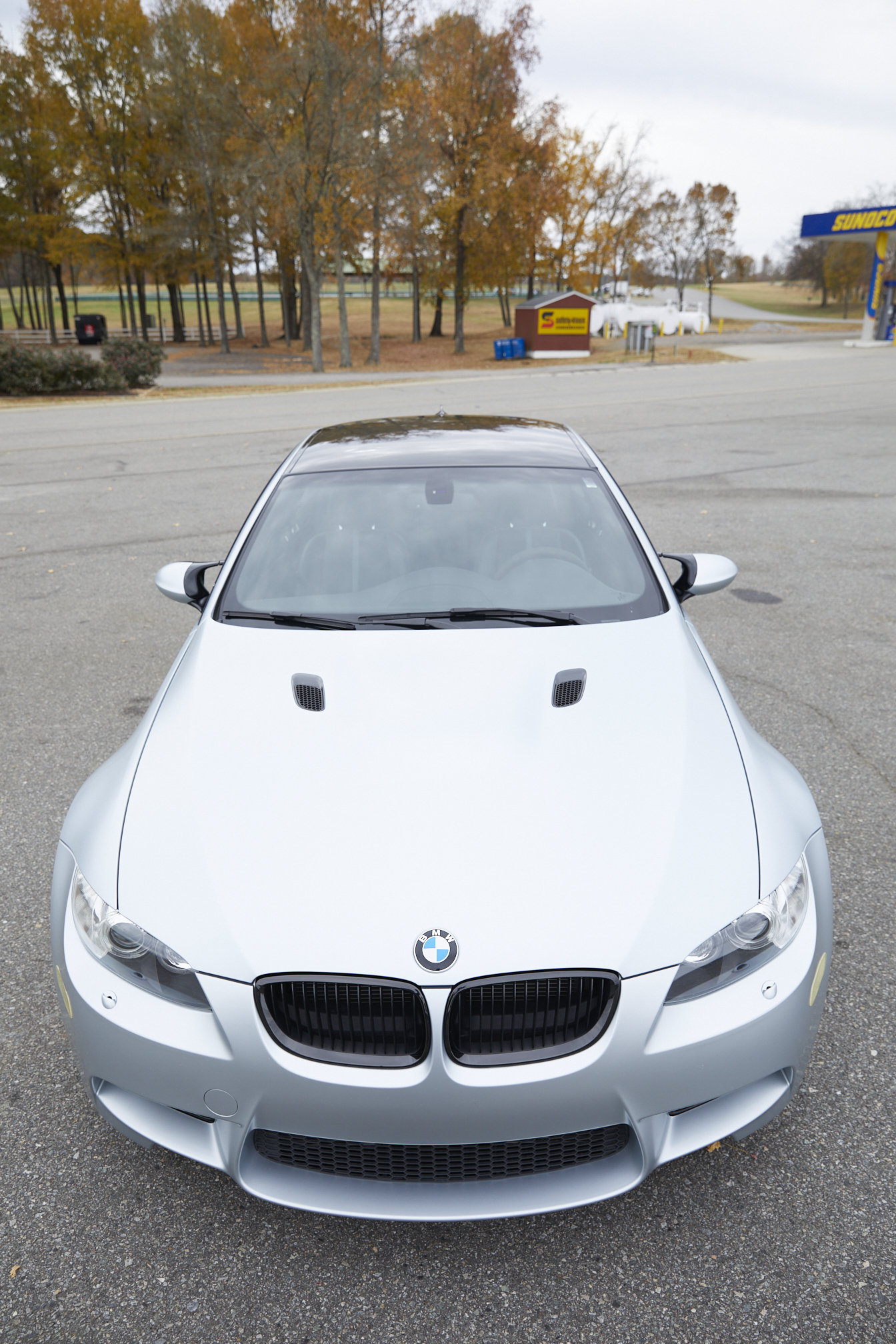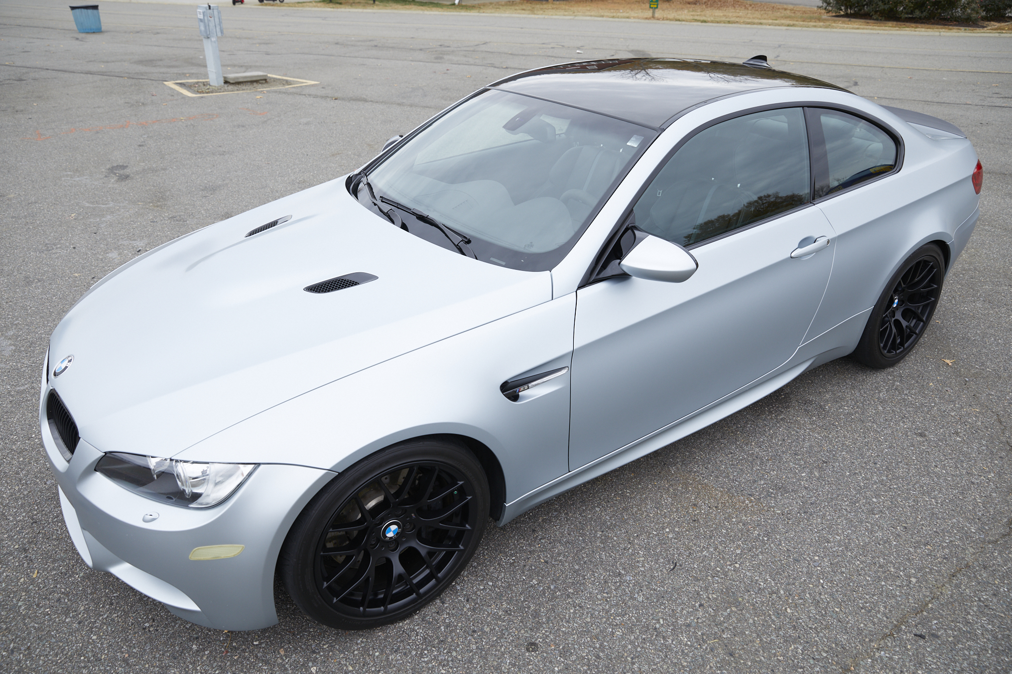 This 2012 BMW M3 coupe is one of 40 Frozen Silver Edition examples produced for the North American market, and it was purchased by the seller in 2014, who has since added approximately 22k of the 24k indicated miles. It is powered by a 4.0-liter S65 V8 paired with a seven-speed dual-clutch transmission and features the Competition, Premium, and Cold Weather packages as well as black Novillo leather, 19″ Style 359 wheels, a limited-slip differential, adaptive xenon headlights, rear parking sensors, heated front sport seats, and a carbon-fiber roof panel and rear spoiler. This E92 M3 Frozen Edition is now offered with a window sticker, the owner’s manual, a car cover, and a clean North Carolina title in the seller’s name. The car is finished in Frozen Silver and features a carbon-fiber roof panel and rear spoiler as well as Shadowline trim, adaptive xenon headlights, rain-sensing wipers, rear parking sensors, and quadruple exhaust outlets. The Carfax report notes that the rear and left rear of the car sustained “very minor damage” in a rear-end collision in September 2014 with no additional information provided. Matte black-finished 19″ Style 359 wheels are mounted with Nitto Invo tires. Competition Package equipment includes a lowered ride height compared to the standard M3 as well as retuned Electronic Damping Control (EDC) and Dynamic Stability Control (DSC). Braking is handled by four-wheel vented and cross-drilled discs measuring 14.2″ and 13.8″ front and rear, respectively. The heated power-adjustable front sport seats are upholstered in black Novillo leather with lighter stitching complemented by carbon-fiber trim on the dashboard, center console, and doors. Amenities include iDrive with navigation as well as Comfort Access keyless entry, a CD stereo, a power rear sunshade, dual-zone automatic climate control, and cruise control. Quilted floor mats are fitted along with a K40 radar detector and a LoJack stolen vehicle recovery system. The Alcantara-wrapped steering wheel features paddle shifters along with tri-color stitching and frames an M-branded tachometer, a 200-mph speedometer, a central information display, and gauges for oil temperature and fuel level. The digital odometer indicates under 24k miles, approximately 22k of which were added under current ownership. The 4.0-liter S65 V8 features double-VANOS variable valve timing and was factory rated at 414 horsepower and 295 lb-ft of torque. Power is sent to the rear wheels through a seven-speed M-DCT dual-clutch transmission and a Variable M Differential Lock. The window sticker notes initial delivery to Performance BMW in Chapel Hill, North Carolina, and lists factory equipment, colors, options, and a total suggested retail price of $82,360. The Carfax report notes the aforementioned September 2014 accident entry and lists registration history in North Carolina since new.