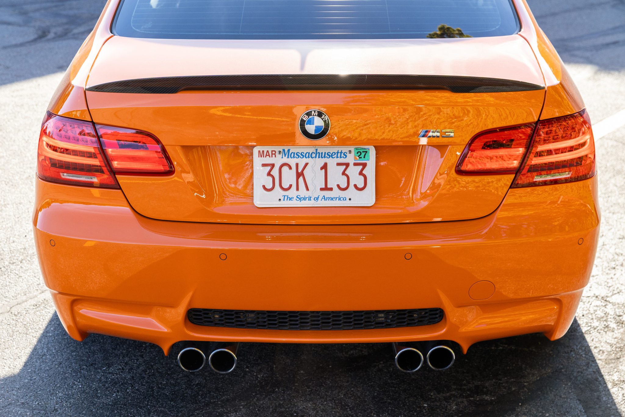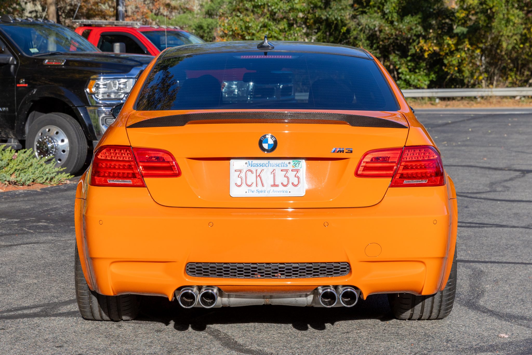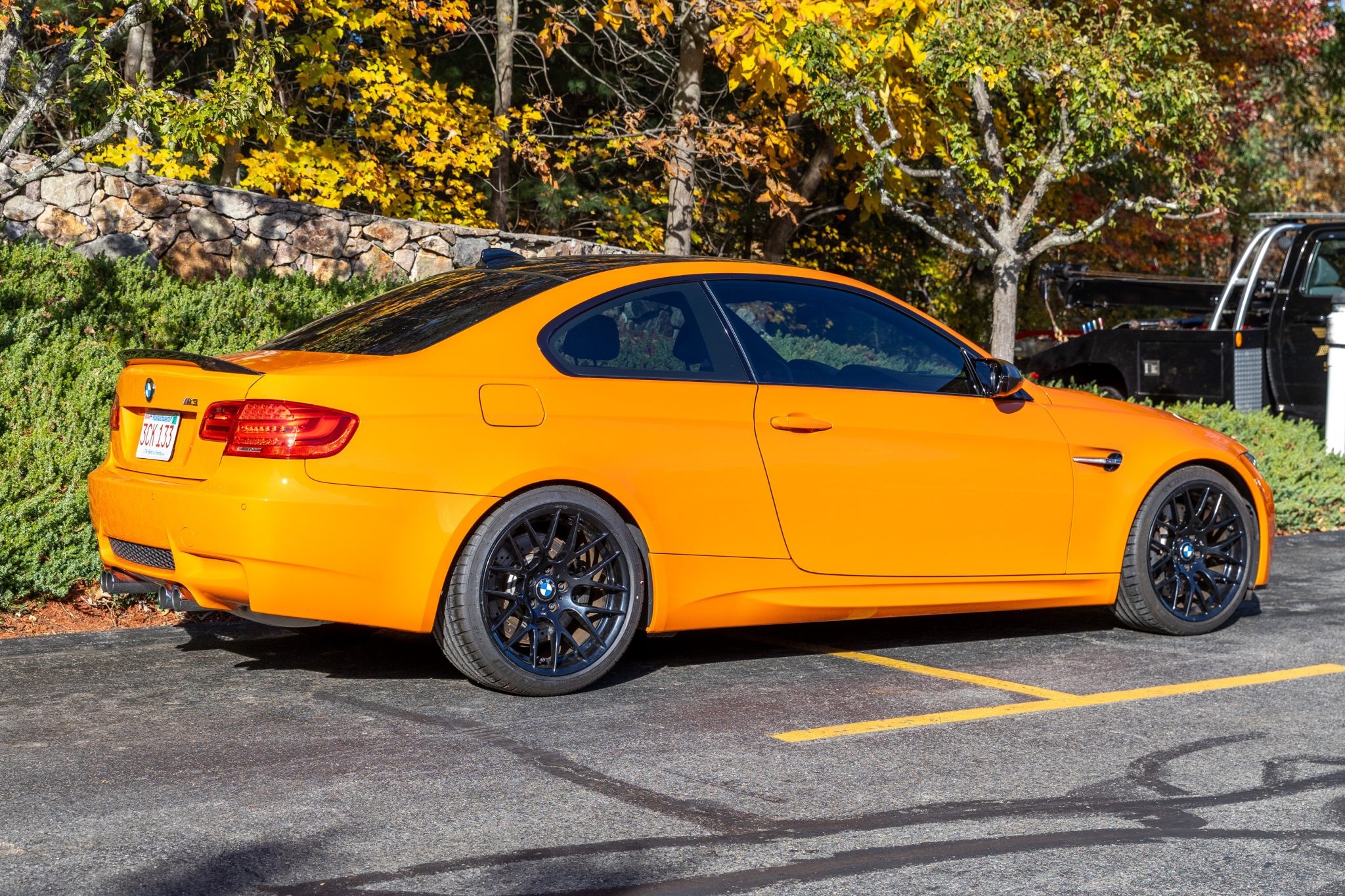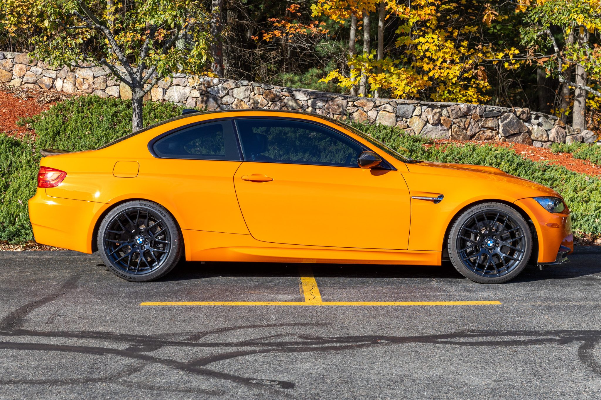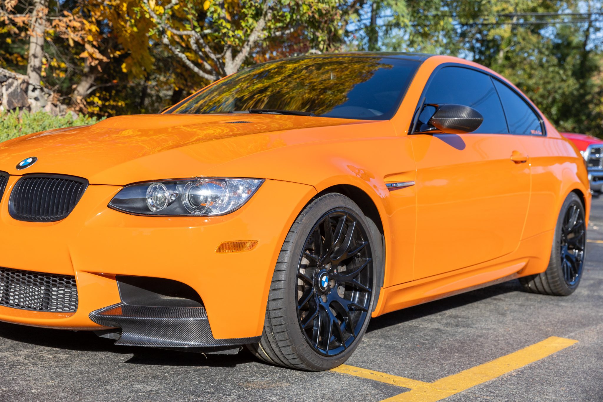This 2012 BMW M3 coupe is said to be one of two examples specified in BMW Individual Fire Orange with the Competition Package for the model year. It was purchased by the seller in 2015 and now has 4,700 miles. Powered by a 4.0-liter V8 linked to a seven-speed dual-clutch transmission and a limited-slip differential, the car is equipped with xenon headlights, black 19″ Style 359 wheels, a carbon-fiber roof panel and rear spoiler, rear Park Distance Control, heated front seats, navigation, dual-zone automatic climate control, and cruise control. This E92 M3 is offered with a clean Carfax report and a clean Massachusetts title in the name of the seller’s business. The body is finished in BMW Individual Fire Orange and features a carbon-fiber roof, rear spoiler, and side mirror covers. Additional exterior details include Shadowline trim, adaptive xenon headlights, rain-sensing wipers, power-folding side mirrors, a carbon-fiber roof panel, a trunk lid spoiler, rear Park Distance Control, and quadruple exhaust outlets. The seller notes a blemish on the rear quarter window trim, and close-up photographs of the exterior finish and trim are shown in the gallery below. The gloss black 19″ Style 359 wheels are fitted with Michelin Pilot Sport tires that were recently mounted. Competition Package equipment includes a lowered ride height compared to the standard M3, as well as retuned Electronic Damping Control (EDC) and Dynamic Stability Control (DSC). Braking is handled by four-wheel vented and cross-drilled discs measuring 14.2″ and 13.8″ front and rear, respectively. There is a curb mark on the right rear wheel. The heated power-adjustable front sport seats are upholstered in black Novillo leather, and Carbon Structure Leather trim accents the dashboard and doors. Amenities include iDrive with navigation, Comfort Access keyless entry, a CD stereo, dual-zone automatic climate control, and cruise control. A dashboard cup holder does not eject. The multifunction leather-wrapped steering wheel features paddle shifters along with tri-color stitching and frames an M-branded tachometer, a 200-mph speedometer, a central information display, and gauges for oil temperature and fuel level. The digital odometer indicates 4,700 miles, approximately 3,500 of which were added under current ownership. The 4.0-liter S65 V8 features double-VANOS variable valve timing and was factory rated at 414 horsepower and 295 lb-ft of torque. The battery was replaced and the oil was changed in 2025. Power is sent to the rear wheels through a seven-speed M-DCT dual-clutch transmission and a Variable M Differential Lock. The Carfax report is free of accidents or other reported damage.
