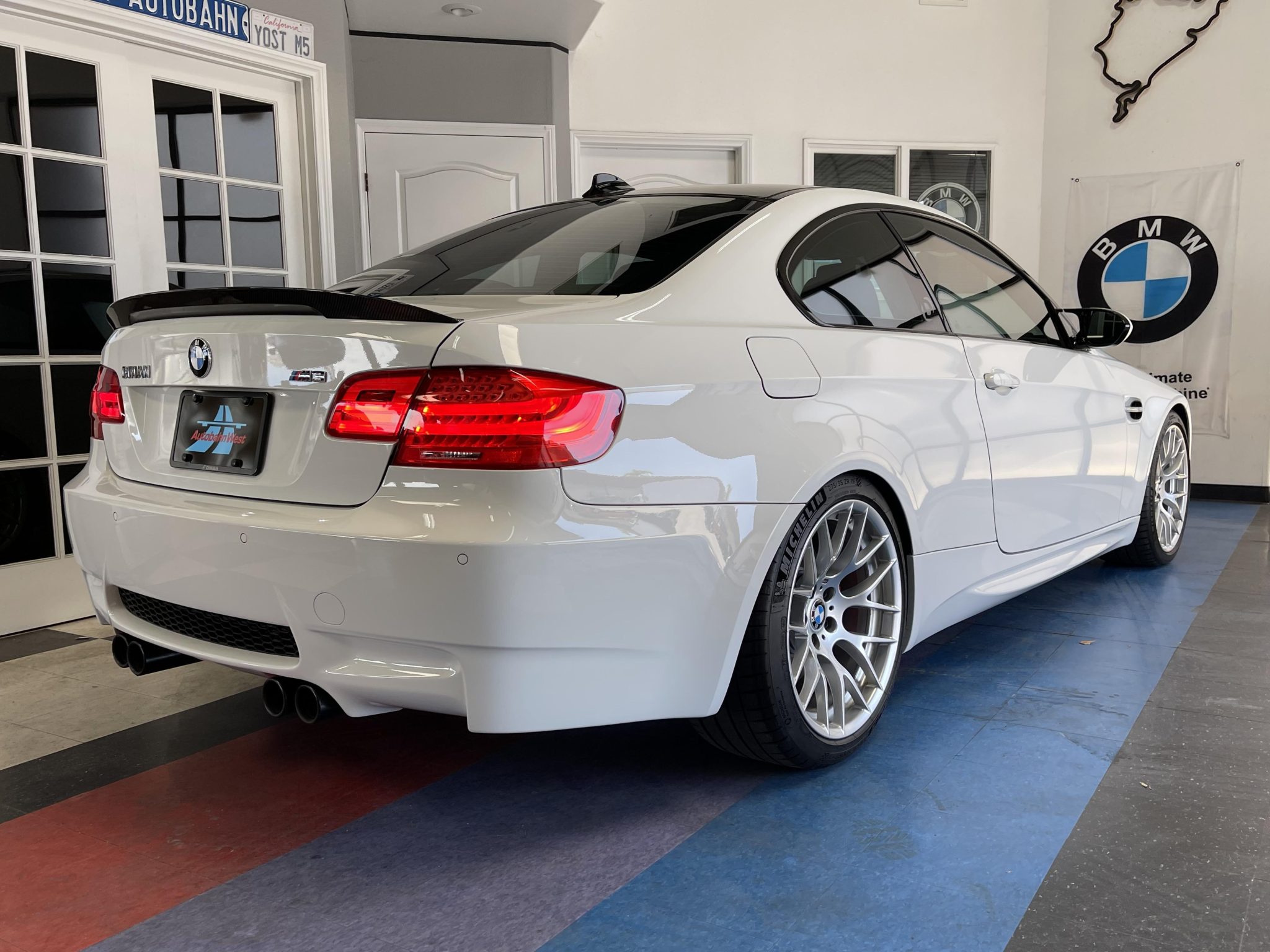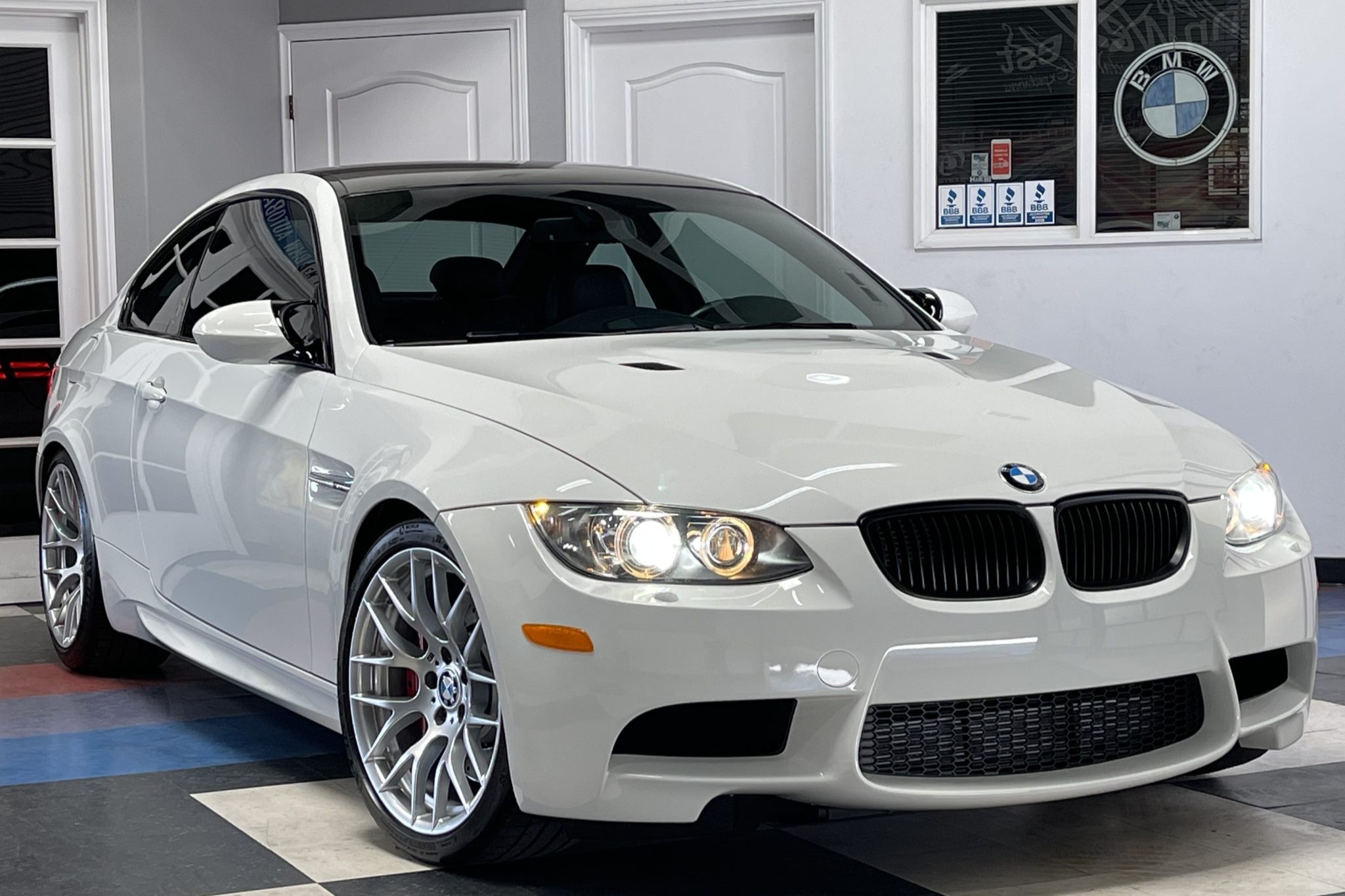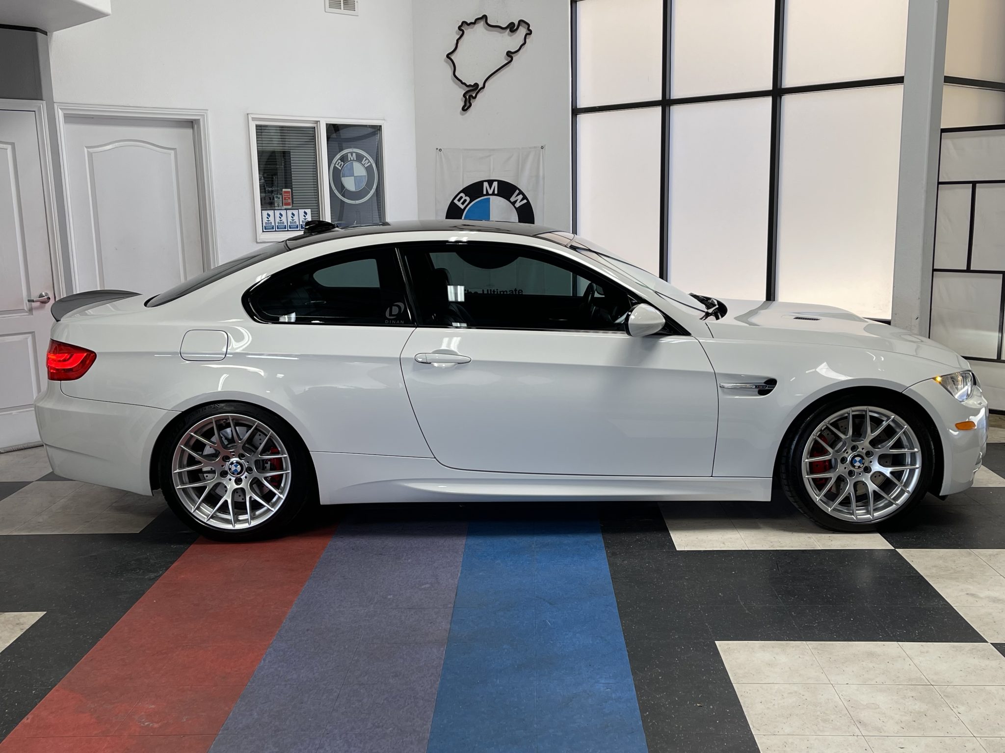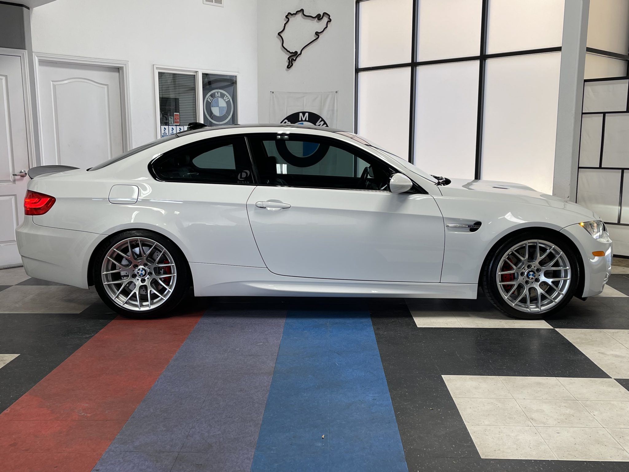 This 2013 BMW M3 coupe is powered by a 4.0-liter V8 paired with a seven-speed dual-clutch transmission and is finished in Alpine White III over black Novillo leather. Equipment includes the Competition, Cold Weather, and Premium packages along with a limited-slip differential, xenon headlights, rear parking sensors, heated and power-adjustable front seats, dual-zone automatic climate control, navigation, and cruise control. Modifications include Dinan performance springs and drivetrain software. The car was first registered in Arizona and spent time in California before it was acquired by the selling dealer in March 2022. This E92 M3 has just under 63k miles and is now offered with manufacturer’s literature, a clean Carfax report, and a clean California title. The car is finished in Alpine White III and features Shadowline trim and adaptive xenon headlights as well as rain-sensing wipers, a carbon-fiber roof panel, a carbon-fiber trunk lid spoiler, rear parking sensors, and quadruple exhaust outlets. The selling dealer states that the front and rear bumper covers have been repainted. Factory 19″ Style 359 wheels are mounted with Michelin Pilot Sport 4S tires measuring 255/35 up front and 275/35 out back. Competition Package equipment includes re-tuned Electronic Damping Control (EDC) and Dynamic Stability Control (DSC), and this example has been fitted with Dinan performance springs. Braking is handled by four-wheel vented and cross-drilled discs measuring 14.2″ and 13.8″ front and rear, respectively. The heated and power-adjustable sport seats are upholstered in black Novillo leather, and Brushed Aluminum Shadow trim accents the dashboard and door panels. Amenities include a CD stereo, a power rear sunshade, dual-zone automatic climate control, navigation, and cruise control. The leather-wrapped multifunction steering wheel features tri-color stitching and is equipped with shift paddles. Instrumentation includes an M-branded tachometer, a 200-mph speedometer, a central information display, and gauges for oil temperature and fuel level. The digital odometer indicates just under 63k miles, approximately 50 of which have been added by the selling dealer. The 4.0-liter S65 V8 features double-VANOS variable valve timing and sends power to the rear wheels through a seven-speed M-DCT dual-clutch transmission and a Variable M Differential Lock. Modifications reportedly include Dinan Stage 1 engine management software along with transmission control software. Additional underside photos are presented in the gallery below. The Carfax report shows no accidents or other damage and lists history in Arizona and California.