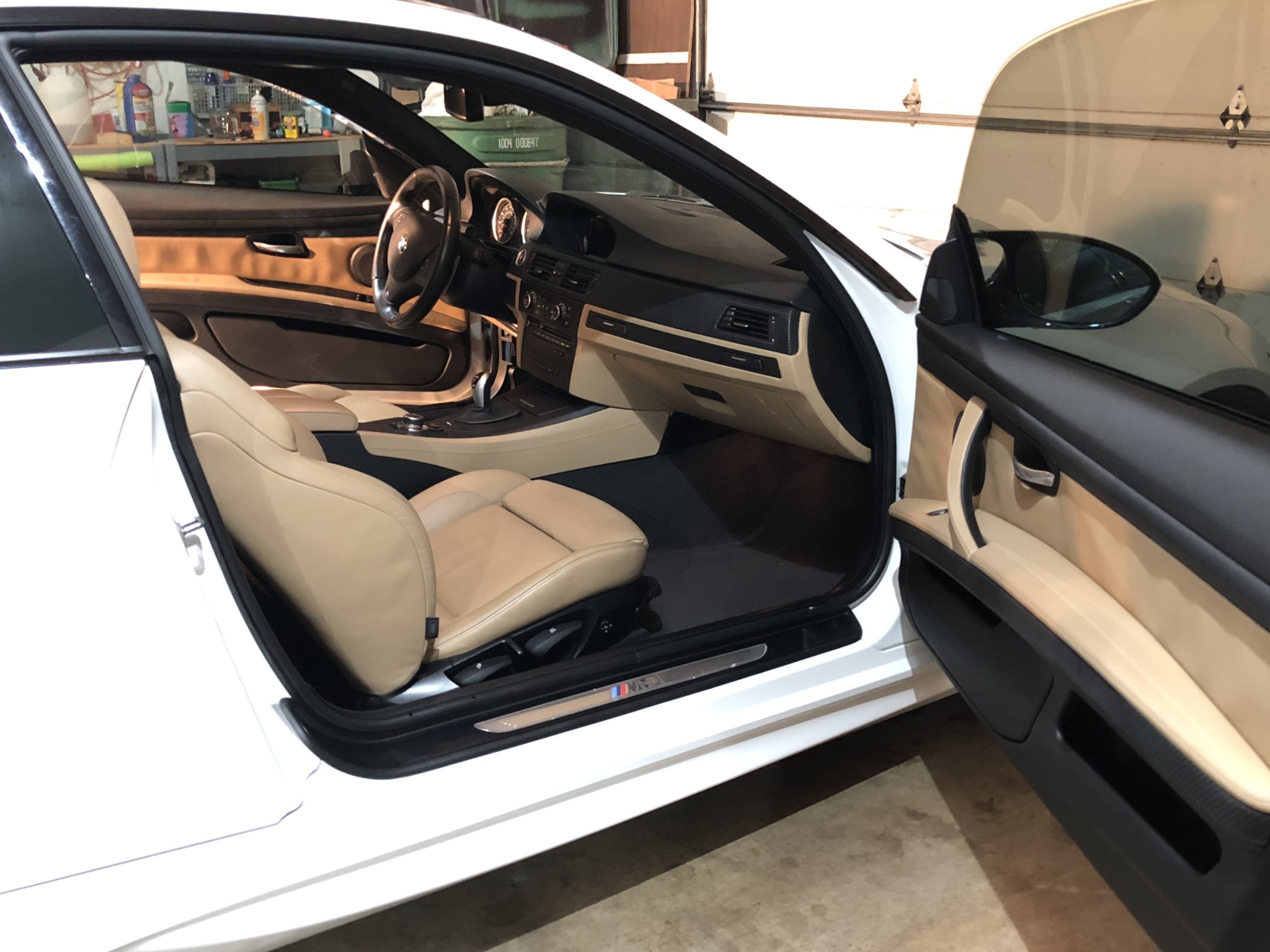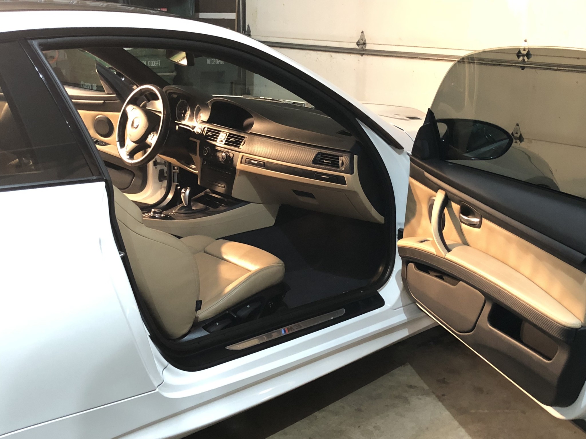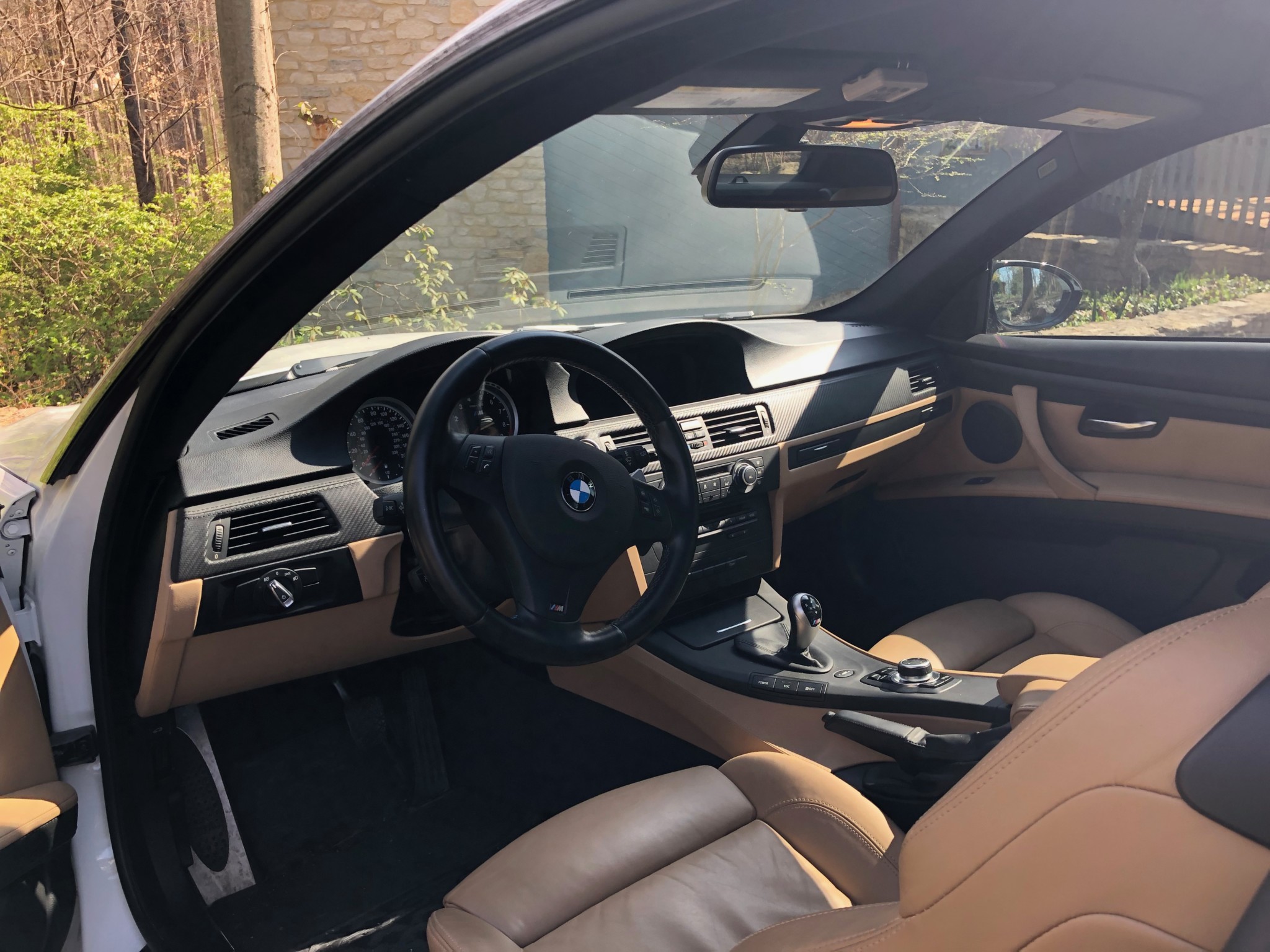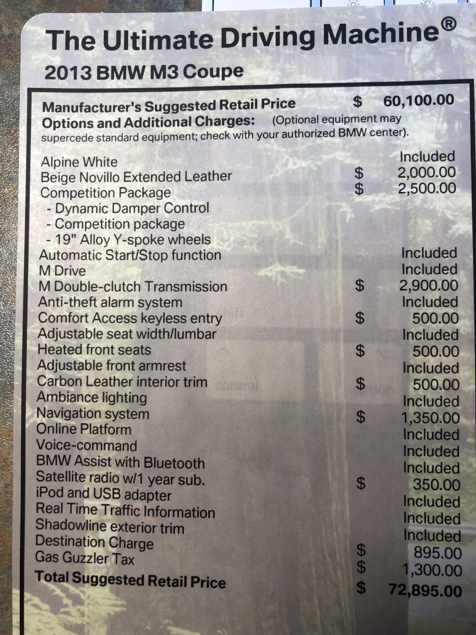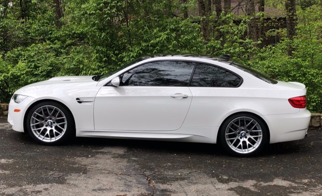 This 2013 BMW M3 coupe was purchased new by the seller at Dreyer & Reinbold BMW in Indianapolis, Indiana and shows just over 43k miles. Finished in Alpine White over Beige Novillo extender leather, the car is powered by a 4.0-liter V8 paired with a dual-clutch transmission and optioned with the Competition Package, heated front seats, keyless entry, navigation, and carbon fiber interior trim. Recent service included installation of new DCT seals, brake pads and rotors, wheels, and tires. This E92 M3 is offered with service records, a set of winter wheels and tires, a Carfax report, and a clean Indiana title in the seller’s name. Body panels are finished in Alpine White (A75) and accented by a carbon fiber roof and Shadowline window trim. The rocker panels and floor pan were repaired to alleviate damage caused by a wheel theft in October 2018, and the seller notes chips on the front bumper. 25% side and 20% rear window tint has been added. New staggered-width 19″ Style 359 wheels with Michelin Pilot Super Sport tires were fitted in November 2018 following the aforementioned wheel theft, and new cross-drilled and vented brake discs were also installed. The car is equipped with Electronic Damping Control and stability control with M Dynamic Mode. The cabin features Beige Novillo extended leather with heated seats, carbon fiber dash trim, navigation, automatic climate control, a factory stereo, and a digital multifunction display. The seller notes wear on the outer driver’s seat bolsters. Instrumentation includes a 200-mph speedometer, a tachometer with an 8k-rpm redline, and fuel and temperature gauges. Just over 43k miles are shown on the odometer, with all added by the seller. The 4.0-liter S65 V8 features Double VANOS variable valve timing and produced 414 horsepower when new. The engine is paired with an M-DCT dual-clutch transmission that received new seals and fluid in May 2018. A window sticker displaying a total price of $72,895 is included in the sale along with owner’s manuals and other literature, service records, all-weather floor mats, and a set of extra wheels with Bridgestone Blizzak winter tires. The accident-free Carfax report shows one registered owner from new through August 2018.