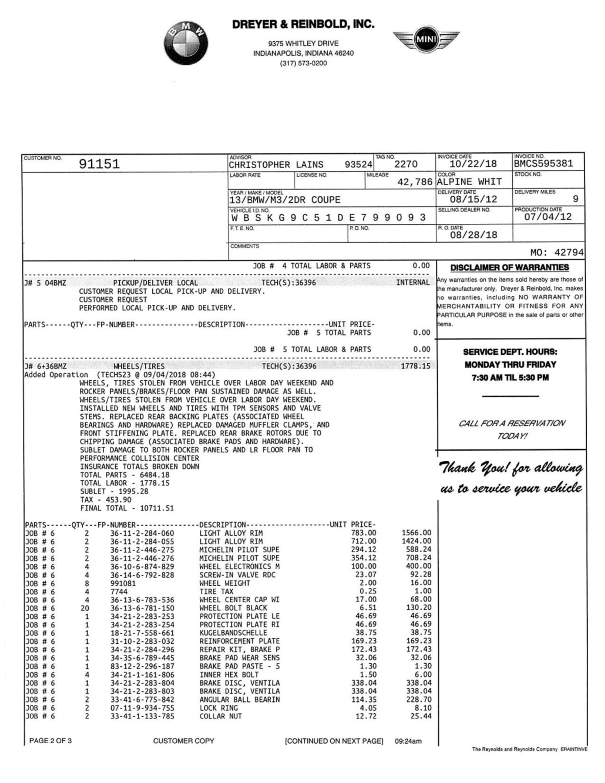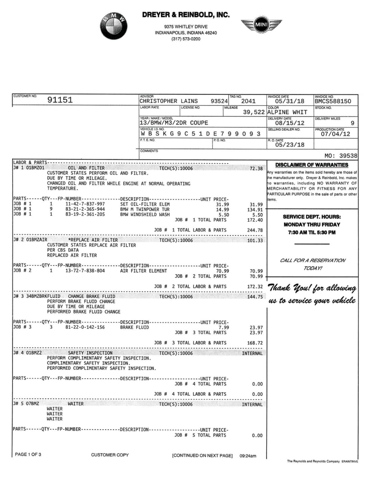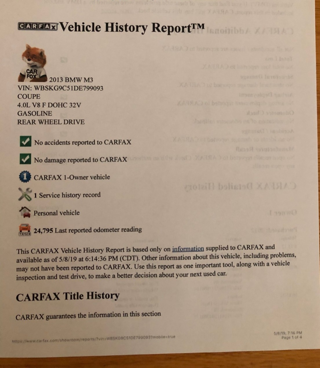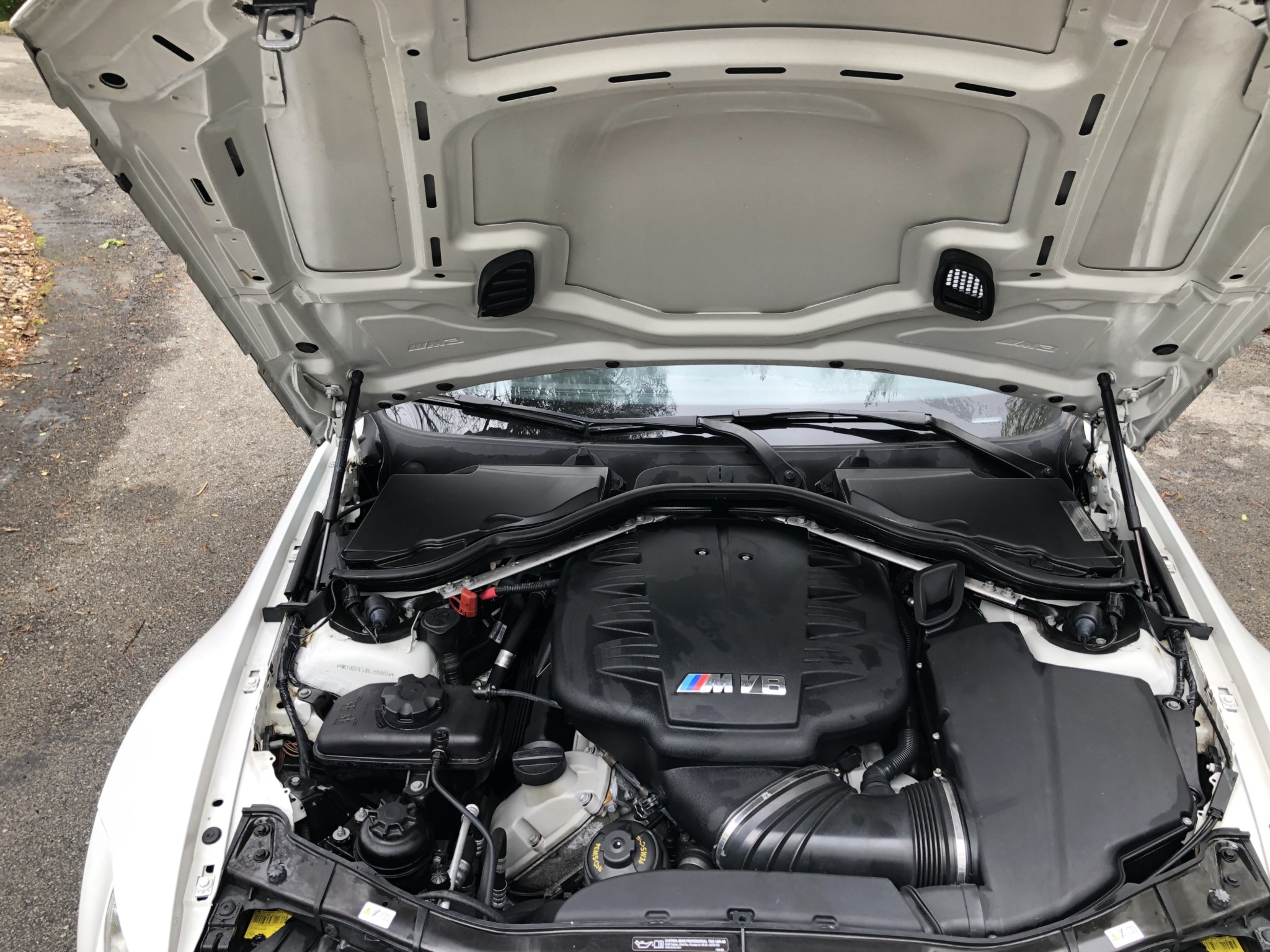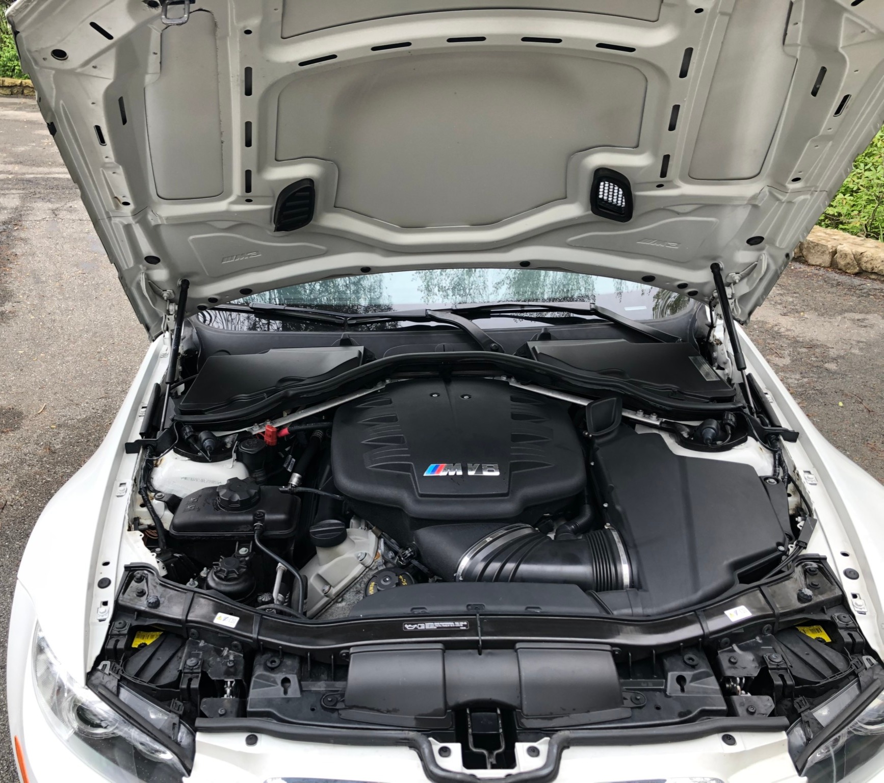 This 2013 BMW M3 coupe was purchased new by the seller at Dreyer & Reinbold BMW in Indianapolis, Indiana and shows just over 43k miles. Finished in Alpine White over Beige Novillo extender leather, the car is powered by a 4.0-liter V8 paired with a dual-clutch transmission and optioned with the Competition Package, heated front seats, keyless entry, navigation, and carbon fiber interior trim. Recent service included installation of new DCT seals, brake pads and rotors, wheels, and tires. This E92 M3 is offered with service records, a set of winter wheels and tires, a Carfax report, and a clean Indiana title in the seller’s name. Body panels are finished in Alpine White (A75) and accented by a carbon fiber roof and Shadowline window trim. The rocker panels and floor pan were repaired to alleviate damage caused by a wheel theft in October 2018, and the seller notes chips on the front bumper. 25% side and 20% rear window tint has been added. New staggered-width 19″ Style 359 wheels with Michelin Pilot Super Sport tires were fitted in November 2018 following the aforementioned wheel theft, and new cross-drilled and vented brake discs were also installed. The car is equipped with Electronic Damping Control and stability control with M Dynamic Mode. The cabin features Beige Novillo extended leather with heated seats, carbon fiber dash trim, navigation, automatic climate control, a factory stereo, and a digital multifunction display. The seller notes wear on the outer driver’s seat bolsters. Instrumentation includes a 200-mph speedometer, a tachometer with an 8k-rpm redline, and fuel and temperature gauges. Just over 43k miles are shown on the odometer, with all added by the seller. The 4.0-liter S65 V8 features Double VANOS variable valve timing and produced 414 horsepower when new. The engine is paired with an M-DCT dual-clutch transmission that received new seals and fluid in May 2018. A window sticker displaying a total price of $72,895 is included in the sale along with owner’s manuals and other literature, service records, all-weather floor mats, and a set of extra wheels with Bridgestone Blizzak winter tires. The accident-free Carfax report shows one registered owner from new through August 2018.