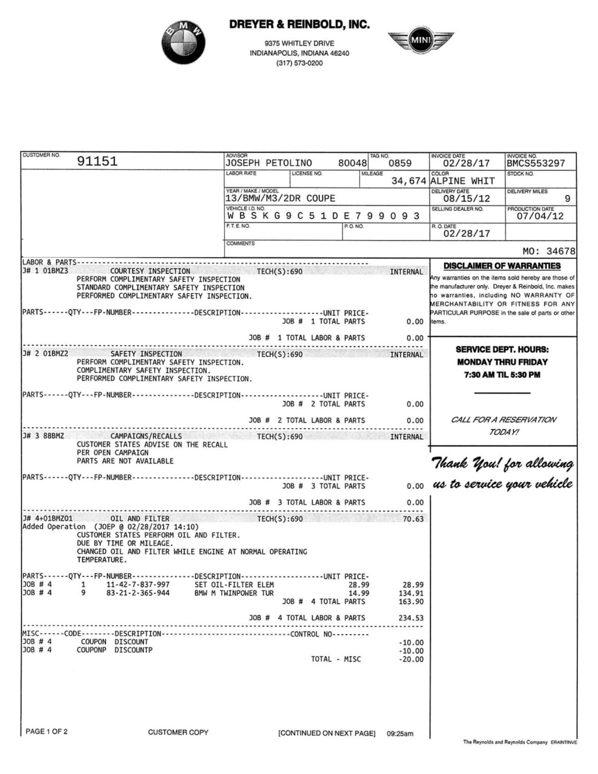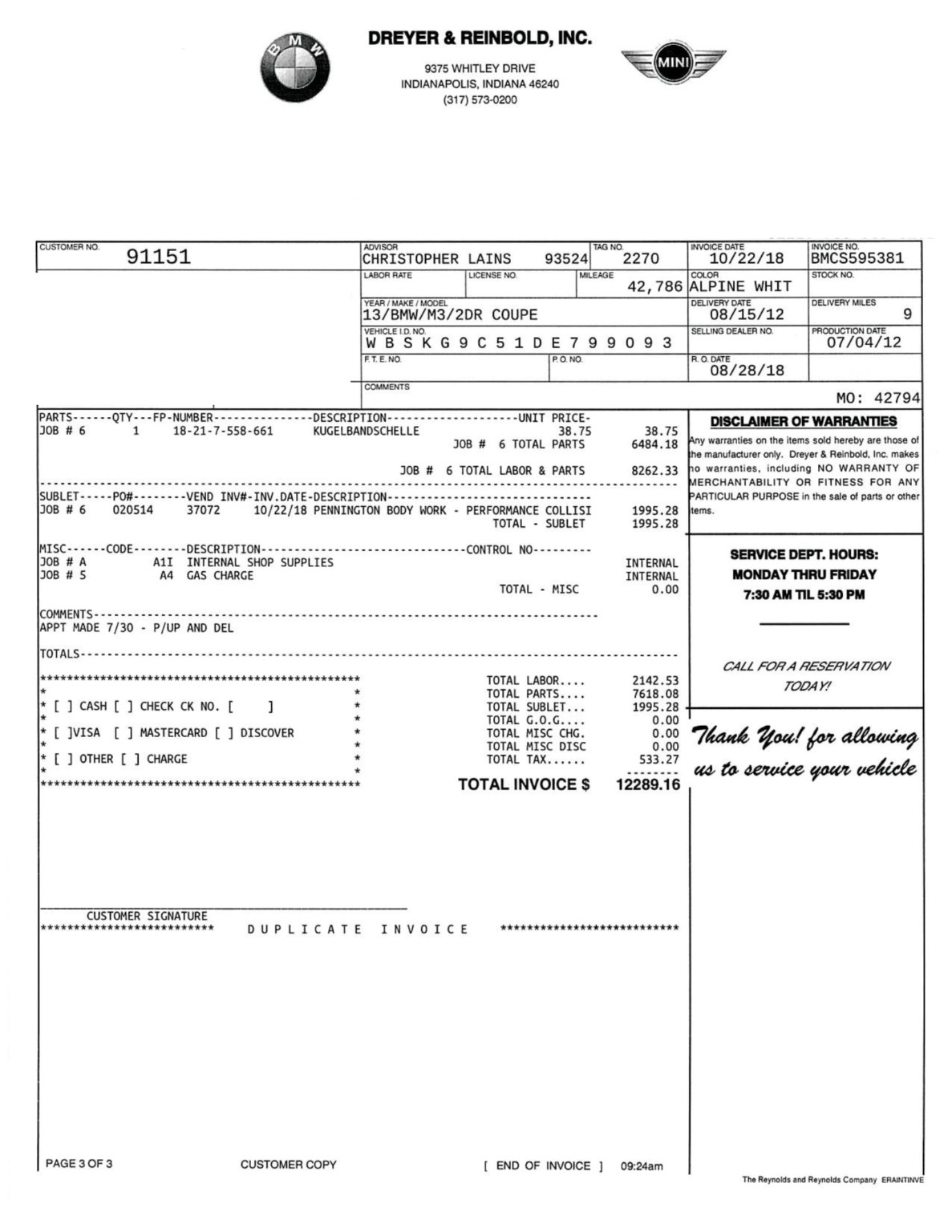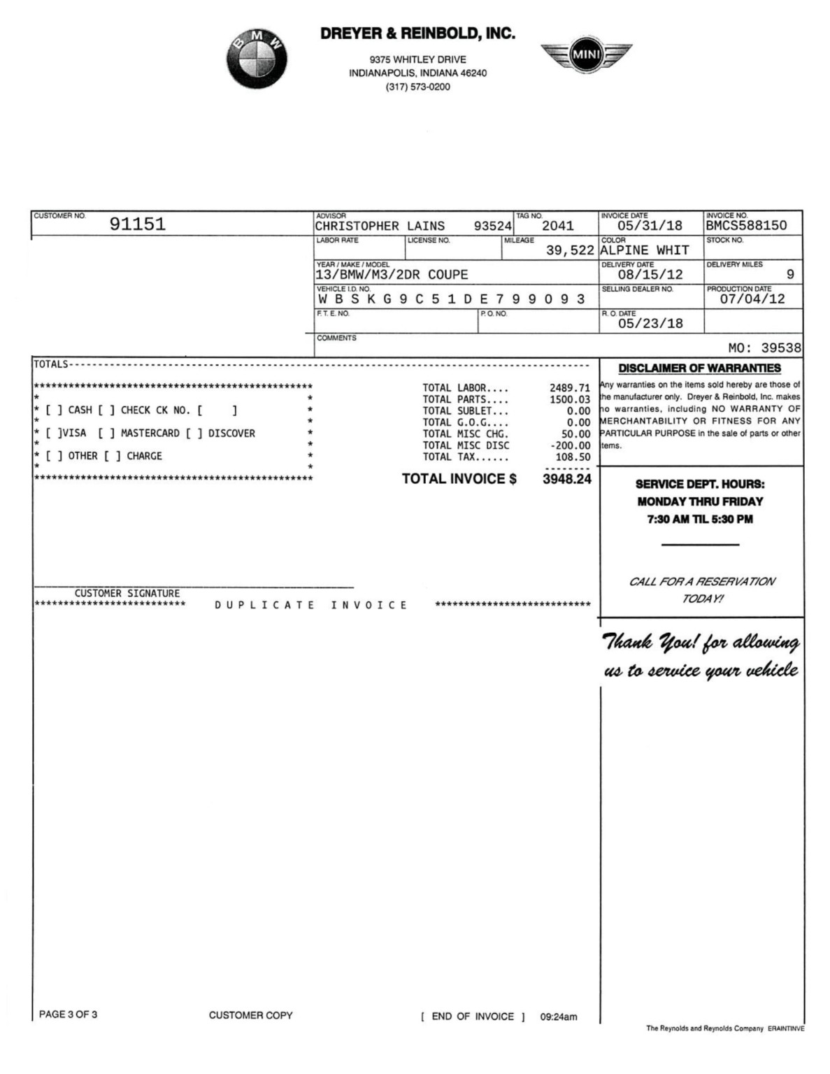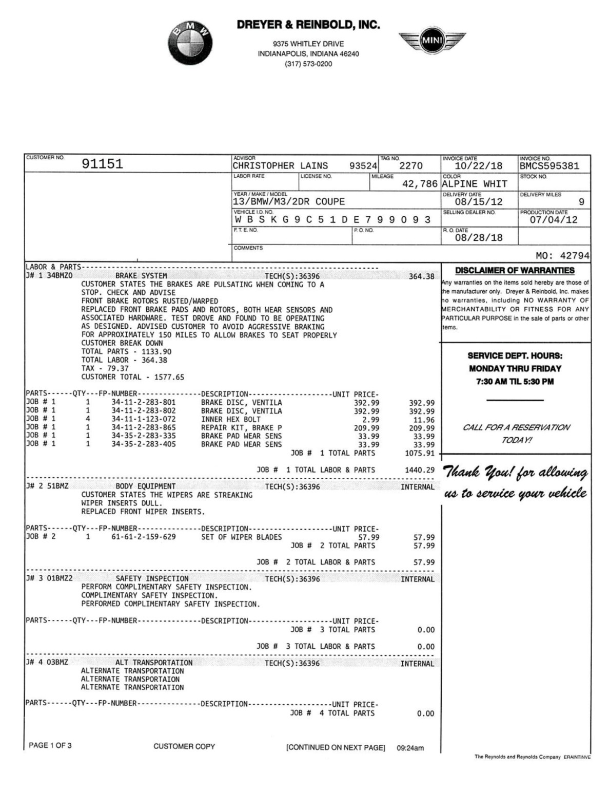 This 2013 BMW M3 coupe was purchased new by the seller at Dreyer & Reinbold BMW in Indianapolis, Indiana and shows just over 43k miles. Finished in Alpine White over Beige Novillo extender leather, the car is powered by a 4.0-liter V8 paired with a dual-clutch transmission and optioned with the Competition Package, heated front seats, keyless entry, navigation, and carbon fiber interior trim. Recent service included installation of new DCT seals, brake pads and rotors, wheels, and tires. This E92 M3 is offered with service records, a set of winter wheels and tires, a Carfax report, and a clean Indiana title in the seller’s name. Body panels are finished in Alpine White (A75) and accented by a carbon fiber roof and Shadowline window trim. The rocker panels and floor pan were repaired to alleviate damage caused by a wheel theft in October 2018, and the seller notes chips on the front bumper. 25% side and 20% rear window tint has been added. New staggered-width 19″ Style 359 wheels with Michelin Pilot Super Sport tires were fitted in November 2018 following the aforementioned wheel theft, and new cross-drilled and vented brake discs were also installed. The car is equipped with Electronic Damping Control and stability control with M Dynamic Mode. The cabin features Beige Novillo extended leather with heated seats, carbon fiber dash trim, navigation, automatic climate control, a factory stereo, and a digital multifunction display. The seller notes wear on the outer driver’s seat bolsters. Instrumentation includes a 200-mph speedometer, a tachometer with an 8k-rpm redline, and fuel and temperature gauges. Just over 43k miles are shown on the odometer, with all added by the seller. The 4.0-liter S65 V8 features Double VANOS variable valve timing and produced 414 horsepower when new. The engine is paired with an M-DCT dual-clutch transmission that received new seals and fluid in May 2018. A window sticker displaying a total price of $72,895 is included in the sale along with owner’s manuals and other literature, service records, all-weather floor mats, and a set of extra wheels with Bridgestone Blizzak winter tires. The accident-free Carfax report shows one registered owner from new through August 2018.