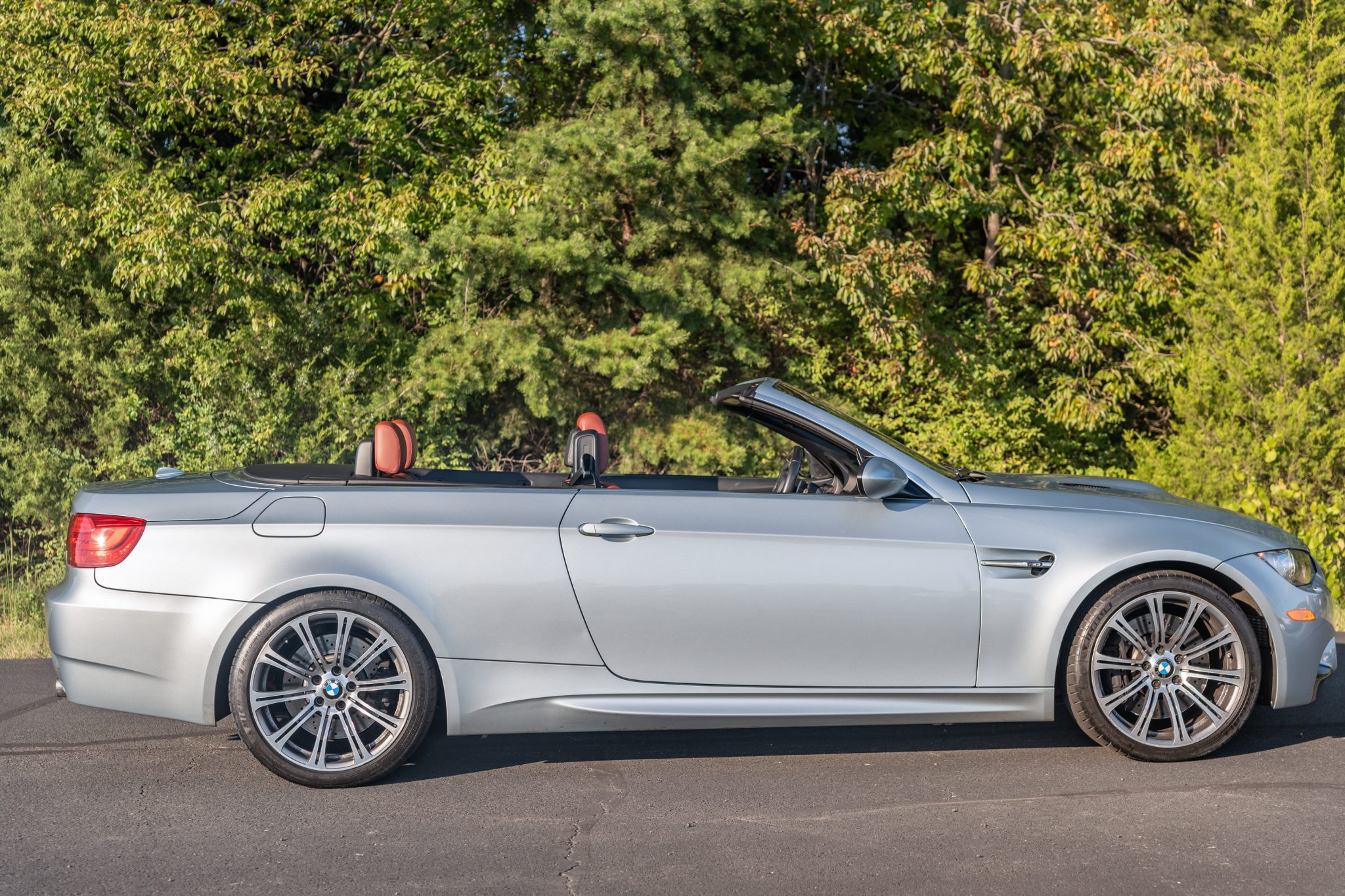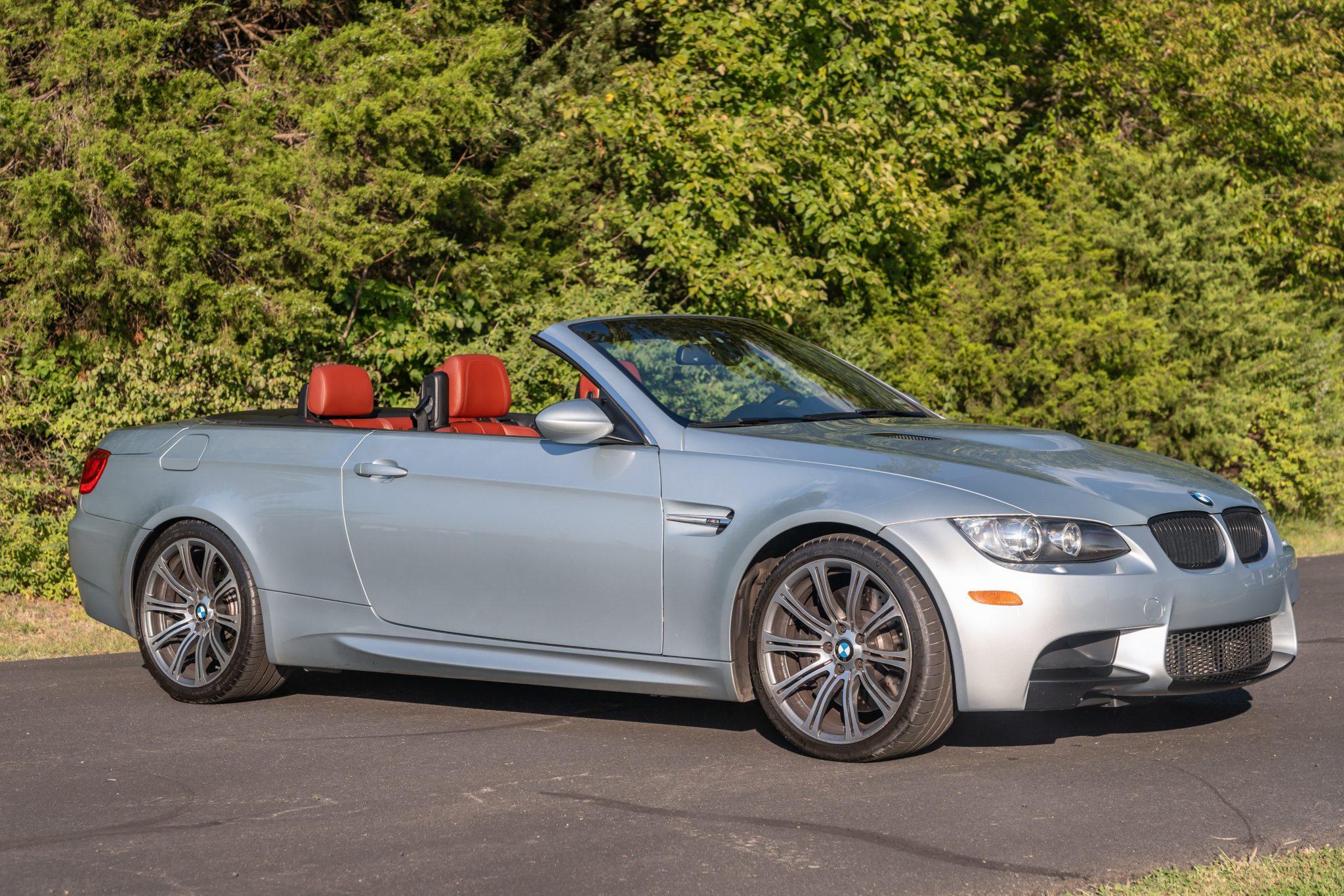 This 2013 BMW M3 convertible is finished in Silverstone Metallic over Fox Red Novillo extended leather and is powered by a 4.0-liter S65 V8 linked with a seven-speed dual-clutch transmission and a limited-slip differential. The seller purchased the vehicle in 2015 and has since added approximately 56k of the 80k indicated miles with registration in Virginia. Equipment includes the Premium and Cold Weather packages as well as an M Performance exhaust system, Electronic Damper Control, 19″ forged Style 220 wheels, a premium sound system, adaptive xenon headlights, a retractable hardtop, heated and powered front sport seats, and iDrive with navigation. Records indicate that the throttle actuators, valve covers, and spark plug tubes were replaced in June 2024. This E93 M3 is now offered with service records and a clean Virginia title in the seller’s name. The car is finished in Silverstone Metallic (A29) with a retractable hardtop and features adaptive xenon headlights with washers as well as rain-sensing wipers, rear Park Distance Control, and quadruple exhaust outlets. The Carfax report notes that the front of the car sustained “minor damage” in December 2017, and the seller attributes this to hitting debris while driving. They report that the front lower valance was repainted to address the damage. Clear paint protection film covers the front section of the nose. Forged 19″ Style 220 wheels are mounted with 245/35 front and 265/35 rear Michelin Pilot Sport 4S tires said to have been installed in June 2023. The car features Dynamic Stability Control (DSC) and Electronic Damper Control (EDC). Braking is handled by four-wheel vented and cross-drilled discs measuring 14.2″ and 13.8″ front and rear, respectively. A brake fluid flush was reportedly performed in July 2024. The heated power-adjustable front sport seats are upholstered in Fox Red Novillo leather that extends to the lower dashboard, center console, and door panels. Carbon Structure Leather trim accents the interior, and amenities include a premium sound system, driver seat position-memory settings, Comfort Access keyless entry, dual-zone automatic climate control, and iDrive with navigation. The seller notes wear on the driver’s seat and scratches on the front seatbacks. The multi-function leather-wrapped steering wheel features paddle shifters along with tri-color stitching and frames an M-branded tachometer, a 200-mph speedometer, a central information display, and gauges for oil temperature and fuel level. The digital odometer indicates 80k miles, approximately 56k of which were added under current ownership. The 4.0-liter S65 V8 features double-VANOS variable valve timing and was factory rated at 414 horsepower and 295 lb-ft of torque. Records indicate that the throttle actuators, valve covers, and spark plug tubes were replaced in June 2024 and the seller states that the oxygen sensors were also replaced in 2024. Power is sent to the rear wheels through a seven-speed M-DCT dual-clutch transmission and a Variable M Differential Lock. An M Performance exhaust system and a Turner Motorsport aluminum skidplate are installed. The Carfax report notes the aforementioned damage entry.