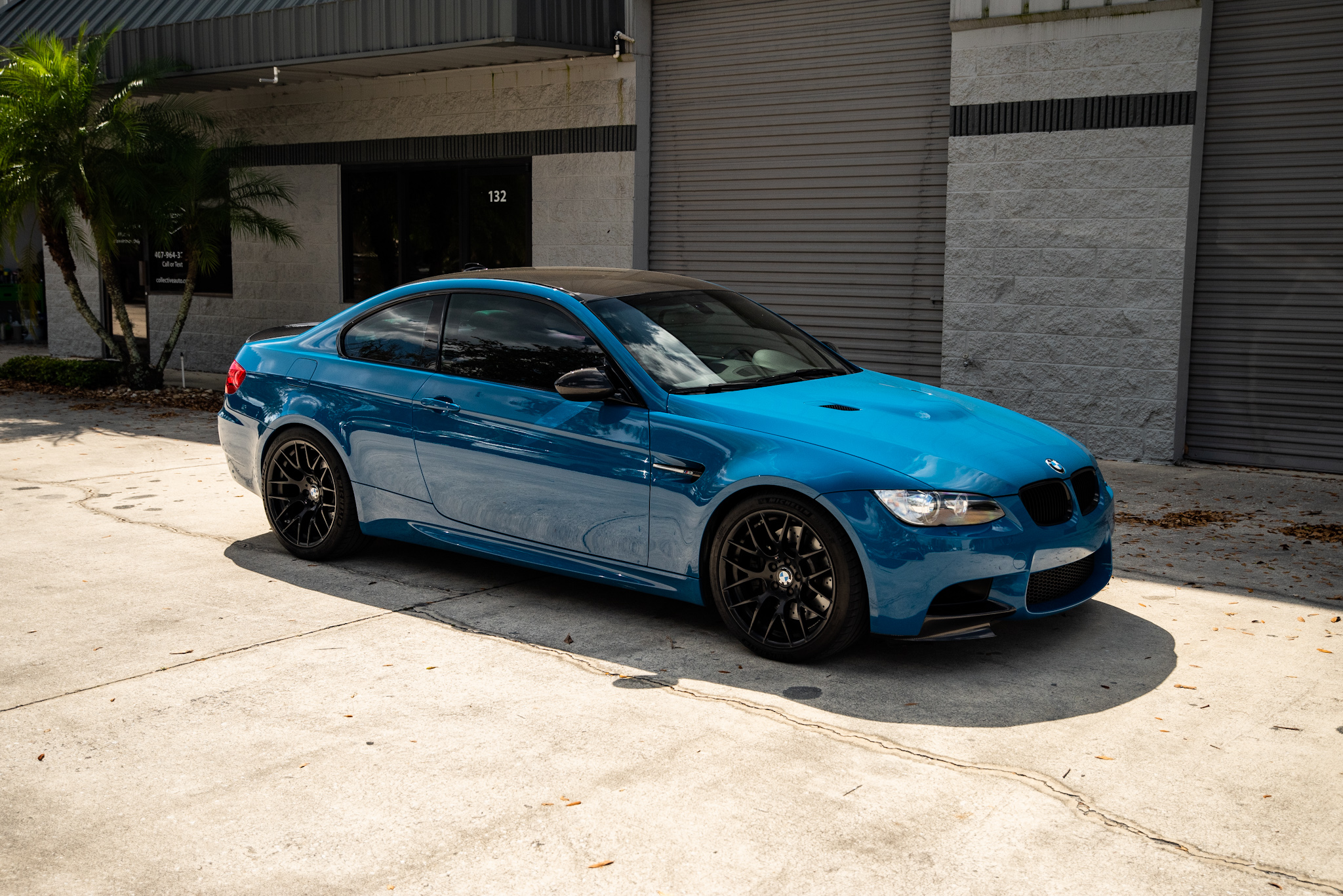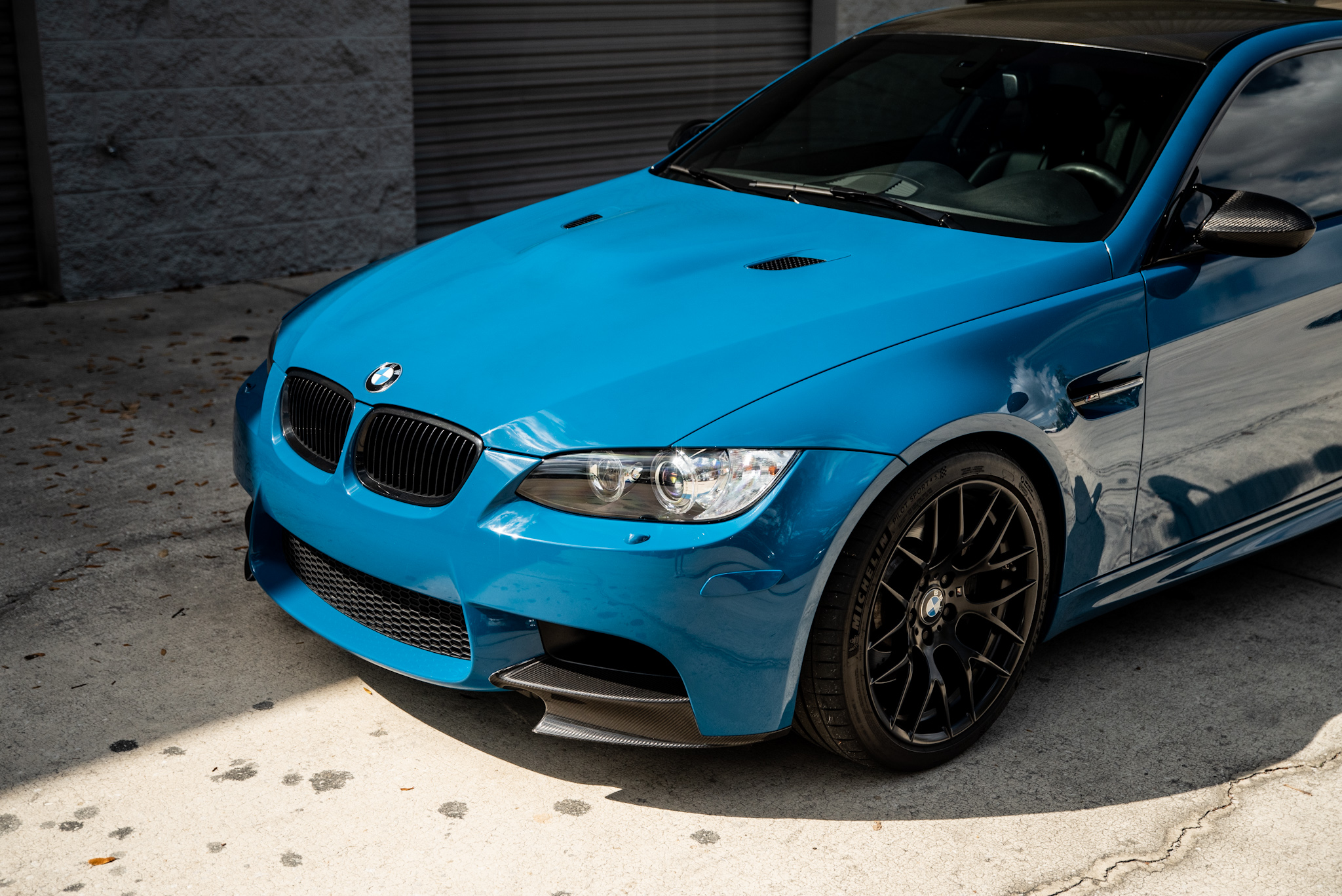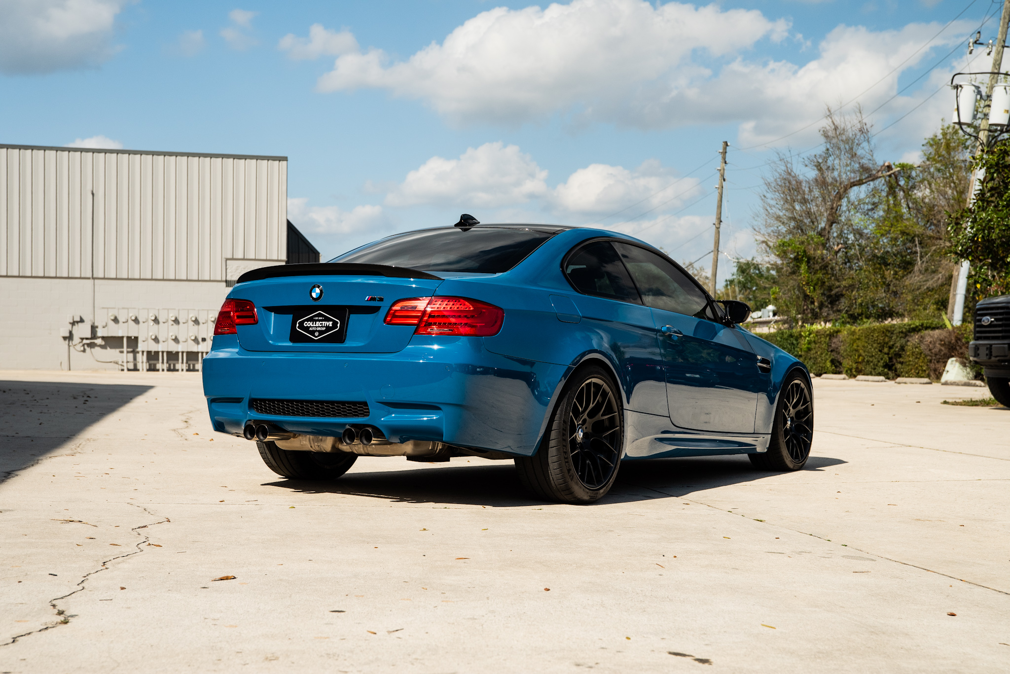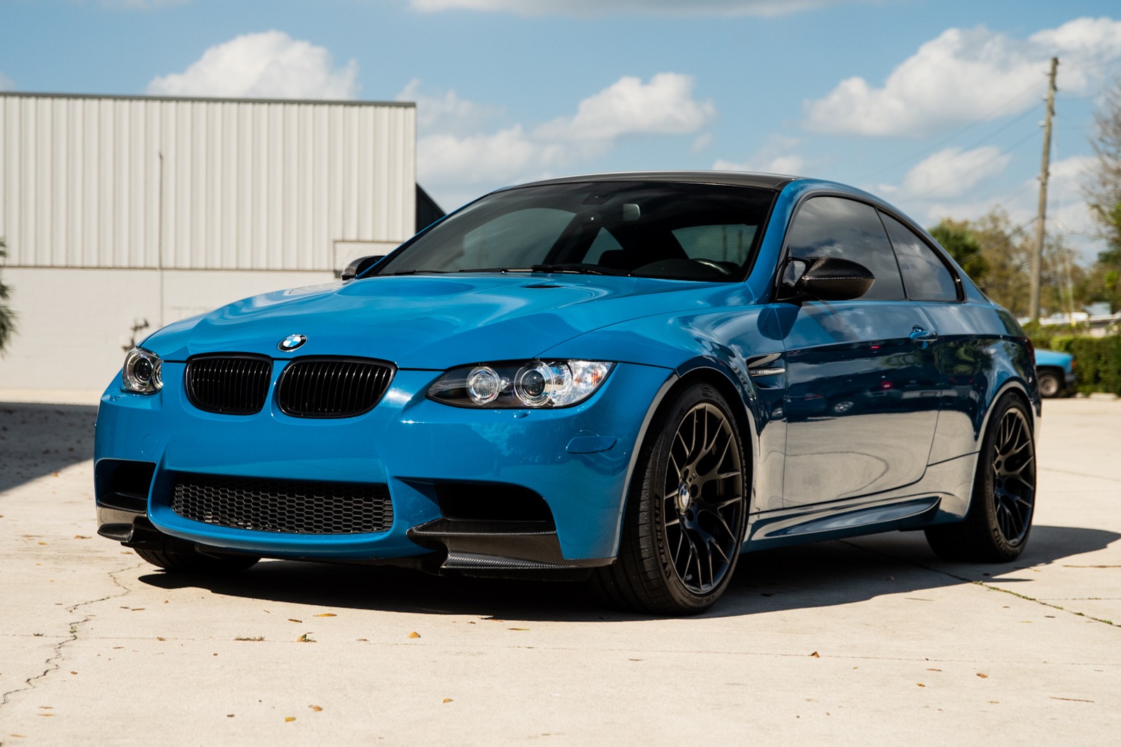 This 2013 BMW M3 coupe was specified in BMW Individual Laguna Seca Blue over black Novillo leather, and it was optioned with the Competition, Cold Weather, Premium, and Technology packages. Powered by a 4.0-liter V8 linked with a six-speed manual transmission and a limited-slip differential, the car is equipped with 19″ Style 359 wheels, M Performance exhaust, a carbon-fiber roof panel and aerodynamic bodywork, adaptive xenon headlights, rear parking sensors, Comfort Access, heated front seats, navigation, and an aftermarket short shifter. This E92 M3 was sold on BaT in March 2023 before it was acquired by the seller later that year, and it is now offered with spare parts, a clean Carfax report, and a clean New York title in the seller’s name. The car is finished in BMW Individual Laguna Seca Blue and features Shadowline trim and adaptive xenon headlights with washers as well as rain-sensing wipers, body-color front corner markers, rear Park Distance Control, quadruple M Performance exhaust outlets, and a carbon-fiber roof panel, front splitters, mirror caps, and trunk lid spoiler. Paint touch-ups were performed on the hood and front bumper cover under previous ownership, and the rear bumper has been refinished. The windshield and rear glass were replaced under current ownership, per the seller. There is a ding behind the left door, and close-up photos of paint imperfections are viewable in the gallery. Black-finished 19″ Style 359 wheels are mounted with 255/35 front and 275/35 rear Michelin Pilot Sport 4S tires showing date codes from 2017. Competition Package equipment includes a lowered ride height compared to the standard M3 as well as retuned Electronic Damping Control (EDC) and Dynamic Stability Control (DSC). Braking is handled by four-wheel vented and cross-drilled discs measuring 14.2″ and 13.8″ front and rear, respectively. The heated power-adjustable front sport seats are upholstered in black Novillo leather, and Carbon Structure Leather trim accents the dashboard and doors. A short shifter has been added, and amenities include Comfort Access keyless entry, iDrive with navigation, a BMW Individual audio system, a power rear sunshade, dual-zone automatic climate control, and cruise control. The multi-function leather-wrapped steering wheel features tri-color stitching and frames an M-branded tachometer, a 200-mph speedometer, a central information display, and gauges for oil temperature and fuel level. The digital odometer indicates 31k miles, approximately 1,200 of which were added under current ownership. The 4.0-liter S65 V8 features double-VANOS variable valve timing and was factory rated at 414 horsepower and 295 lb-ft of torque. An M Performance exhaust system was added under previous ownership. The throttle actuators were replaced in 2016 and a new muffler and spark plugs were installed in 2017. Power is sent to the rear wheels through a six-speed manual transmission and a Variable M Differential Lock. Additional underside photos are provided in the gallery below. An owner’s manual, two key fobs, and removed stock components are included in the sale. The Carfax report shows no accidents or other reported damage.