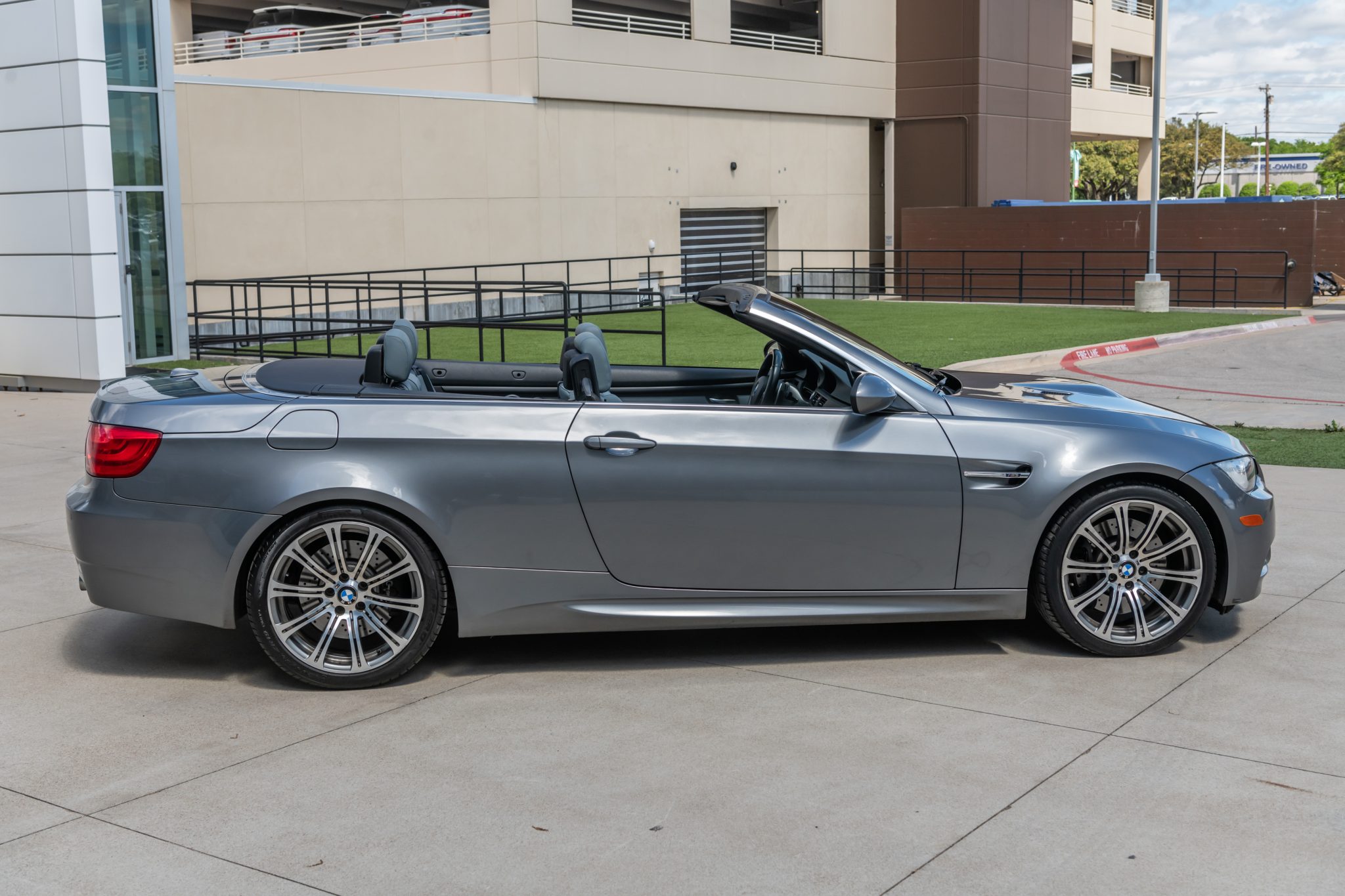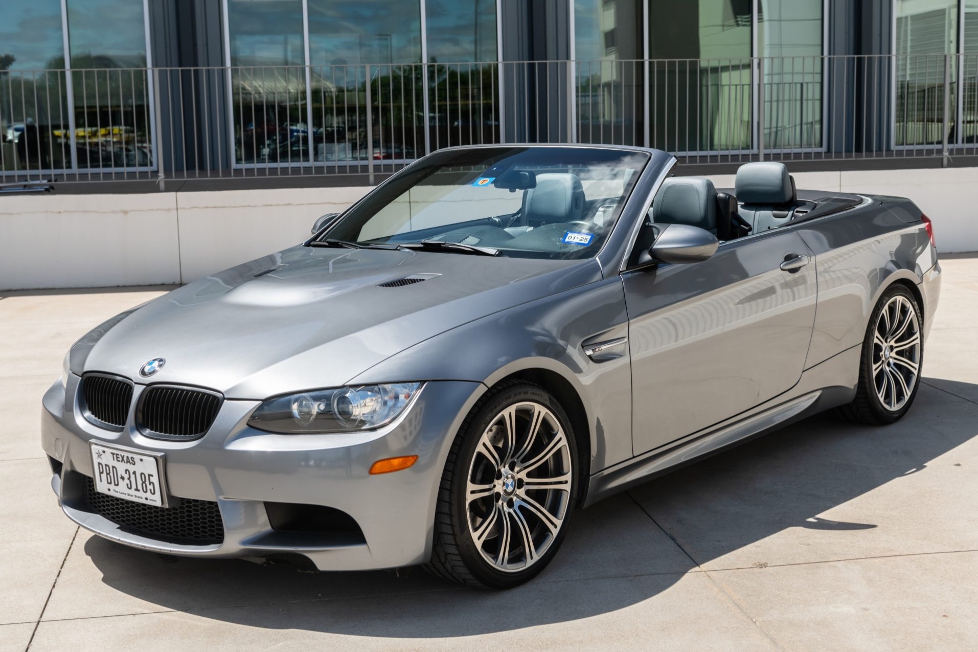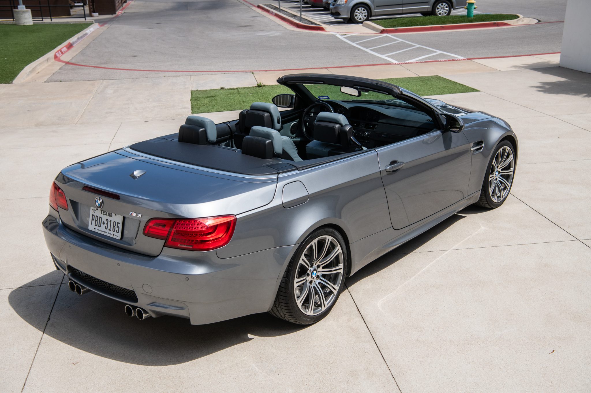 This 2013 BMW M3 convertible is finished in Space Gray Metallic over Palladium Silver Novillo leather and is powered by a 4.0-liter S65 V8 paired with a seven-speed dual-clutch transmission. The car spent time in Florida and Maryland before the seller’s 2020 purchase, and they have since added approximately 4k of the under 67k indicated miles. Equipment includes 19″ forged Style 220 wheels, a limited-slip differential, adaptive xenon headlights, a retractable hardtop, rear parking sensors, heated front sport seats, and dual-zone automatic climate control. This E93 M3 is now offered with service records and a clean Texas title in the seller’s name. The car is finished in Space Gray Metallic and features a retractable hardtop and adaptive xenon headlights as well as rain-sensing wipers, rear parking sensors, and quadruple exhaust outlets. The Carfax report notes that the front of the vehicle sustained “minor damage” in December 2013 with no additional information provided. The front bumper has scrapes on the middle and passenger side, and the seller notes chips and scratches around the body. Forged 19″ Style 220 wheels are mounted with 245/35 front and 265/35 rear Pirelli P Zero tires that show 2023 and 2017 date codes, respectively. The car features Dynamic Stability Control (DSC) and M Drive. Braking is handled by four-wheel vented and cross-drilled discs measuring 14.2″ and 13.8″ front and rear, respectively. The heated power-adjustable front sport seats are upholstered in Palladium Silver Novillo leather, and Carbon Structure Leather trim accents the dashboard and doors. Amenities include iDrive with navigation as well as Comfort Access, a CD stereo, dual-zone automatic climate control, and cruise control. The multi-function leather-wrapped steering wheel features paddle shifters along with tri-color stitching and frames an M-branded tachometer, a 200-mph speedometer, a central information display, and gauges for oil temperature and fuel level. The digital odometer indicates under 67k miles, approximately 4k of which were added under current ownership. The 4.0-liter S65 V8 features double-VANOS variable valve timing and was factory rated at 414 horsepower and 295 lb-ft of torque. The thermostat and battery were replaced in April 2023. Power is sent to the rear wheels through a seven-speed M-DCT dual-clutch transmission and a Variable M Differential Lock. The Carfax report notes the aforementioned damage entry.