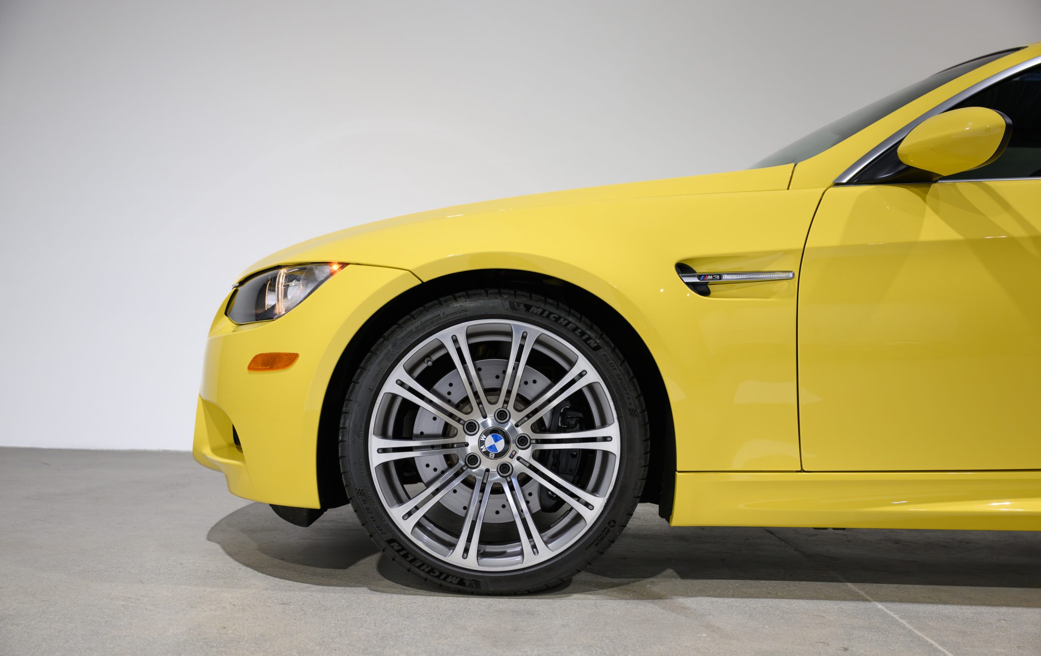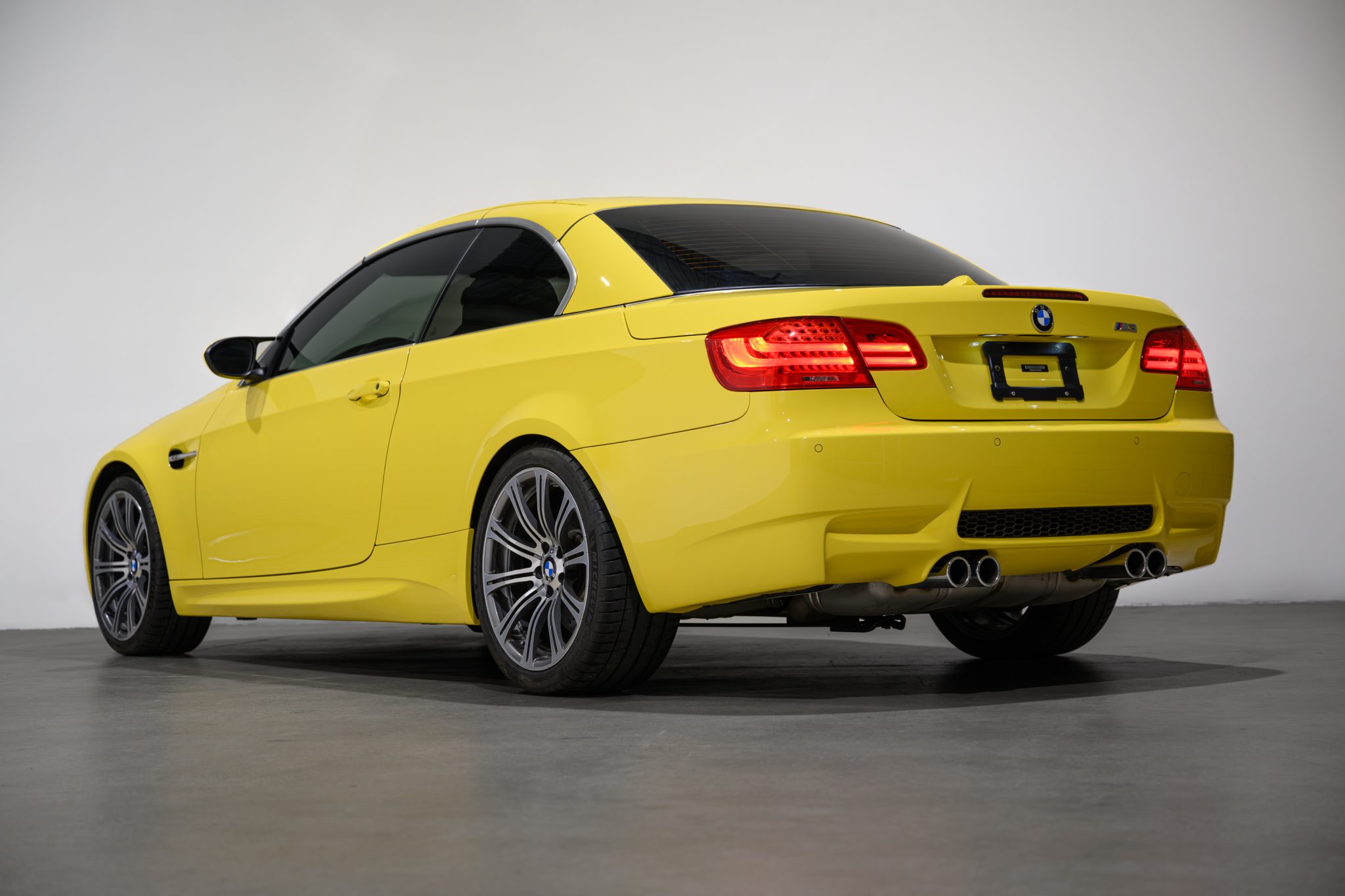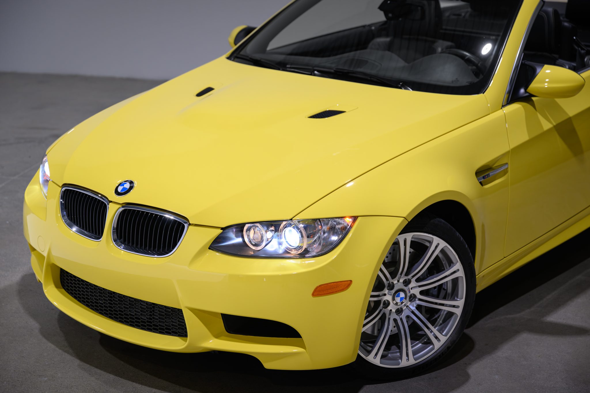 This 2013 BMW M3 convertible is finished in BMW Individual Dakar Yellow over black Novillo leather with Lemon Yellow stitching. It remained with its original owner until 2022 and now has 14k miles. Power is provided by a 4.0-liter V8 paired with a seven-speed dual-clutch transmission, and equipment includes the Premium Package, Electronic Damping Control, Enhanced Premium Sound, 19″ forged Style 220 wheels, a limited-slip differential, a retractable hardtop, rear parking sensors, and heated front sport seats. Acquired by the selling dealer in 2022, this E93 M3 is now offered with window stickers, a luggage set, manufacturer’s literature, service records, a clean Carfax report, and a clean California title. BMW Individual Dakar Yellow (337) paint was a $5,000 option, and the car features a retractable hardtop, adaptive xenon headlights, rain-sensing wipers, power-folding mirrors, rear parking sensors, and quadruple exhaust outlets. Forged 19″ Style 220 wheels are mounted with Michelin Pilot Sport 4S tires measuring 245/35 up front and 265/35 out back. The left-front wheel has curb marks. The car features Dynamic Stability Control (DSC) and Electronic Damping Control (EDC). Braking is handled by four-wheel vented and cross-drilled discs measuring 14.2″ and 13.8″ front and rear, respectively. The heated power-adjustable front sport seats are upholstered in black Novillo leather with Lemon Yellow stitching, a $2,500 configuration. Carbon Structure Leather trim accents the dashboard and doors, and amenities include iDrive with navigation as well as Enhanced Premium Sound, a CD stereo, Comfort Access keyless entry, dual-zone automatic climate control, and cruise control. The multi-function leather-wrapped steering wheel features paddle shifters along with tri-color stitching and frames an M-branded tachometer, a 200-mph speedometer, a central information display, and gauges for oil temperature and fuel level. The digital odometer indicates 14k miles. The 4.0-liter S65 V8 features double-VANOS variable valve timing and was factory rated at 414 horsepower and 295 lb-ft of torque. Power is sent to the rear wheels through a seven-speed M-DCT dual-clutch transmission and a Variable M Differential Lock. The left-front underbody panel was replaced in October 2022. The window stickers note initial delivery to BMW North Scottsdale in Phoenix, Arizona, and list factory equipment, colors, options, and a total suggested retail price of $89,695. A luggage set, spare kidney grilles, and service records are also included in the sale. The Carfax report is free of accidents or other reported damage.