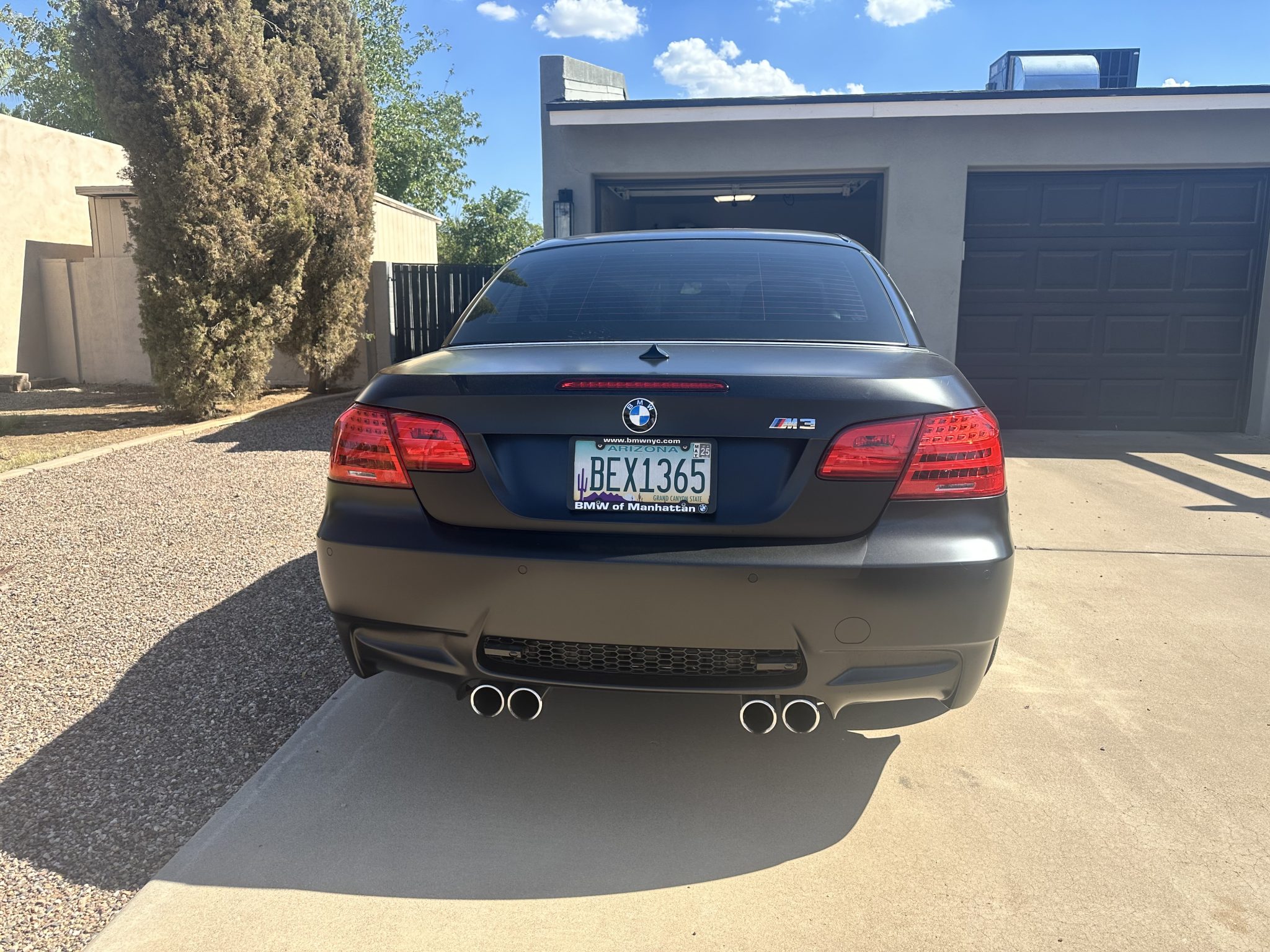 This 2013 BMW M3 convertible was acquired new by the current owner in New York and was relocated to Arizona. It is finished in Frozen Black over Fox Red and black Novillo leather and is powered by a 4.0-liter V8 mated to a seven-speed dual-clutch transmission and a limited-slip differential. Equipment includes the Cold Weather Package, the Premium Package, 19″ Style 220 wheels, xenon headlights, a retractable hardtop, rear parking sensors, heated front seats, dual-zone automatic climate control, Comfort Access, and navigation. This E93 M3 has 20k miles and is now offered by the seller on behalf of the owner with a window sticker, service records, a clean Carfax report, and a clean Arizona title in the owner’s name. The car is finished in Frozen Black and features a retractable hardtop and adaptive xenon headlights as well as rain-sensing wipers, tinted windows, rear parking sensors, and quadruple exhaust outlets. Forged 19″ Style 220 wheels are mounted with Pirelli P Zero tires. The car features Dynamic Stability Control with an M Dynamic Mode. Braking is handled by four-wheel vented and cross-drilled discs measuring 14.2″ and 13.8″ front and rear, respectively. The brake fluid was flushed in December 2023. The heated power-adjustable front sport seats are upholstered in Fox Red and black Novillo leather, and Carbon Structure Leather trim accents the dashboard and doors. Amenities include a CD stereo, dual-zone automatic climate control, Comfort Access, navigation, ambient lighting, Enhanced Premium Sound, and cruise control. The multi-function leather-wrapped steering wheel features paddle shifters along with tri-color stitching and frames an M-branded tachometer, a 200-mph speedometer, a central information display, and gauges for oil temperature and fuel level. The digital odometer indicates 20k miles. The 4.0-liter S65 V8 features double-VANOS variable valve timing and was factory rated at 414 horsepower and 295 lb-ft of torque. Service in December 2023 included changing the oil and replacing the thermostat and battery. Power is sent to the rear wheels through a seven-speed M-DCT dual-clutch transmission and a Variable M Differential Lock. Additional underside photos are provided in the gallery. The window sticker lists initial delivery to BMW of Manhattan in New York and shows factory colors, equipment, and a total suggested retail price of $86,825. The Carfax report shows no accidents or other damage.