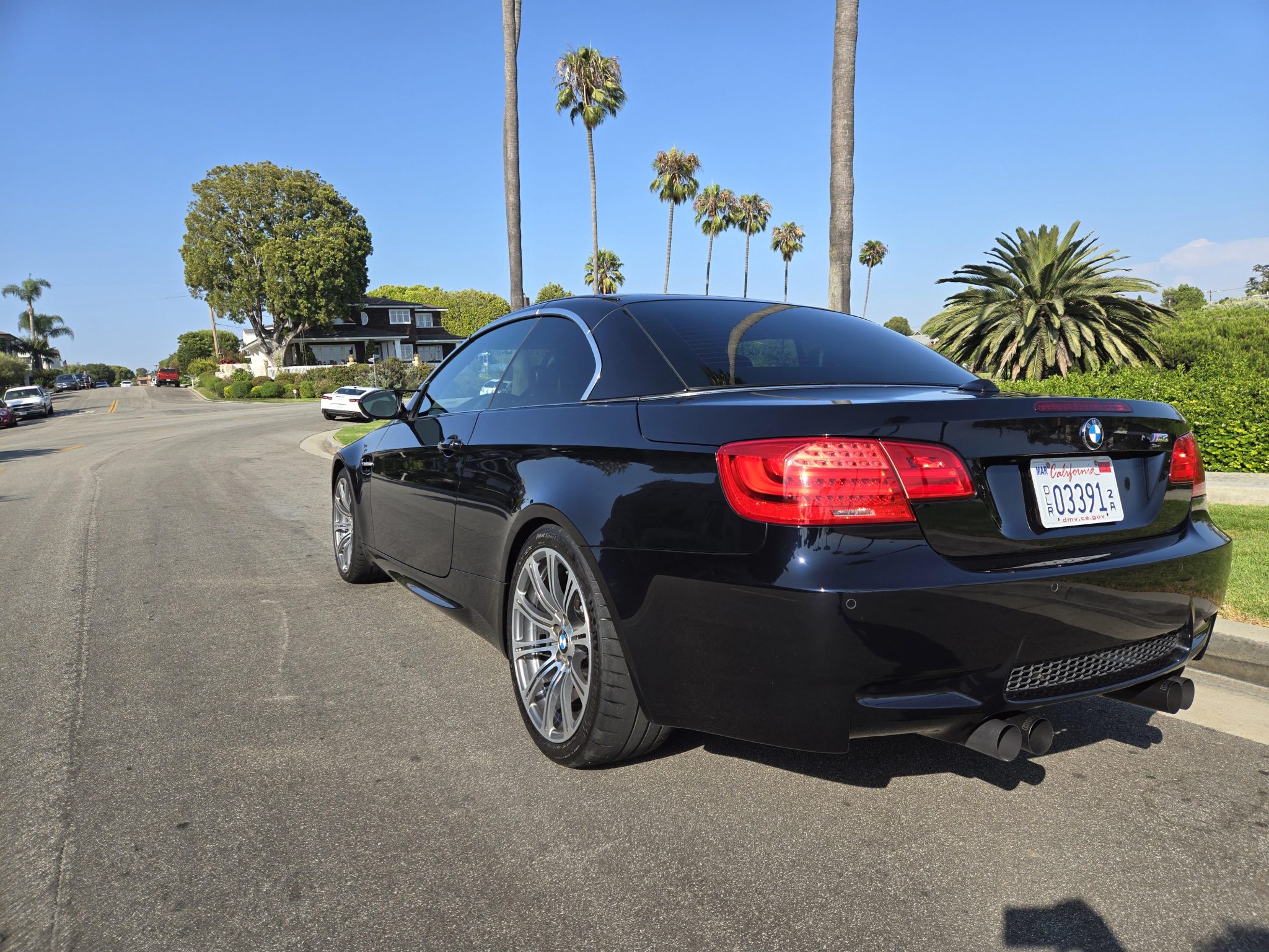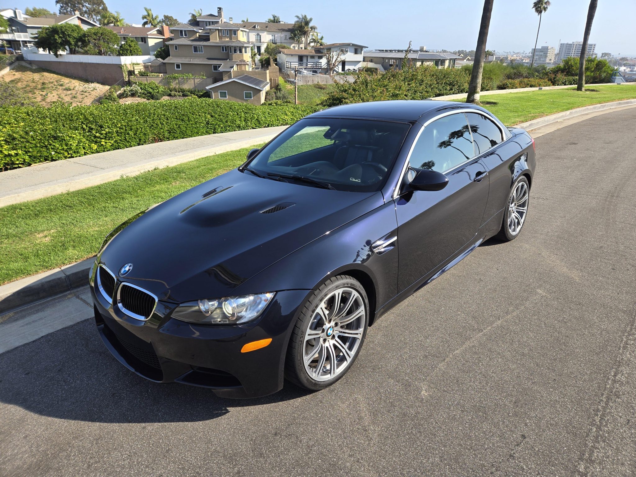 This 2013 BMW M3 convertible is a Jerez Black Metallic-finished example that has 42k miles and was optioned from the factory with the Premium Package. Powered by a 4.0-liter V8 paired with a seven-speed dual-clutch transmission, the car has a Dinan exhaust system, Palladium Silver and black Novillo leather upholstery, 19″ forged Style 220 wheels, a limited-slip differential, adaptive xenon headlights, a retractable hardtop, rear parking sensors, heated power-adjustable front seats, iDrive with navigation, dual-zone automatic climate control, and cruise control. This E93 M3 was acquired by the selling dealer in 2024 and is now offered with a clean Carfax report and a clean California title. The car is finished in Jerez Black Metallic and has a retractable hardtop and adaptive xenon headlights as well as rain-sensing wipers, rear parking sensors, and quadruple exhaust outlets. Forged 19″ Style 220 wheels are mounted with 245/35 front and 265/35 rear Michelin Pilot Sport Cup 2 tires showing 2021 date codes. The car features Dynamic Stability Control (DSC), and braking is handled by four-wheel vented and cross-drilled discs measuring 14.2″ and 13.8″ front and rear, respectively. The heated power-adjustable front sport seats are upholstered in Palladium Silver and black Novillo leather, and Carbon Structure Leather trim accents the dashboard and doors. Appointments include iDrive with navigation, Comfort Access keyless entry, a CD stereo, dual-zone automatic climate control, M3-branded floor mats, and cruise control. The driver’s seat outer bolster is worn. The multi-function leather-wrapped steering wheel features paddle shifters along with tri-color stitching and frames an M-branded tachometer, a 200-mph speedometer, a central information display, and gauges for oil temperature and fuel level. The digital odometer indicates 42k miles, approximately 1,200 of which were added under current ownership. The 4.0-liter S65 V8 features double-VANOS variable valve timing and was factory rated at 414 horsepower and 295 lb-ft of torque. The car passed an emissions inspection in August 2023, and an oil change was performed in May 2024. Power is sent to the rear wheels through a seven-speed M-DCT dual-clutch transmission and a Variable M Differential Lock. A Dinan exhaust system has been fitted, and additional photos of the underside are provided in the gallery. The Carfax report is free of accidents or other reported damage.