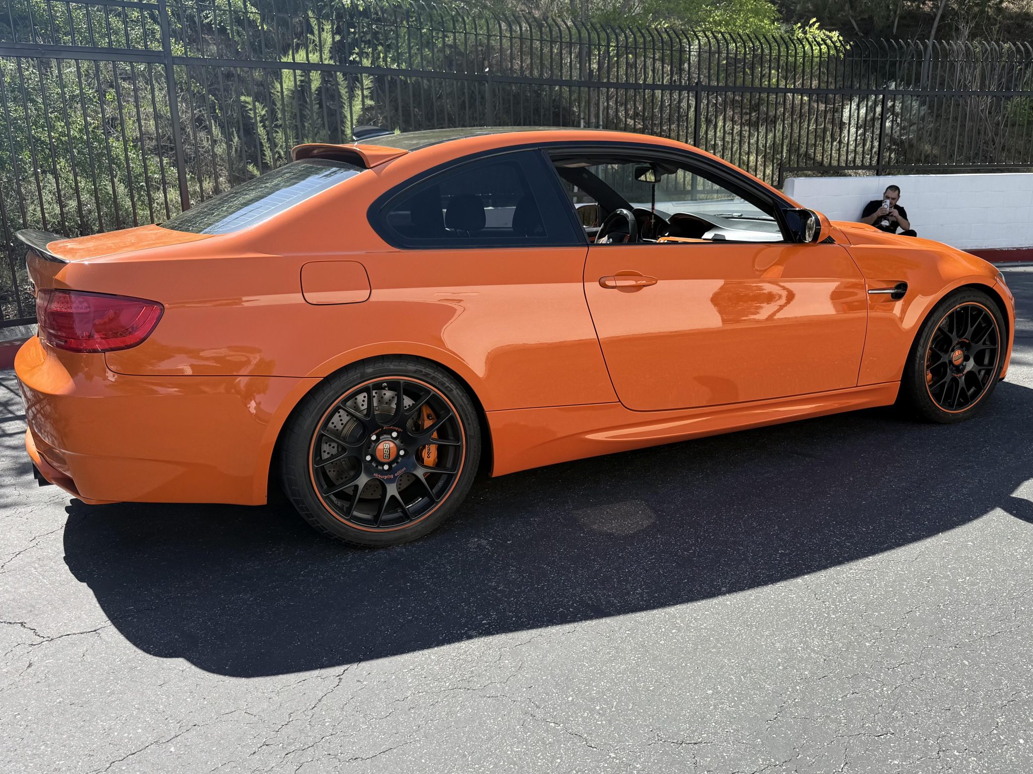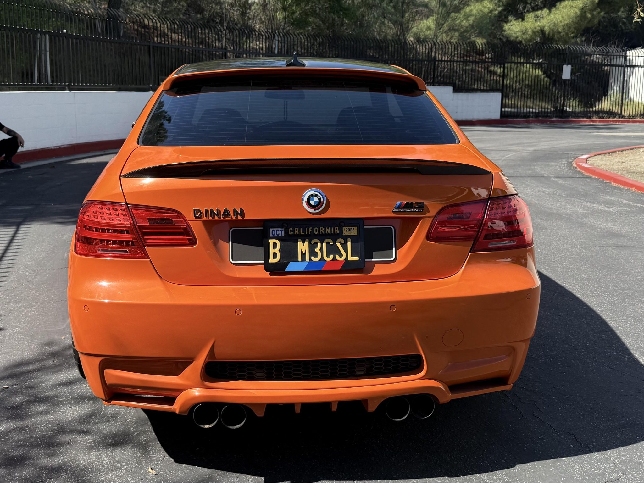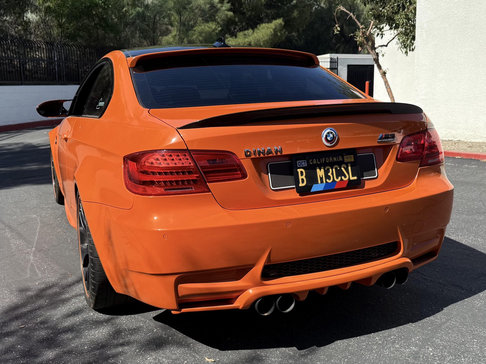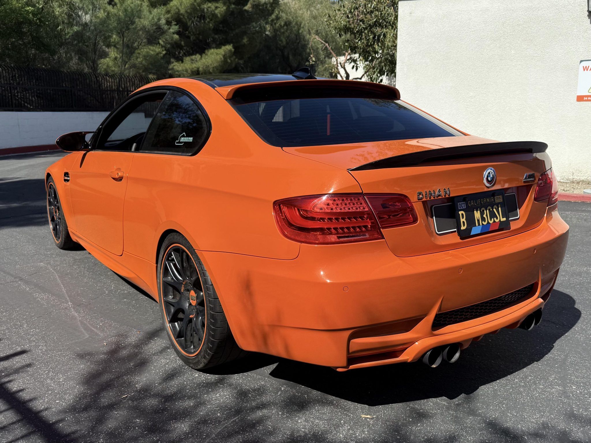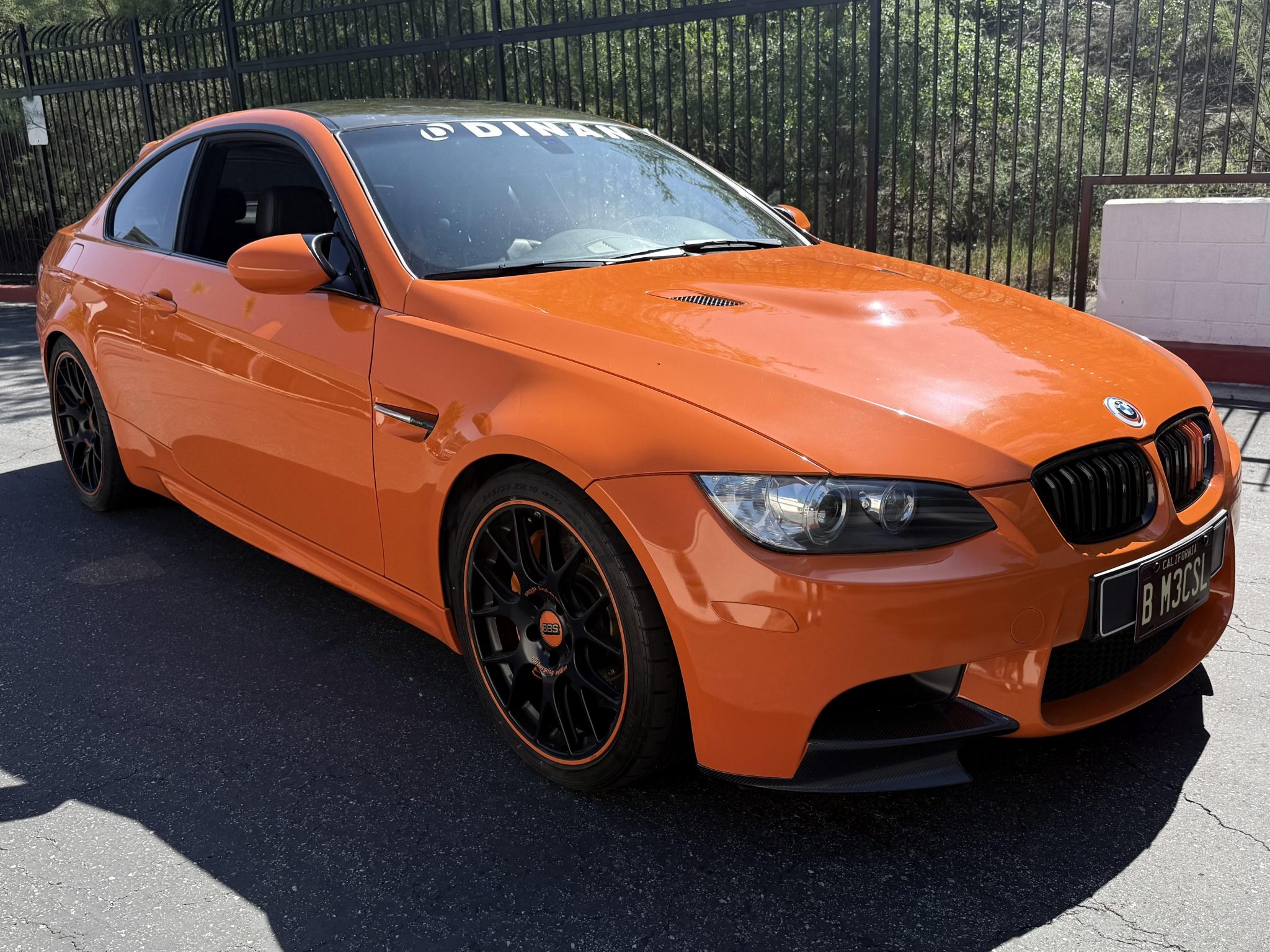 This 2013 BMW M3 coupe is one of 200 in the Lime Rock Park Edition, which was produced for a single model year. It has been fitted with a Hamann roof spoiler, a body-color rear diffuser and interior trim, 19″ BBS multi-spoke wheels, Brembo brake calipers, and Dinan modifications consisting of an ECU tune, badging, carbon-fiber intake, exhaust system, and front strut braces. It is powered by a 4.0-liter V8 paired with a seven-speed dual-clutch transmission and is finished in Fire Orange over black and orange leather upholstery. The car is further equipped with the Competition Package, a limited-slip differential, adaptive xenon headlights, rear Park Distance Control, heated front seats, iDrive with navigation, dual-zone automatic climate control, and cruise control. This E92 M3 was purchased by the owner in 2017 and is now offered by the seller on behalf of the owner with partial service records, an accident-free Carfax report, and a clean California title in the current owner’s name. The car is finished in Fire Orange with a body-color rear diffuser, and exterior details include Shadowline trim and adaptive xenon headlights as well as rain-sensing wipers, power-folding side mirrors, rear Park Distance Control, a Hamann roof spoiler, Dinan badging, quadruple exhaust outlets, orange grille inserts, 50th Anniversary-style badges, and a carbon-fiber roof panel, front winglets, and trunk lid spoiler. Black-finished 19″ BBS multi-spoke wheels feature orange accents and are mounted with Pirelli tires. Competition Package equipment includes a lowered ride height compared to the standard M3 as well as retuned Electronic Damping Control (EDC) and Dynamic Stability Control (DSC). Braking is handled by orange Brembo calipers over cross-drilled rotors, and Dinan front strut braces have been fitted. The heated power-adjustable front sport seats are upholstered in black and orange leather, while orange trim accents the dashboard, center console, and door panels. Amenities include driver seat position-memory settings, iDrive with navigation, Comfort Access keyless entry, a CD stereo, a power rear sunshade, dual-zone automatic climate control, cruise control, and an Alcantara shift boot and headliner. The three-spoke Alcantara-wrapped steering wheel features paddle shifters and a digital display, and it frames an M-branded tachometer, a 200-mph speedometer, a central information display, and gauges for oil temperature and fuel level. The digital odometer shows 58k miles, approximately 30k of which were added under current ownership. A mileage inconsistency is listed in an October 2024 entry of the Carfax report, which states that it may be a result of a “clerical error.” A warning light remains illuminated. The 4.0-liter S65 V8 features double-VANOS variable valve timing and has been fitted with a Dinan ECU tune and a carbon-fiber intake. According to the seller, the car is due for an oil change. Power is sent to the rear wheels through a seven-speed M-DCT dual-clutch transmission and a Variable M Differential Lock. A Dinan exhaust system has been installed. The Carfax report shows the aforementioned mileage inconsistency. The car most recently passed a California emissions test in September 2023, however, it has been fitted with various exhaust, intake, and ECU modifications.