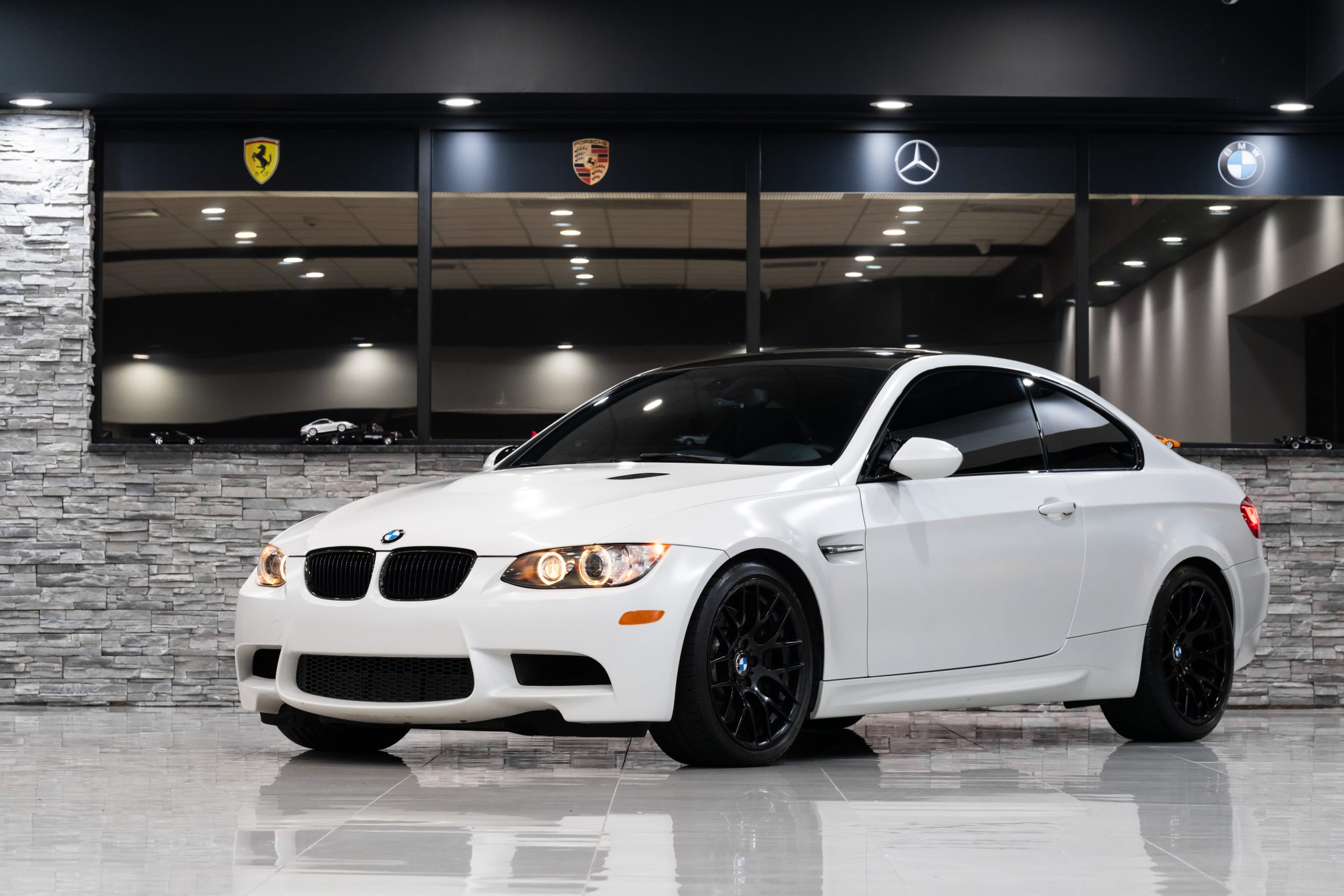 This 2013 BMW M3 coupe is one of 150 Frozen Edition examples produced for the US market and was optioned with the Competition and Premium packages. It is powered by a 4.0-liter V8 paired with a seven-speed dual-clutch transmission and is finished in Frozen White Metallic over black Novillo leather upholstery. The car has 22k miles and is further equipped with 19″ Style 359 wheels, a Meisterschaft GT exhaust system, a limited-slip differential, adaptive xenon headlights, a carbon-fiber roof panel, rear Park Distance Control, heated power-adjustable front seats, iDrive with navigation, dual-zone automatic climate control, and cruise control. This E92 M3 was acquired by the selling dealer in 2024 and is now offered at no reserve with the owner’s manual, a Carfax report, and a clean New Jersey title. The car is finished in Frozen White Metallic and has Shadowline trim and adaptive xenon headlights as well as rain-sensing wipers, power-folding side mirrors, a carbon-fiber roof panel, a trunk lid spoiler, rear Park Distance Control, black kidney grilles, and quadruple exhaust outlets. Damage to the front is listed in a December 2017 entry of the Carfax report. Black-finished 19″ Style 359 wheels are mounted with Michelin tires. Competition Package equipment includes a lowered ride height compared to the standard M3 as well as retuned Electronic Damping Control (EDC) and Dynamic Stability Control (DSC). Braking is handled by four-wheel vented and cross-drilled discs measuring 14.2″ and 13.8″ front and rear, respectively. The heated power-adjustable front sport seats are upholstered in black Novillo leather, and Carbon Structure Leather trim accents the dashboard. Appointments include driver seat position-memory settings, iDrive with navigation, Comfort Access keyless entry, color-contrasting stitching, a CD stereo, a power rear sunshade, dual-zone automatic climate control, and cruise control. The multi-function leather-wrapped steering wheel features paddle shifters along with tri-color stitching and frames an M-branded tachometer, a 200-mph speedometer, a central information display, and gauges for oil temperature and fuel level. The digital odometer indicates 22k miles. The 4.0-liter S65 V8 features double-VANOS variable valve timing and was factory rated at 414 horsepower and 295 lb-ft of torque. An oil change was performed in preparation for the sale. Power is sent to the rear wheels through a seven-speed M-DCT dual-clutch transmission and a Variable M Differential Lock. A Meisterschaft GT exhaust system has been fitted, and additional photos of the underside are provided in the gallery. The Carfax report shows the aforementioned damage.