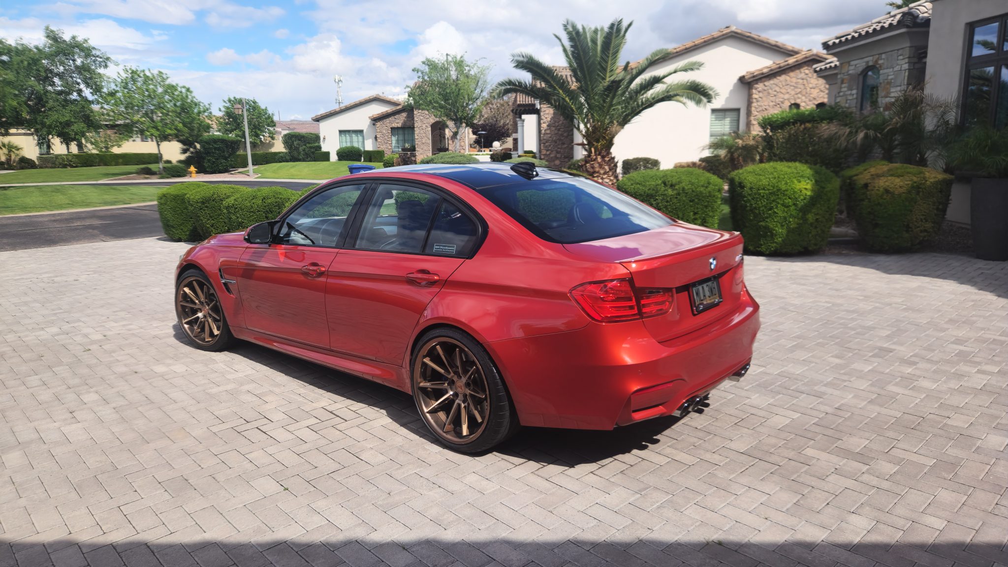 This 2015 BMW M3 is powered by a twin-turbocharged 3.0-liter S55 inline-six paired with a seven-speed M DCT dual-clutch transmission and is finished in Sakhir Orange Metallic over black extended Merino leather. Equipment includes the Executive and Lighting packages as well as Driver Assistance Plus, an Active M differential, 20″ Ferrada wheels, LED headlights, heated front and rear seats, a heated steering wheel, a head-up display, a Harman Kardon sound system, and side-, rear-, and top-view cameras. The car has spent time in Washington state and Arizona where the seller purchased it from a friend in 2021, and they have since added approximately 7k of the 20k indicated miles. This F80 M3 is now offered with a copy of the window sticker, a clean Carfax report, and a clean Arizona title in the seller’s name. The F80 M3 featured widened bodywork along with revised fender vents and bumpers compared to the standard 3 series. This example is finished in Sakhir Orange Metallic with Shadowline trim and features a carbon-fiber roof, LED headlights, Park Distance Control, a rear decklid spoiler, and a sport exhaust system with quad exhaust tips. Clear paint protection film was applied in 2015. Bronze-finished 20″ Ferrada Concave Madness CM2 wheels are mounted with Michelin Pilot Super Sport tires. Multiple wheels have blemishes. The car was optioned with an adaptive M suspension, and M Dynamic Mode with Dynamic Stability Control was equipped as standard. Braking is handled by blue-finished M-branded calipers fitted over cross-drilled and ventilated rotors at all four corners The cabin features seating surfaces upholstered in black Merino leather along with carbon-fiber trim on the dashboard and center console. Additional appointments include heated power-adjustable front sport seats, a Harman Kardon surround-sound system, heated rear seats, a back-up camera, a head-up display, Comfort Access keyless entry, dual-zone automatic climate control, cruise control, and iDrive infotainment with navigation. Driver Assistance Plus added active blind-spot detection, Active Driving Assistant, and side and top-view cameras. The heated leather-wrapped multifunction steering wheel features paddle shifters and frames a 200-mph speedometer, an 8,500-rpm tachometer, and gauges for oil temperature and fuel level. The digital odometer indicates 20k miles, approximately 7k of which were added under current ownership. The twin-turbocharged 3.0-liter S55 inline-six was factory rated at 425 horsepower and 406 lb-ft of torque. Power is sent to the rear wheels through a seven-speed M DCT dual-clutch transmission and an electronically controlled Active M differential. A copy of the window sticker notes initial delivery to BMW Northwest in Tacoma, Washington, and lists factory equipment, colors, options, and a total price of $73,785. The Carfax report is free of accidents or other reported damage.
