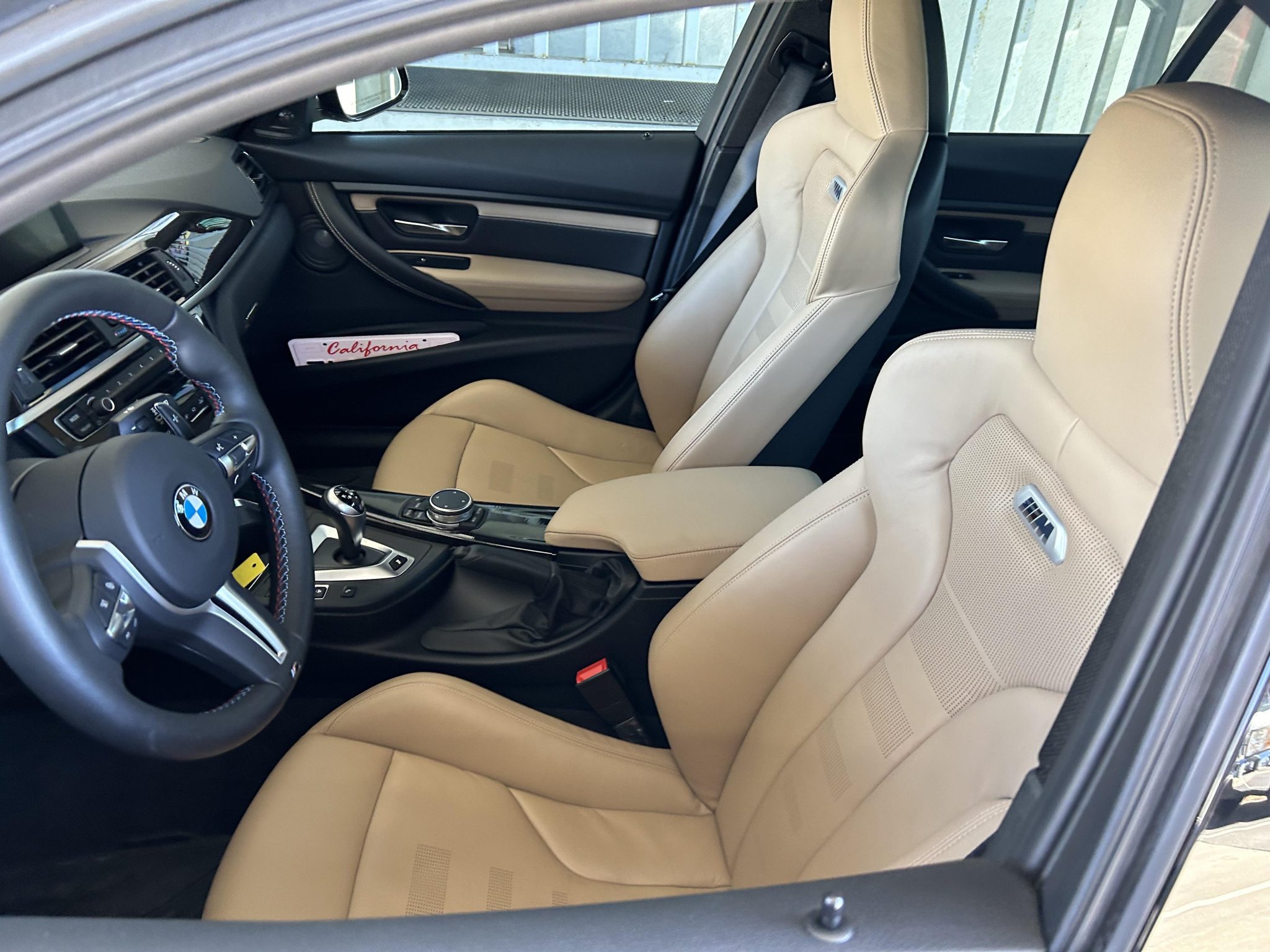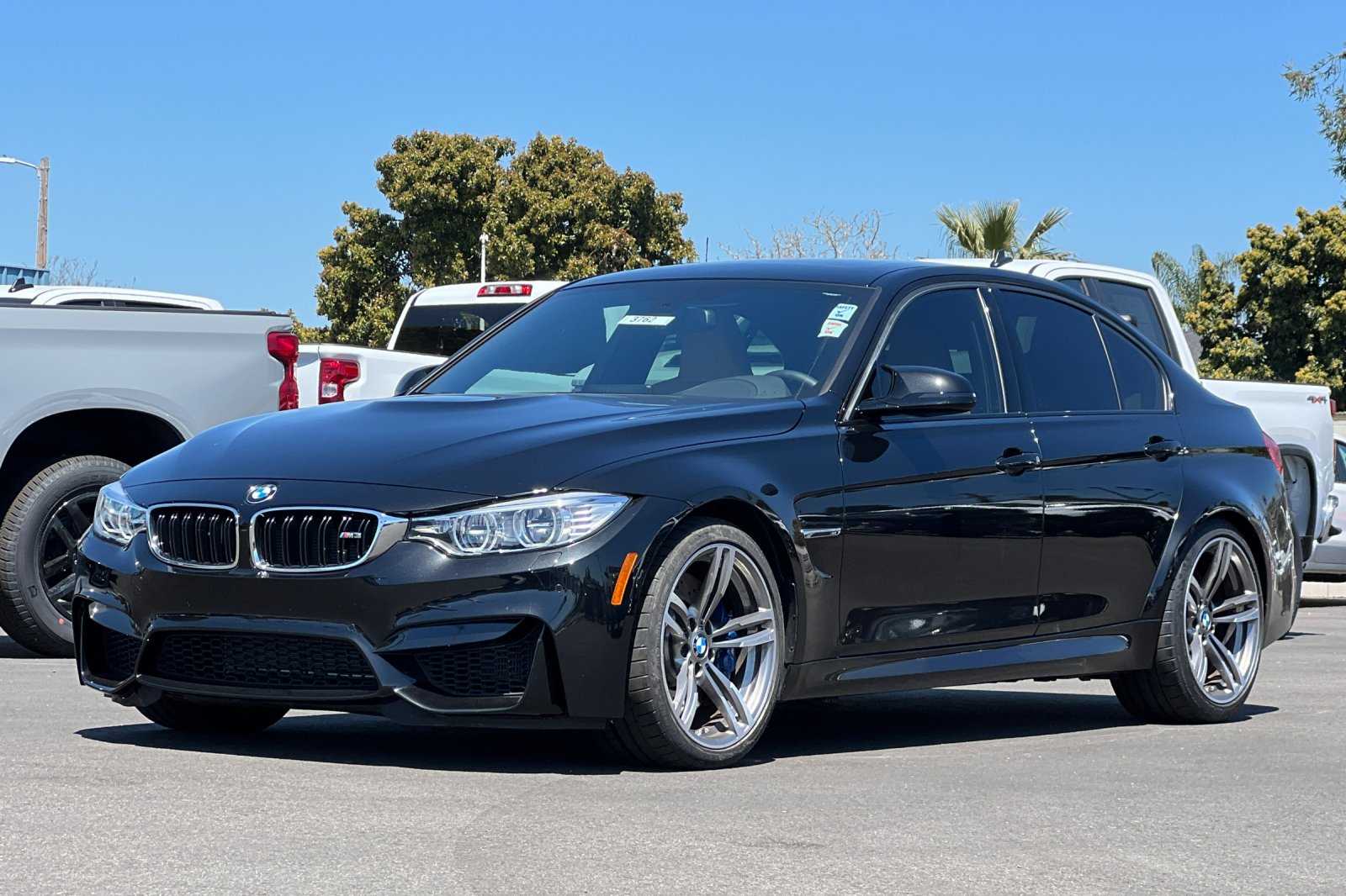 This 2015 BMW M3 sedan has 1,400 miles and was optioned with the Lighting and Executive packages, the latter of which added a heated steering wheel, Comfort Access, a backup camera, headlight washers, Park Distance Control, and a head-up display. It is powered by a twin-turbocharged 3.0-liter S55 inline-six paired with a seven-speed M DCT dual-clutch transmission and is finished in Black Sapphire Metallic over Sonoma Beige leather upholstery. The car has an Active M differential, 19″ Style 437M alloy wheels, adaptive LED headlights, a sunroof, heated front and rear seats, a Harman Kardon sound system, and navigation. Acquired by the selling dealer in 2024, this F80 M3 is now offered with a window sticker, a clean Carfax report, and a clean California title. The F80 M3 featured widened bodywork along with revised fender vents and bumpers compared to the standard 3 series. This example is finished in Black Sapphire Metallic with Shadowline trim and has adaptive LED headlights with washers, a sunroof, Park Distance Control, a rear decklid spoiler, and a sport exhaust system with quad exhaust tips. The 19″ Style 437M alloy wheels are mounted with 255/35 front and 275/35 rear Michelin Pilot Super Sport tires showing 2023 date codes. The car is equipped with an Adaptive M suspension, M Dynamic Mode, and Dynamic Stability Control. Braking is handled by blue-finished M-branded calipers fitted over cross-drilled and ventilated rotors at all four corners. The heated power-adjustable front seats are trimmed in Sonoma Beige leather, while wood trim accents the cabin. Additional appointments include heated rear seats, a backup camera, a head-up display, Comfort Access, a Harman Kardon sound system, dual-zone automatic climate control, cruise control, and iDrive infotainment with navigation. The heated leather-wrapped multifunction steering wheel features paddle shifters and frames a 200-mph speedometer, an 8,500-rpm tachometer, and gauges for oil temperature and fuel level. The digital odometer indicates 1,400 miles. The twin-turbocharged 3.0-liter S55 inline-six was factory rated at 425 horsepower and 406 lb-ft of torque. The car passed an emissions inspection in May 2023, and an oil change was performed in March 2024. Power is sent to the rear wheels through a seven-speed M DCT dual-clutch transmission and an electronically controlled Active M differential. Additional photos of the underside are presented in the gallery. The window sticker lists initial delivery to Coast BMW of San Luis Obispo, California, along with factory colors, equipment, options, and a total suggested retail price of $76,175. The Carfax report is free of accidents or other reported damage.