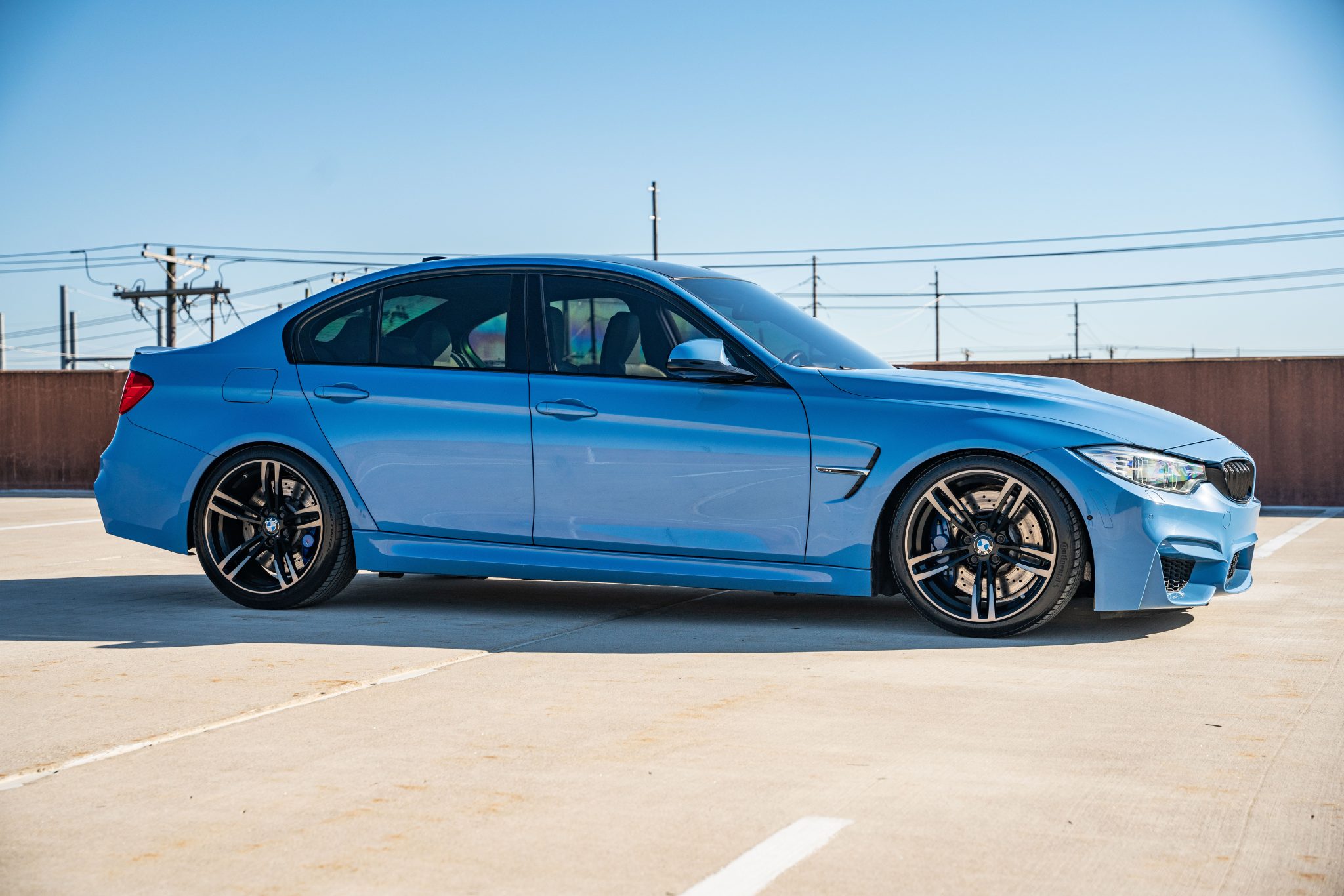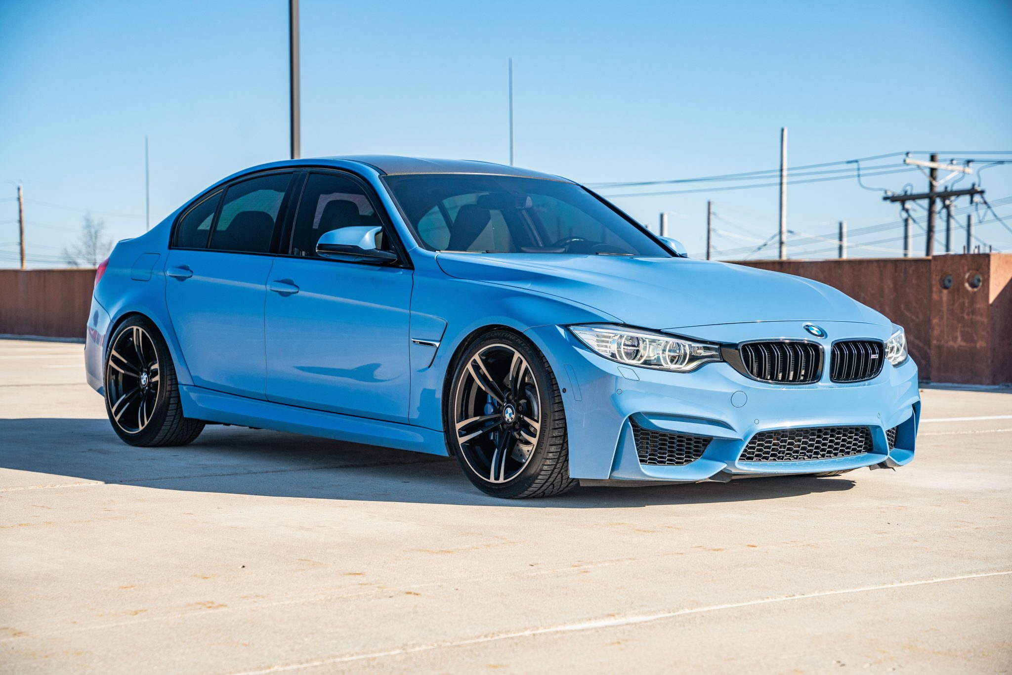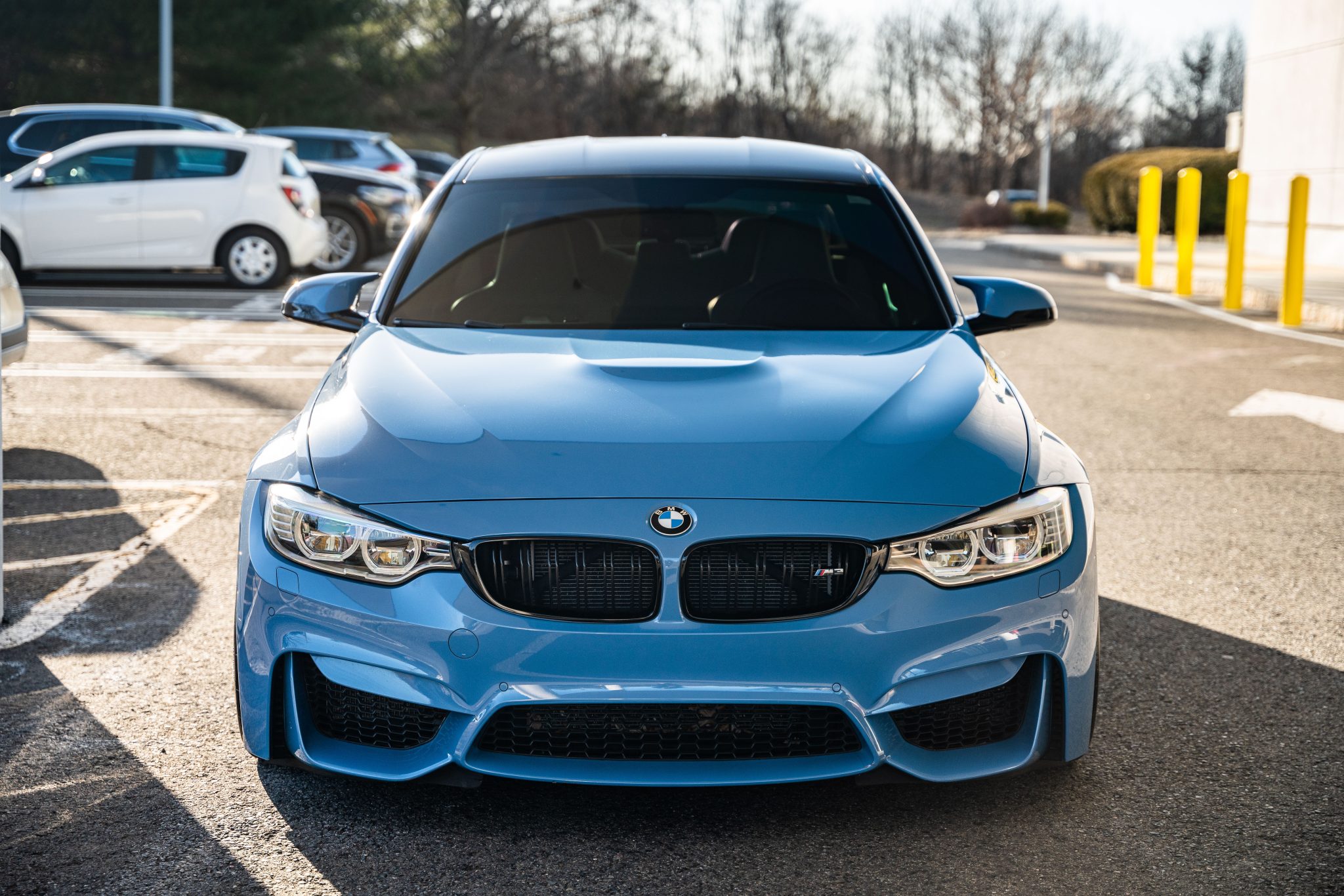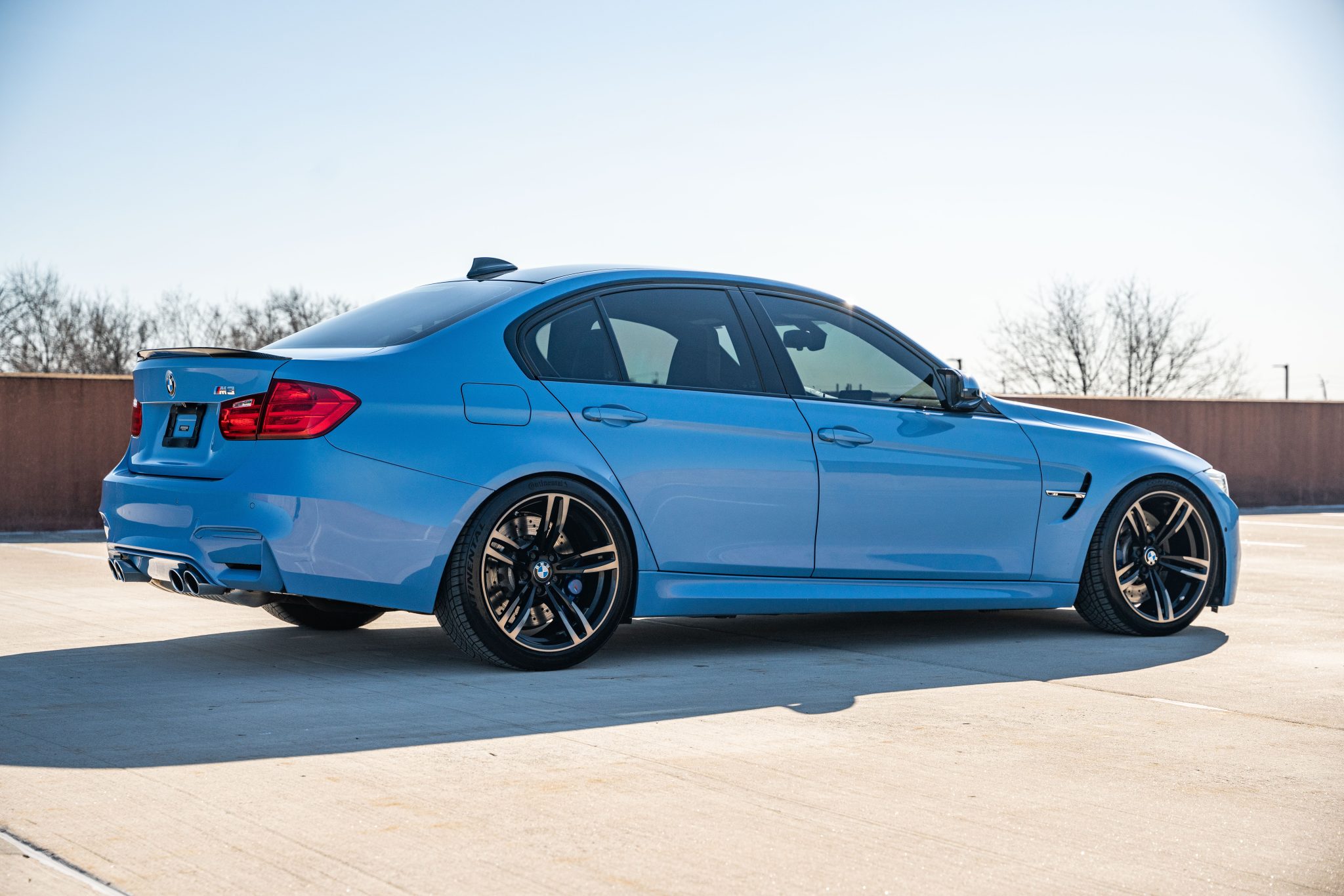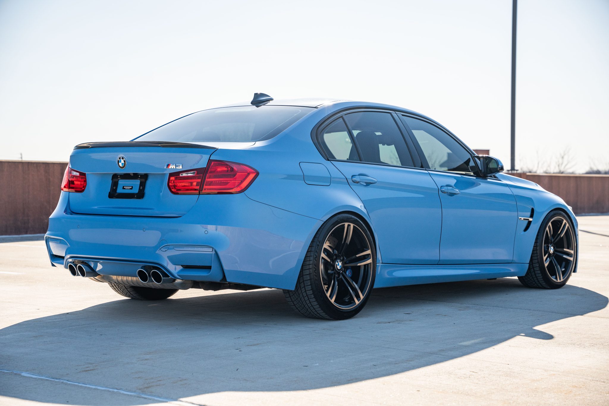 This 2015 BMW M3 sedan has remained registered in New Jersey since new and now has 36k miles. The car is powered by a twin-turbocharged 3.0-liter S55 inline-six paired with a six-speed manual transmission and is finished in Yas Marina Blue Metallic over Silverstone Merino leather upholstery. Equipment includes an Active M differential, lowering springs, a carbon-fiber decklid spoiler, 19″ Style 437M alloy wheels, adaptive LED headlights, navigation, heated front and rear seats, a heated steering wheel, and a Harman Kardon sound system. Acquired by the selling dealer in 2025, this F80 M3 is offered with a clean Carfax report and a clean New Jersey title. The F80 M3 featured widened bodywork along with revised fender vents and bumpers compared to the standard 3 series. This example is finished in Yas Marina Blue Metallic (B68) with Shadowline trim and features adaptive LED headlights, a carbon-fiber decklid spoiler, and quad exhaust tips. There are scrapes on the underside of the front bumper cover, and paint protection film has been applied to the paint. Close-up photographs of the exterior finish and trim are shown in the gallery below. The 19″ Style 437M alloy wheels are mounted with Continental ExtremeContact tires that have 2019 and 2020 date codes. The car is equipped with M Dynamic Mode with Dynamic Stability Control, and lowering springs have been added. Braking is handled by blue-finished M-branded calipers fitted over cross-drilled and ventilated rotors at all four corners. The cabin features seating surfaces upholstered in Silverstone Merino leather along with carbon-fiber trim on the dashboard and center console. Additional appointments include heated power-adjustable front seats, heated rear seats, Comfort Access keyless entry, dual-zone automatic climate control, cruise control, a Harman Kardon sound system, and iDrive infotainment with navigation. The front seat backrest emblems are damaged. The heated leather-wrapped multifunction steering wheel frames a 200-mph speedometer, an 8,500-rpm tachometer, and gauges for oil temperature and fuel level. The digital odometer indicates 34k miles. The twin-turbocharged 3.0-liter S55 inline-six was factory rated at 425 horsepower and 406 lb-ft of torque. The spark plugs were replaced in May 2019, and an oil change was performed in preparation for the sale. Power is sent to the rear wheels through a six-speed manual transmission and an electronically controlled Active M differential. The Carfax report is free of accidents or other reported damage.