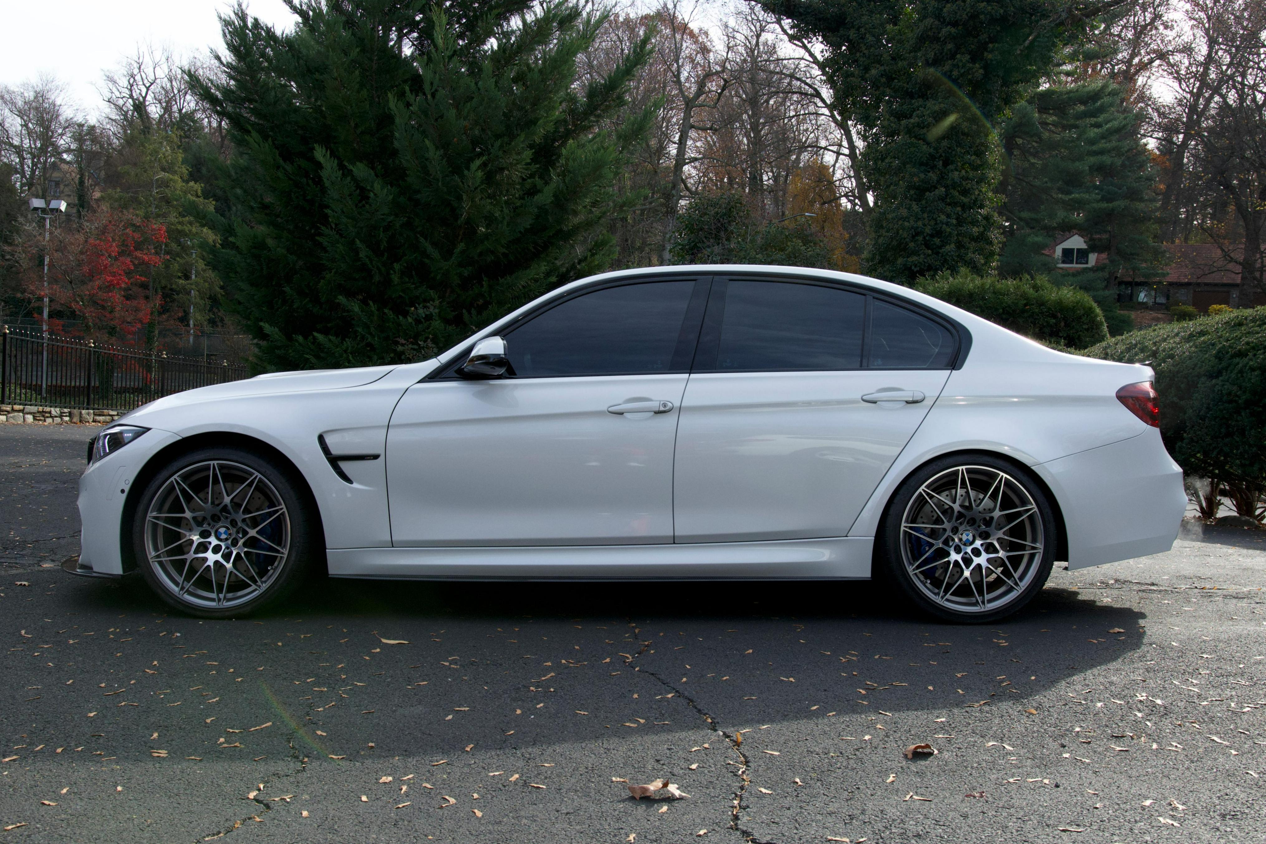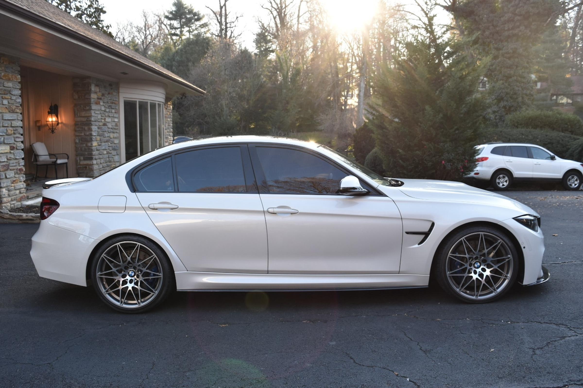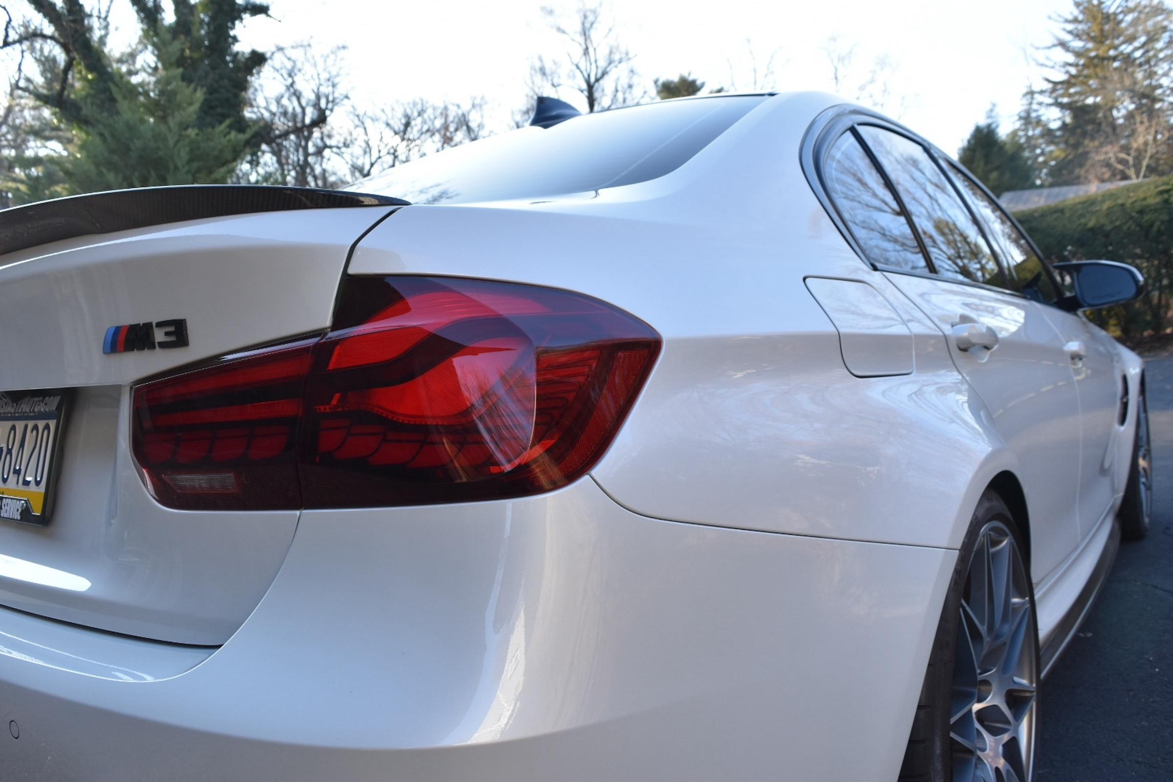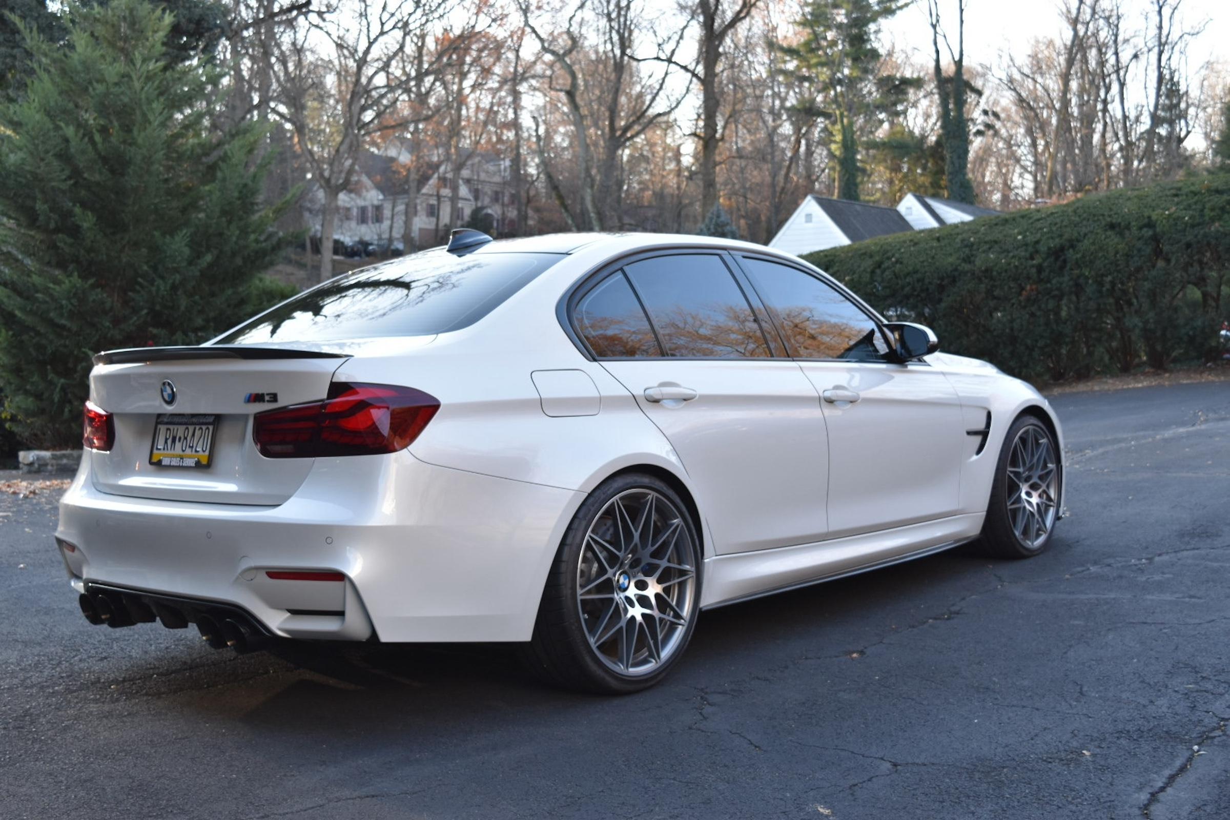 - The odometer on this M3 currently displays approximately 18,800 miles. - The Carfax history report contains a gap from 2018 to 2021, though it shows no mileage discrepancies for the given time period. - According to the window sticker provided in the photo gallery, this M3 came equipped with the M Competition Package, the Executive Package, Driver Assistance Plus, a carbon fiber roof panel, leather upholstery, heated front and rear seats, dual-zone automatic climate control, a Harman/Kardon sound system, and more as detailed below. - Modifications reported by the seller include an AWE SwitchPath exhaust system, an Active Autowerke mid-pipe, Bayoptiks headlights and taillights, a Streetfighter LA carbon fiber front lip, an aftermarket carbon fiber rear spoiler, exterior paint protection film, and an aftermarket carbon fiber shift knob. - BMW's fifth-generation M3 went on sale for the 2015 model year. Based on the F30 3 Series, and called the F80 internally, it swapped its predecessor's V8 for a twin-turbocharged straight-6 and picked up more horsepower and a lot more torque along the way. Production ended in 2018. - Power comes from a 3.0-liter twin-turbocharged straight-6, rated at 444 horsepower and 406 lb-ft of torque. Output is sent to the rear wheels via a 7-speed dual-clutch automatic transmission.