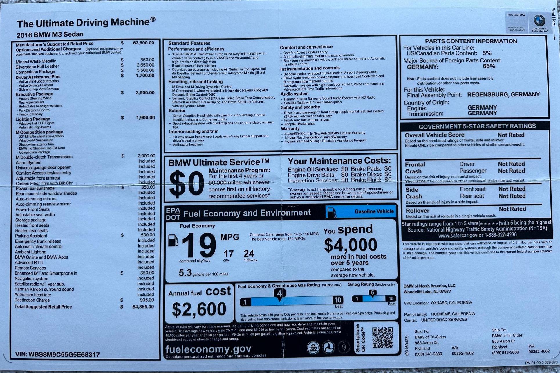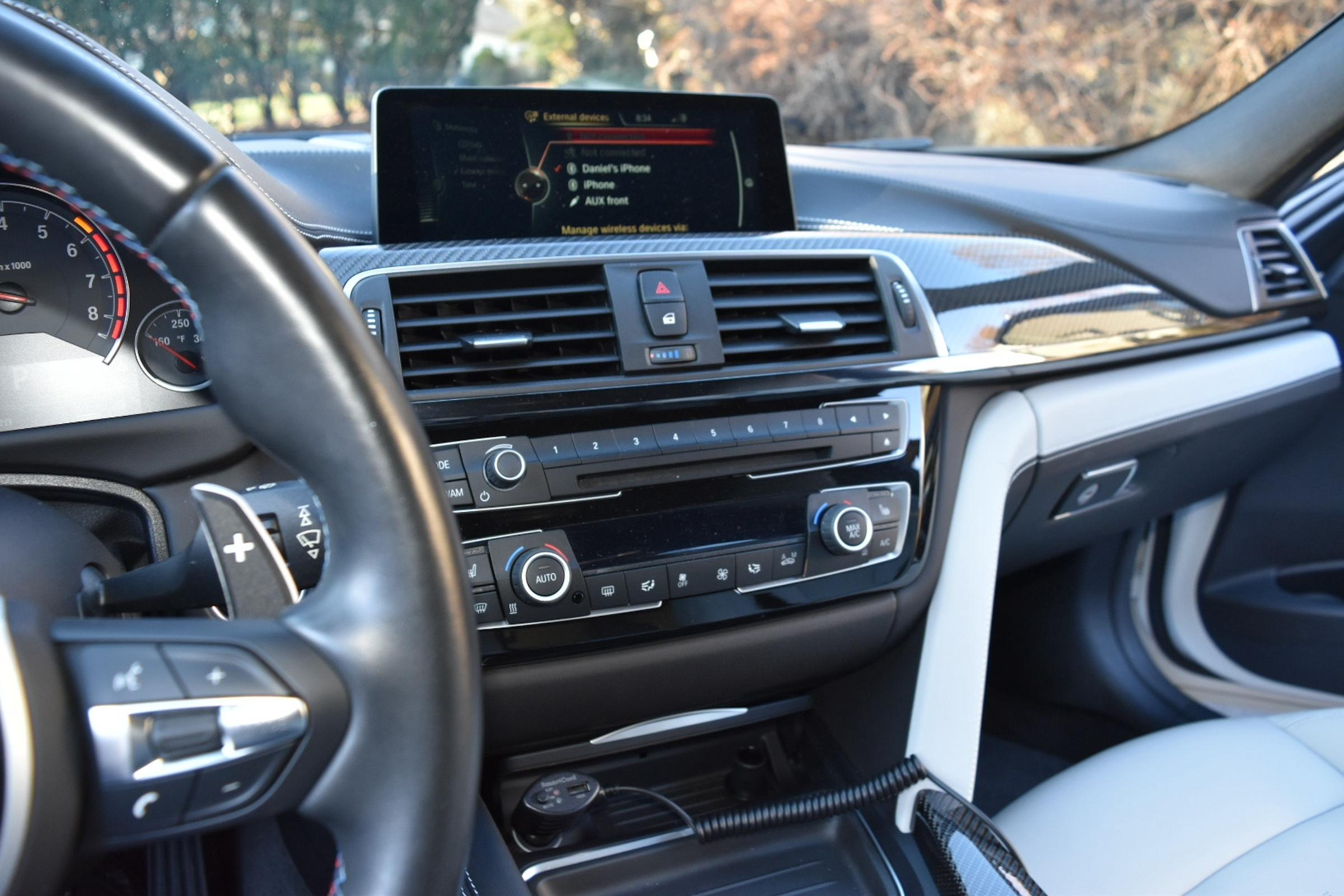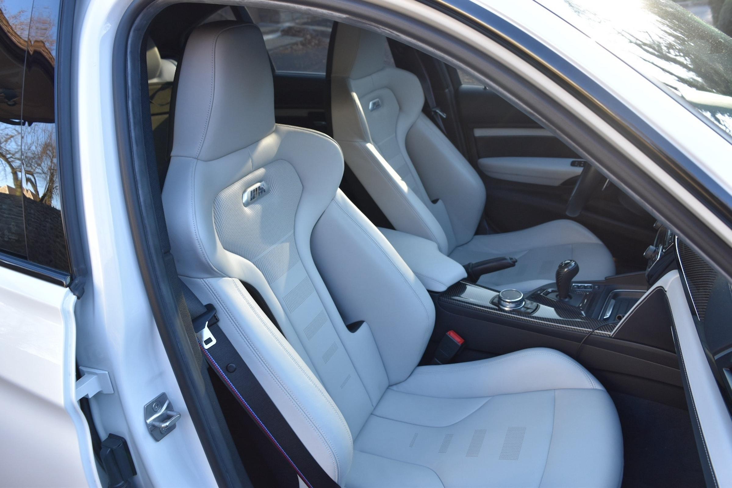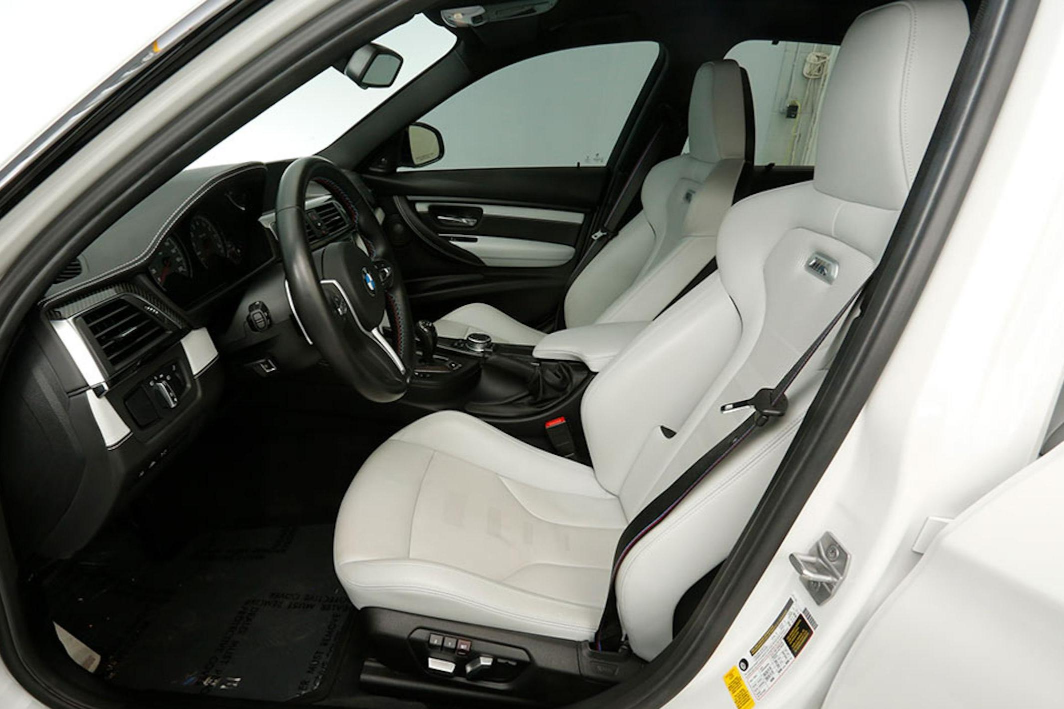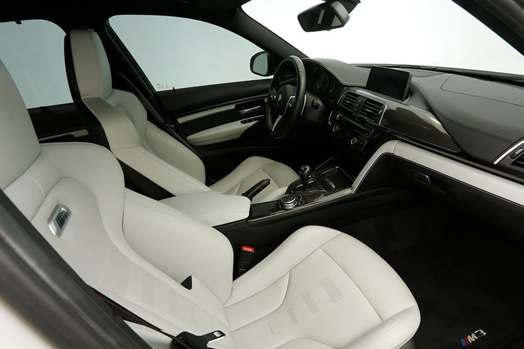 - The odometer on this M3 currently displays approximately 18,800 miles. - The Carfax history report contains a gap from 2018 to 2021, though it shows no mileage discrepancies for the given time period. - According to the window sticker provided in the photo gallery, this M3 came equipped with the M Competition Package, the Executive Package, Driver Assistance Plus, a carbon fiber roof panel, leather upholstery, heated front and rear seats, dual-zone automatic climate control, a Harman/Kardon sound system, and more as detailed below. - Modifications reported by the seller include an AWE SwitchPath exhaust system, an Active Autowerke mid-pipe, Bayoptiks headlights and taillights, a Streetfighter LA carbon fiber front lip, an aftermarket carbon fiber rear spoiler, exterior paint protection film, and an aftermarket carbon fiber shift knob. - BMW's fifth-generation M3 went on sale for the 2015 model year. Based on the F30 3 Series, and called the F80 internally, it swapped its predecessor's V8 for a twin-turbocharged straight-6 and picked up more horsepower and a lot more torque along the way. Production ended in 2018. - Power comes from a 3.0-liter twin-turbocharged straight-6, rated at 444 horsepower and 406 lb-ft of torque. Output is sent to the rear wheels via a 7-speed dual-clutch automatic transmission.