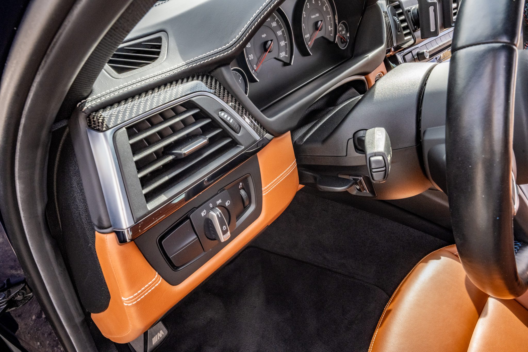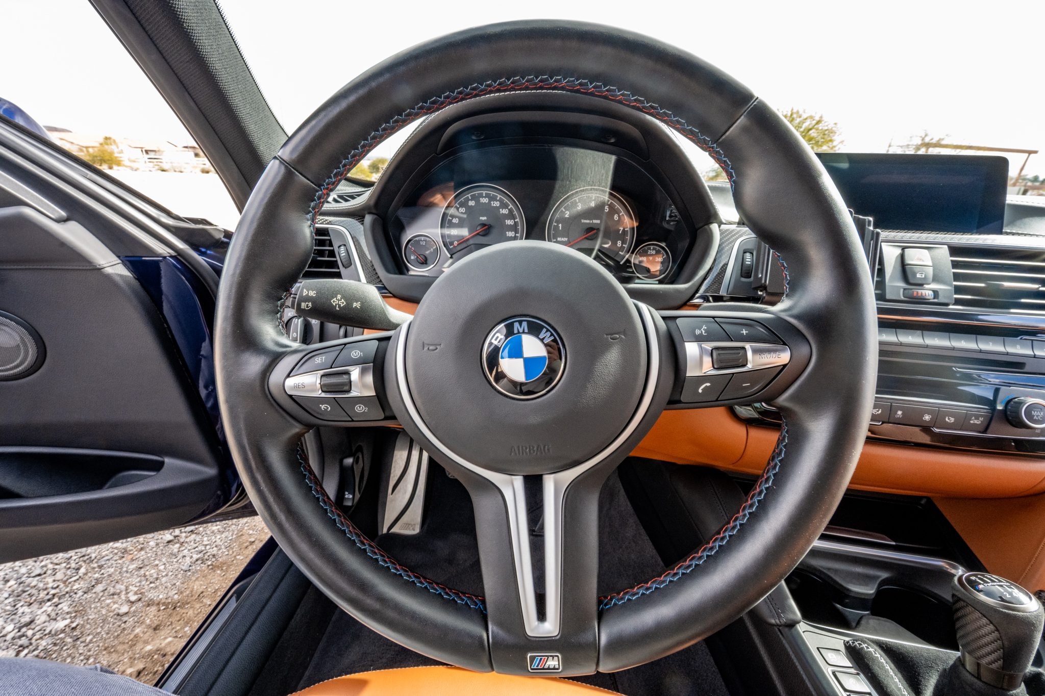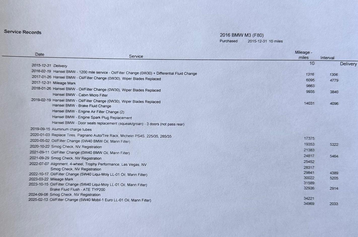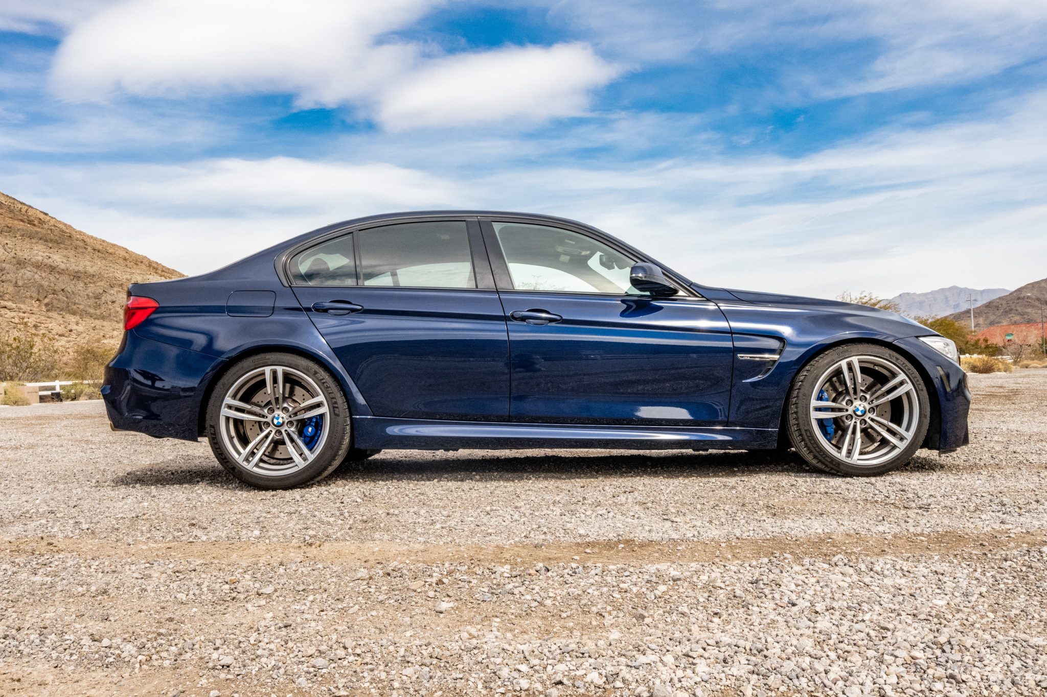 This 2016 BMW M3 is finished in Tanzanite Blue Metallic over Amaro Brown Individual Merino leather and is powered by a twin-turbocharged 3.0-liter S55 inline-six equipped with CarBahn engine management software and aluminum charge pipes. The car has been further modified with Eibach Pro springs and an M2 CS front sway bar, and it features optional factory equipment including Adaptive M Suspension, a leather-trimmed dash, and the Executive and Lighting packages. Additional features include a six-speed manual transmission, an Active M differential, 19″ alloy wheels, LED headlights, Park Distance Control, a back-up camera, a Harman Kardon sound system, a head-up display, navigation, and a heated steering wheel and seats. The car was acquired new by the seller and now has 35k miles. This F80 M3 is offered in Nevada with a window sticker, an owner’s manual, two key fobs, service records, spare parts, a clean Carfax report, and a clean California title in the seller’s name. The F80 M3 featured widened bodywork along with revised fender vents and bumpers compared to the standard 3 series. This example is finished in Tanzanite Blue Metallic with Shadowline trim and features Park Distance Control, LED headlights, LED taillights, and a rear decklid spoiler. A carbon-fiber rear diffuser, stainless-steel exhaust tips, and tinted side markers are installed, and the muffler is painted black. The 19″ Style 437M alloy wheels are mounted with 255/35 front and 285/35 rear Michelin Pilot Sport 4S tires that were installed in 2020. The seller states that Eibach Pro springs and an M2 CS front sway bar have been installed. Braking is handled by blue-finished M-branded calipers fitted over cross-drilled and ventilated rotors at all four corners. The car is equipped with Adaptive M Suspension, and M Dynamic Mode with Dynamic Stability Control is standard equipment. The brake fluid was flushed in 2023. The cabin features seating surfaces upholstered in Amaro Brown Individual Merino leather along with carbon-fiber trim on the dashboard and center console. Additional appointments include heated power-adjustable lightweight front sport seats, heated rear seats, a back-up camera, a head-up display, Comfort Access keyless entry, a Harman Kardon sound system, dual-zone automatic climate control, cruise control, and iDrive infotainment with navigation. Optional Merino leather covers the dash. The heated leather-wrapped multifunction steering wheel frames a 200-mph speedometer, an 8,500-rpm tachometer, and gauges for oil temperature and fuel level. The digital odometer indicates 35k miles, all of which were added under current ownership. The twin-turbocharged 3.0-liter S55 inline-six is equipped with CarBahn engine management software and aluminum charge pipes, according to the seller. An oil change was performed in February 2025. Power is sent to the rear wheels through a six-speed manual transmission and an electronically controlled Active M differential. The window sticker notes initial delivery to Hansel BMW of Santa Rosa, California, along with factory equipment, colors, options, and a total suggested retail price of $76,045. The Carfax report is free of accidents or other reported damage.