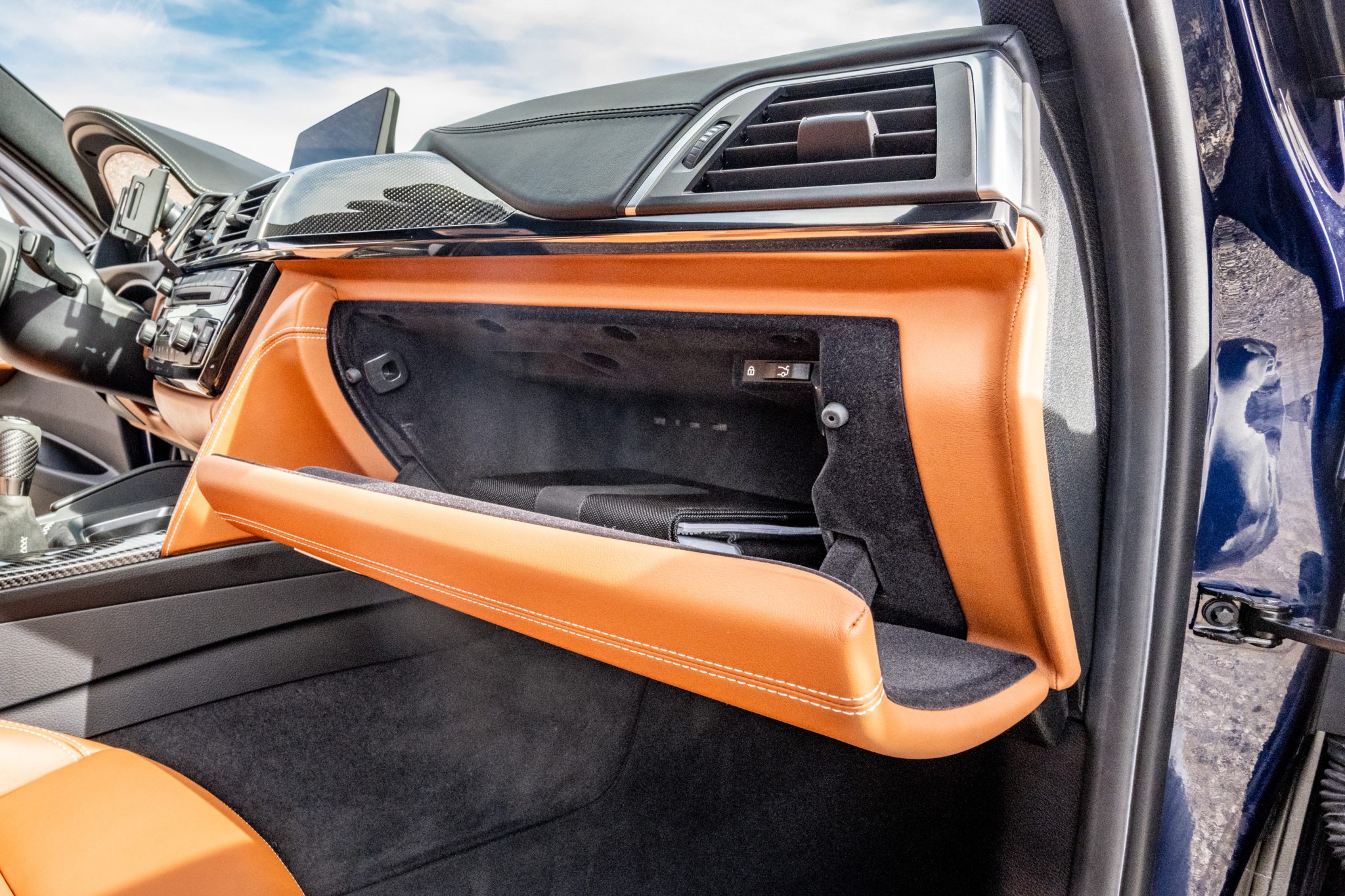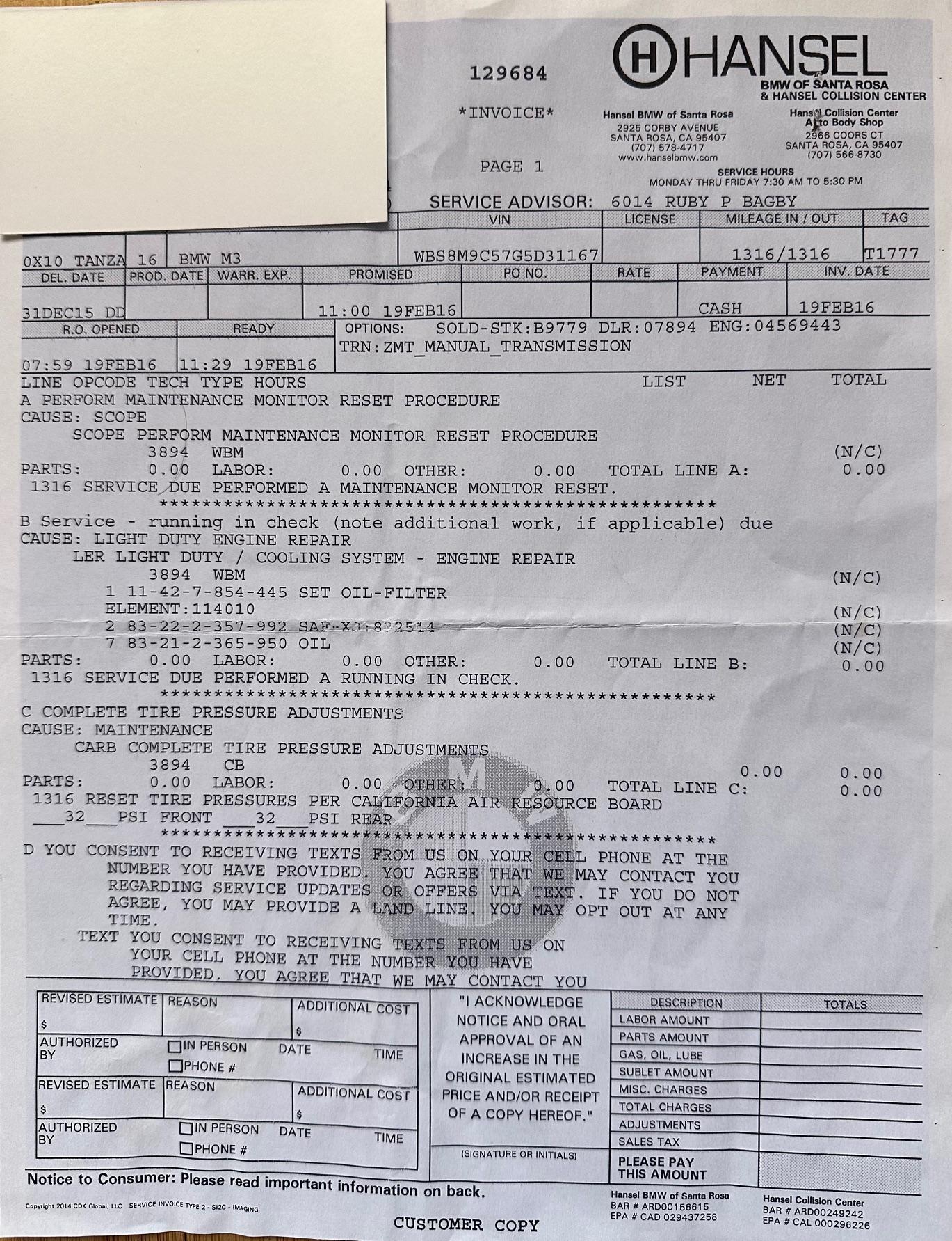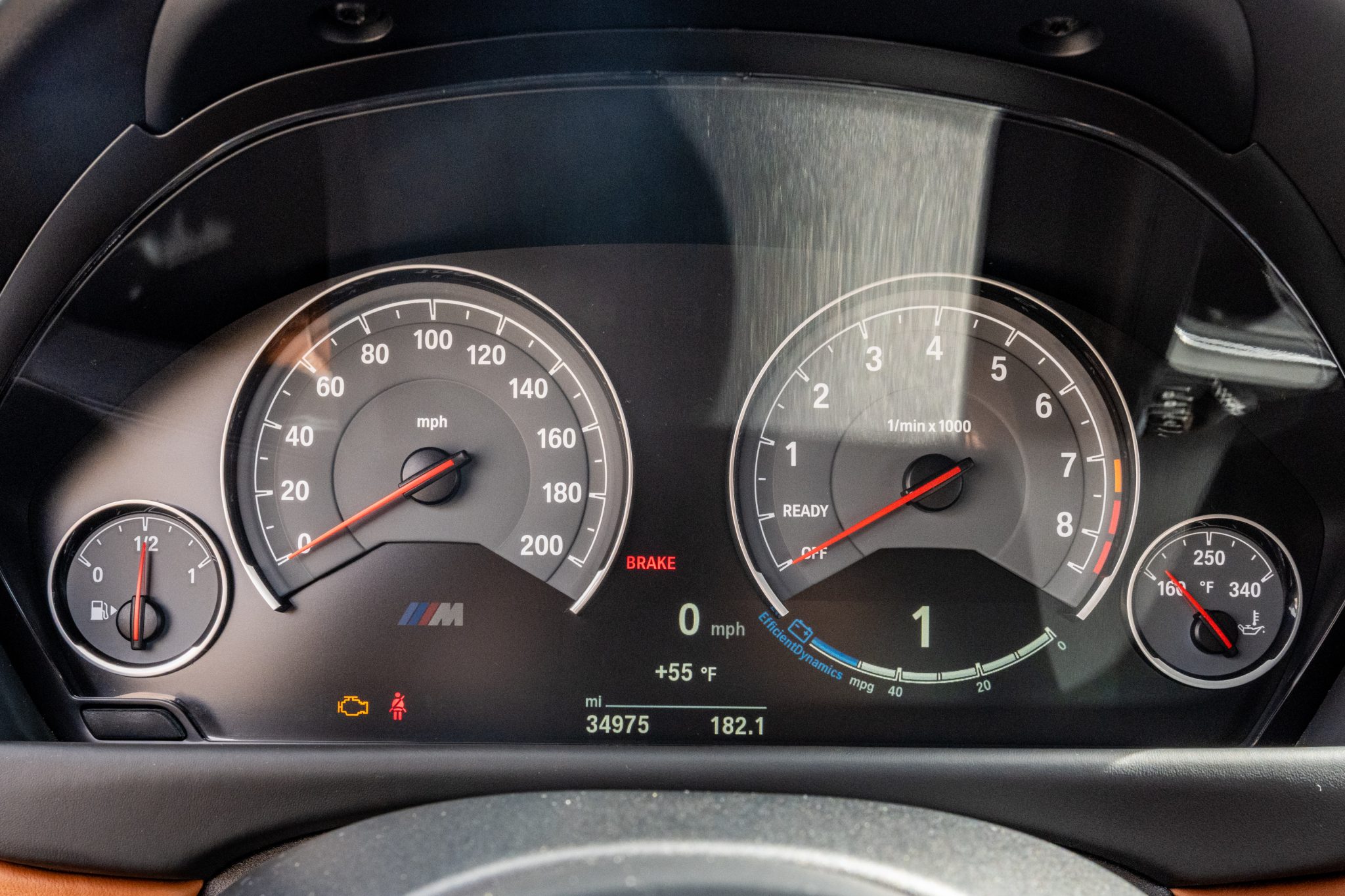 This 2016 BMW M3 is finished in Tanzanite Blue Metallic over Amaro Brown Individual Merino leather and is powered by a twin-turbocharged 3.0-liter S55 inline-six equipped with CarBahn engine management software and aluminum charge pipes. The car has been further modified with Eibach Pro springs and an M2 CS front sway bar, and it features optional factory equipment including Adaptive M Suspension, a leather-trimmed dash, and the Executive and Lighting packages. Additional features include a six-speed manual transmission, an Active M differential, 19″ alloy wheels, LED headlights, Park Distance Control, a back-up camera, a Harman Kardon sound system, a head-up display, navigation, and a heated steering wheel and seats. The car was acquired new by the seller and now has 35k miles. This F80 M3 is offered in Nevada with a window sticker, an owner’s manual, two key fobs, service records, spare parts, a clean Carfax report, and a clean California title in the seller’s name. The F80 M3 featured widened bodywork along with revised fender vents and bumpers compared to the standard 3 series. This example is finished in Tanzanite Blue Metallic with Shadowline trim and features Park Distance Control, LED headlights, LED taillights, and a rear decklid spoiler. A carbon-fiber rear diffuser, stainless-steel exhaust tips, and tinted side markers are installed, and the muffler is painted black. The 19″ Style 437M alloy wheels are mounted with 255/35 front and 285/35 rear Michelin Pilot Sport 4S tires that were installed in 2020. The seller states that Eibach Pro springs and an M2 CS front sway bar have been installed. Braking is handled by blue-finished M-branded calipers fitted over cross-drilled and ventilated rotors at all four corners. The car is equipped with Adaptive M Suspension, and M Dynamic Mode with Dynamic Stability Control is standard equipment. The brake fluid was flushed in 2023. The cabin features seating surfaces upholstered in Amaro Brown Individual Merino leather along with carbon-fiber trim on the dashboard and center console. Additional appointments include heated power-adjustable lightweight front sport seats, heated rear seats, a back-up camera, a head-up display, Comfort Access keyless entry, a Harman Kardon sound system, dual-zone automatic climate control, cruise control, and iDrive infotainment with navigation. Optional Merino leather covers the dash. The heated leather-wrapped multifunction steering wheel frames a 200-mph speedometer, an 8,500-rpm tachometer, and gauges for oil temperature and fuel level. The digital odometer indicates 35k miles, all of which were added under current ownership. The twin-turbocharged 3.0-liter S55 inline-six is equipped with CarBahn engine management software and aluminum charge pipes, according to the seller. An oil change was performed in February 2025. Power is sent to the rear wheels through a six-speed manual transmission and an electronically controlled Active M differential. The window sticker notes initial delivery to Hansel BMW of Santa Rosa, California, along with factory equipment, colors, options, and a total suggested retail price of $76,045. The Carfax report is free of accidents or other reported damage.