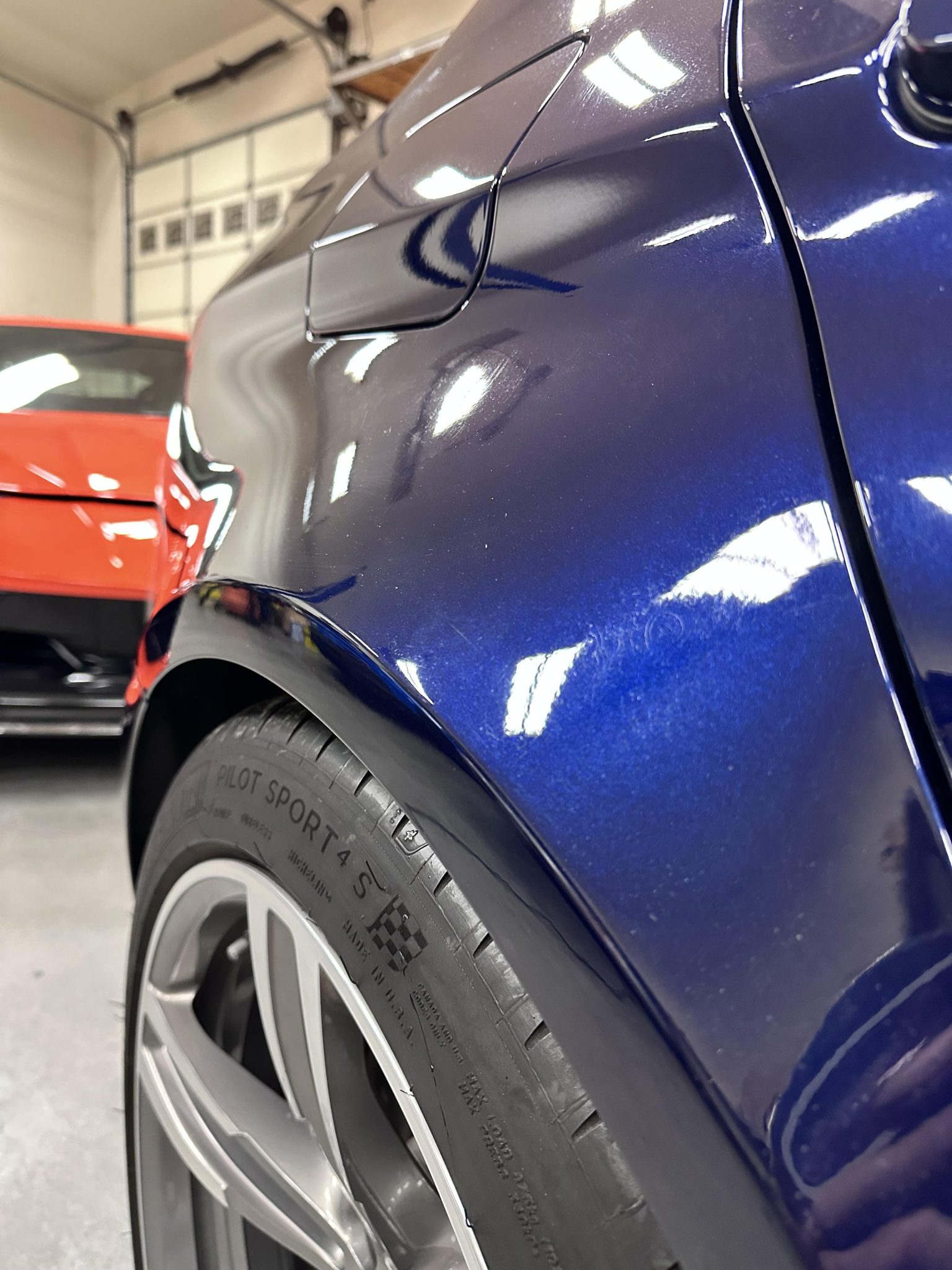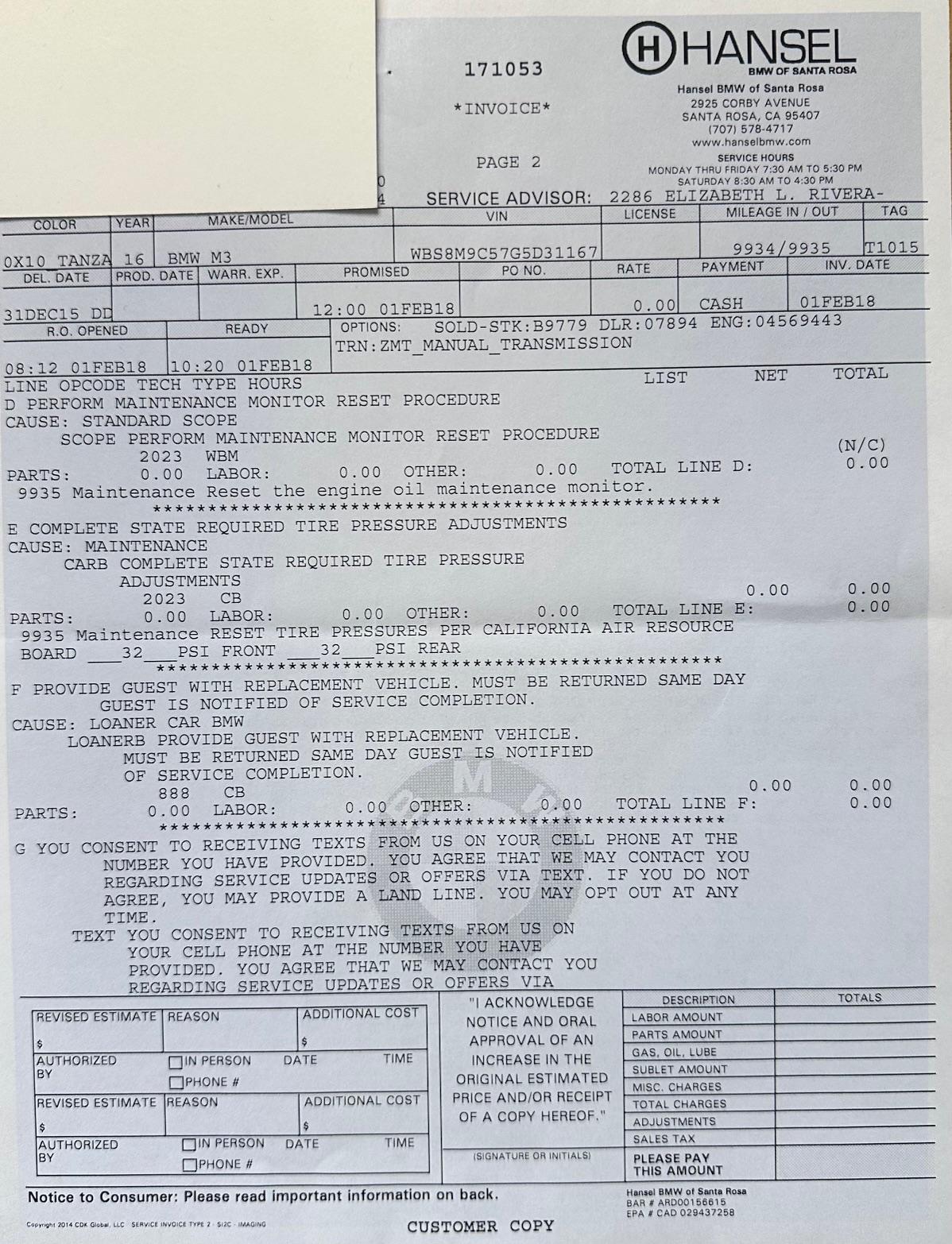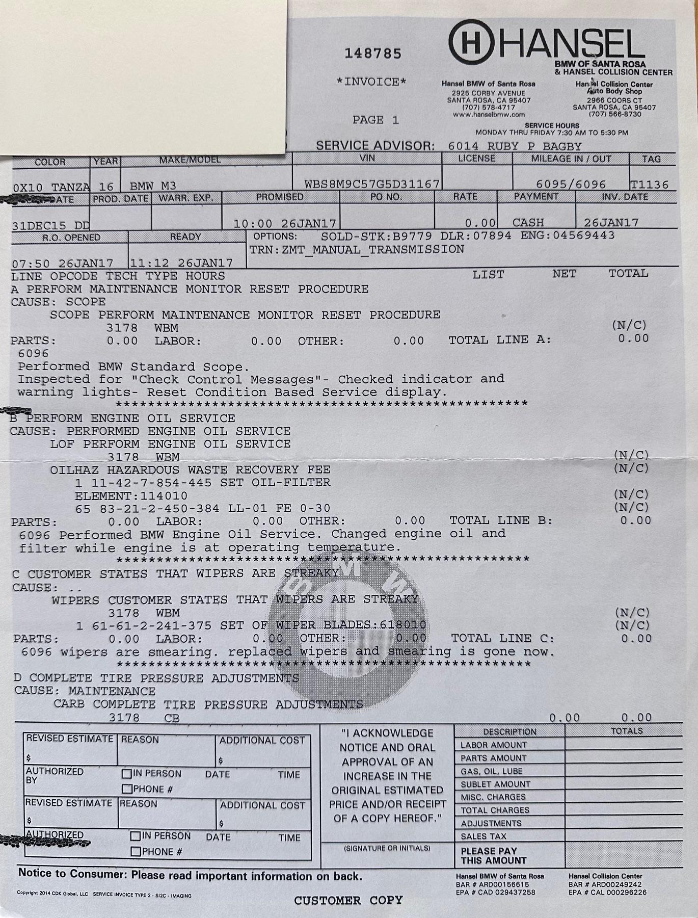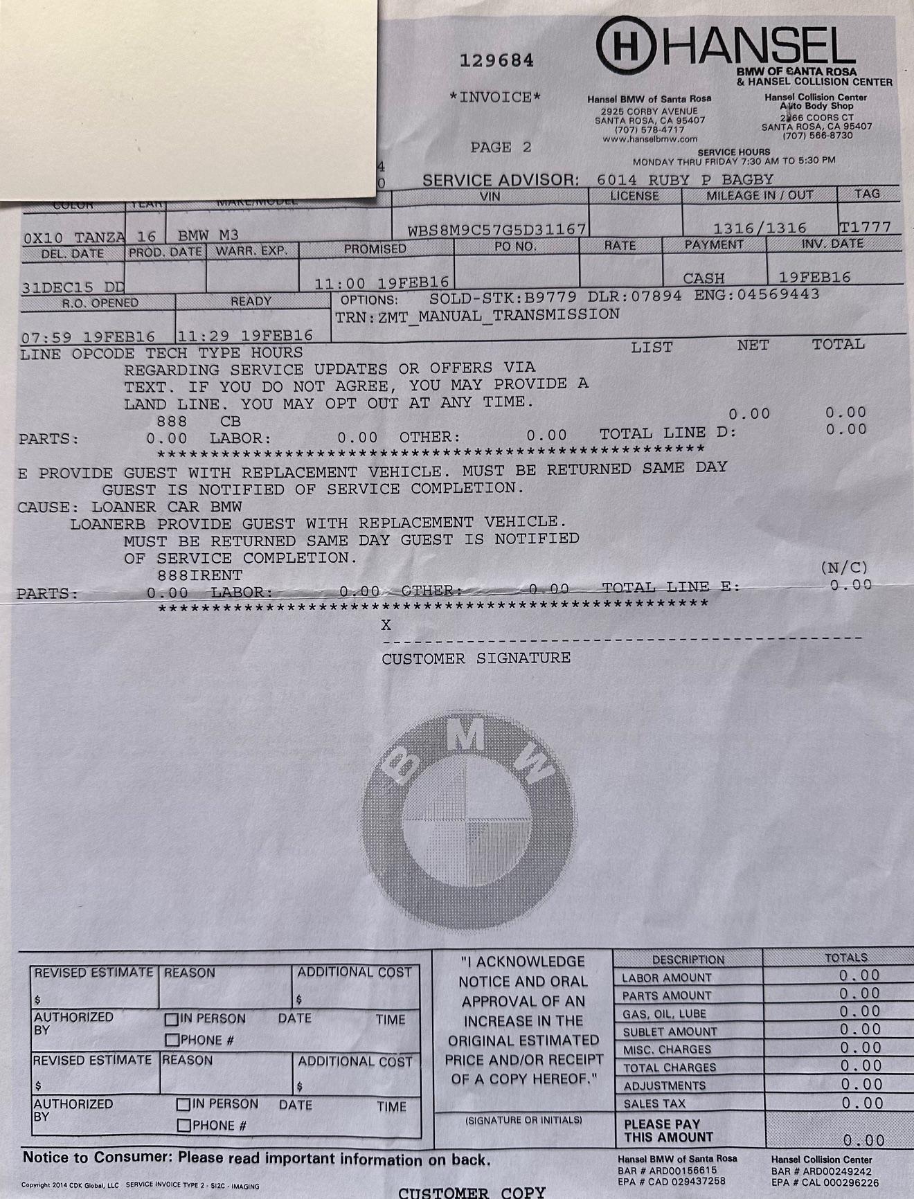 This 2016 BMW M3 is finished in Tanzanite Blue Metallic over Amaro Brown Individual Merino leather and is powered by a twin-turbocharged 3.0-liter S55 inline-six equipped with CarBahn engine management software and aluminum charge pipes. The car has been further modified with Eibach Pro springs and an M2 CS front sway bar, and it features optional factory equipment including Adaptive M Suspension, a leather-trimmed dash, and the Executive and Lighting packages. Additional features include a six-speed manual transmission, an Active M differential, 19″ alloy wheels, LED headlights, Park Distance Control, a back-up camera, a Harman Kardon sound system, a head-up display, navigation, and a heated steering wheel and seats. The car was acquired new by the seller and now has 35k miles. This F80 M3 is offered in Nevada with a window sticker, an owner’s manual, two key fobs, service records, spare parts, a clean Carfax report, and a clean California title in the seller’s name. The F80 M3 featured widened bodywork along with revised fender vents and bumpers compared to the standard 3 series. This example is finished in Tanzanite Blue Metallic with Shadowline trim and features Park Distance Control, LED headlights, LED taillights, and a rear decklid spoiler. A carbon-fiber rear diffuser, stainless-steel exhaust tips, and tinted side markers are installed, and the muffler is painted black. The 19″ Style 437M alloy wheels are mounted with 255/35 front and 285/35 rear Michelin Pilot Sport 4S tires that were installed in 2020. The seller states that Eibach Pro springs and an M2 CS front sway bar have been installed. Braking is handled by blue-finished M-branded calipers fitted over cross-drilled and ventilated rotors at all four corners. The car is equipped with Adaptive M Suspension, and M Dynamic Mode with Dynamic Stability Control is standard equipment. The brake fluid was flushed in 2023. The cabin features seating surfaces upholstered in Amaro Brown Individual Merino leather along with carbon-fiber trim on the dashboard and center console. Additional appointments include heated power-adjustable lightweight front sport seats, heated rear seats, a back-up camera, a head-up display, Comfort Access keyless entry, a Harman Kardon sound system, dual-zone automatic climate control, cruise control, and iDrive infotainment with navigation. Optional Merino leather covers the dash. The heated leather-wrapped multifunction steering wheel frames a 200-mph speedometer, an 8,500-rpm tachometer, and gauges for oil temperature and fuel level. The digital odometer indicates 35k miles, all of which were added under current ownership. The twin-turbocharged 3.0-liter S55 inline-six is equipped with CarBahn engine management software and aluminum charge pipes, according to the seller. An oil change was performed in February 2025. Power is sent to the rear wheels through a six-speed manual transmission and an electronically controlled Active M differential. The window sticker notes initial delivery to Hansel BMW of Santa Rosa, California, along with factory equipment, colors, options, and a total suggested retail price of $76,045. The Carfax report is free of accidents or other reported damage.